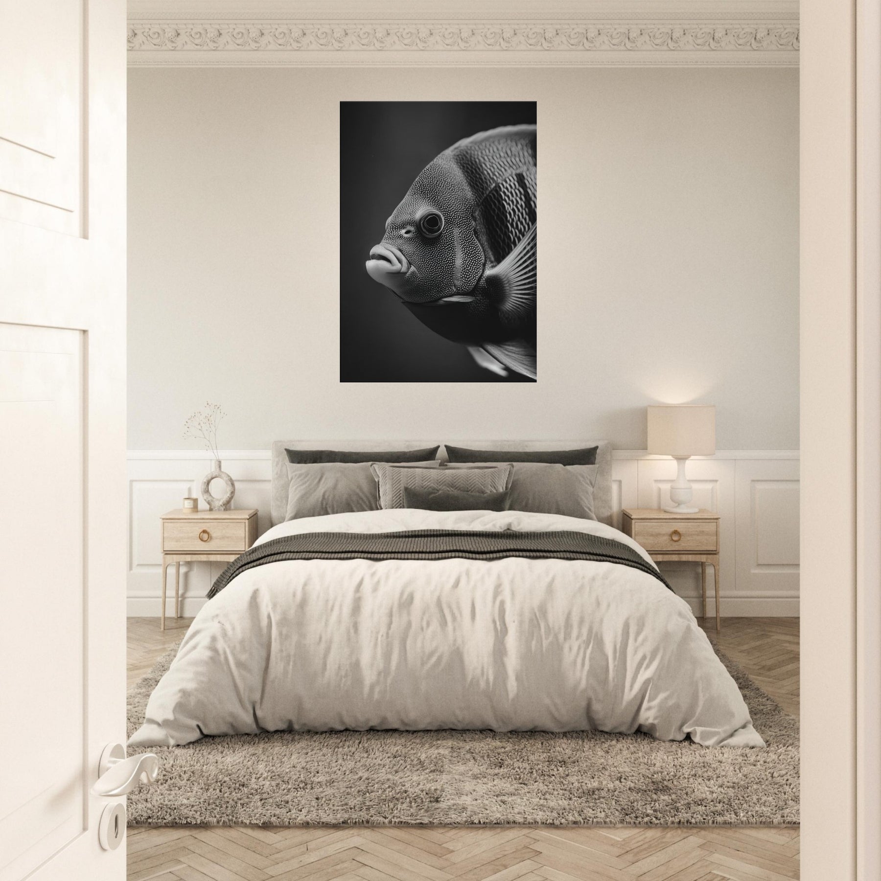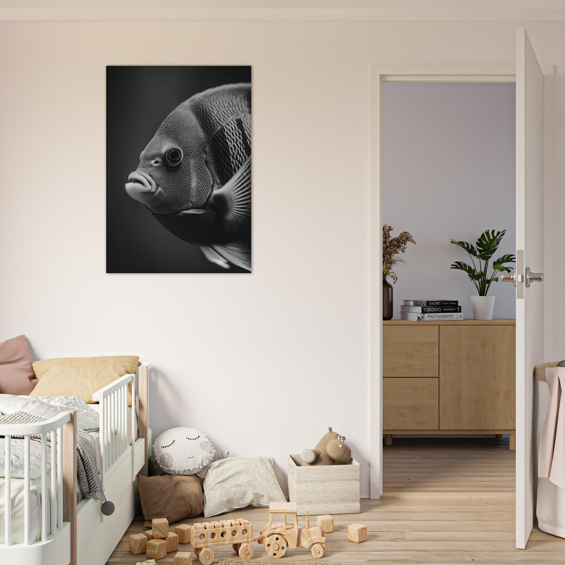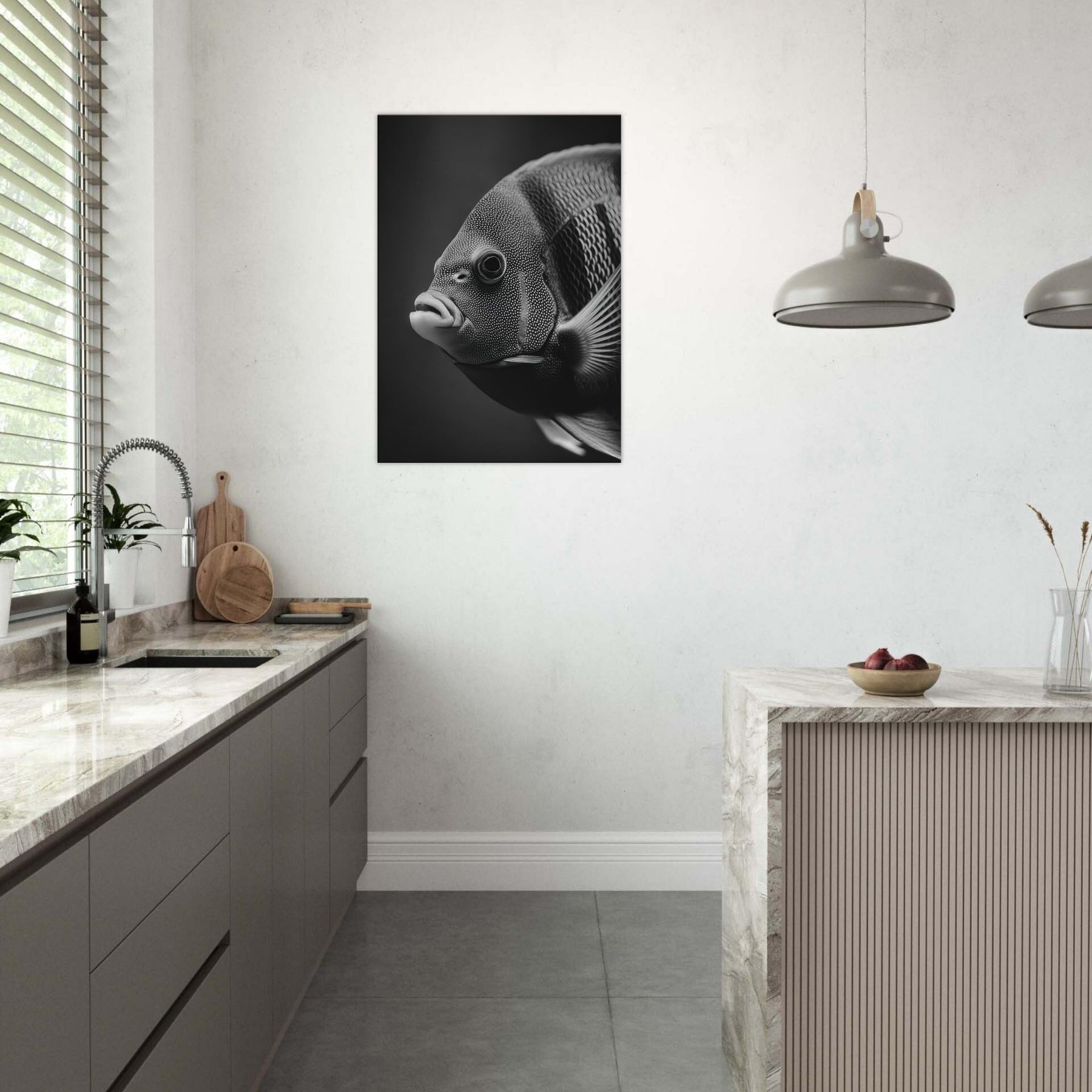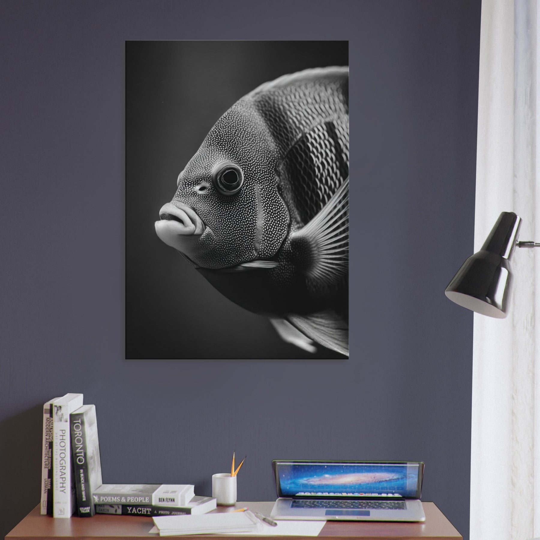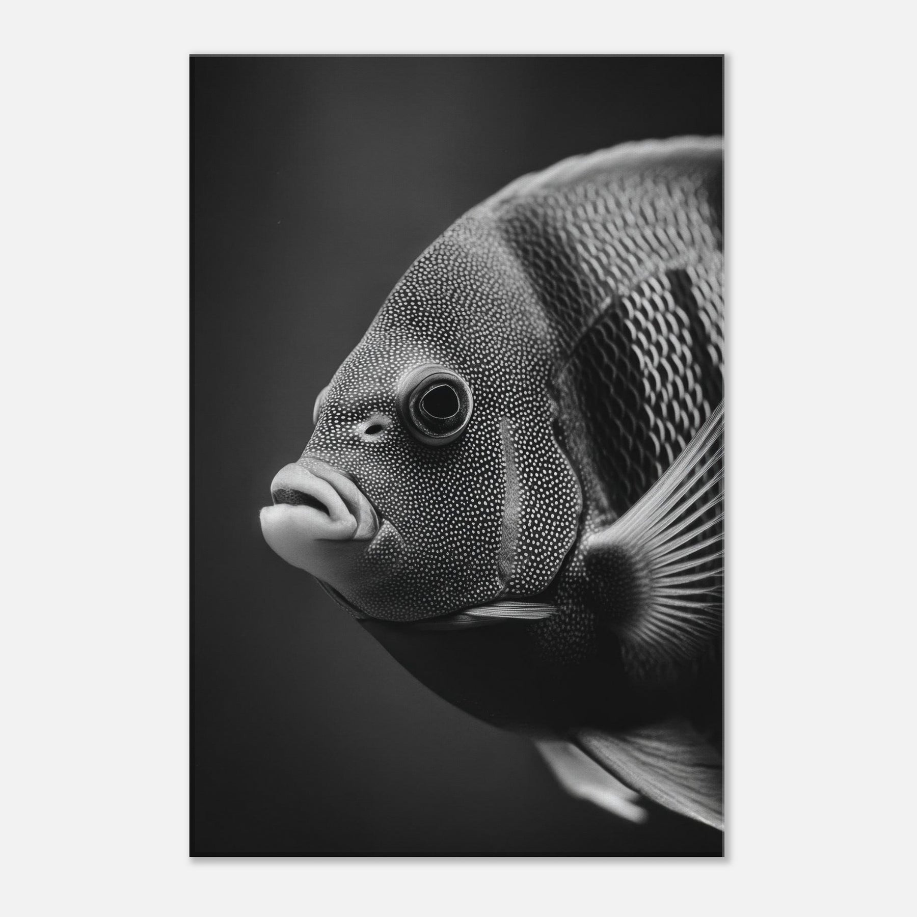 In crisp black and white, the Tropical Fish glides through negative space, a study in texture and mood.