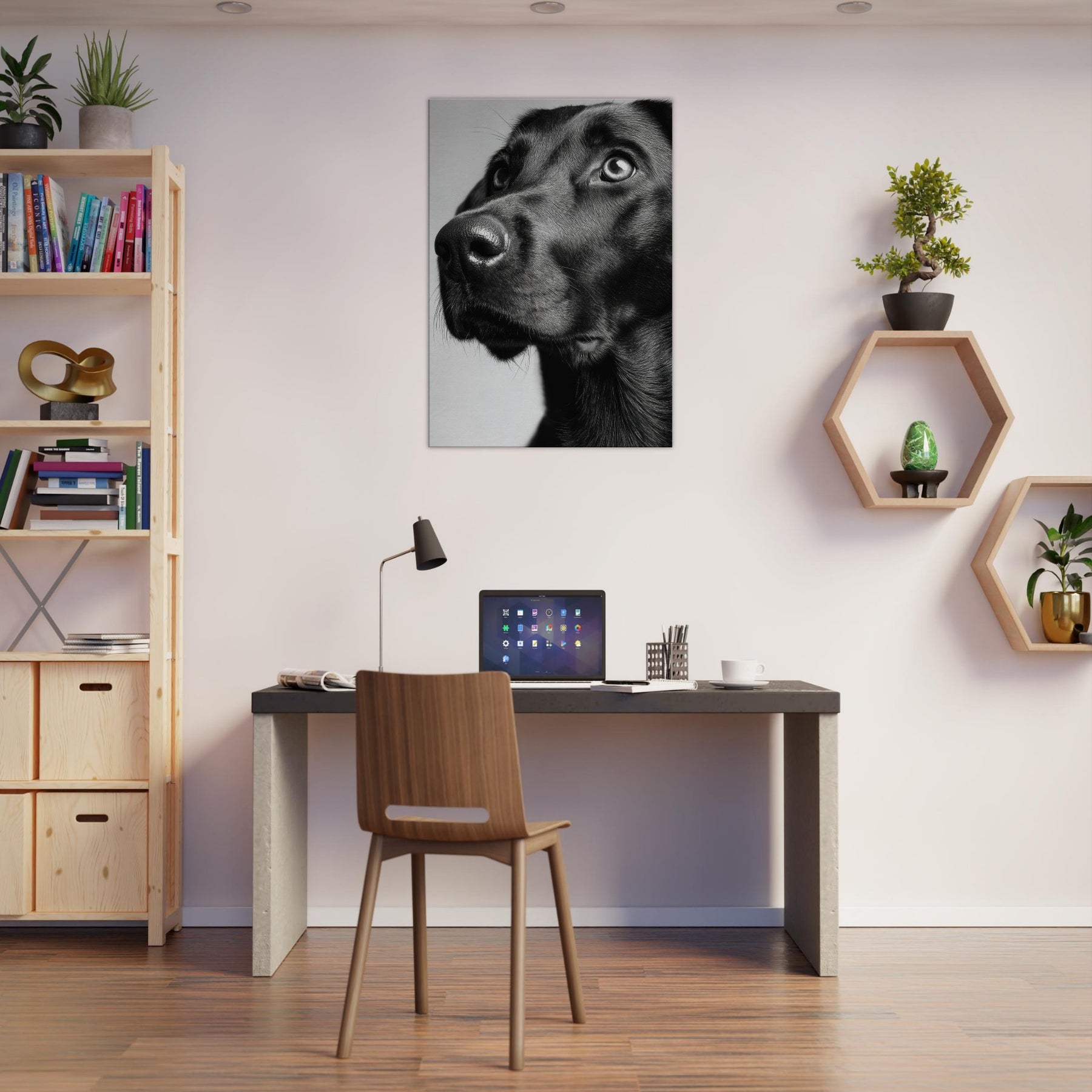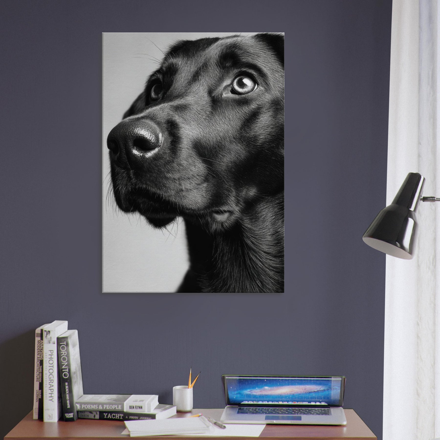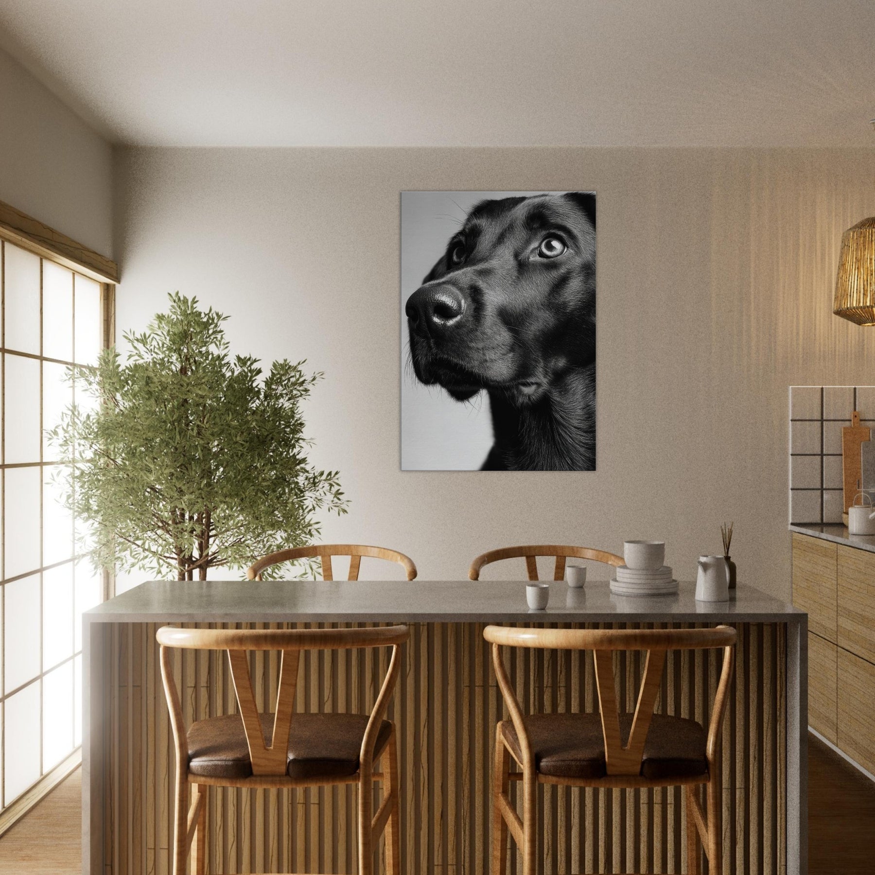 The Dog commands a quiet vigil in a realm of shadow and light. This black and white study distills a single, aware gaze into velvet texture, inviting the viewer to pause and lean in.