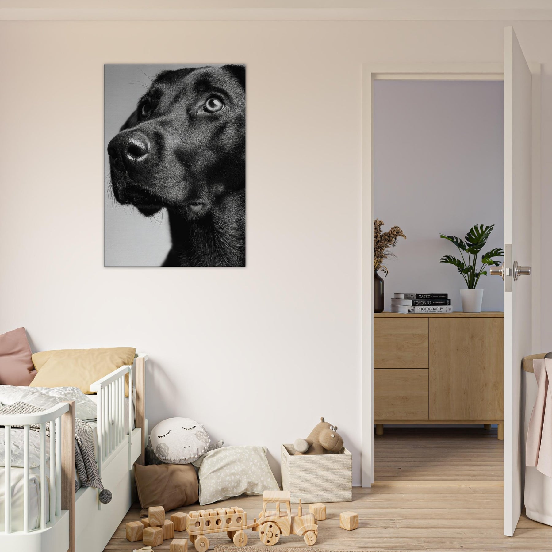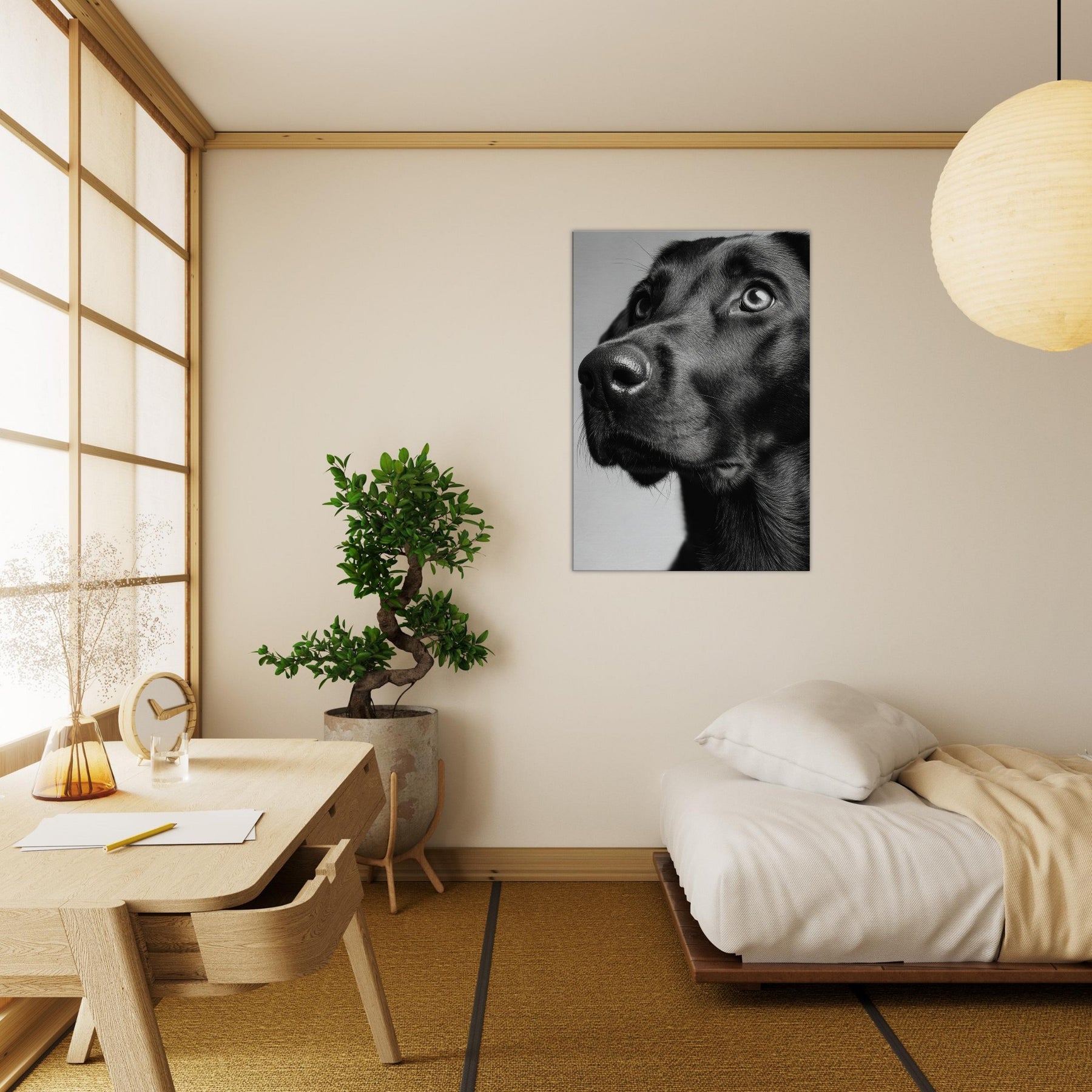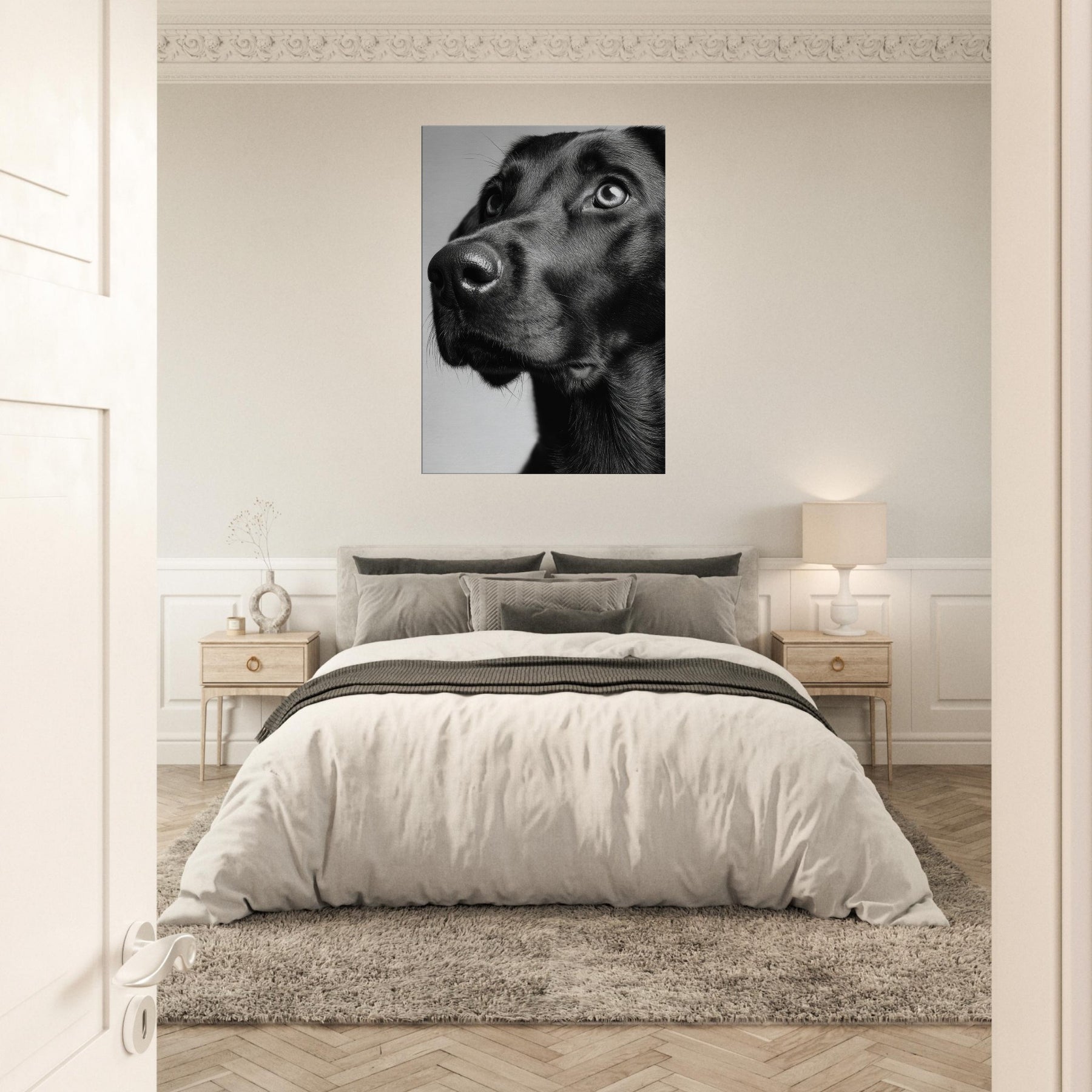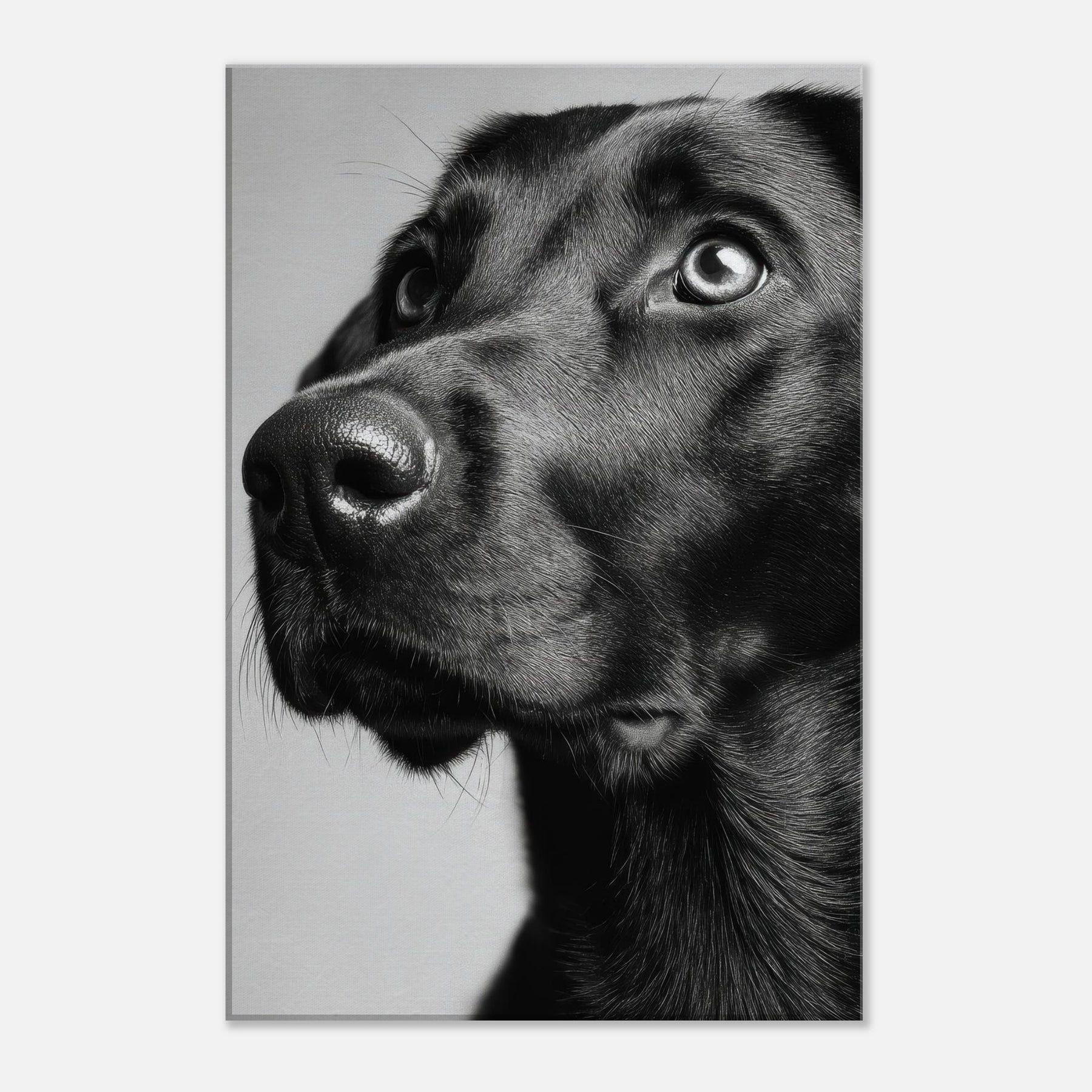 The Dog commands a quiet vigil in a realm of shadow and light. This black and white study distills a single, aware gaze into velvet texture, inviting the viewer to pause and lean in.
