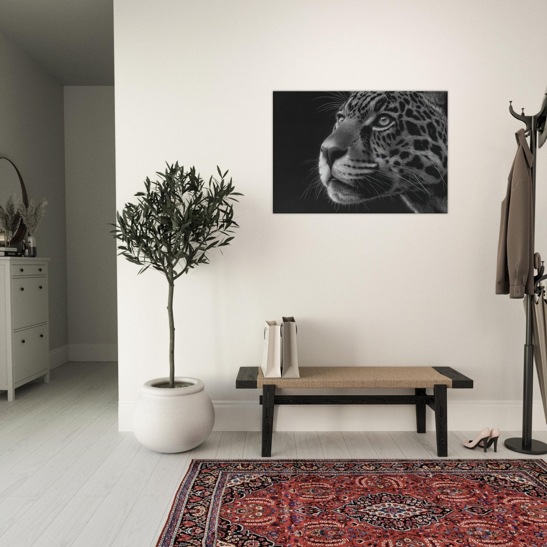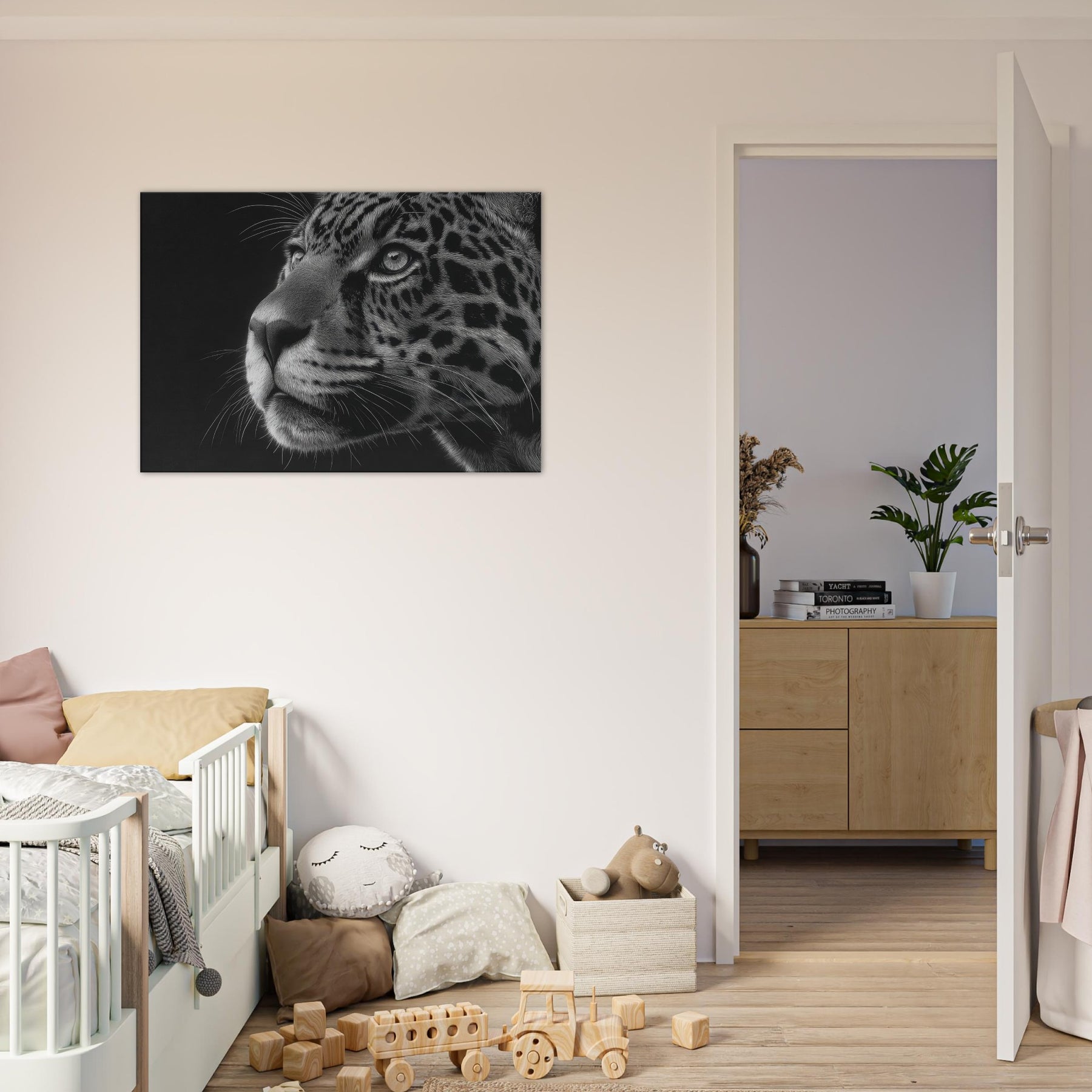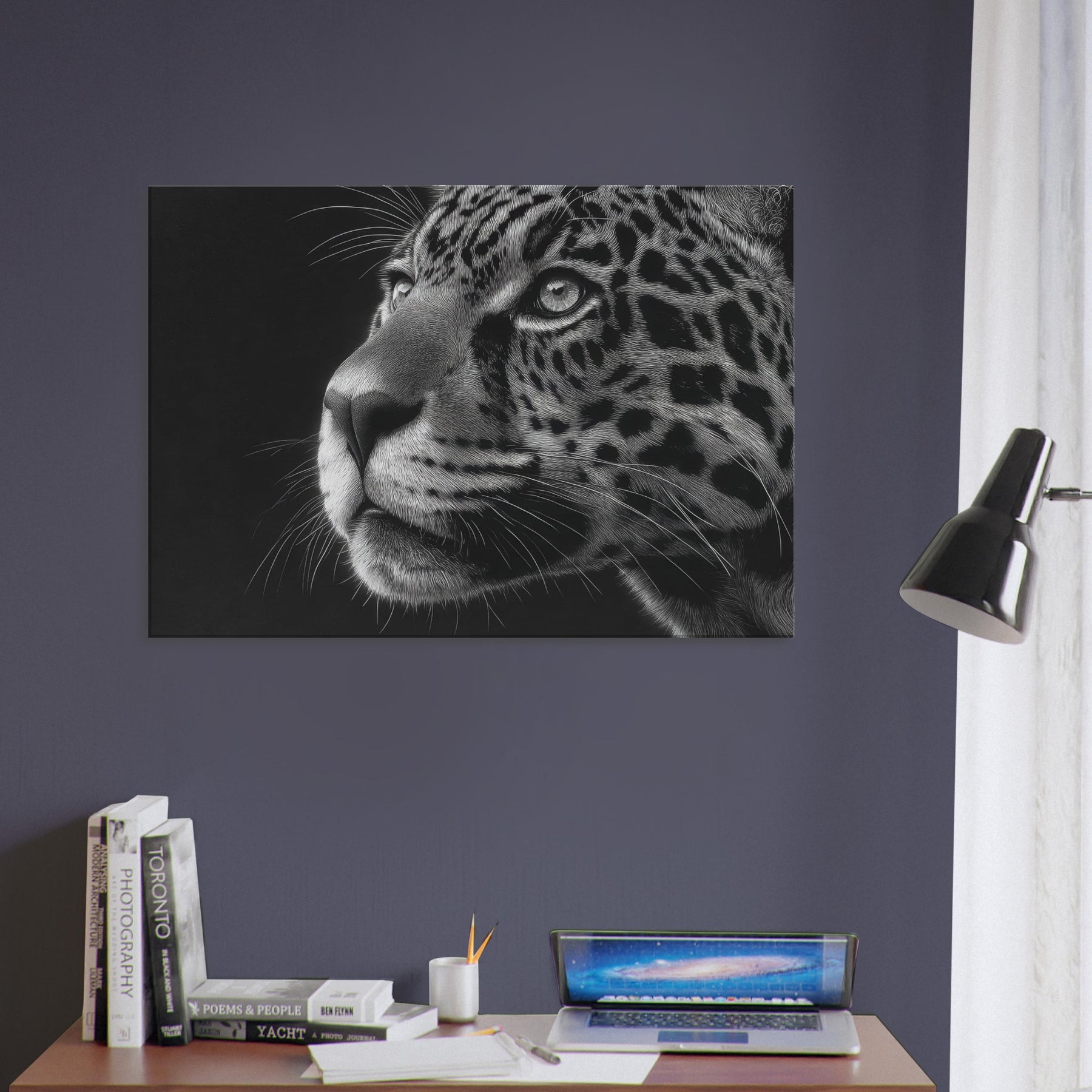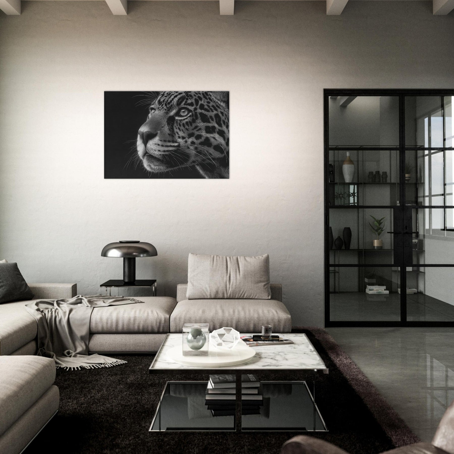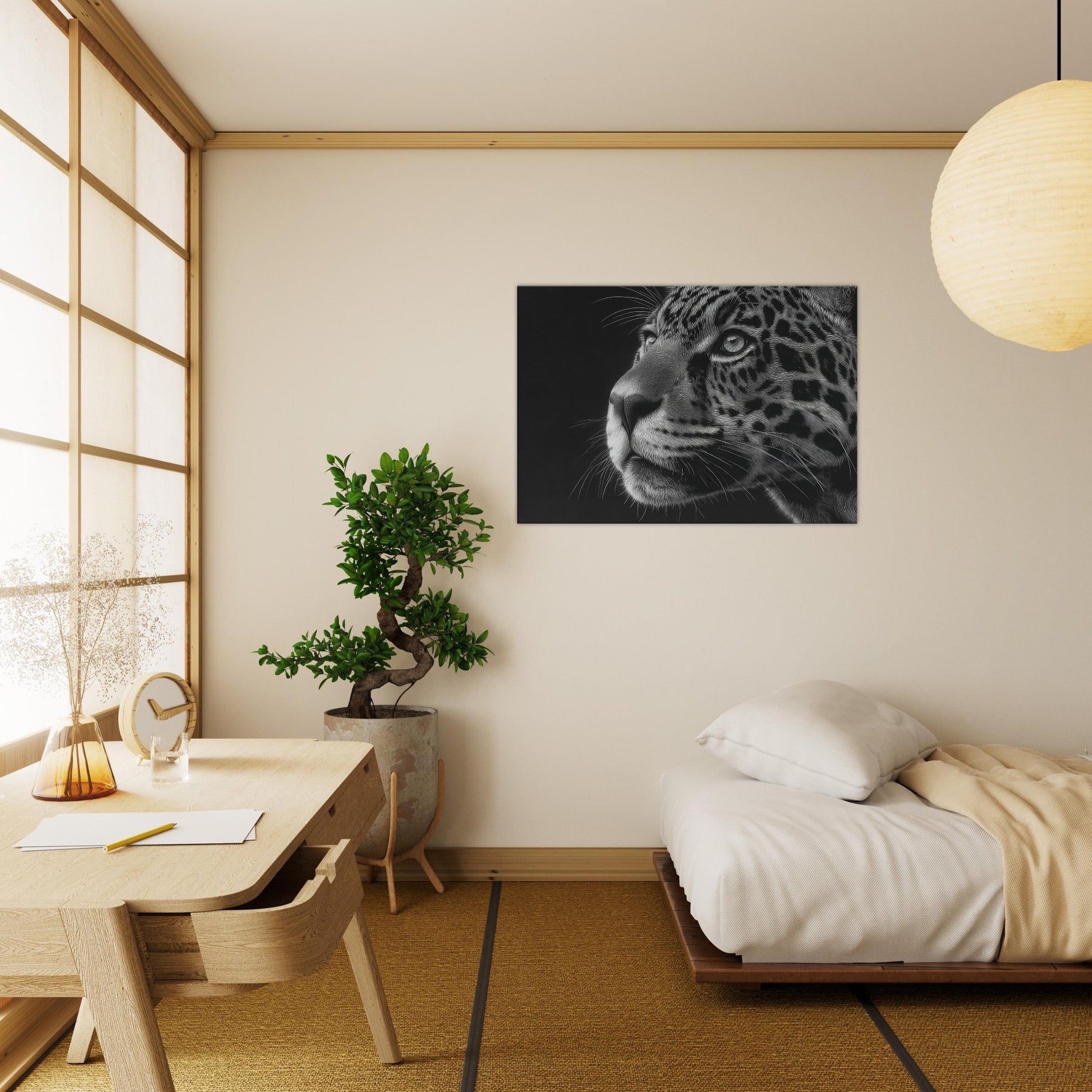 Immerse your space in the quiet majesty of a Jaguar rendered in stark black and white. The close up captures a gaze and a breath held between shadow and light, where fur becomes a mosaic of line and texture.