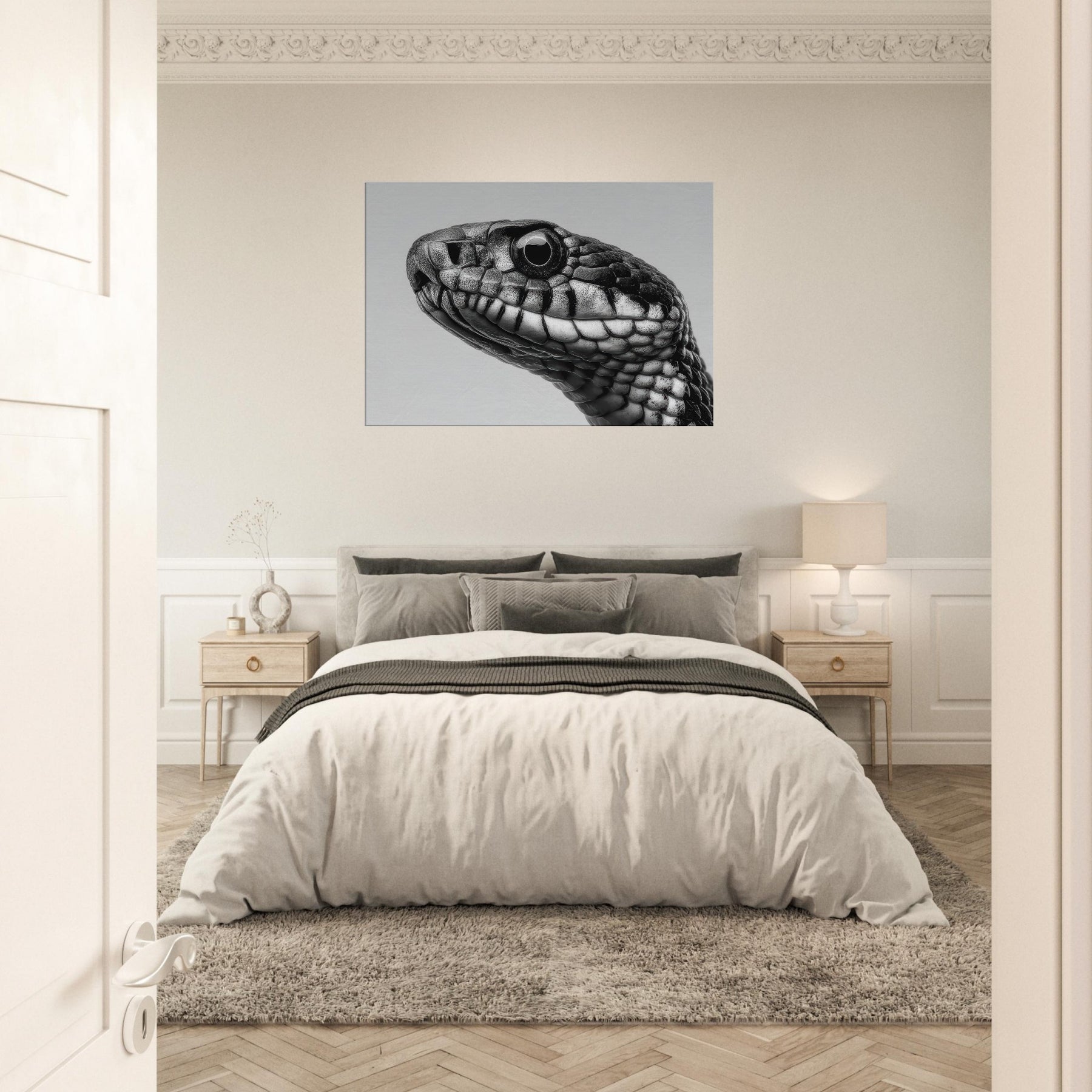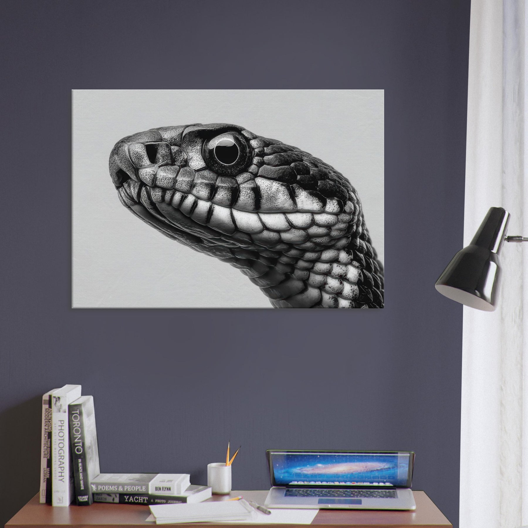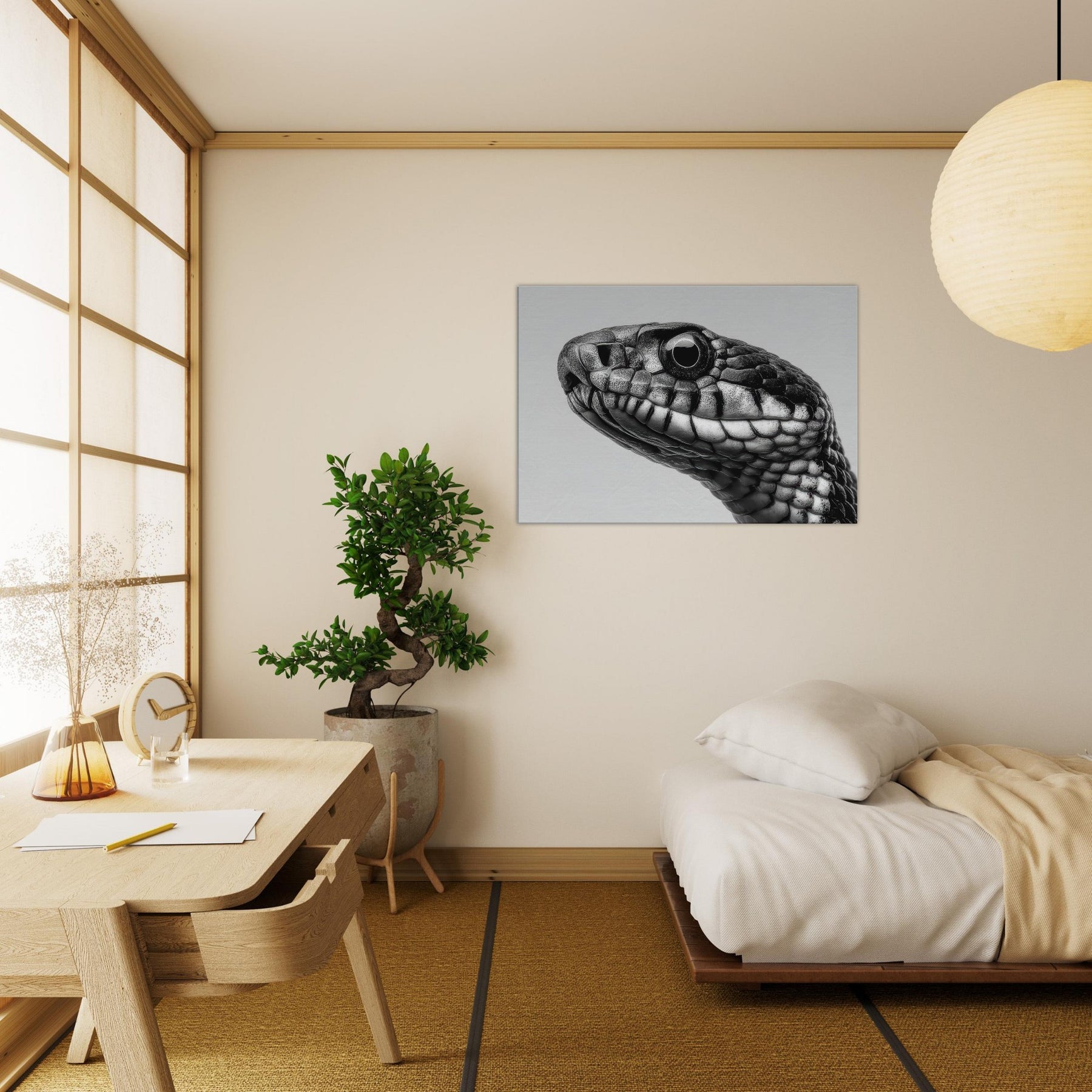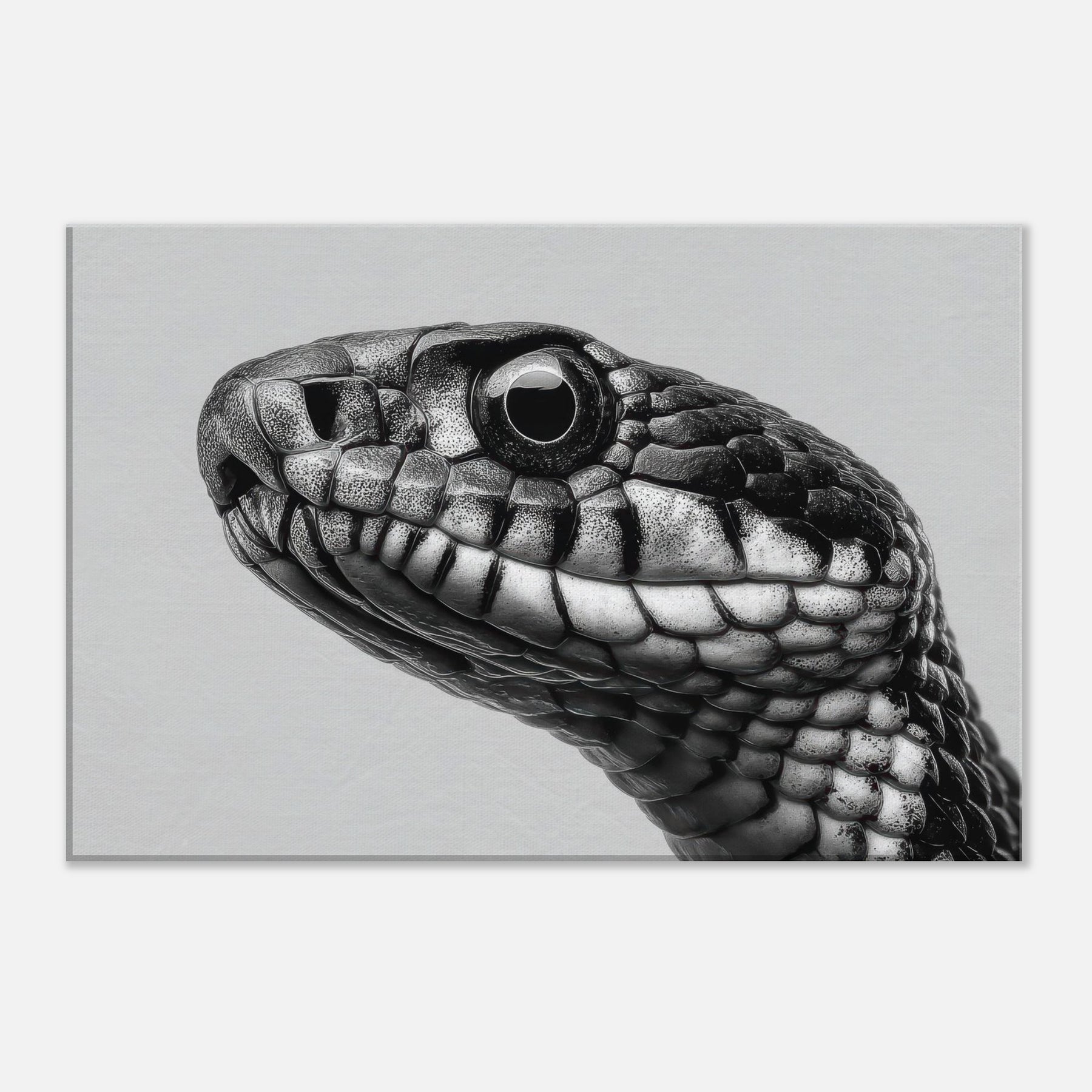 Embrace the quiet drama of the snake, captured in velvet blacks and cool whites that whisper rather than shout. This study of scales threads light and shadow into a fluid silhouette, inviting calm focus to any room.
