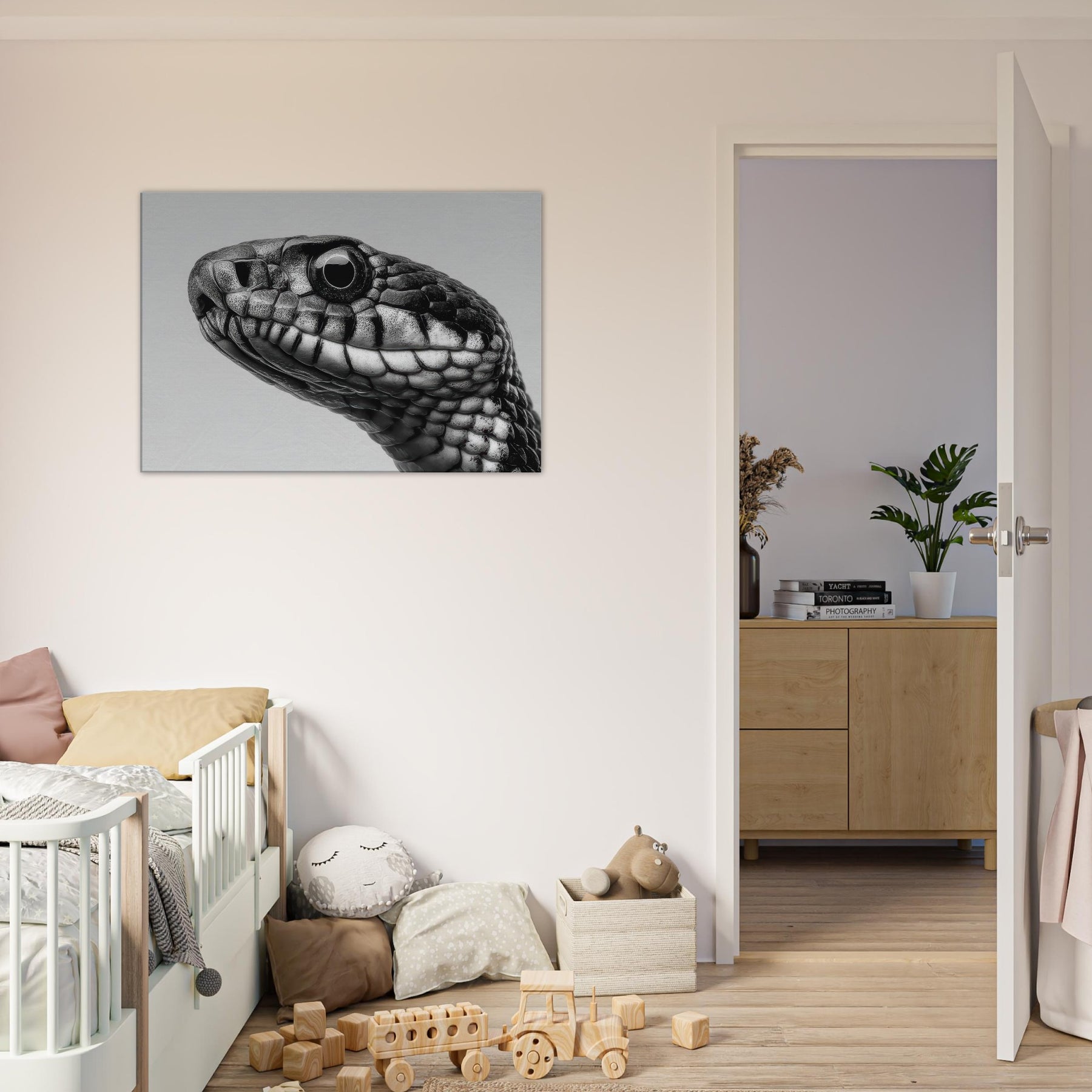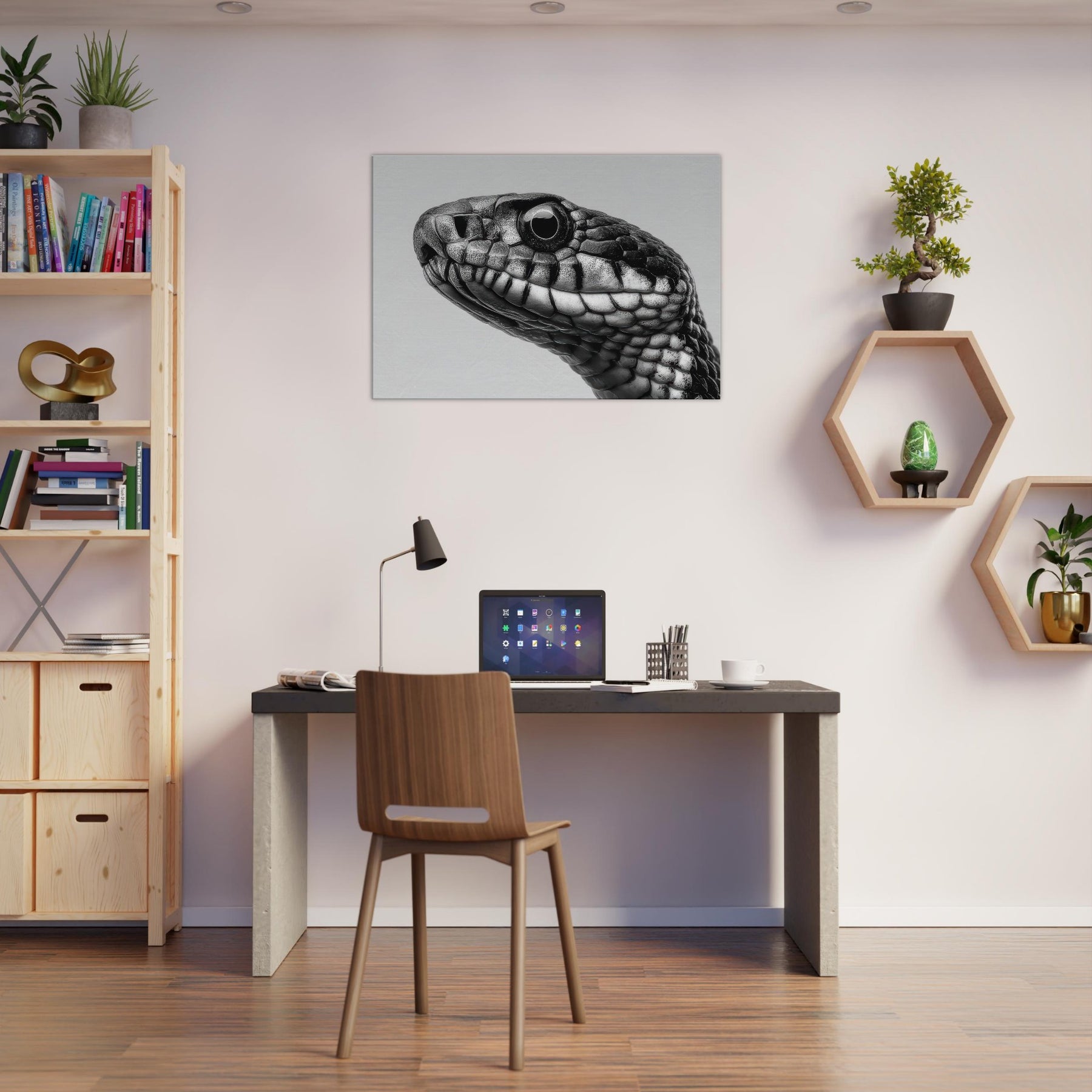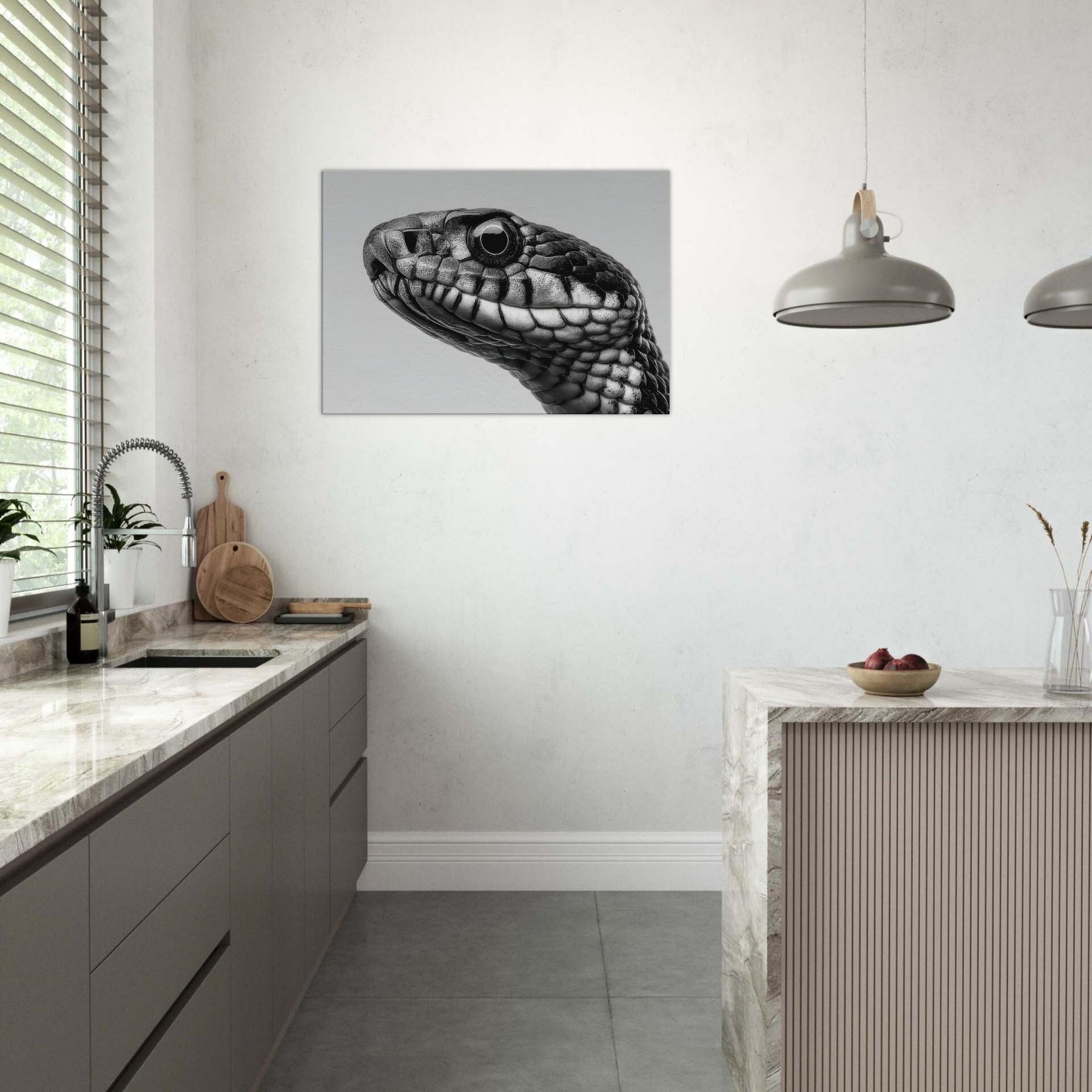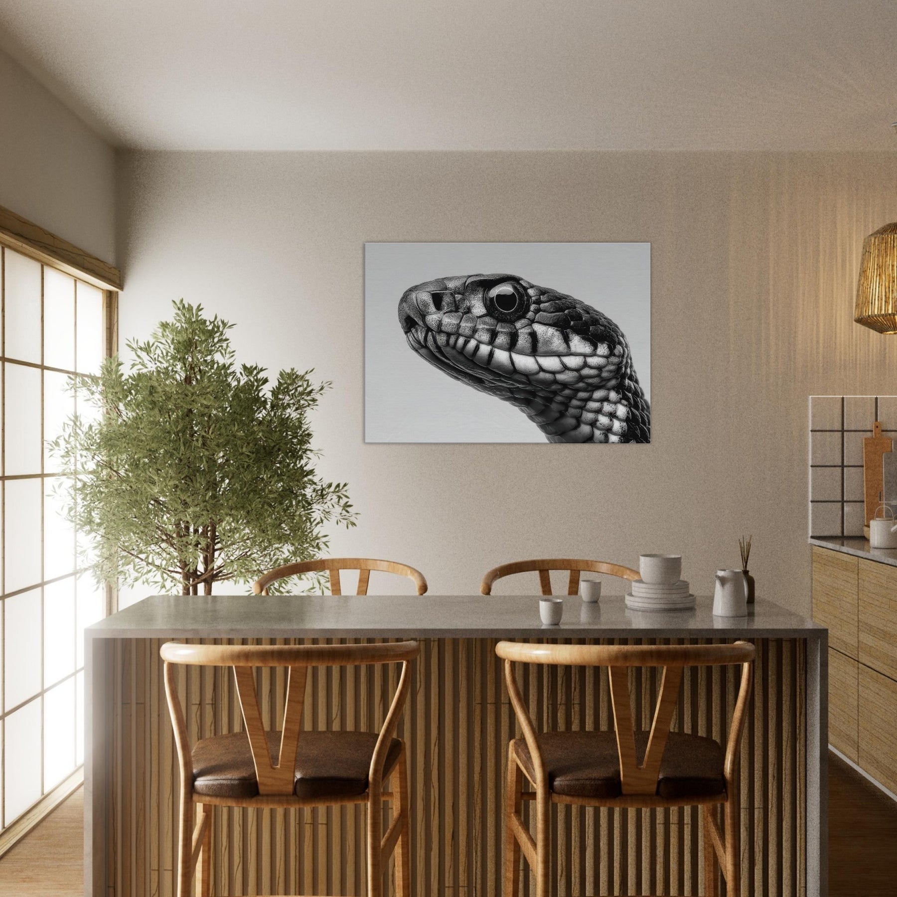 Embrace the quiet drama of the snake, captured in velvet blacks and cool whites that whisper rather than shout. This study of scales threads light and shadow into a fluid silhouette, inviting calm focus to any room.