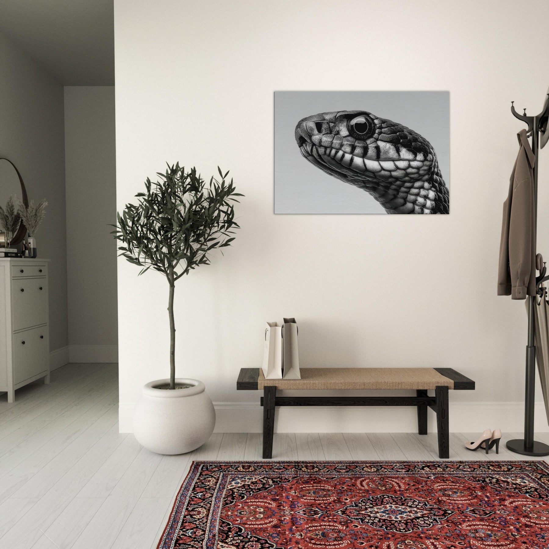 As the Primary Subject, the serpentine form becomes a meditative focal point, perfect above a sofa, in a gallery corner, or beside a bed, where the monochrome texture adds depth, sophistication, and a subtle, nocturnal grace.