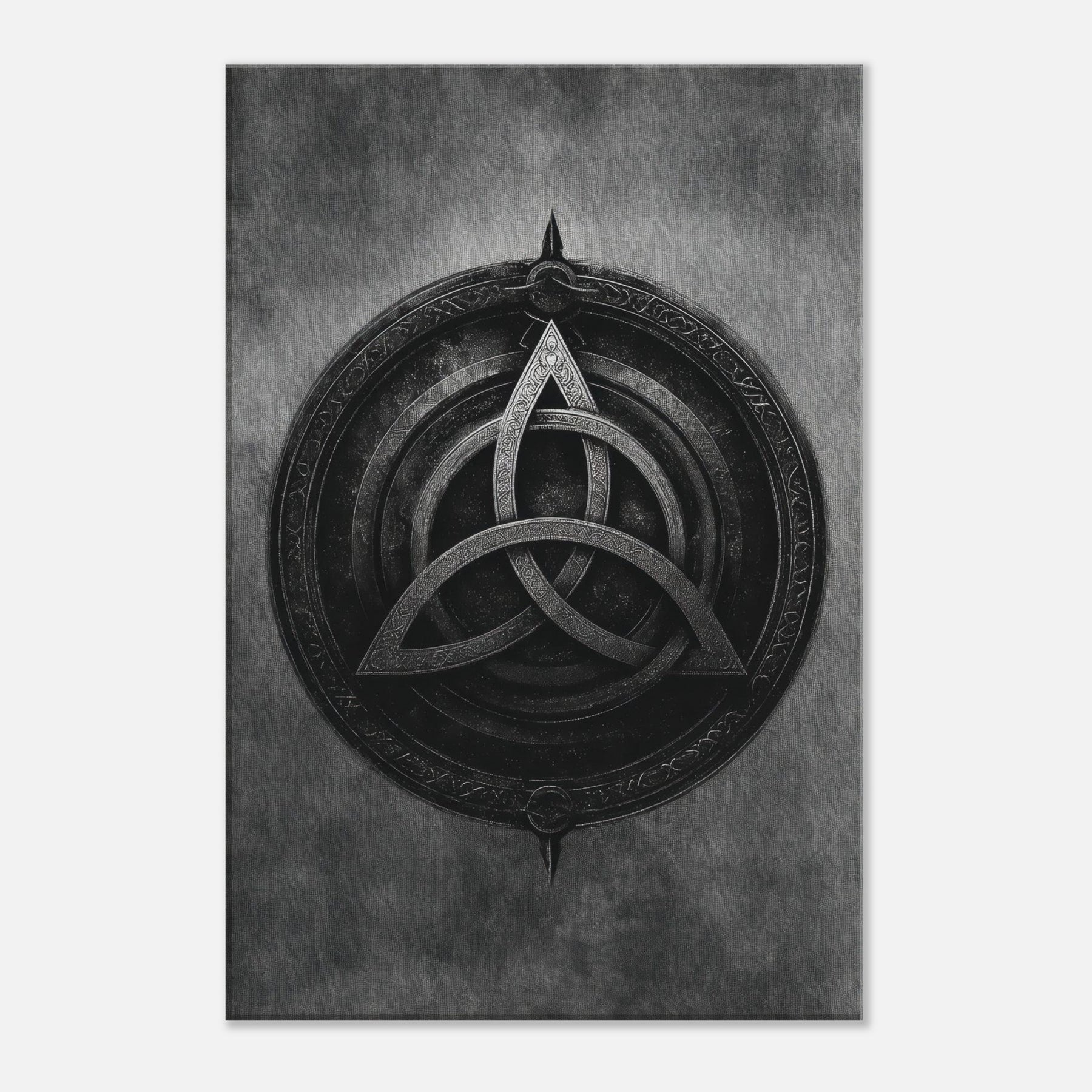Immersed in shadow and light, this piece invites a quiet reverie. The Celtic Triquetra, rendered in sinuous black ink on a soft charcoal background, circles with timeless grace an emblem of connection, protection, and mystery.