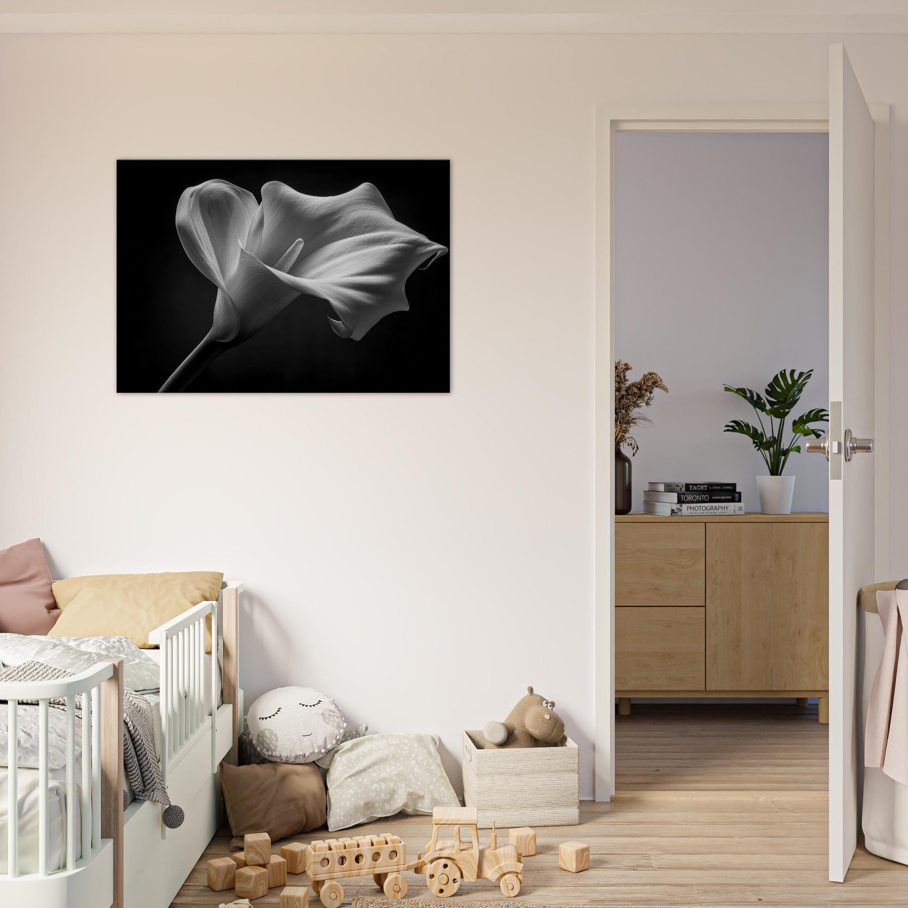 Let the Calla Lily unfold in a hush of silvered shadows. This black and white study captures the flower’s sculptural grace the smooth, curling petal, the pale central spadix, and the whisper of light along its contours.