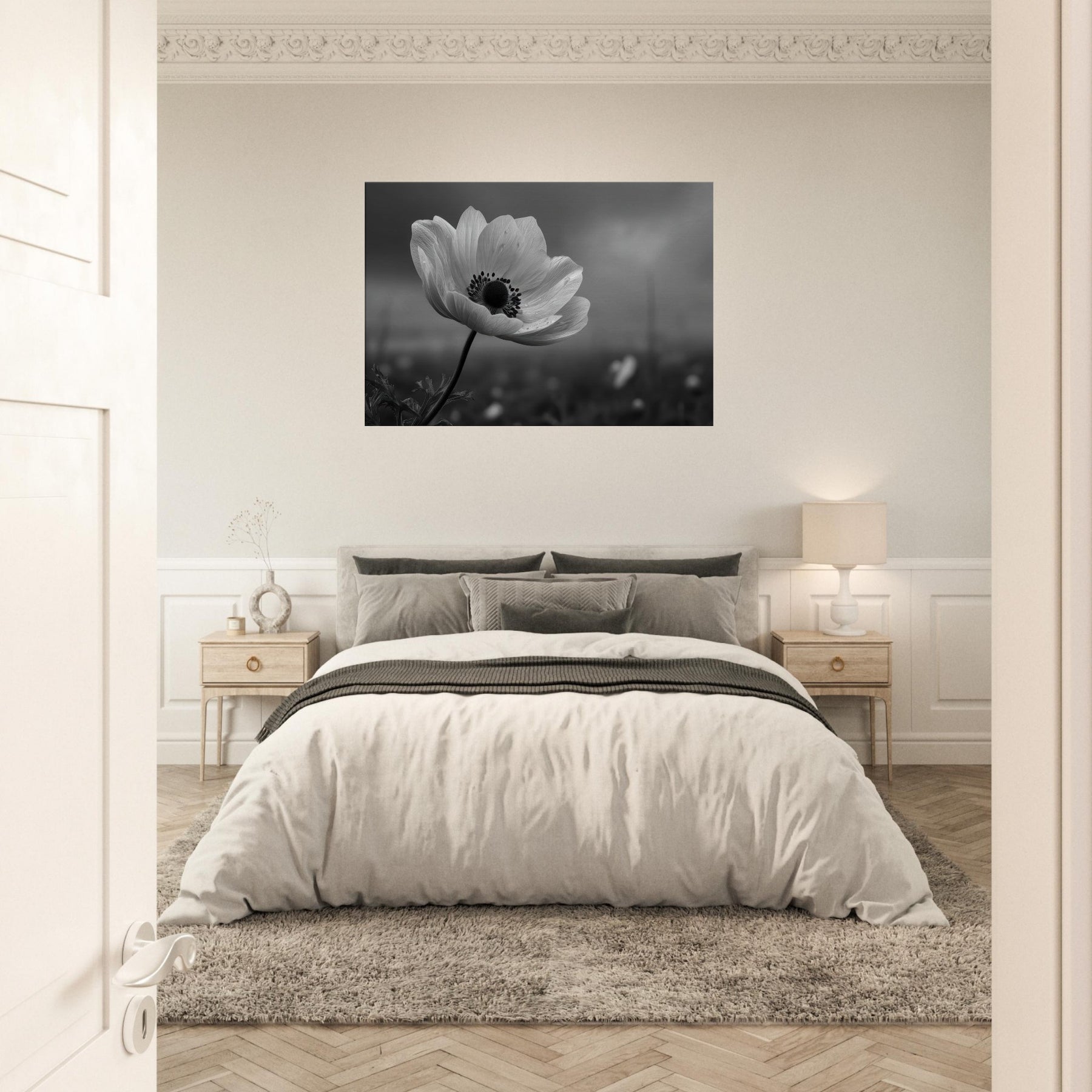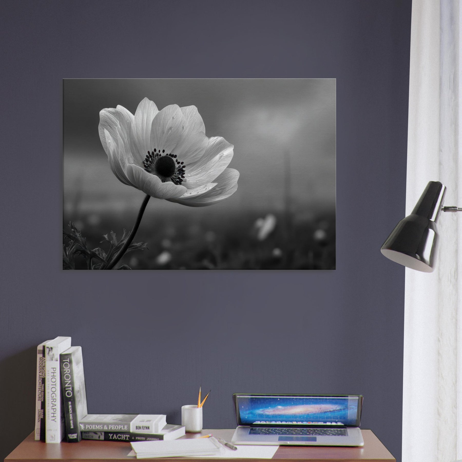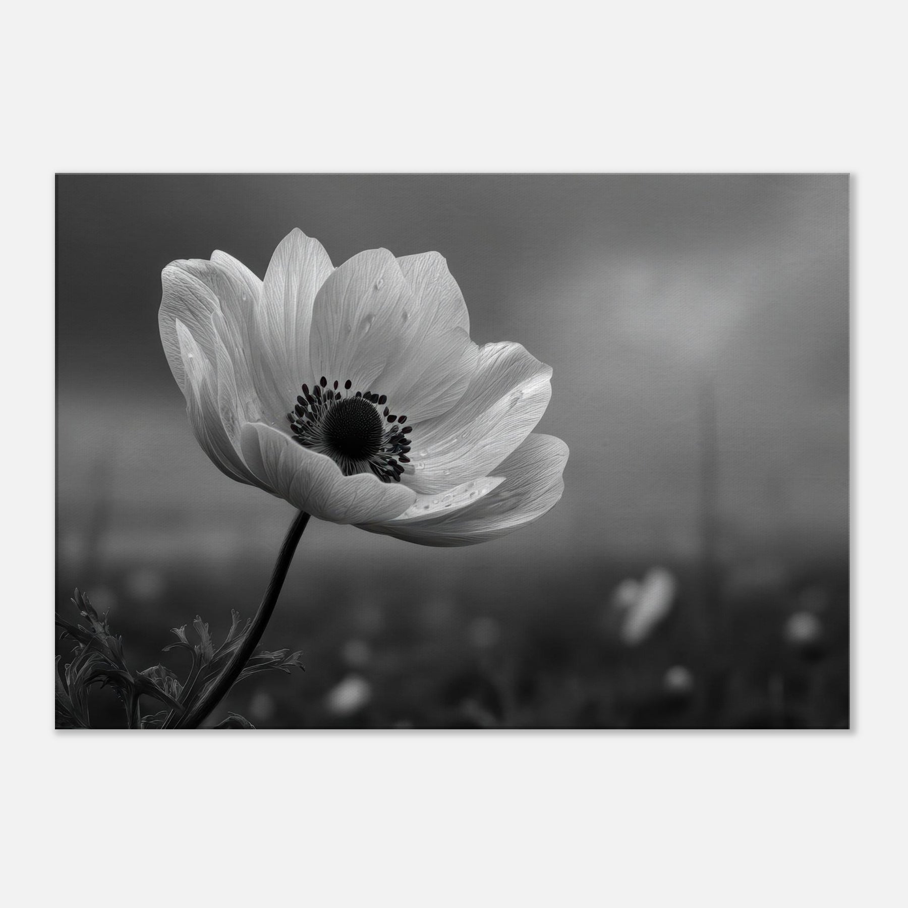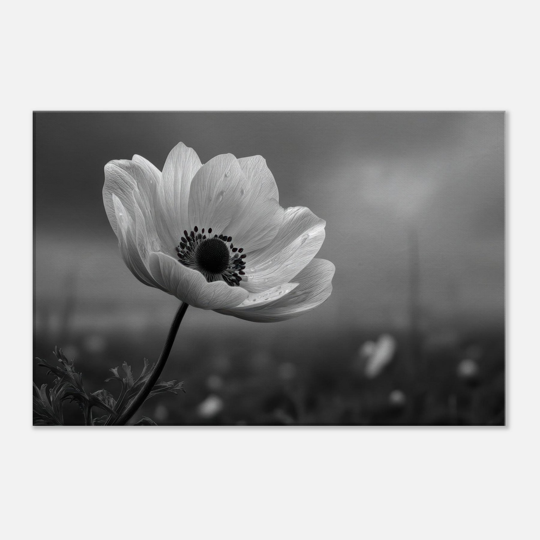 Anemone Black And White captures a lone bloom drawn in velvet grayscale, its petals unfurling with quiet confidence against a softly blurred horizon. Subtle droplets cling to each edge, catching light the way memories catch the heart. This restrained study of nature invites contemplation and calm, turning any wall into a refuge. Place it in a living room or study to illuminate space with elegance, texture, and a timeless sense of fleeting beauty.