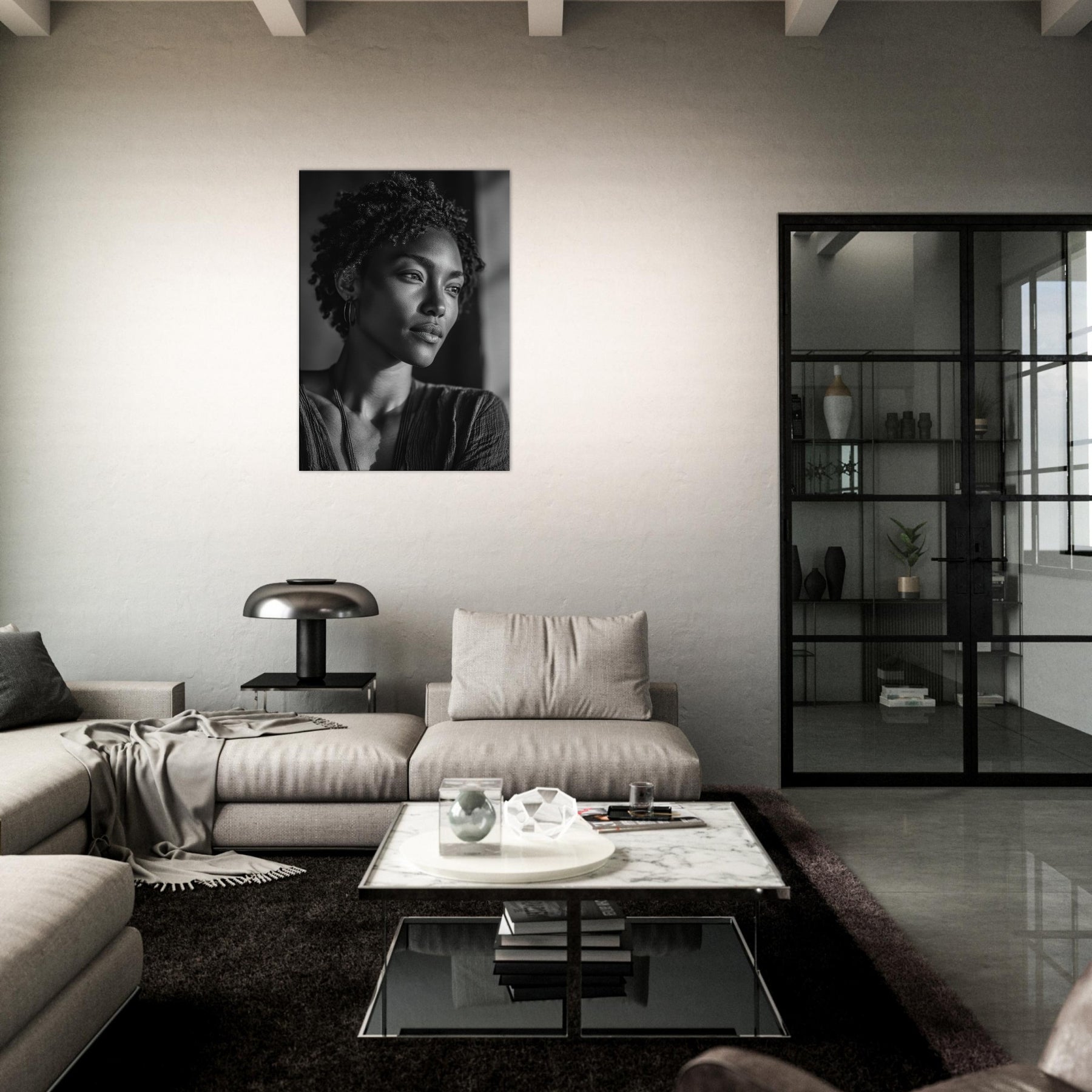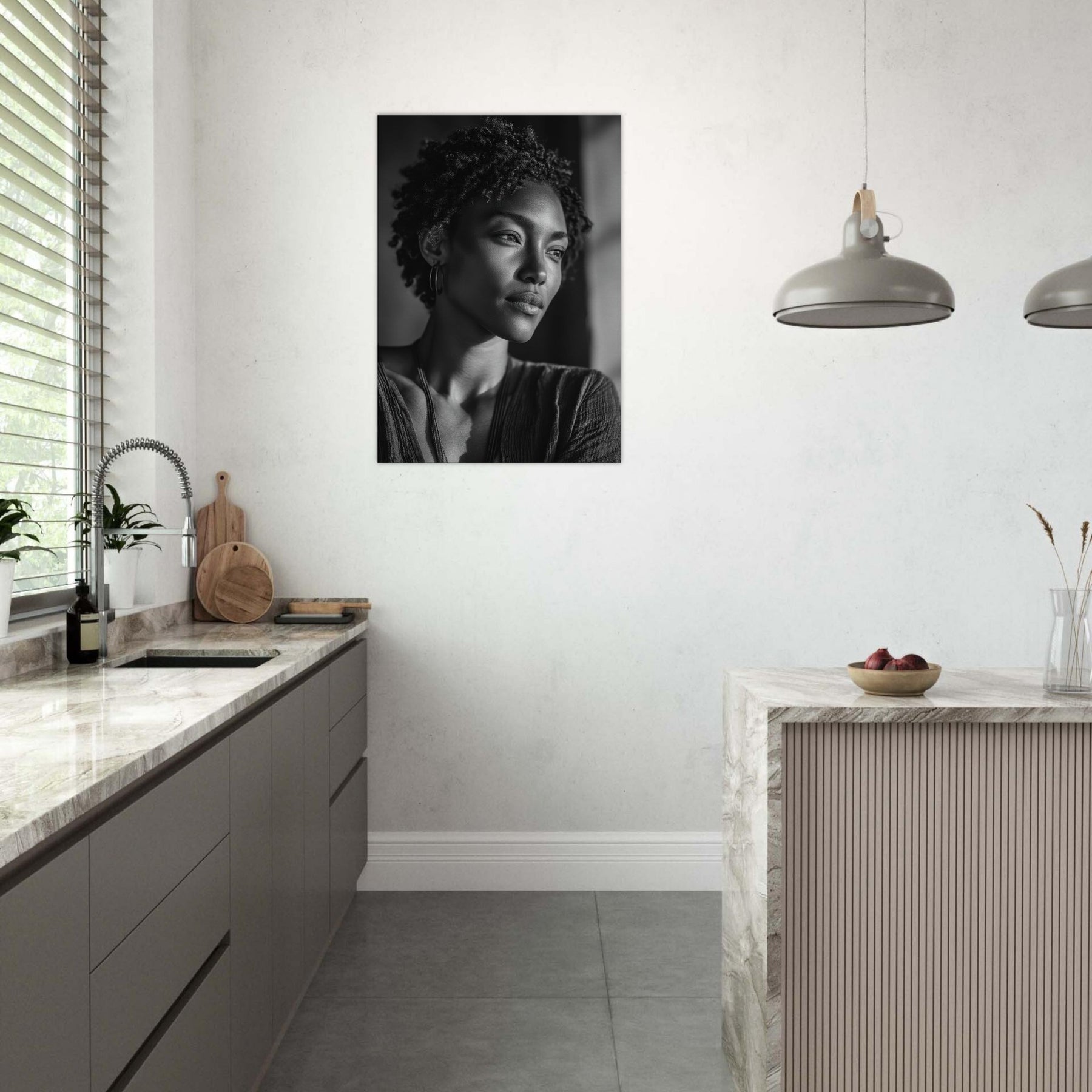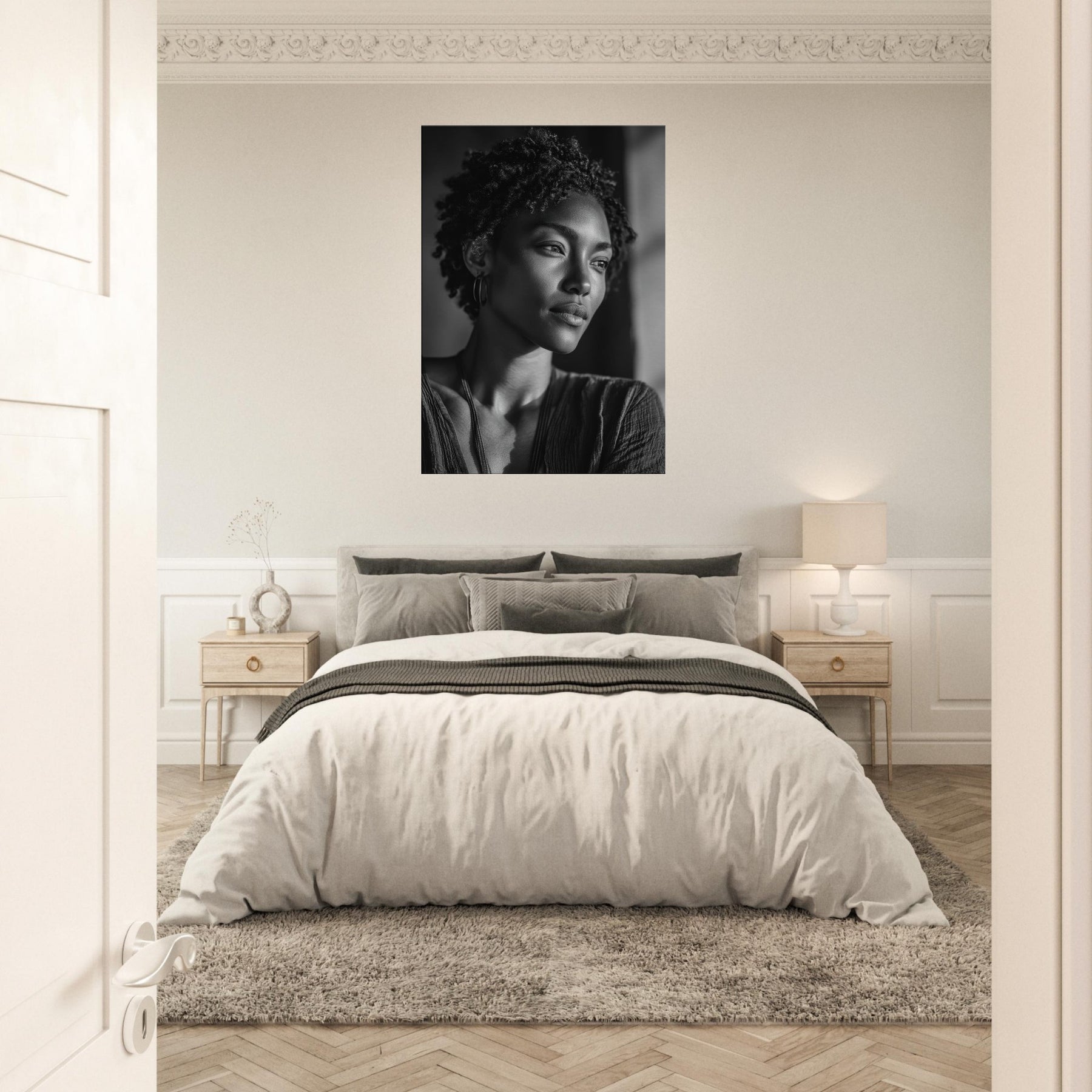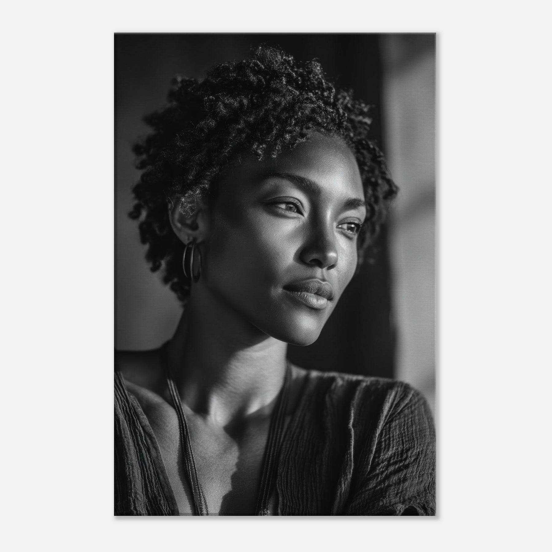 In soft grayscale, this African Woman unfolds as a quiet meditation on strength and grace. The light caresses her features, casting delicate shadows that deepen the room with atmosphere warmth, reverence, and a sense of presence.