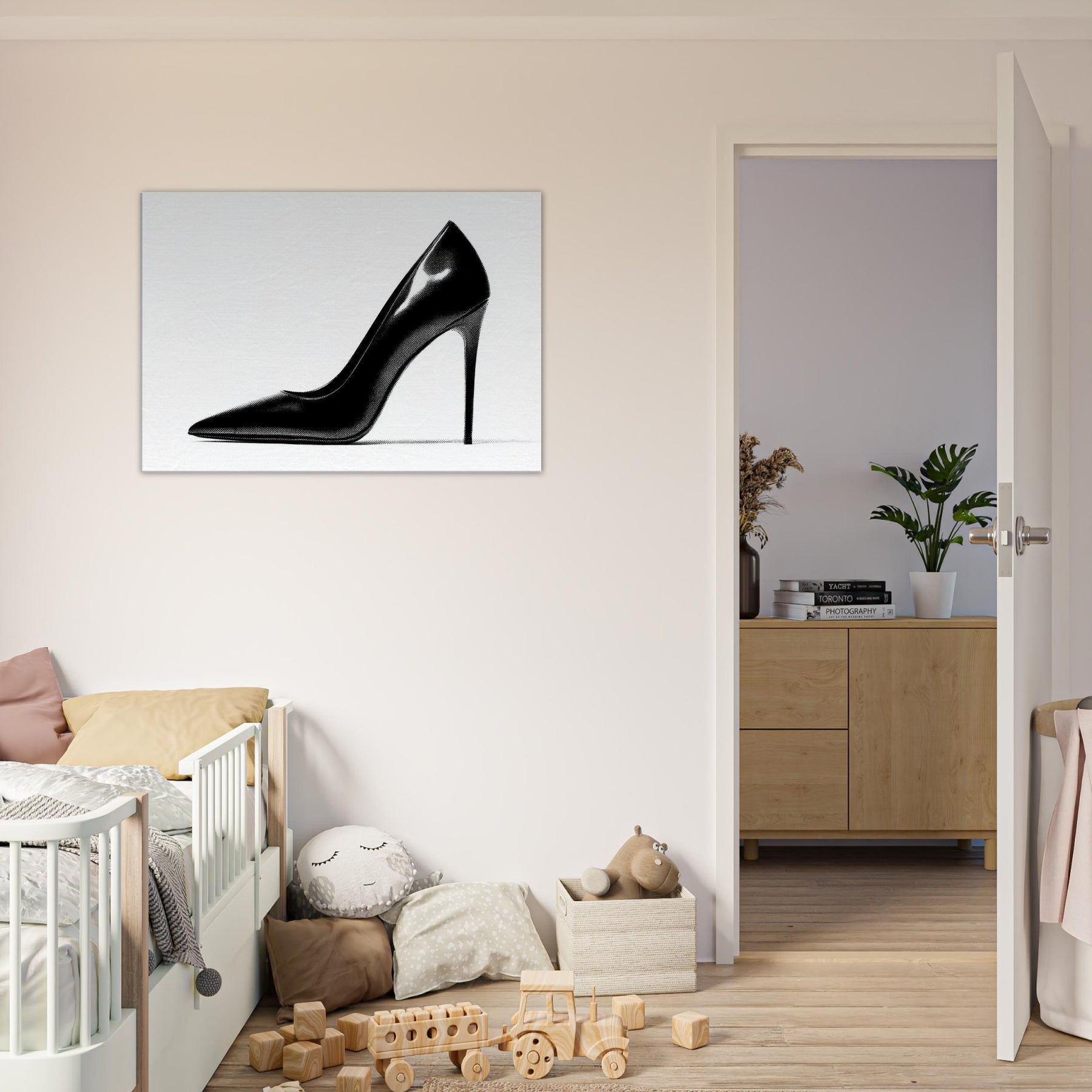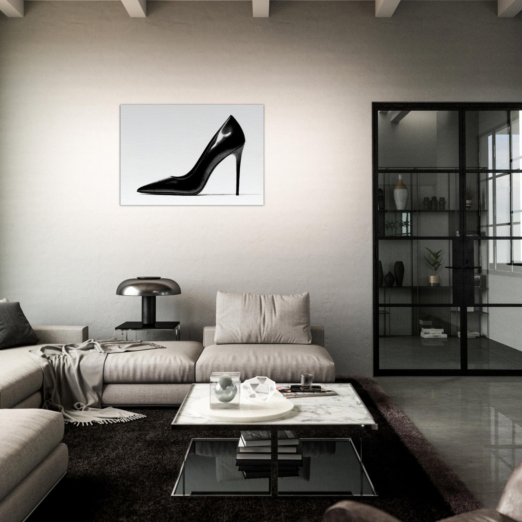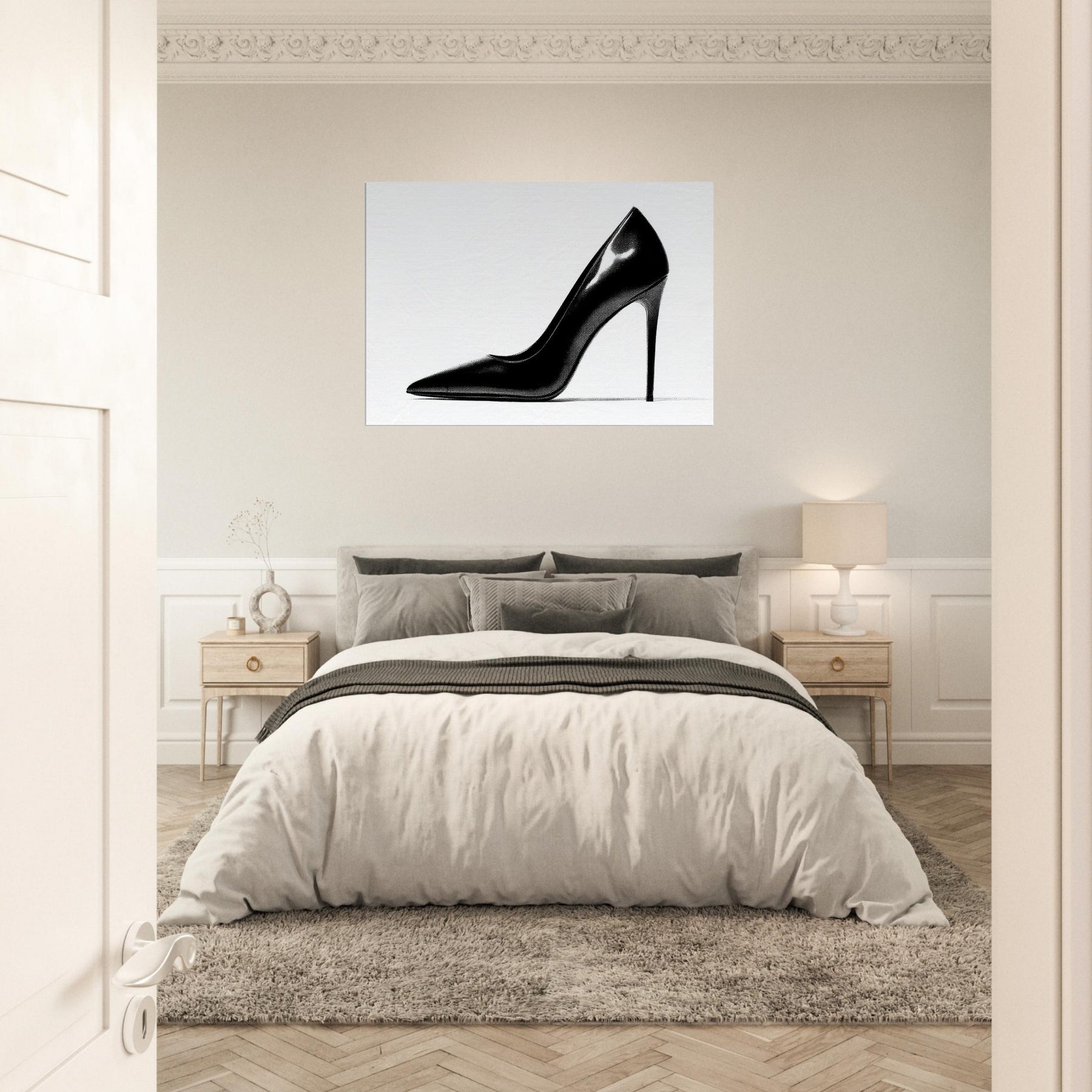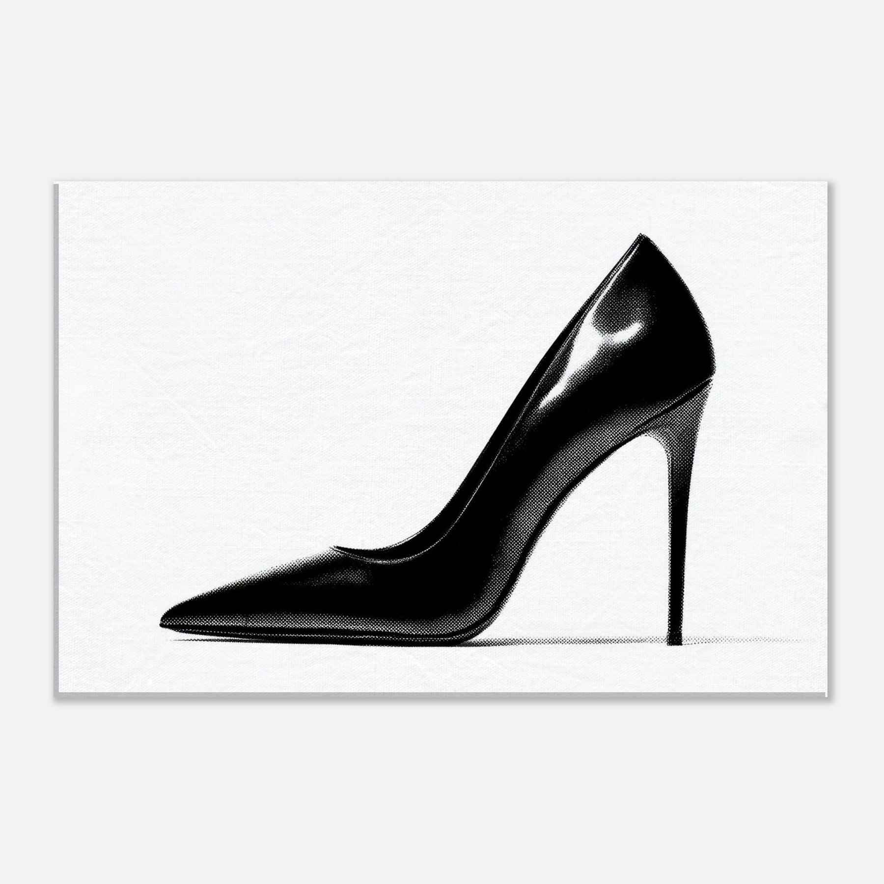 An arresting silhouette in stark black and white, this high heel captures luxury in a single, quiet moment. The bold curve divides light and shadow, inviting the eye to explore every whisper of line and form.