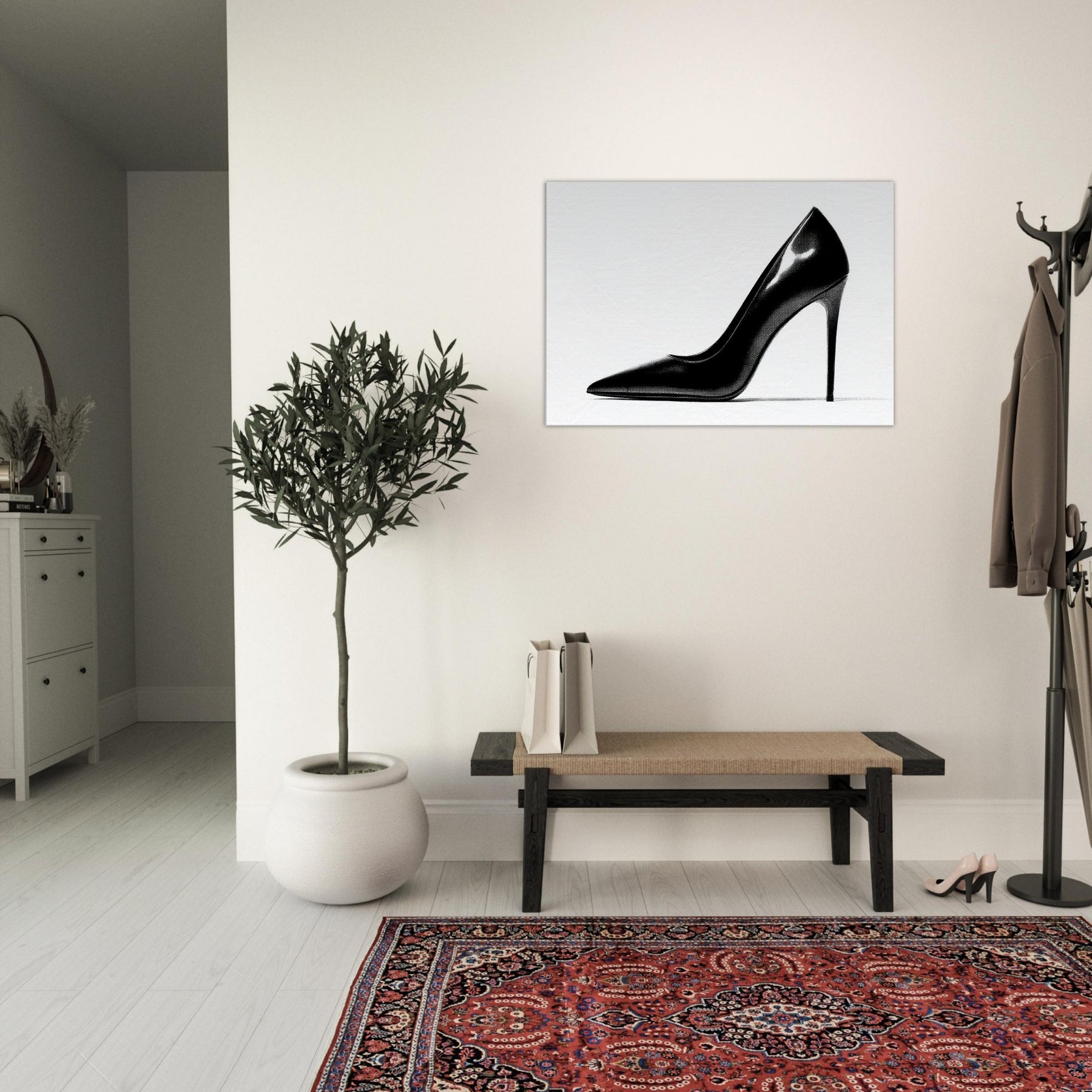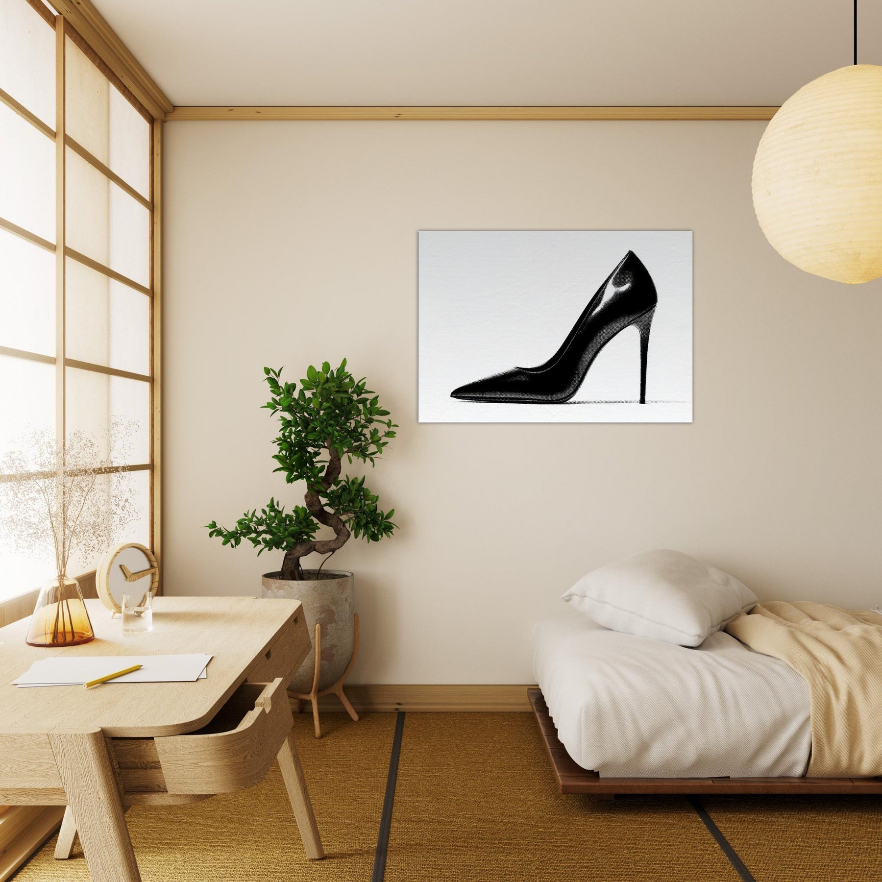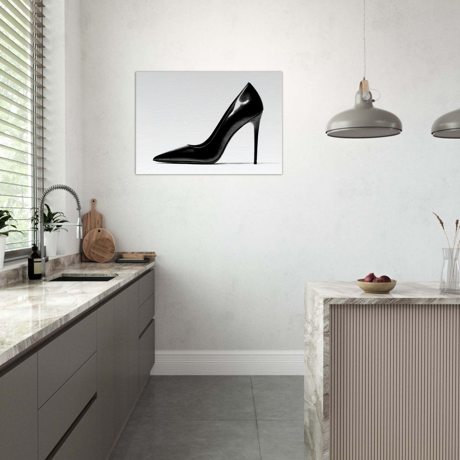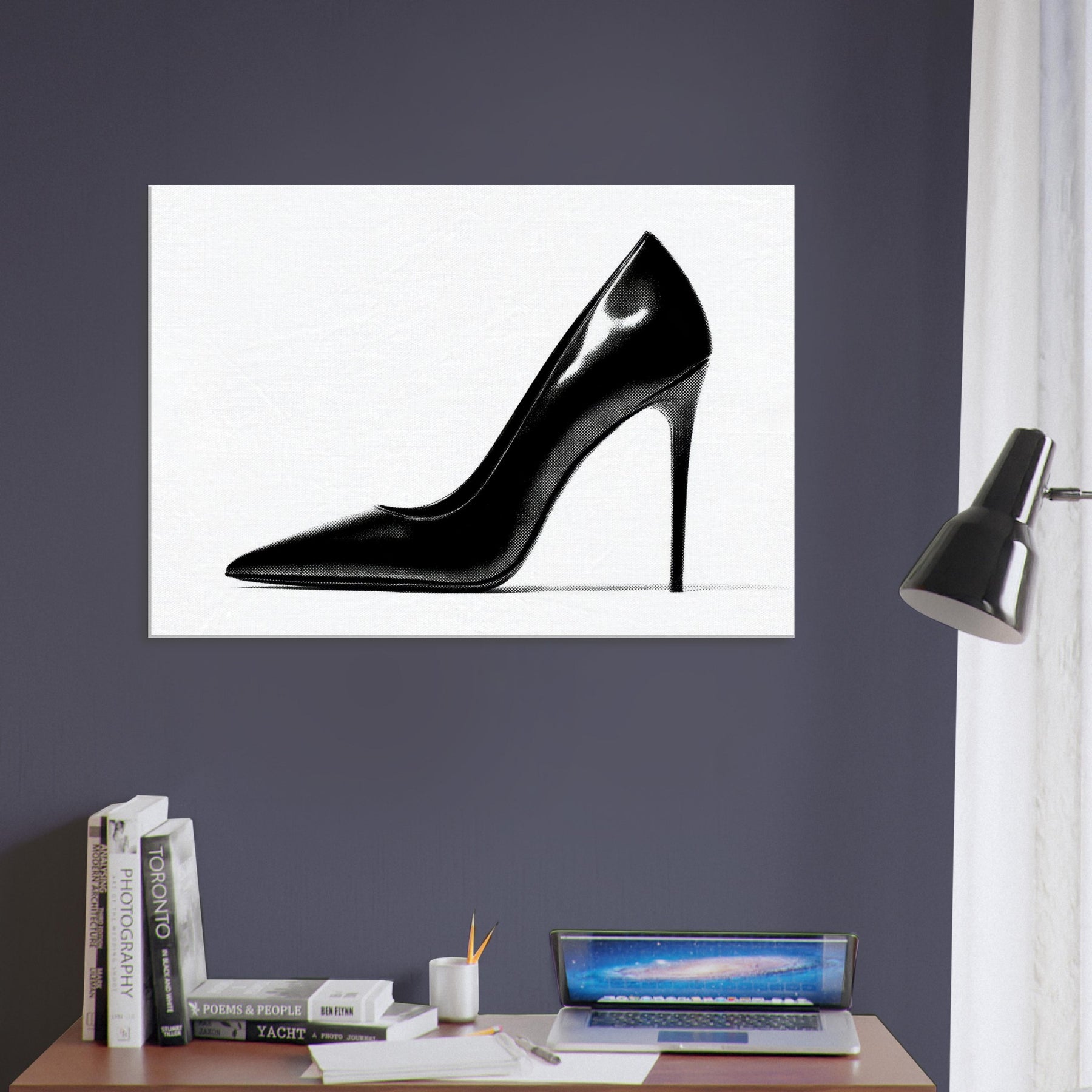 An arresting silhouette in stark black and white, this high heel captures luxury in a single, quiet moment. The bold curve divides light and shadow, inviting the eye to explore every whisper of line and form.