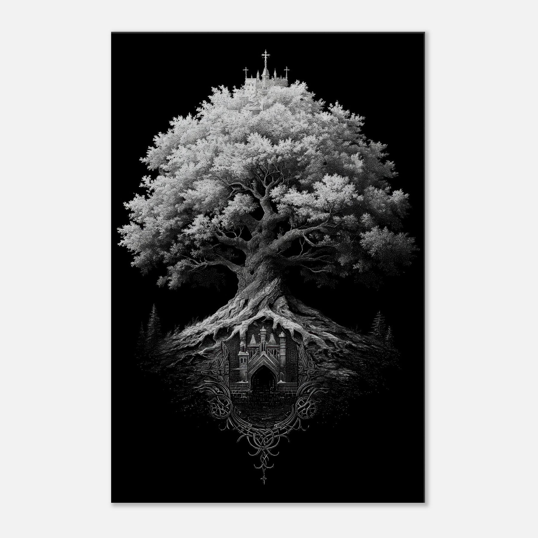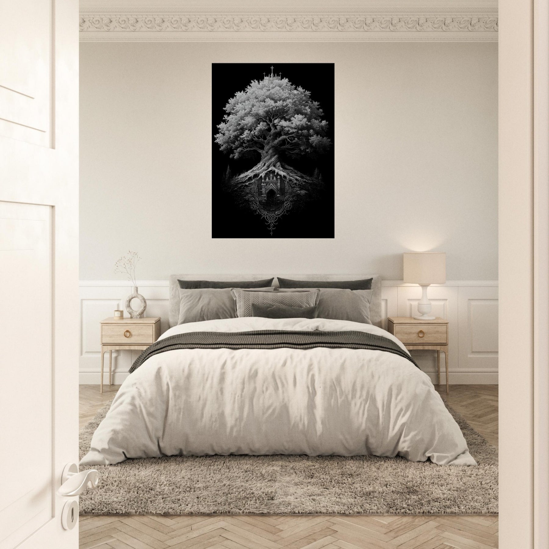 Echoes of ancient wisdom gather in the Kabbalah Tree of Life, rendered in stark black and white as a monastic meditation.