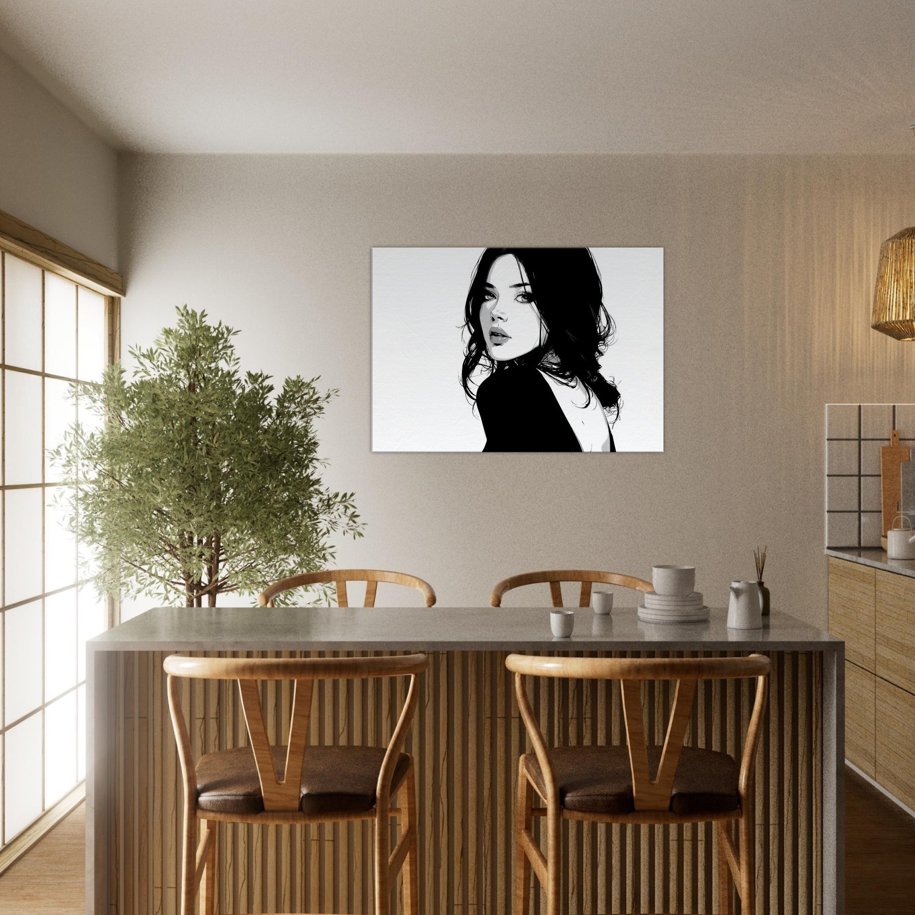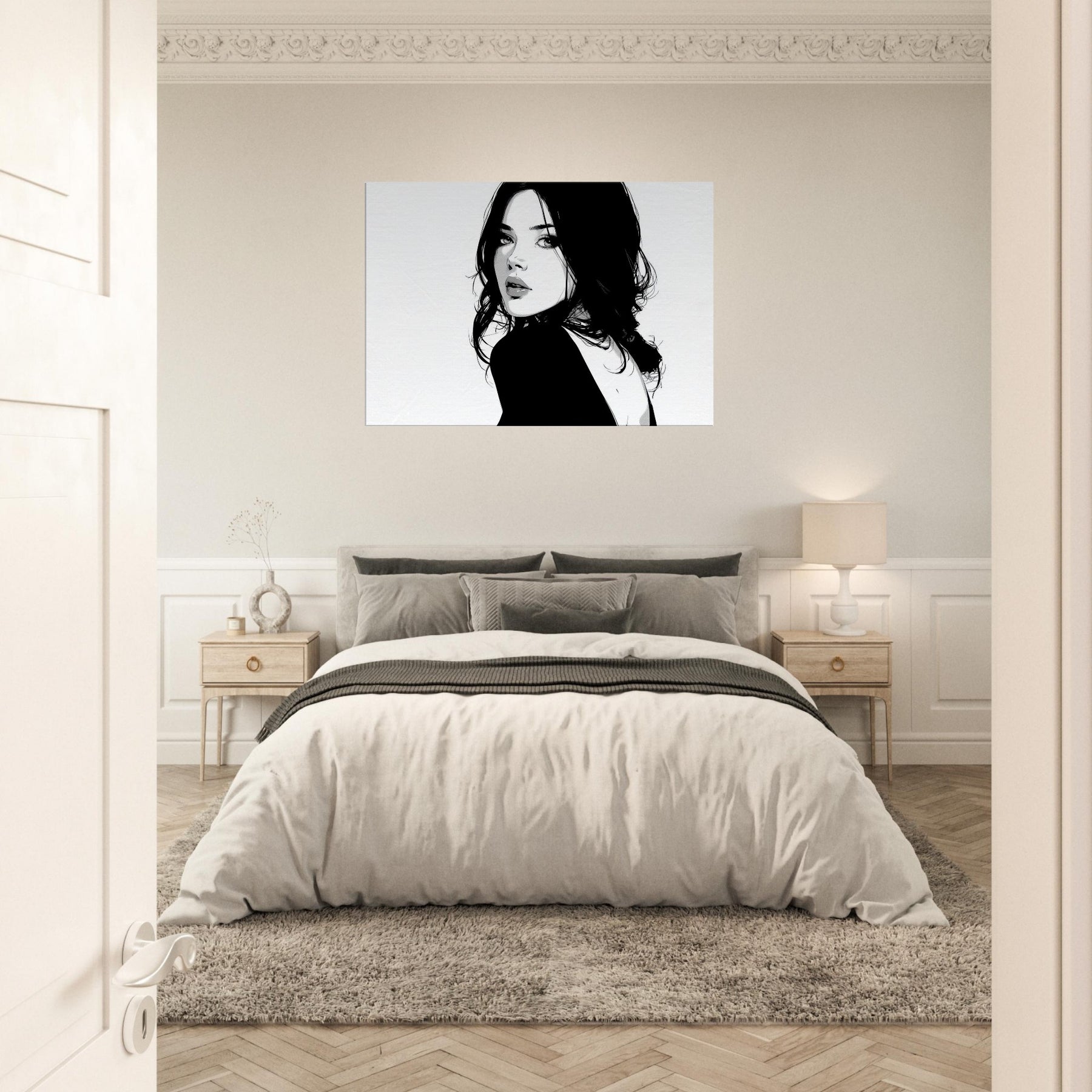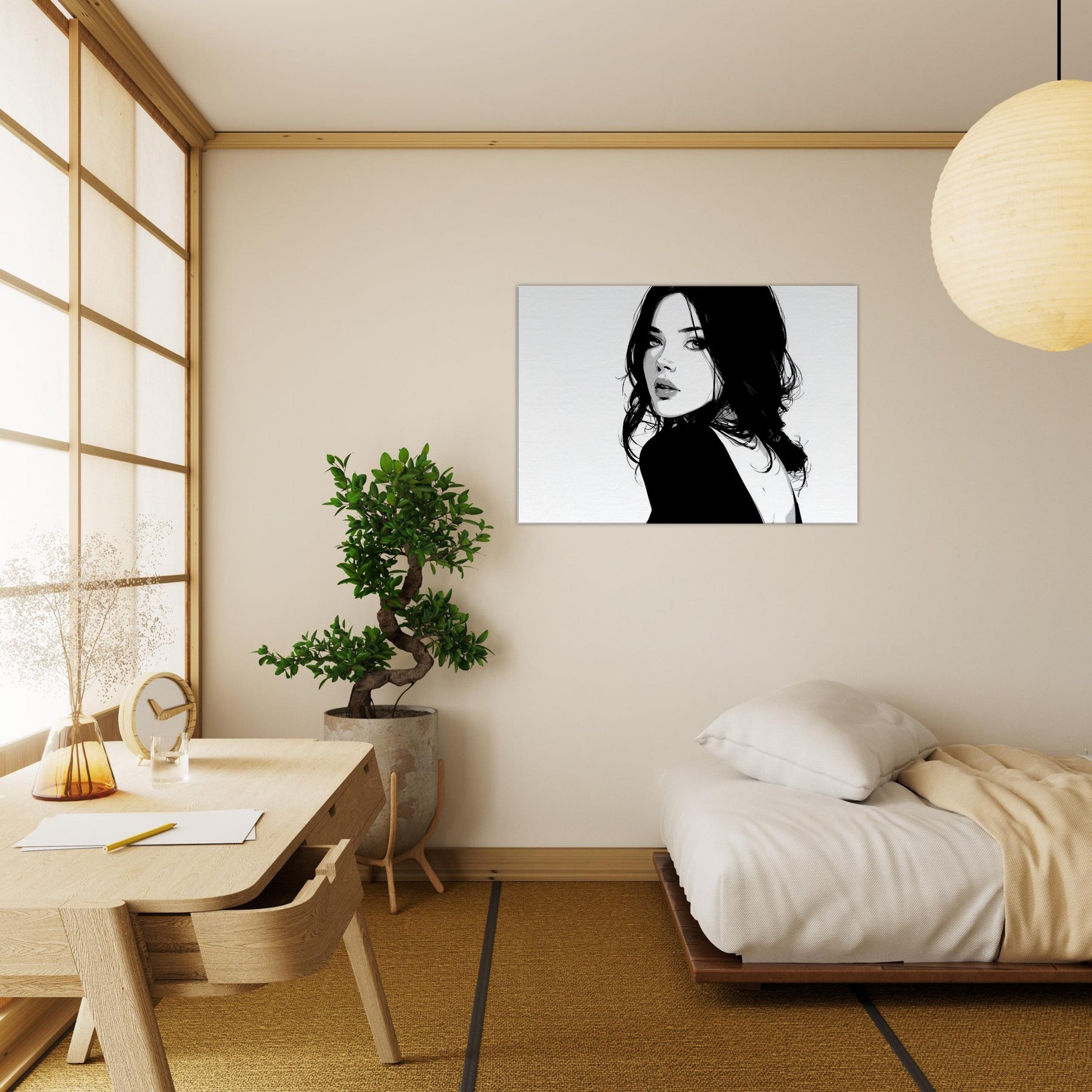The high contrast palette lends drama without clutter, making it a magnetic focal point in a living room or bedroom. Its pared down elegance pairs beautifully with modern furniture and soft textures, while the negative space suggests breath and balance, turning walls into a gallery of restraint and poise.