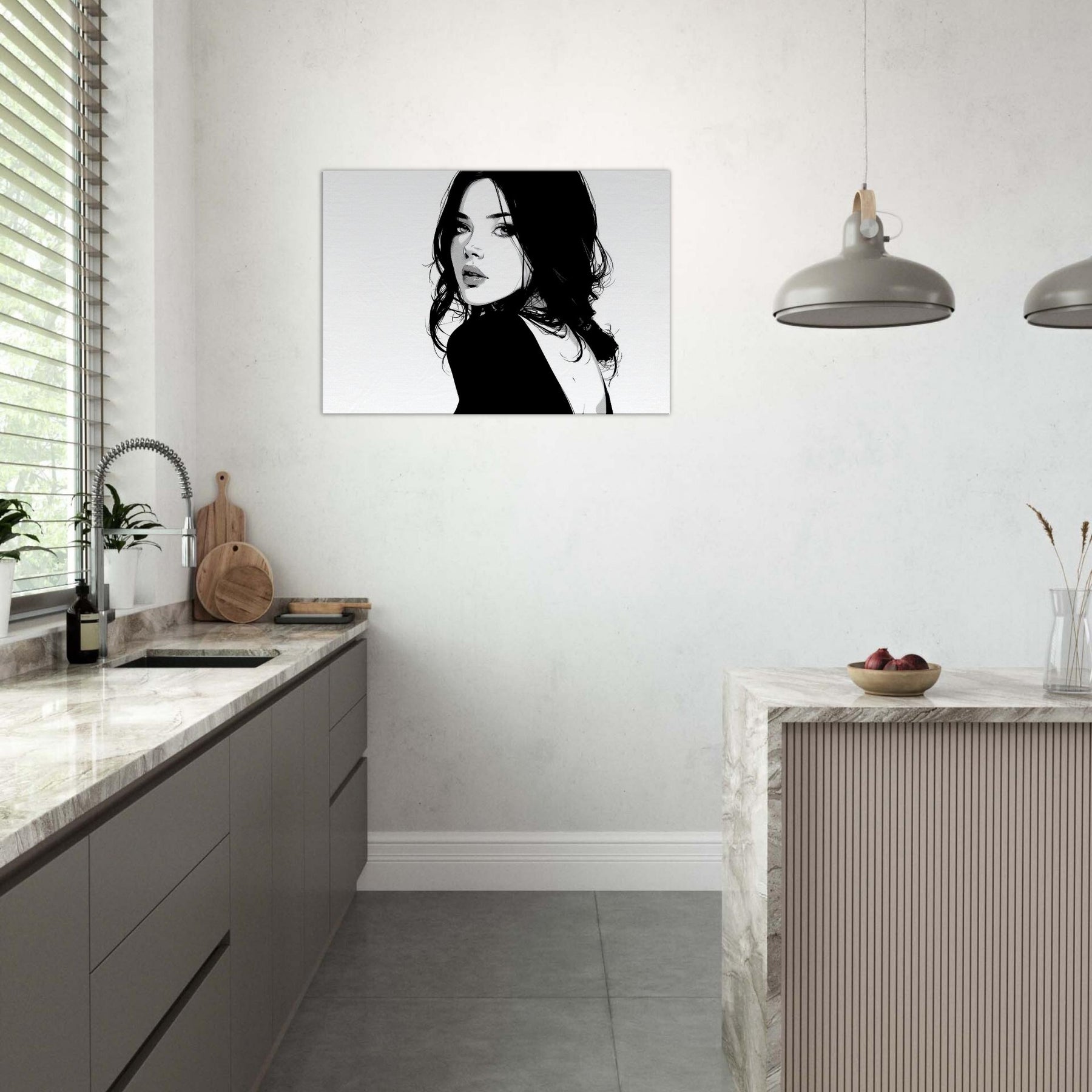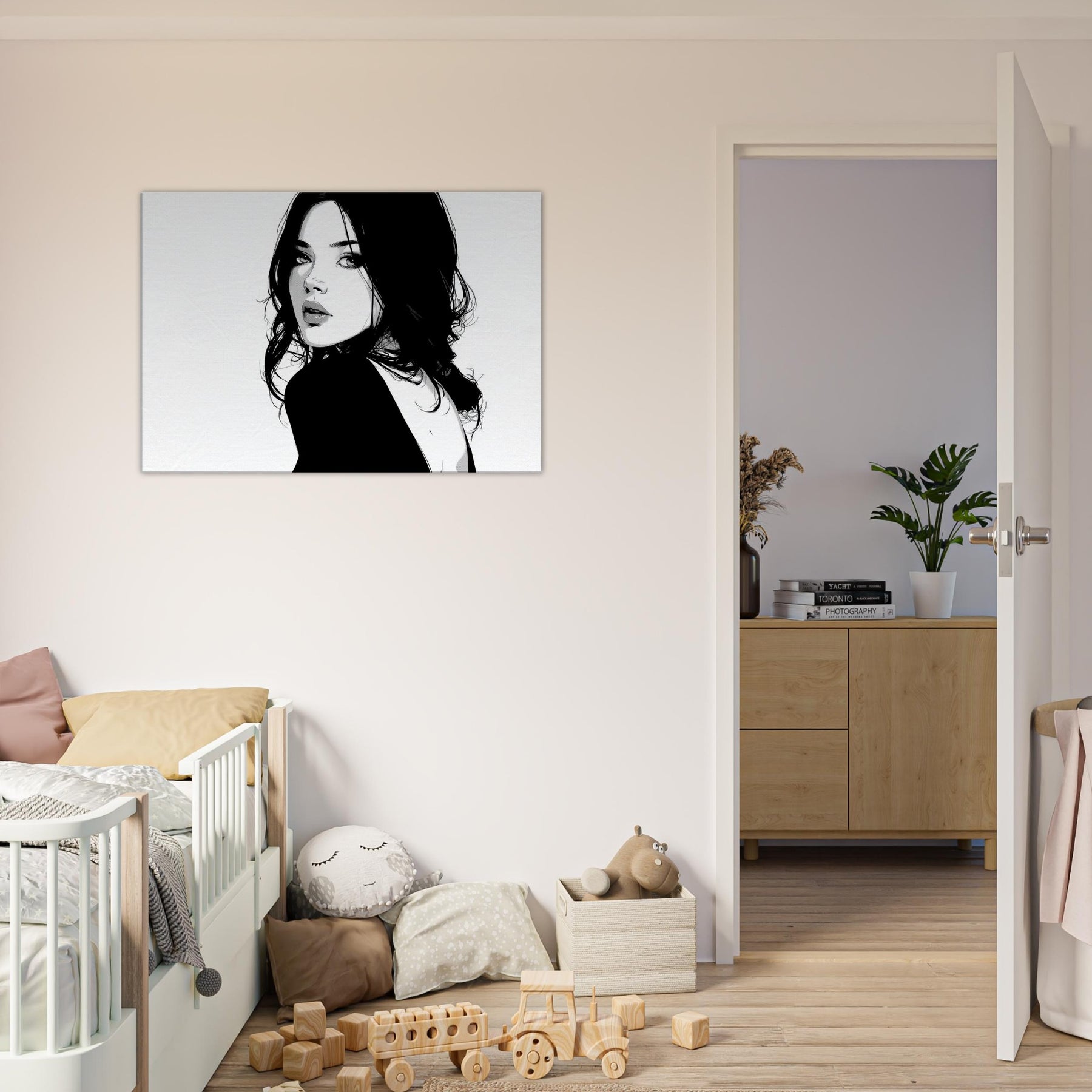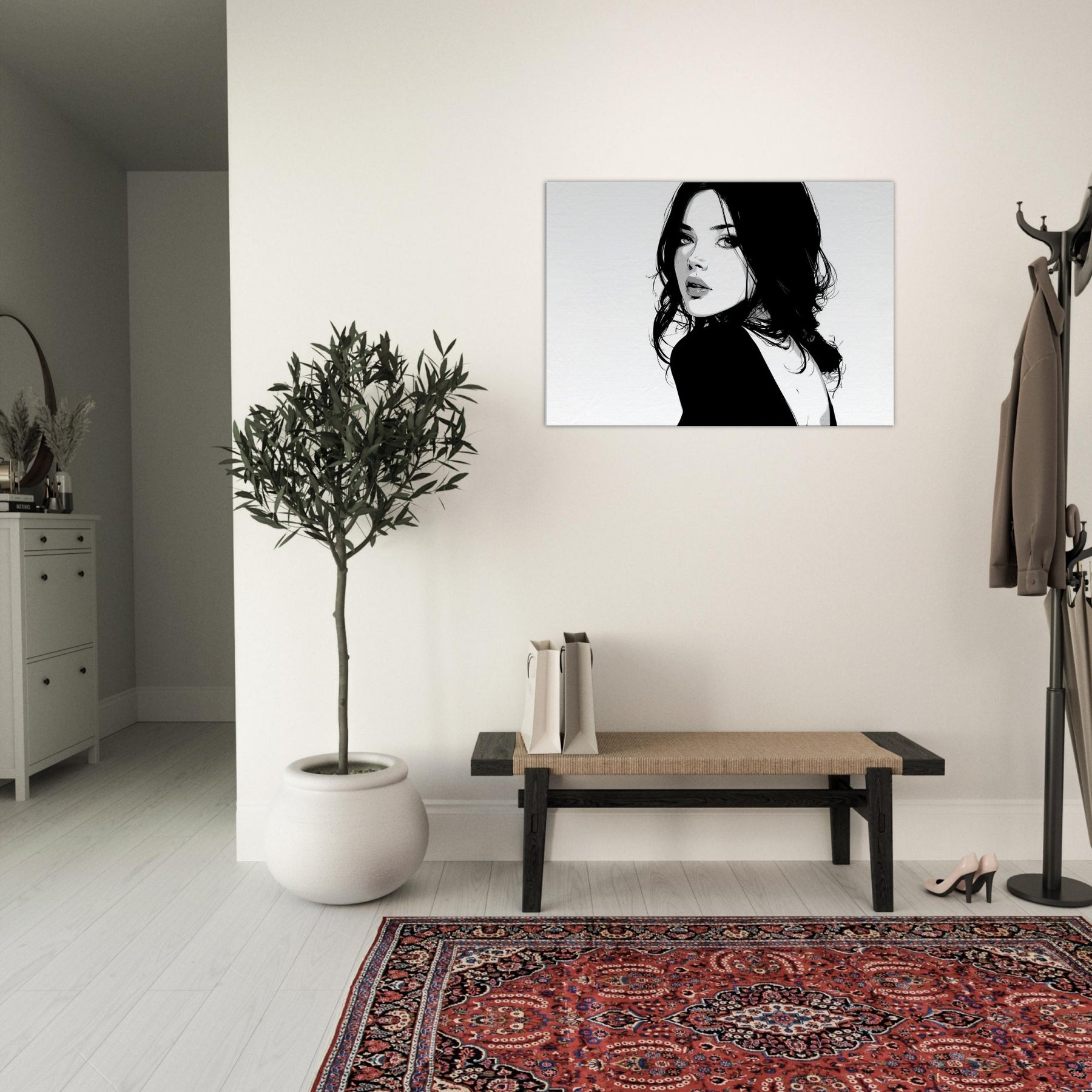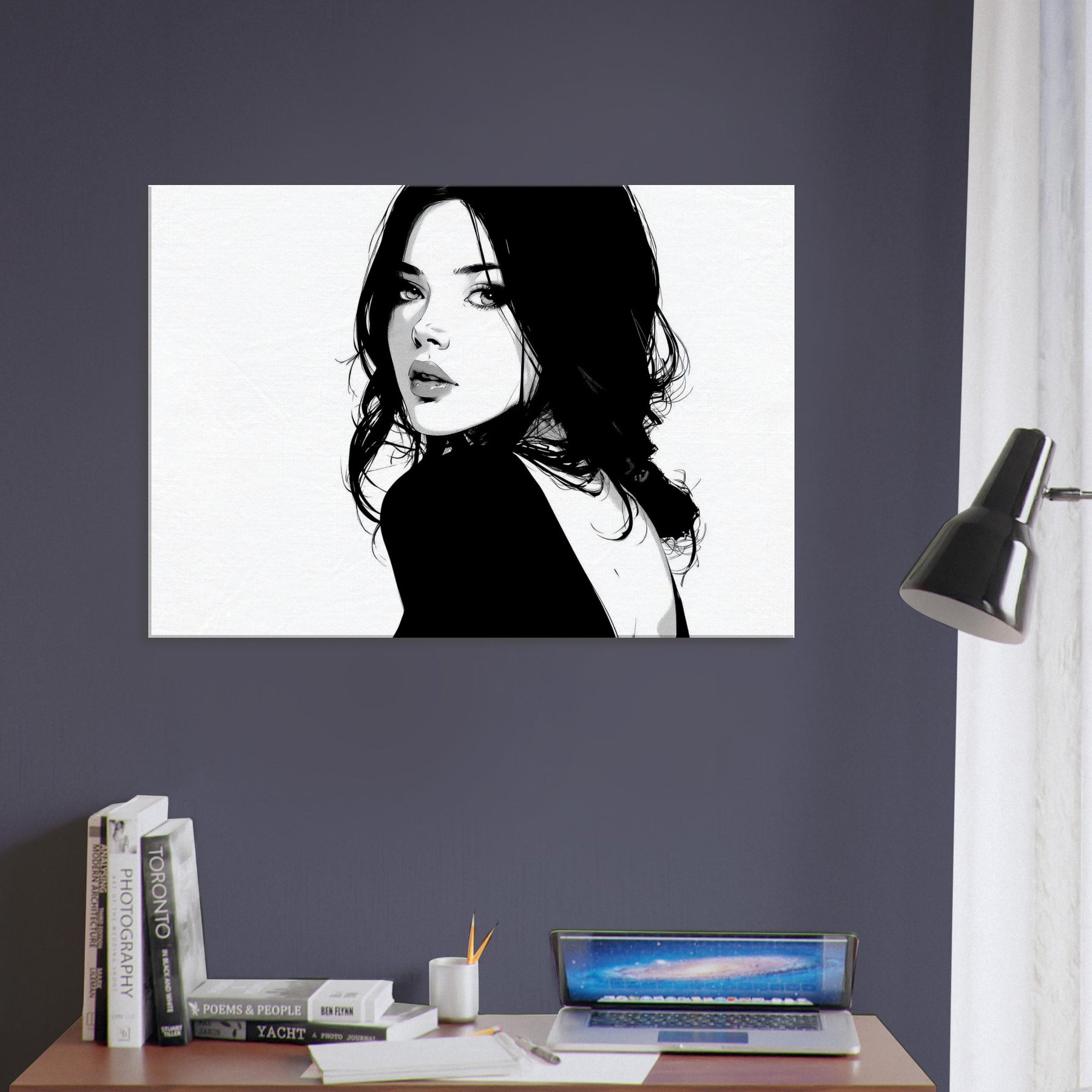 The high contrast palette lends drama without clutter, making it a magnetic focal point in a living room or bedroom. Its pared down elegance pairs beautifully with modern furniture and soft textures, while the negative space suggests breath and balance, turning walls into a gallery of restraint and poise.