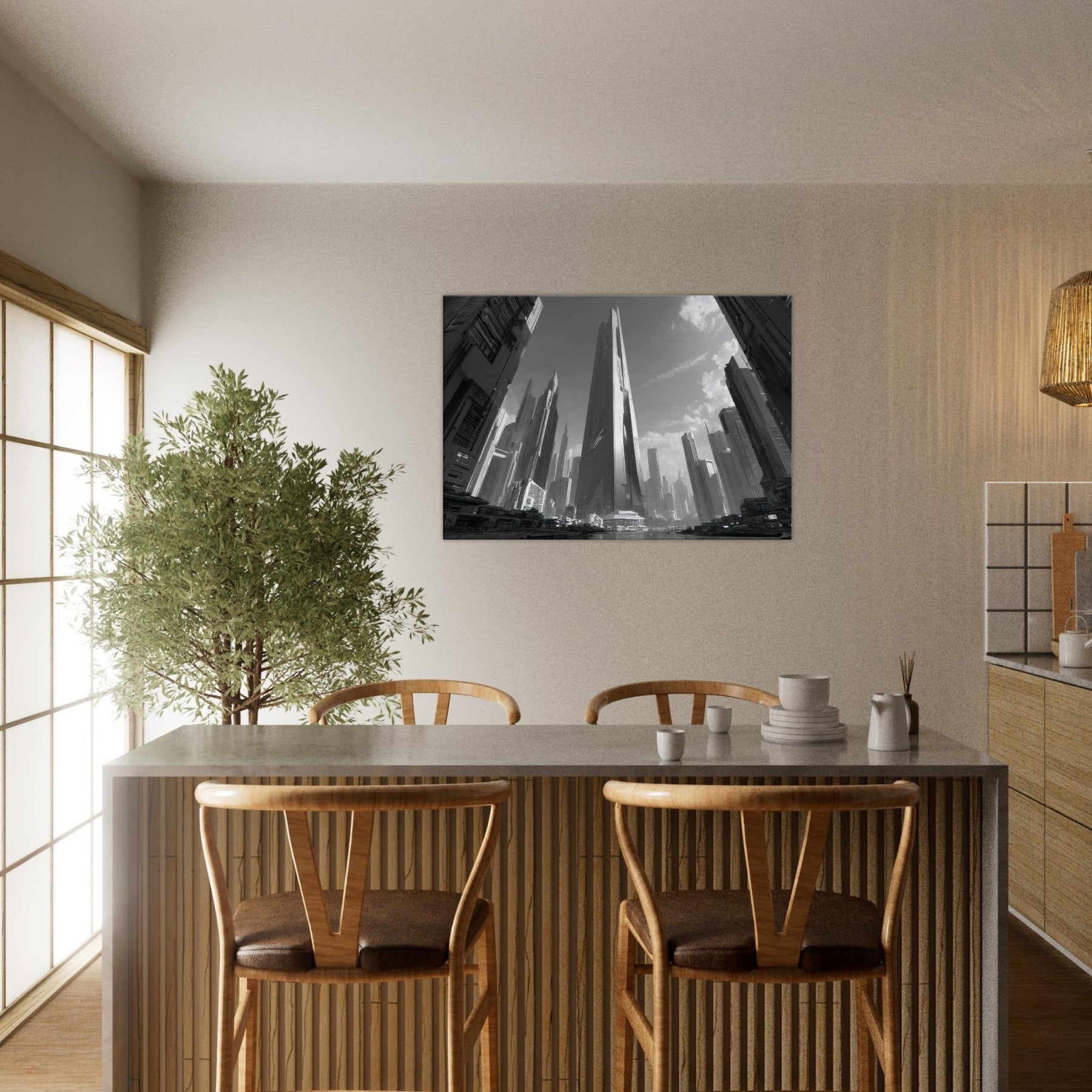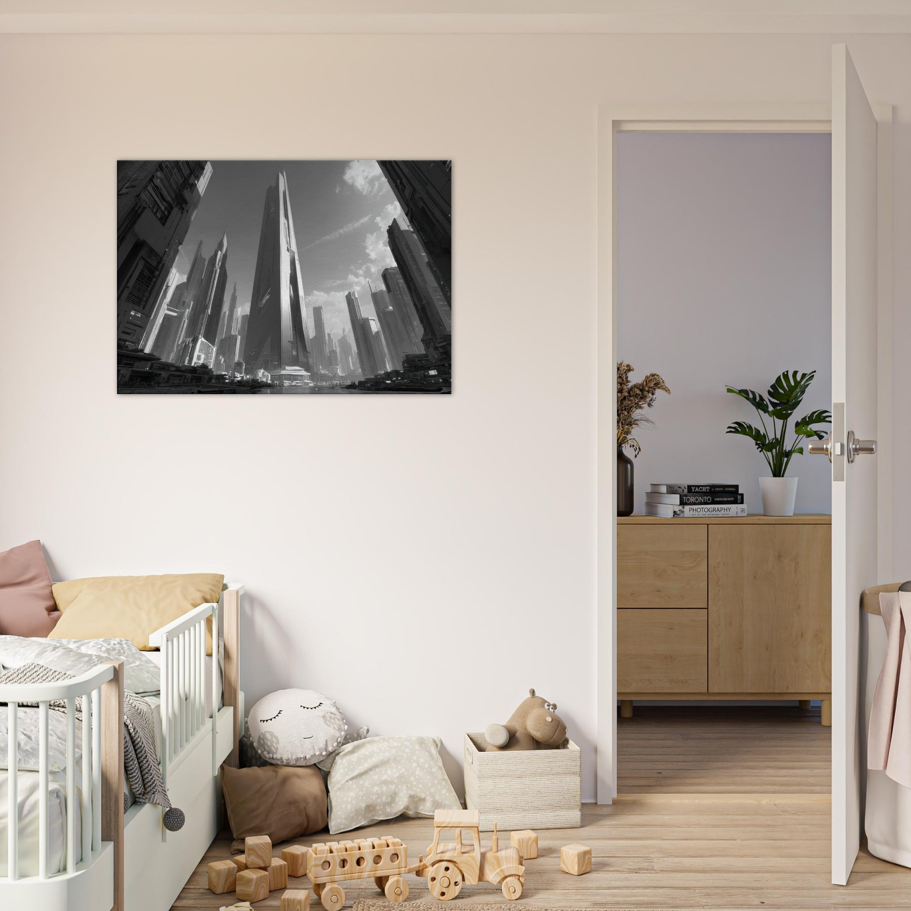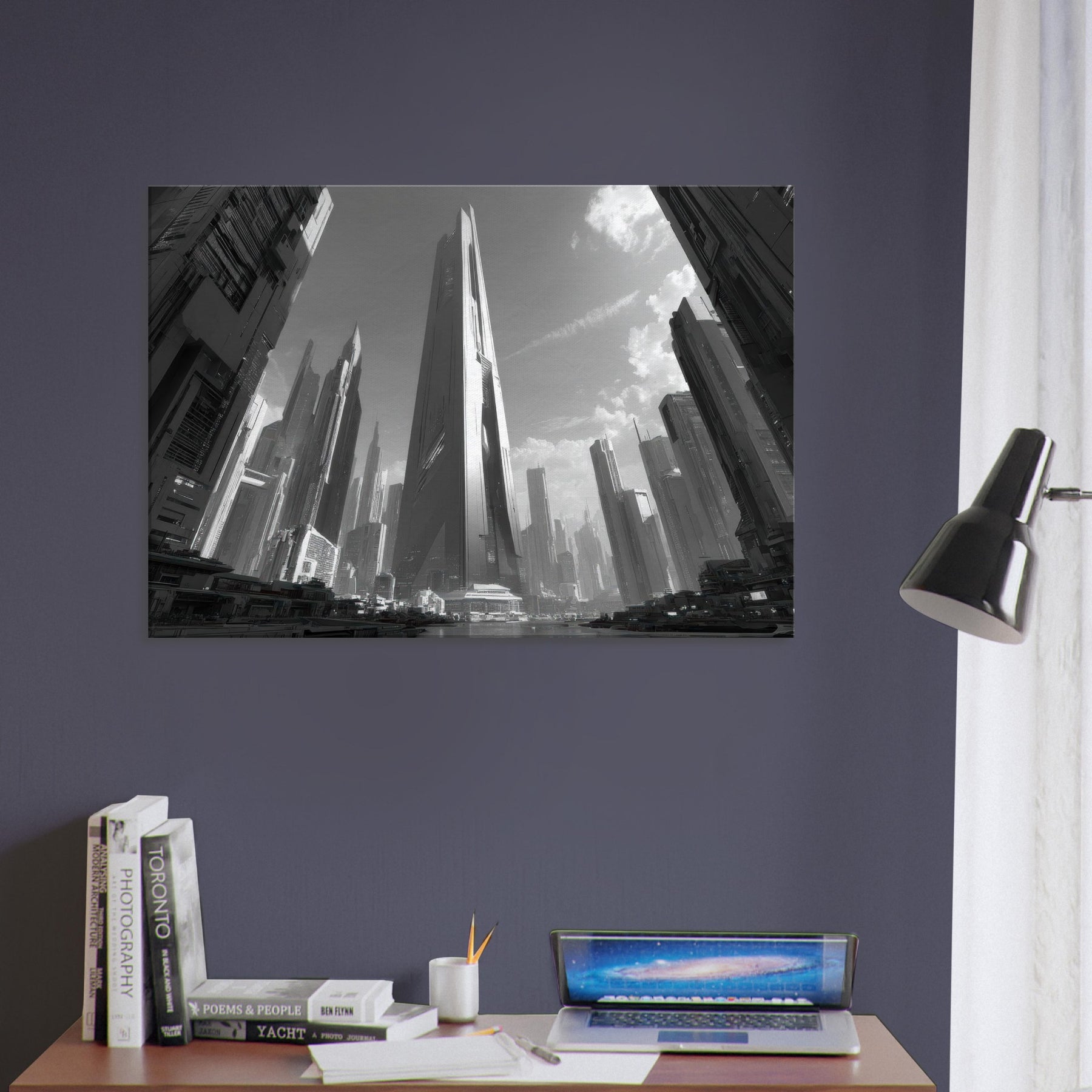 Immerse your space in a monochrome metropolis where the Cyberpunk City looms as a sculptural silhouette. Tall, razor edged towers bite into the sky, their surfaces catching glints of light and shadow in a whisper of rain.