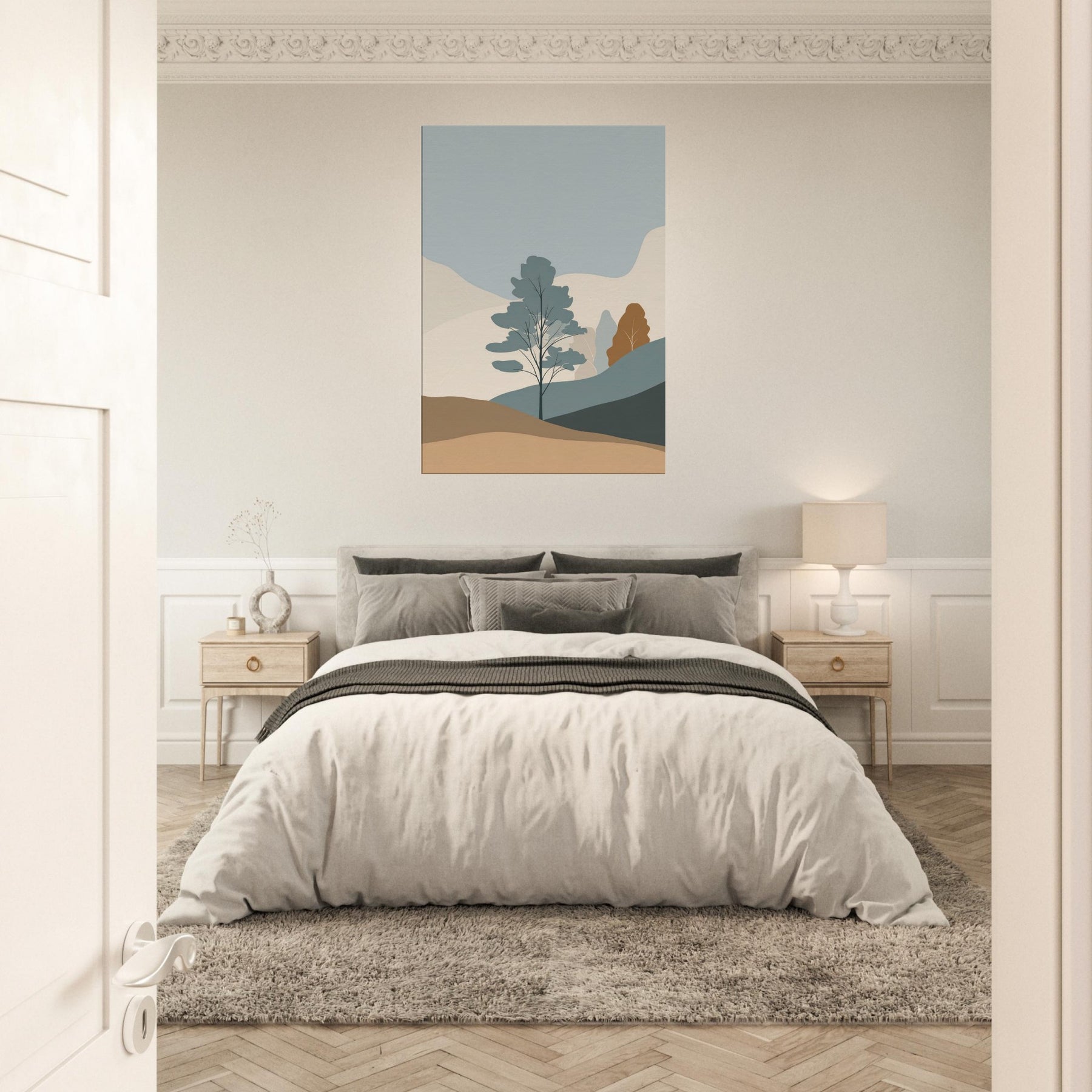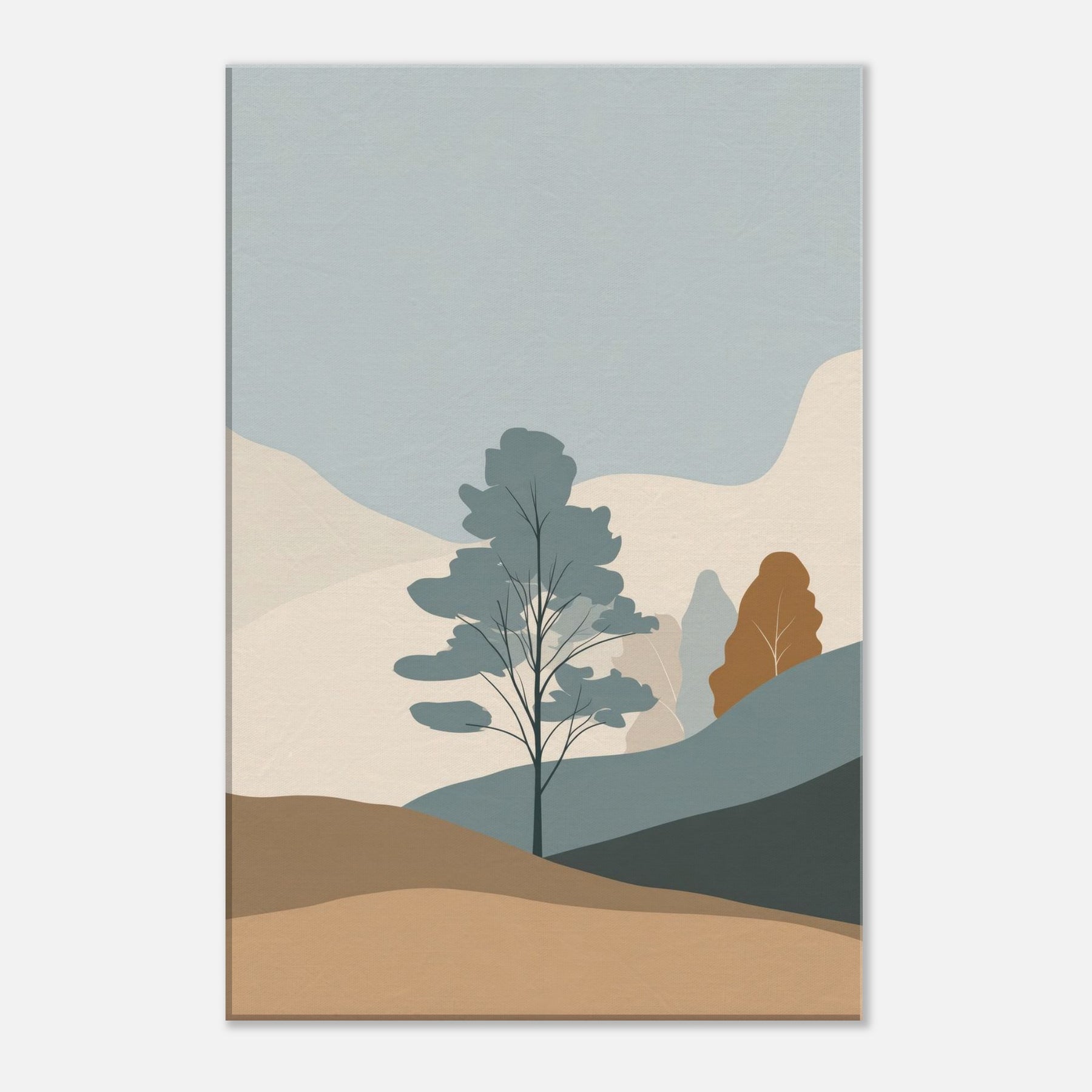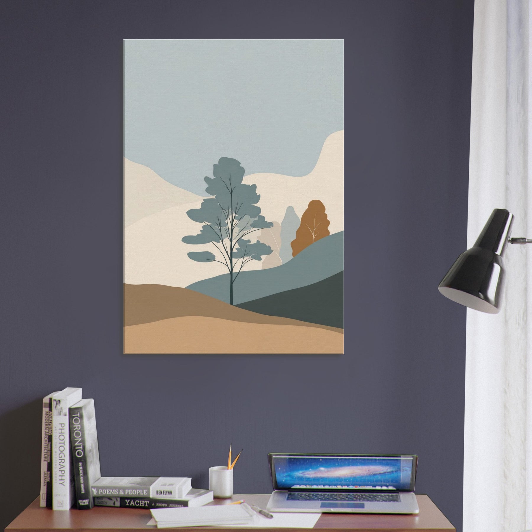 Boreal Forest invites calm into any room with its pared back and whispering tones. In this minimalist composition, the lone tree stands against rolling hills and soft skies, capturing a hush of northern light and the quiet breath of winter. The restrained palette sand, slate, and gentle blues evokes an expansive sky and a forest's steadfast presence, making the space feel larger, more contemplative. Hang it where you want a moment of pause: a sanctuary for conversation, focus, and everyday wonder.