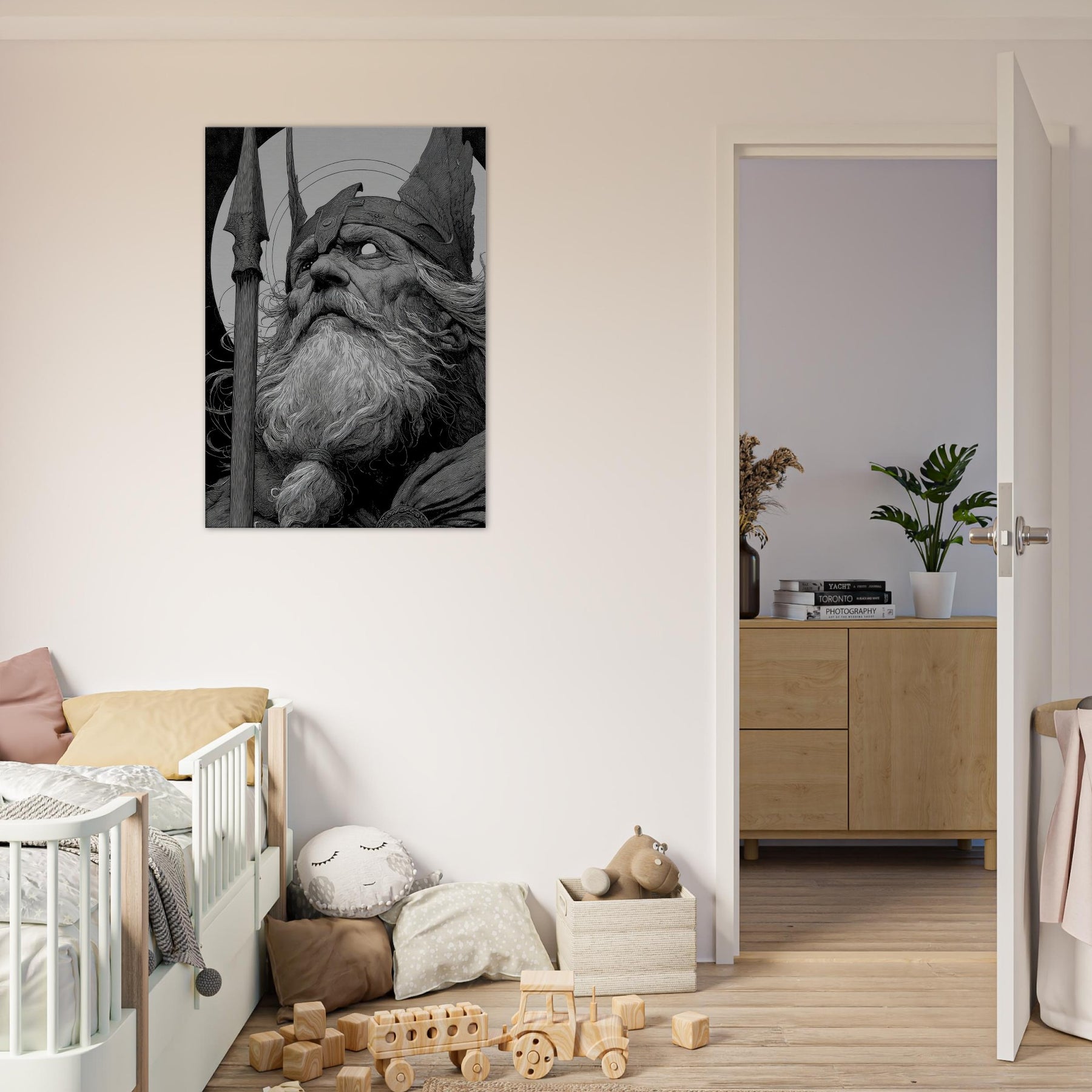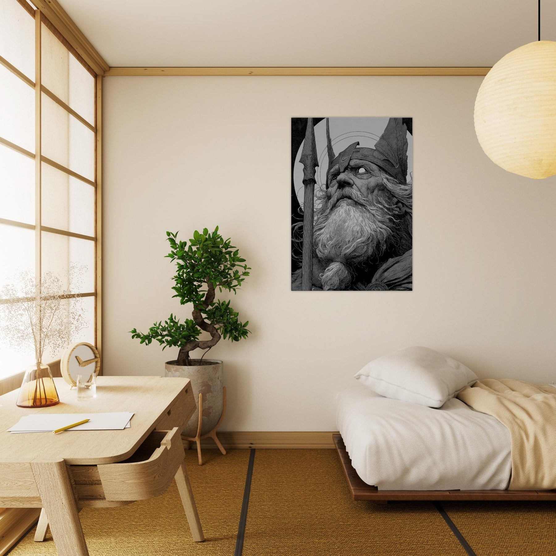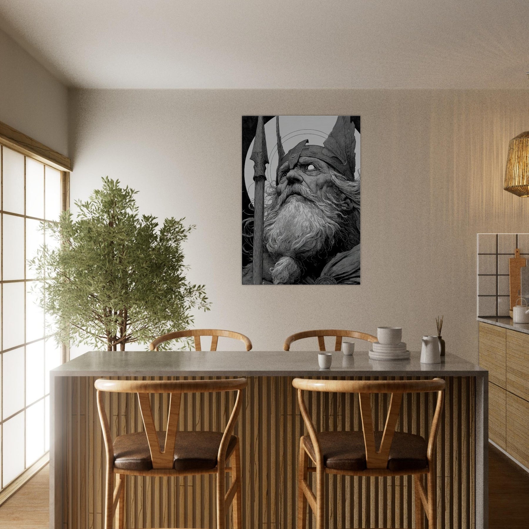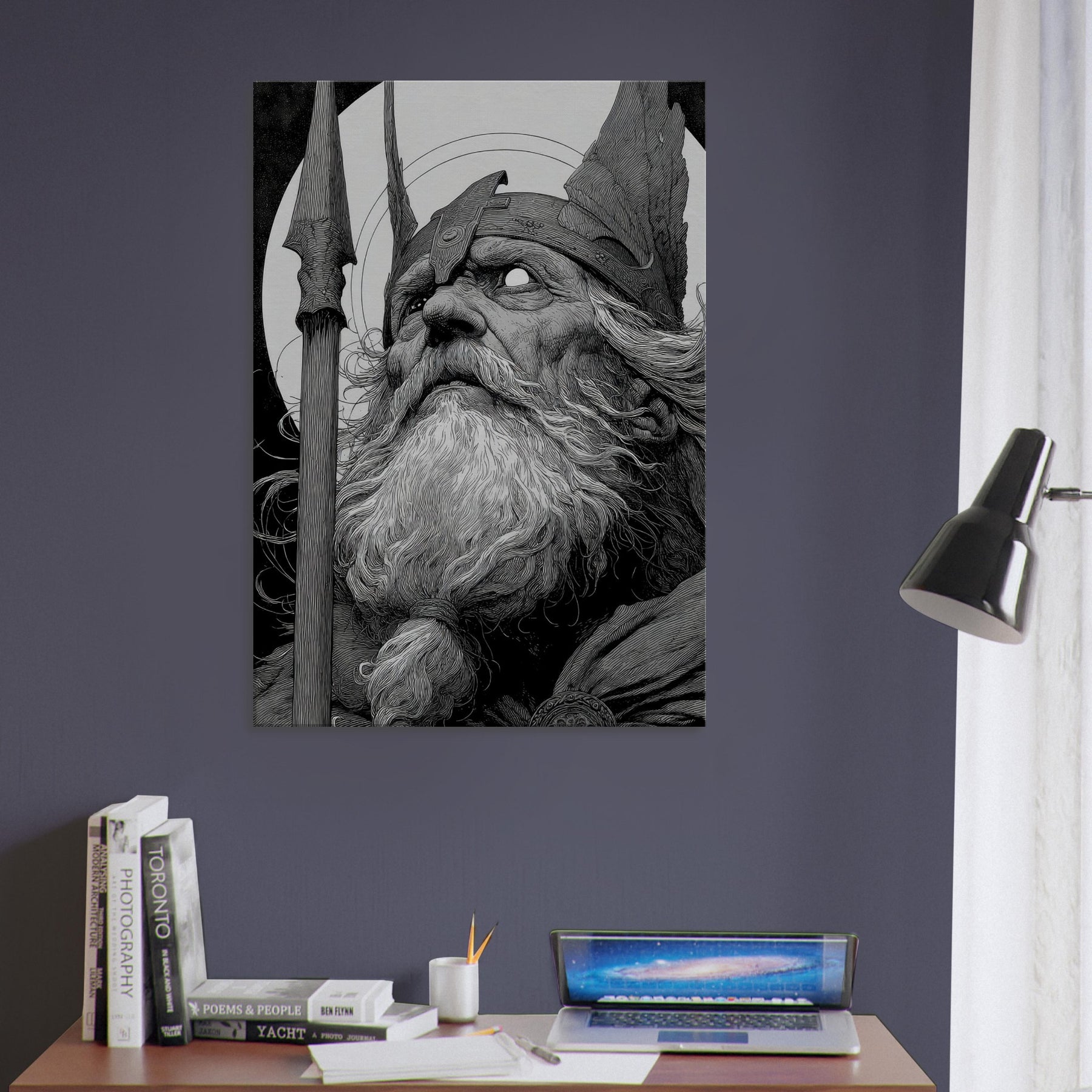 This wall art bathes a room in mythic gravitas, its contrasts pulling the eye into an ancient vigil. Hang it to invite contemplation, to temper modern spaces with epic calm, and to offer a room a fierce, yet serene, mythic heartbeat.