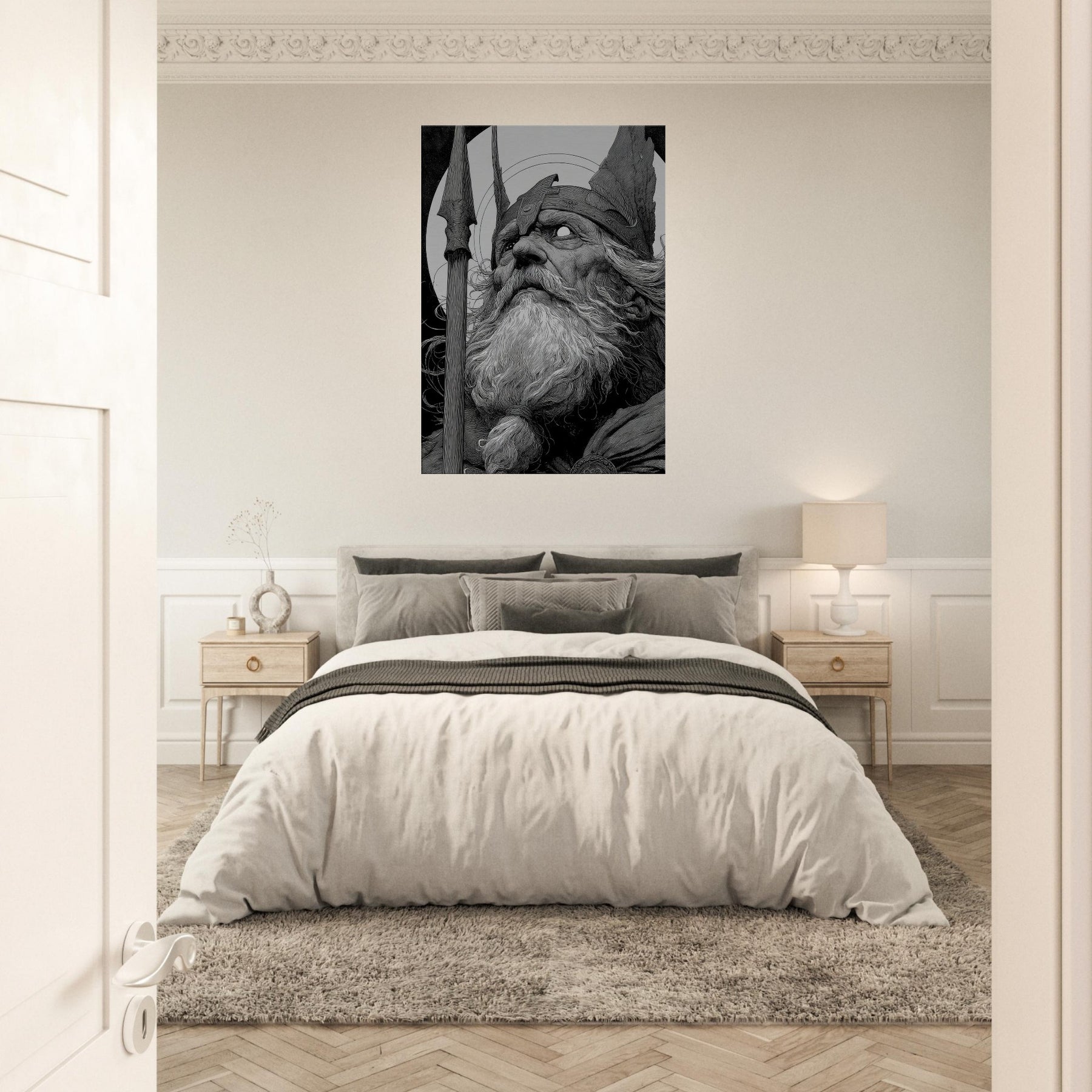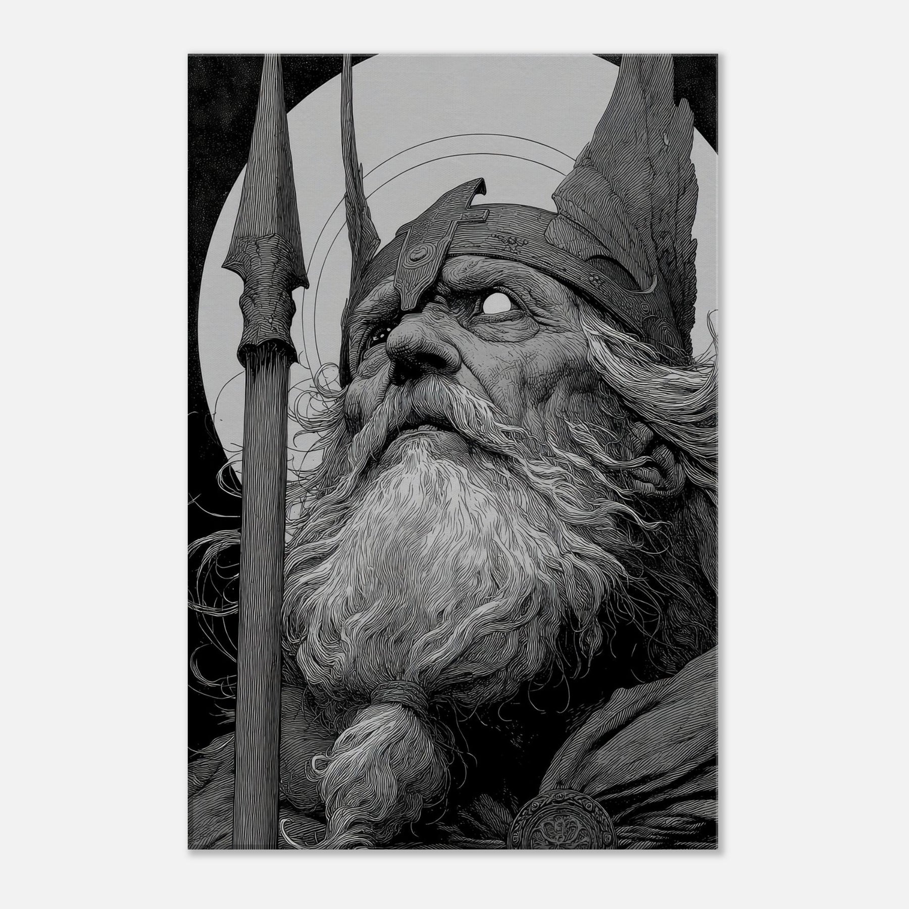 Odin gazes upward in stark, ink brushed detail, a timeless sentinel carved in black and white. The long beard, wind swept and wise, frames a helm and spear that hum with quiet power.