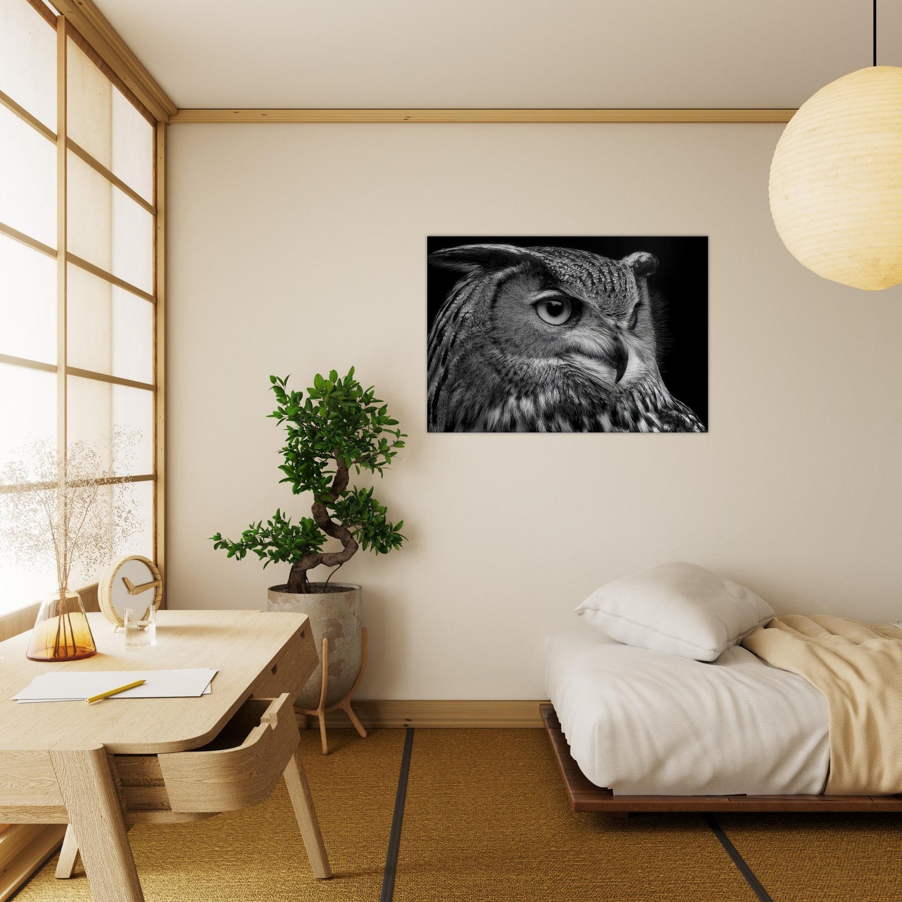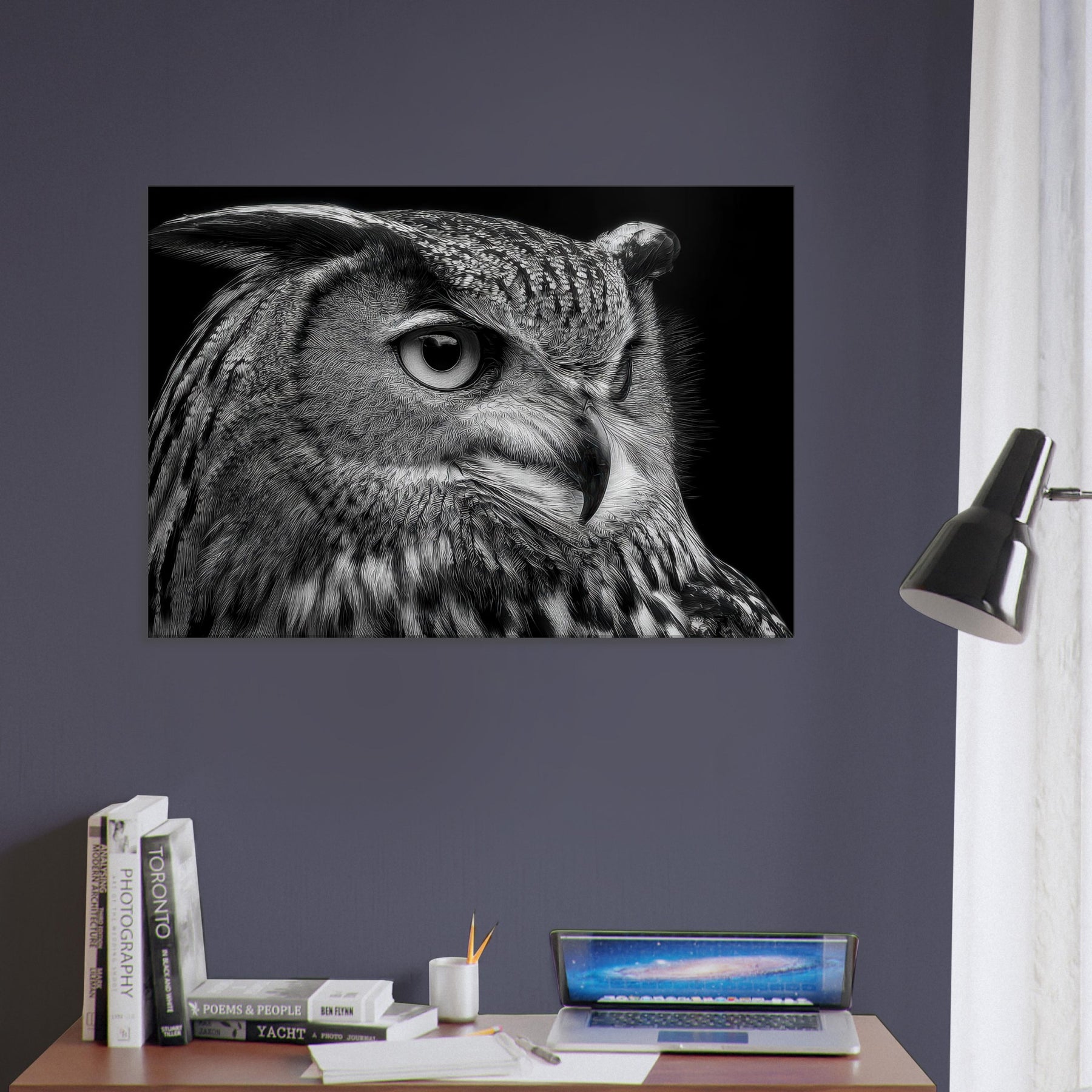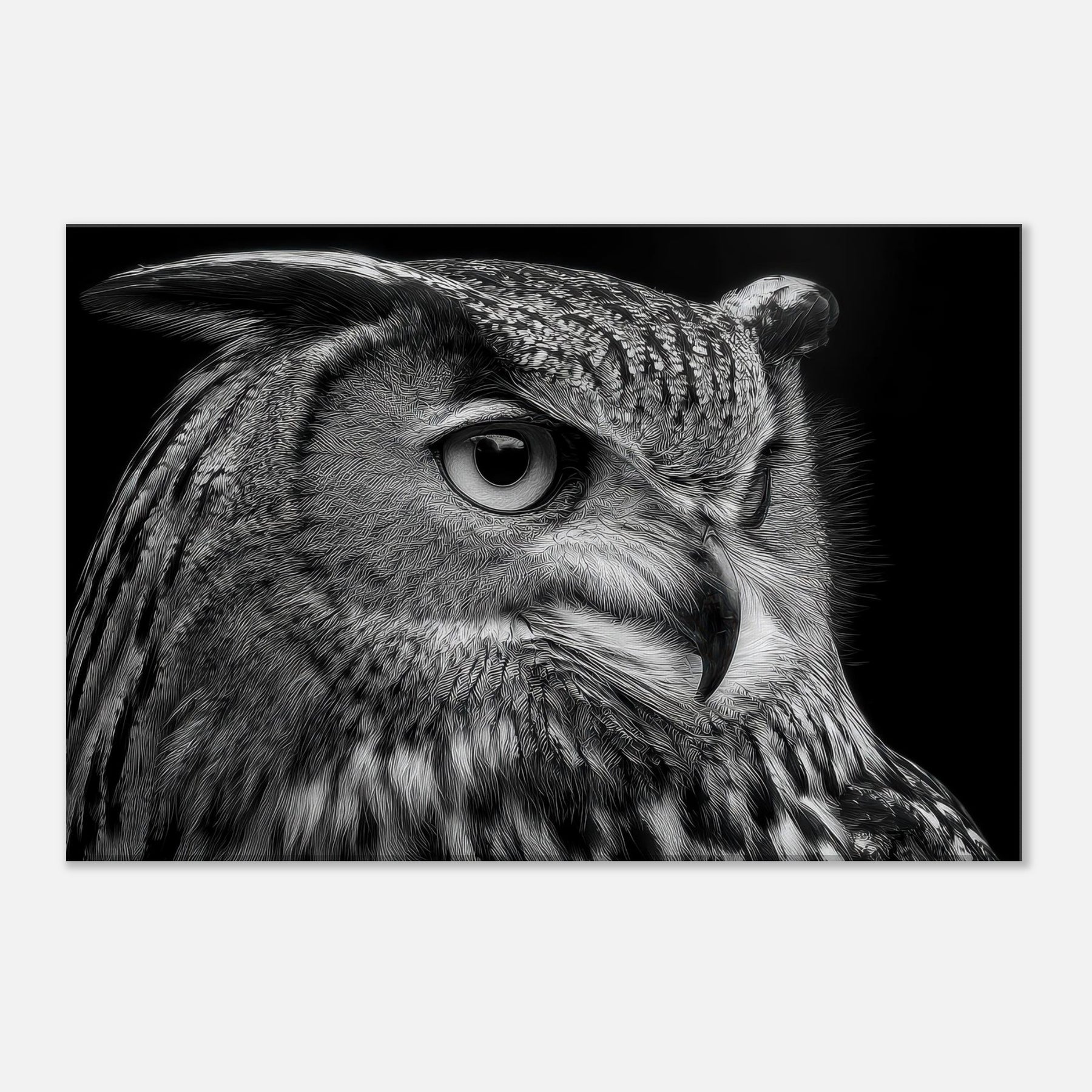 Under a velvety black sky, this black and white study of an owl captures a moment of watchful stillness. The fine lines and tonal contrasts sculpt feather texture, inviting a quiet, contemplative mood into any room.