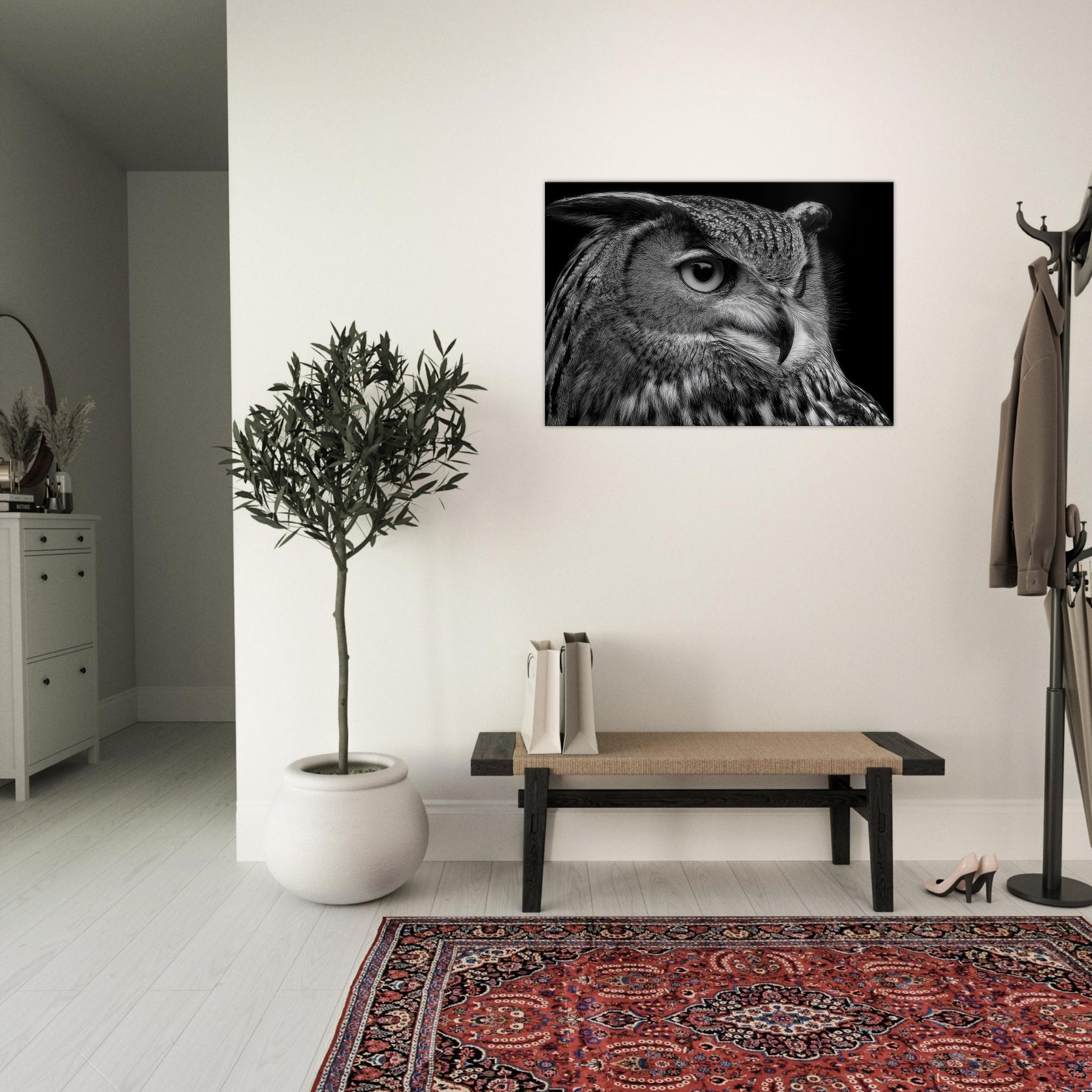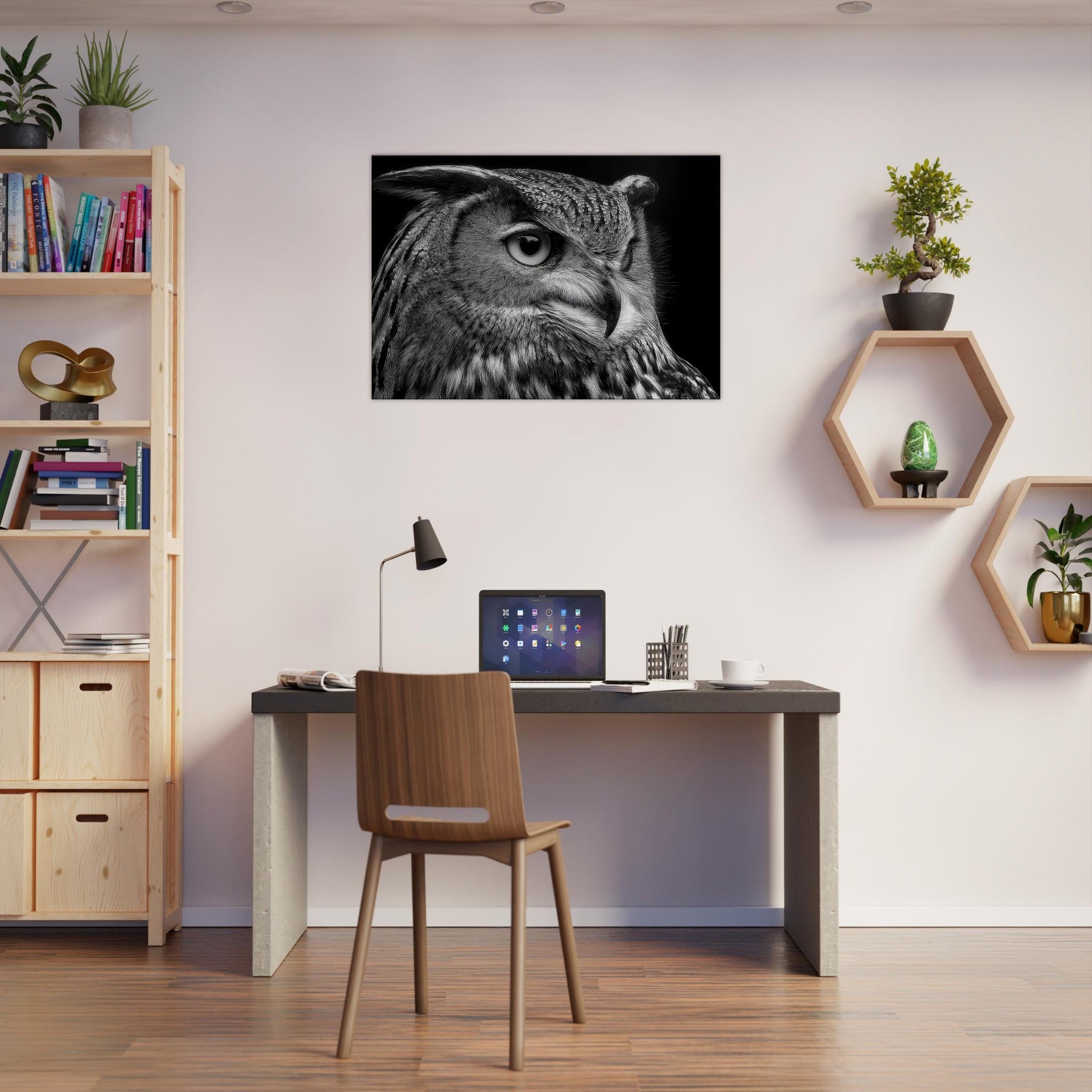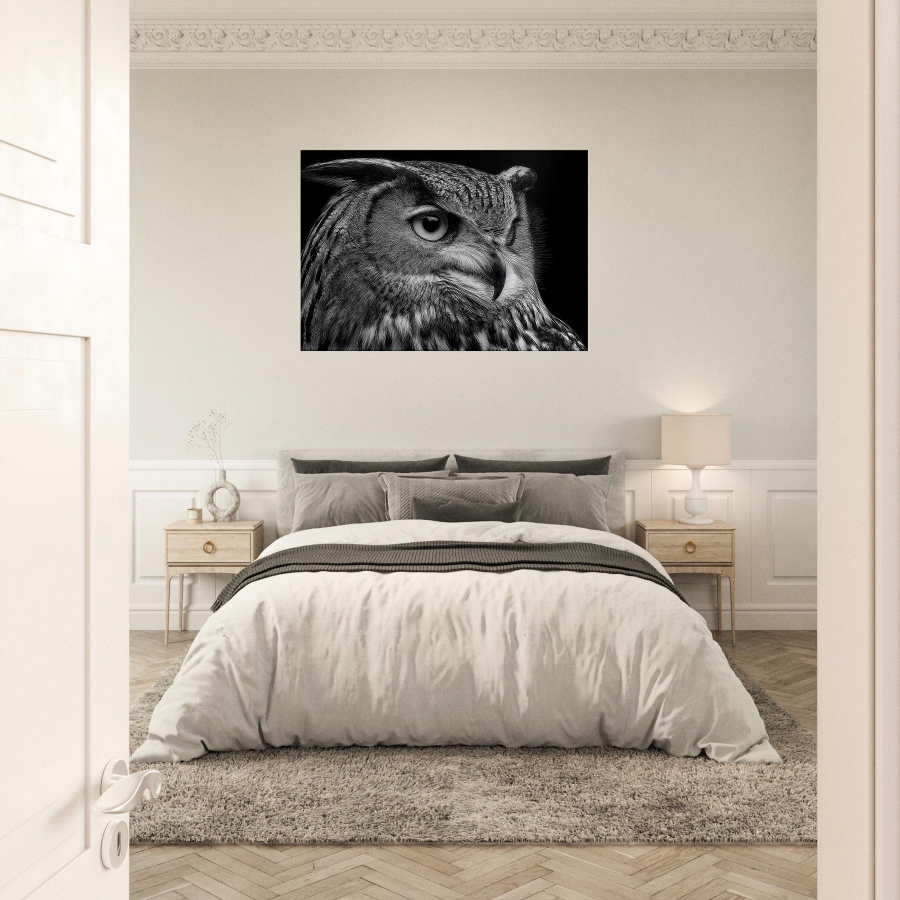 Under a velvety black sky, this black and white study of an owl captures a moment of watchful stillness. The fine lines and tonal contrasts sculpt feather texture, inviting a quiet, contemplative mood into any room.