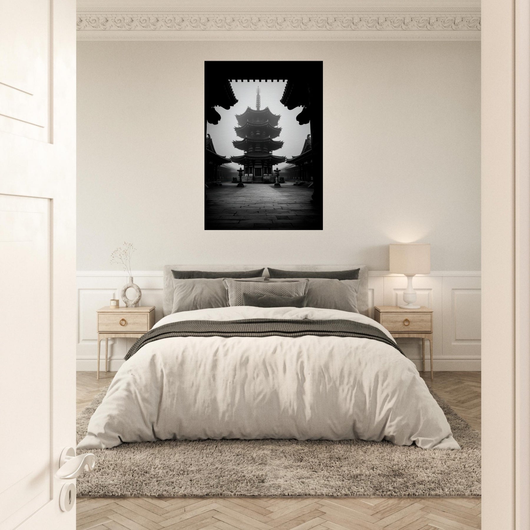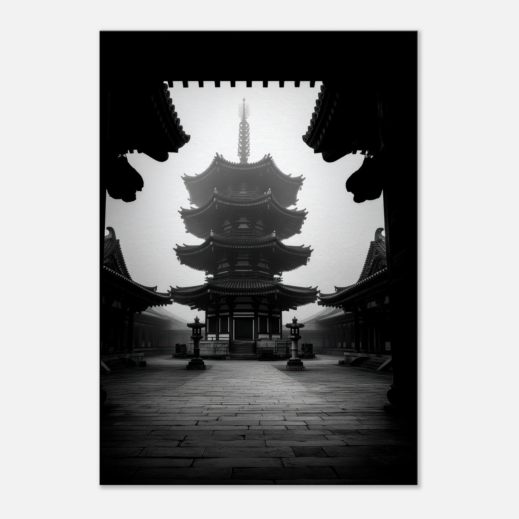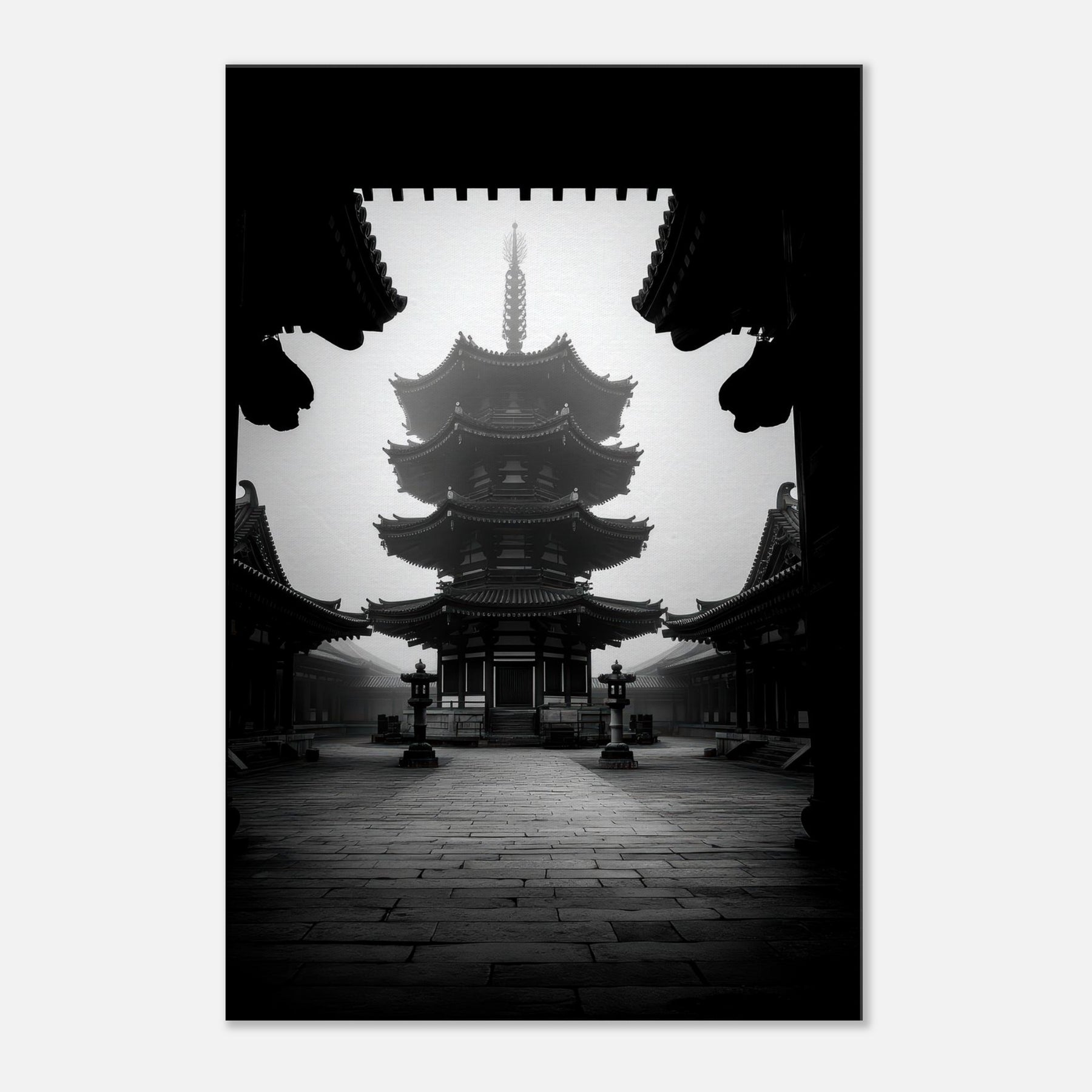 Pagoda rises in monochrome calm, a quiet crown of eaves and echoes. This black and white tableau invites a meditative pause, where shadows carve the architecture like ink on stone.