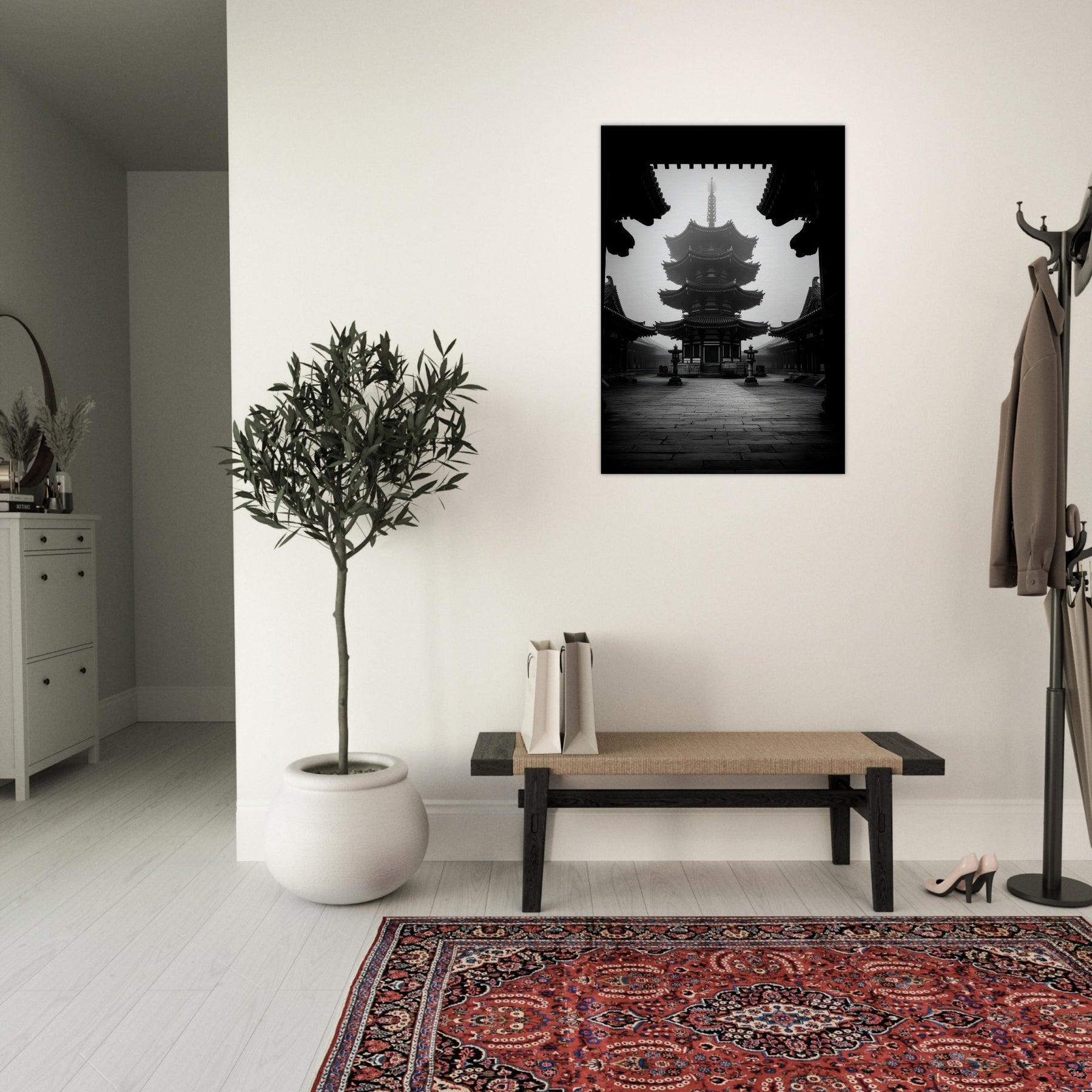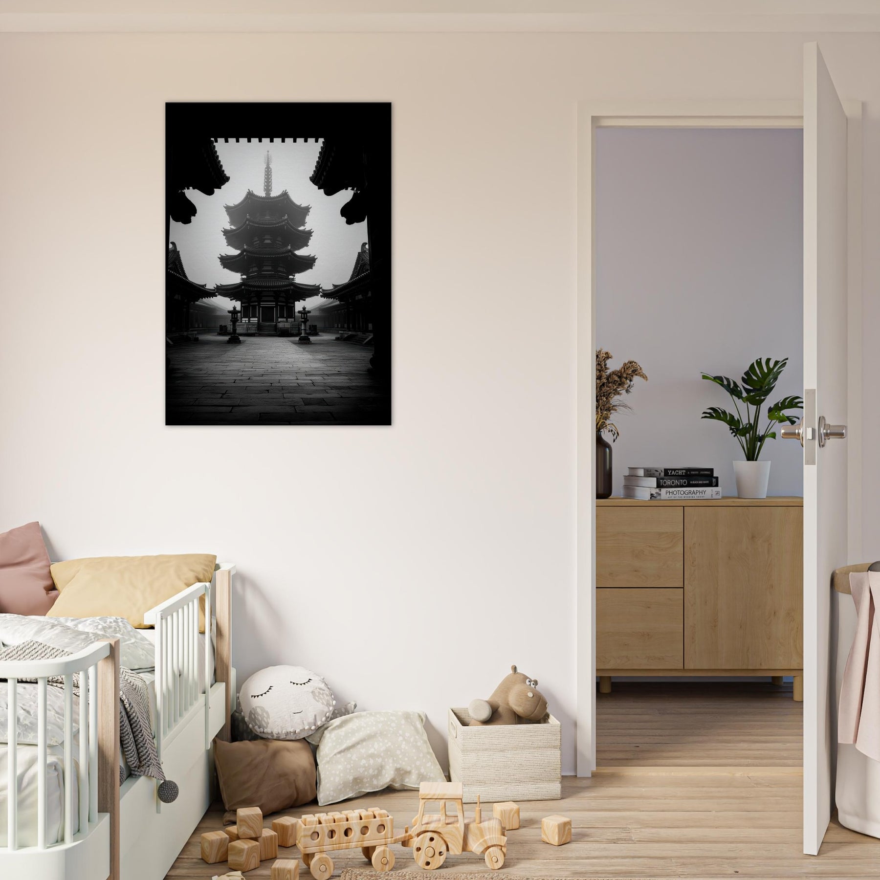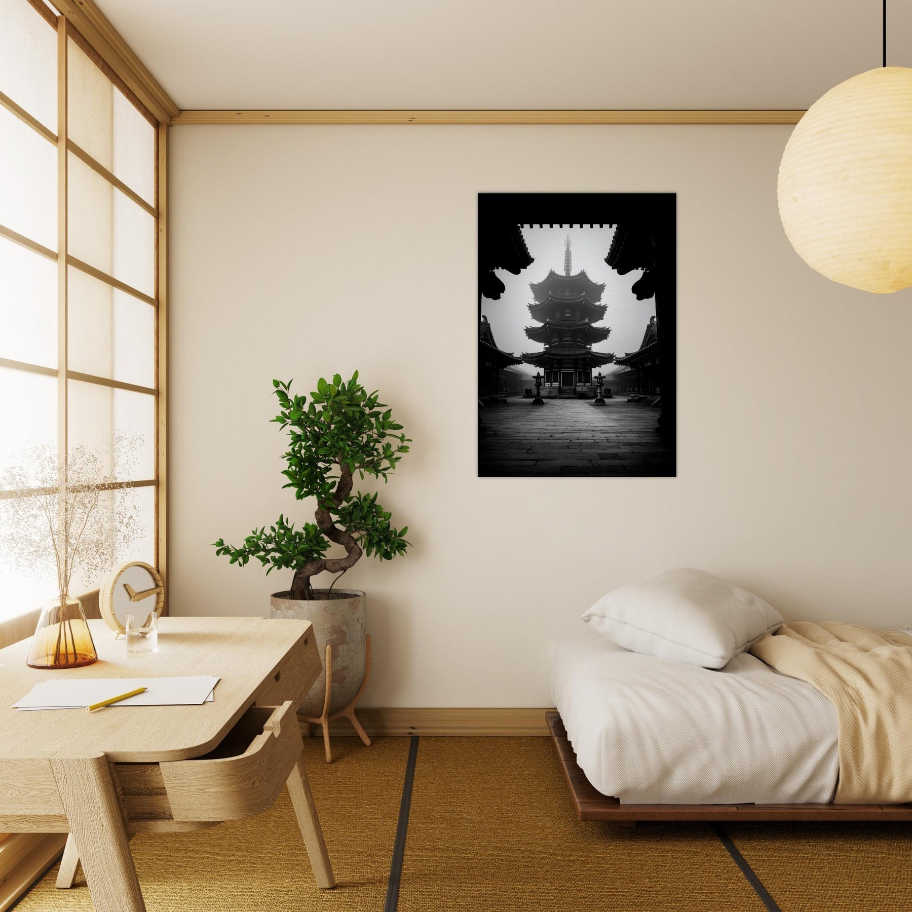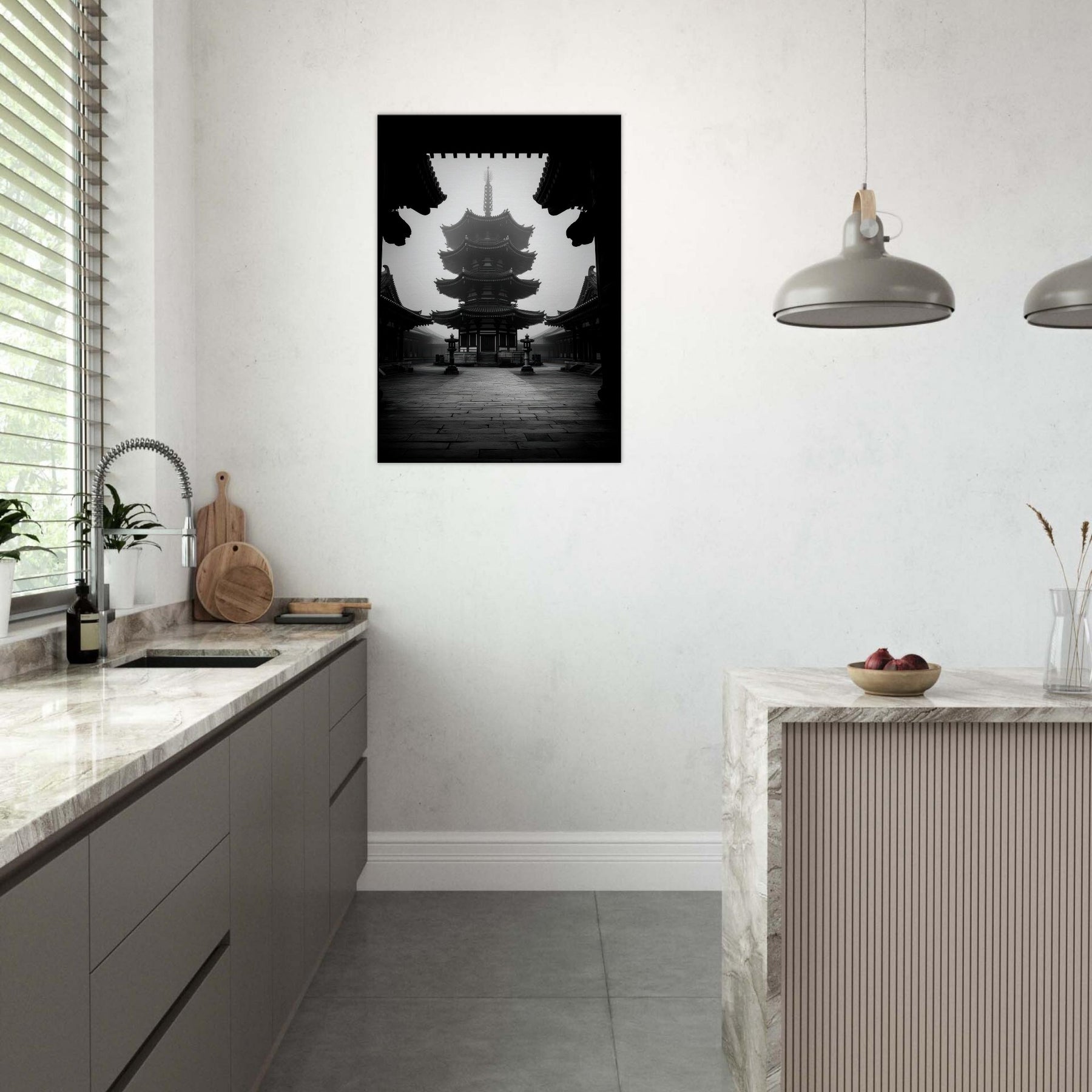 Pagoda rises in monochrome calm, a quiet crown of eaves and echoes. This black and white tableau invites a meditative pause, where shadows carve the architecture like ink on stone.