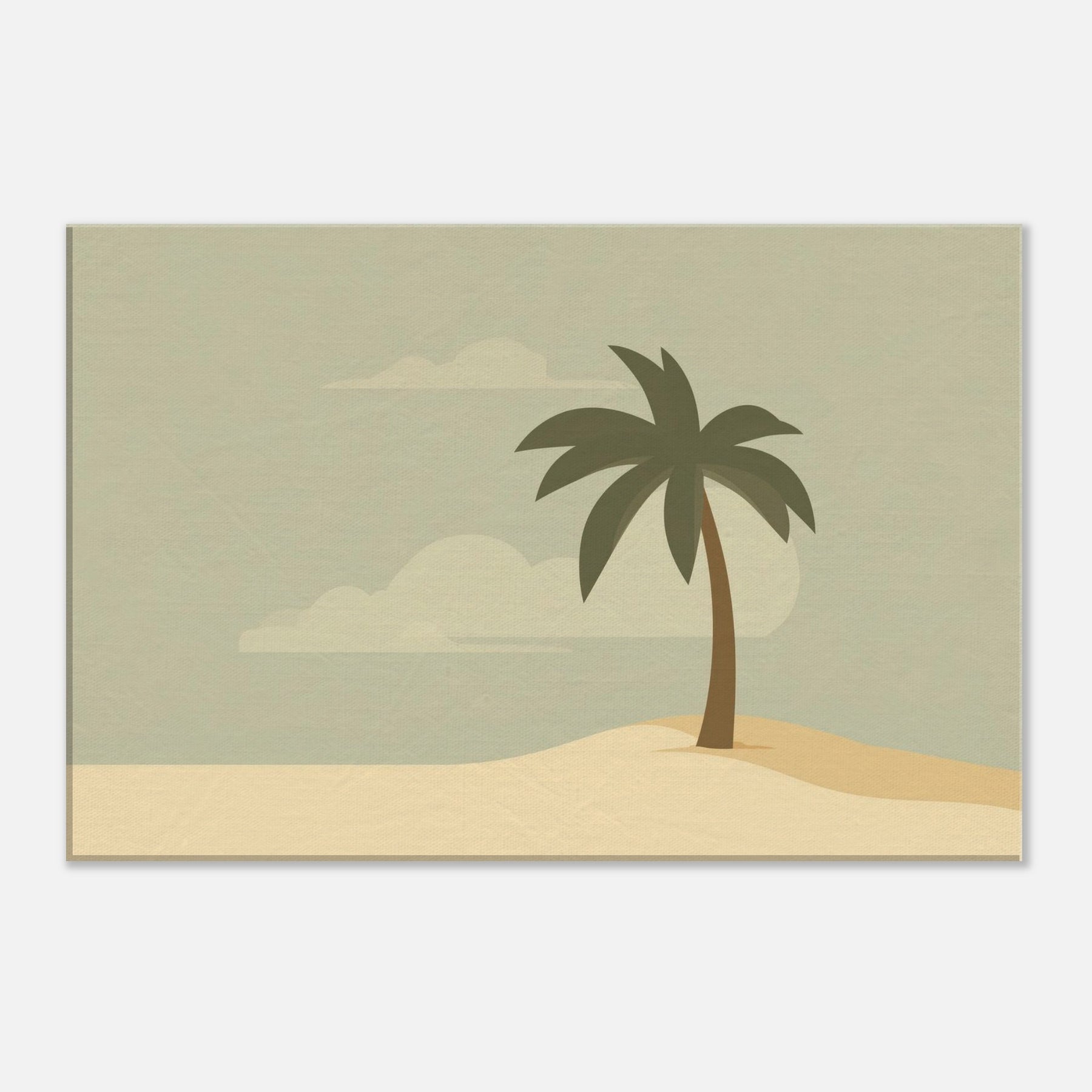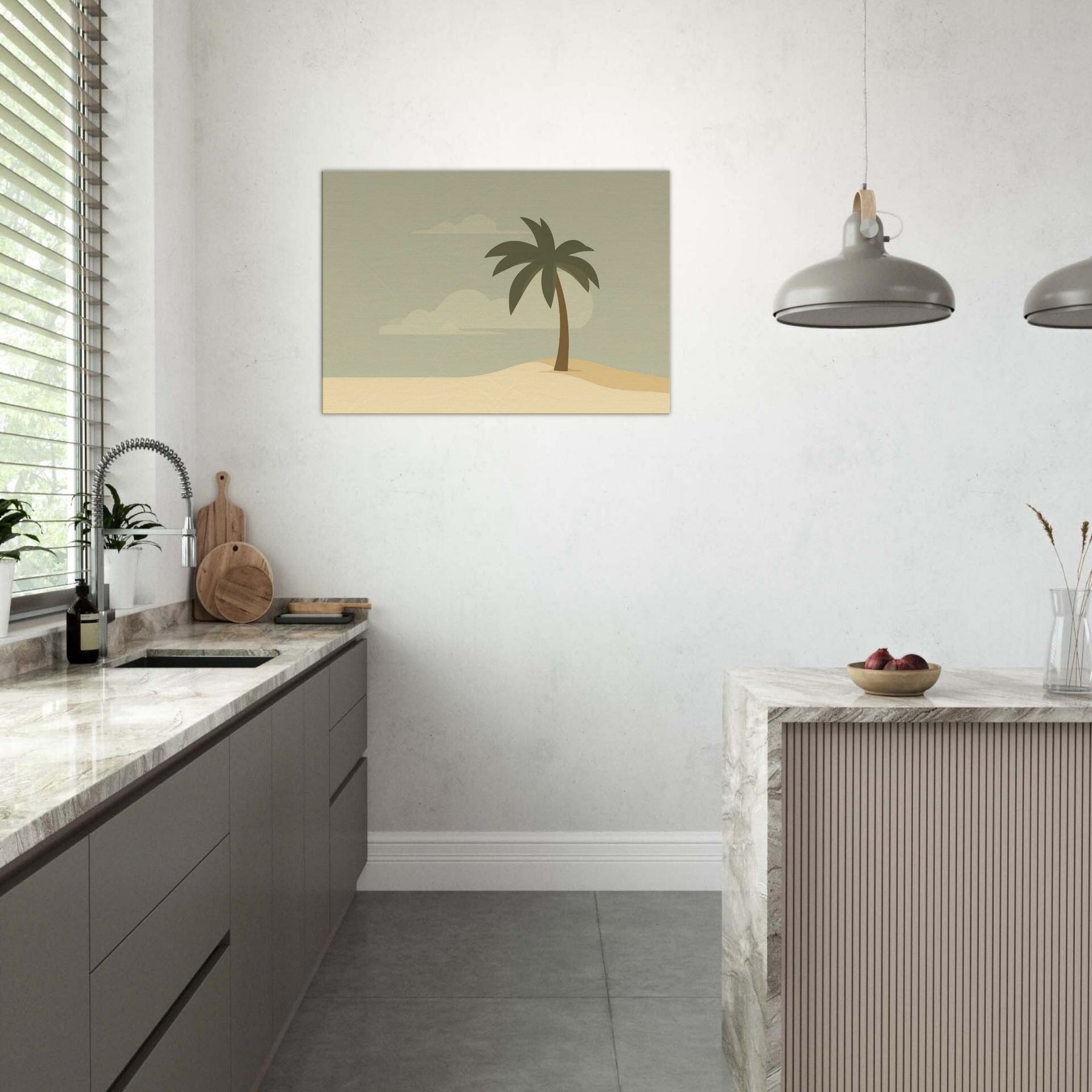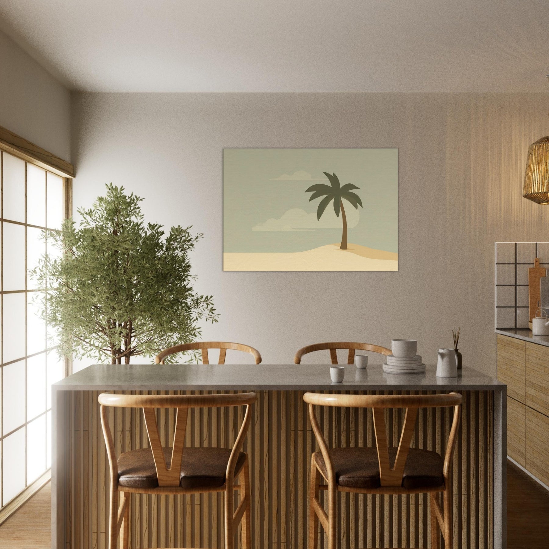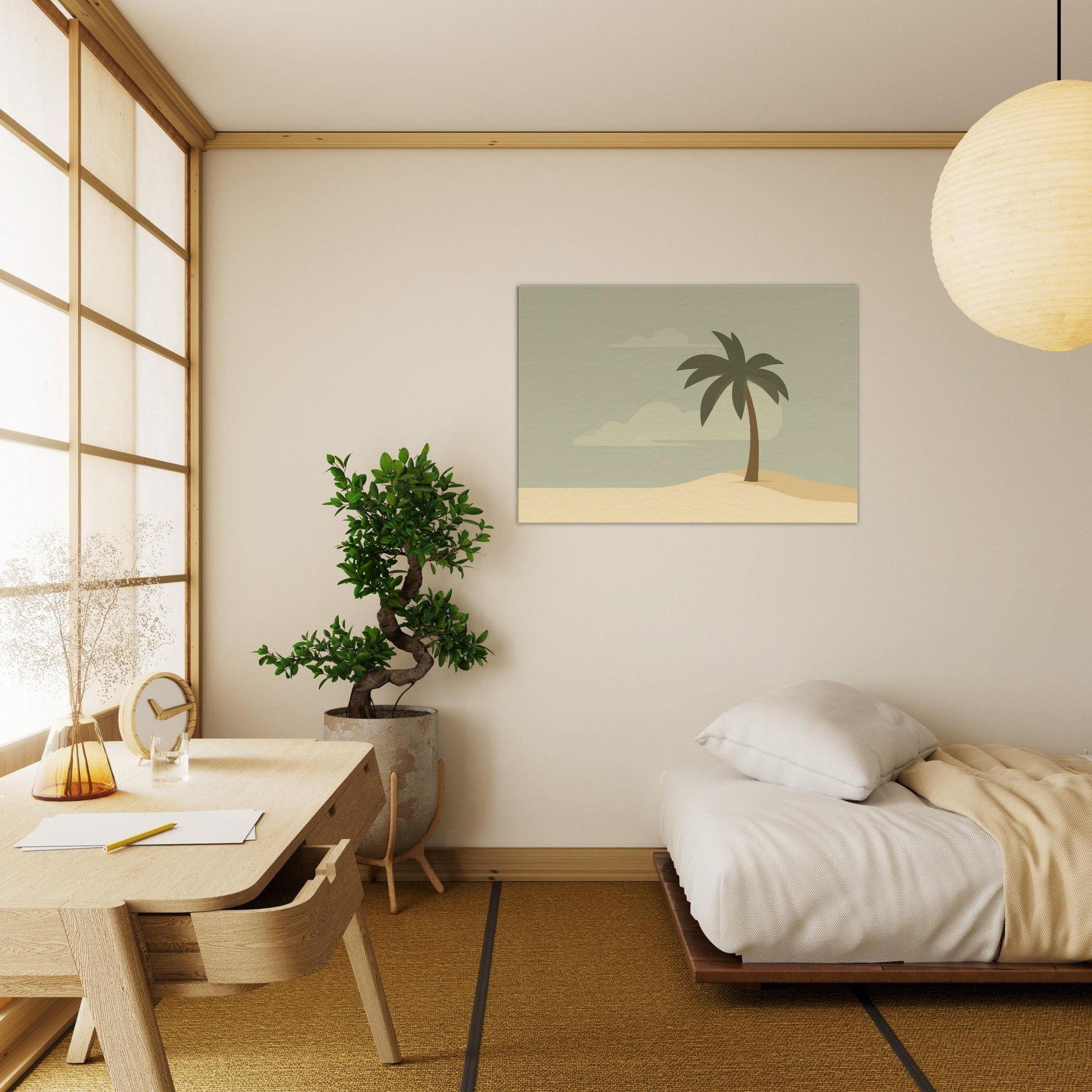 Immerse your space in a breath of sea breeze and sunlight. This minimalist interpretation of a Tropical Island invites calm into any room, where a solitary palm leans toward a soft horizon and quiet clouds drift by. The pale palette sand, sage, and muted blues creates an unhurried mood that complements modern furnishings. Hang it in a living room or bedroom to conjure resort like stillness, encouraging mindful pauses, easy conversations, and a sense of spacious, sunlit calm.