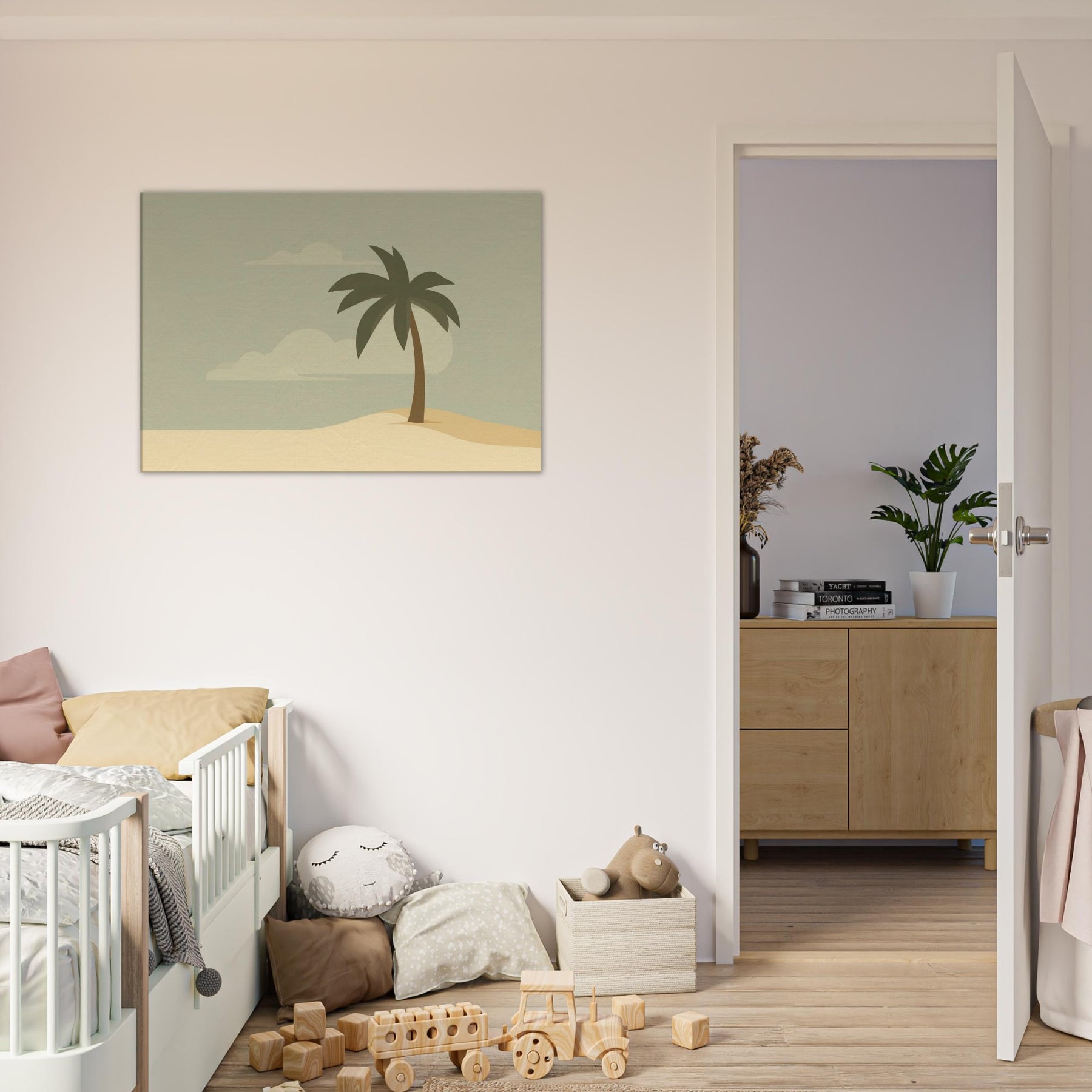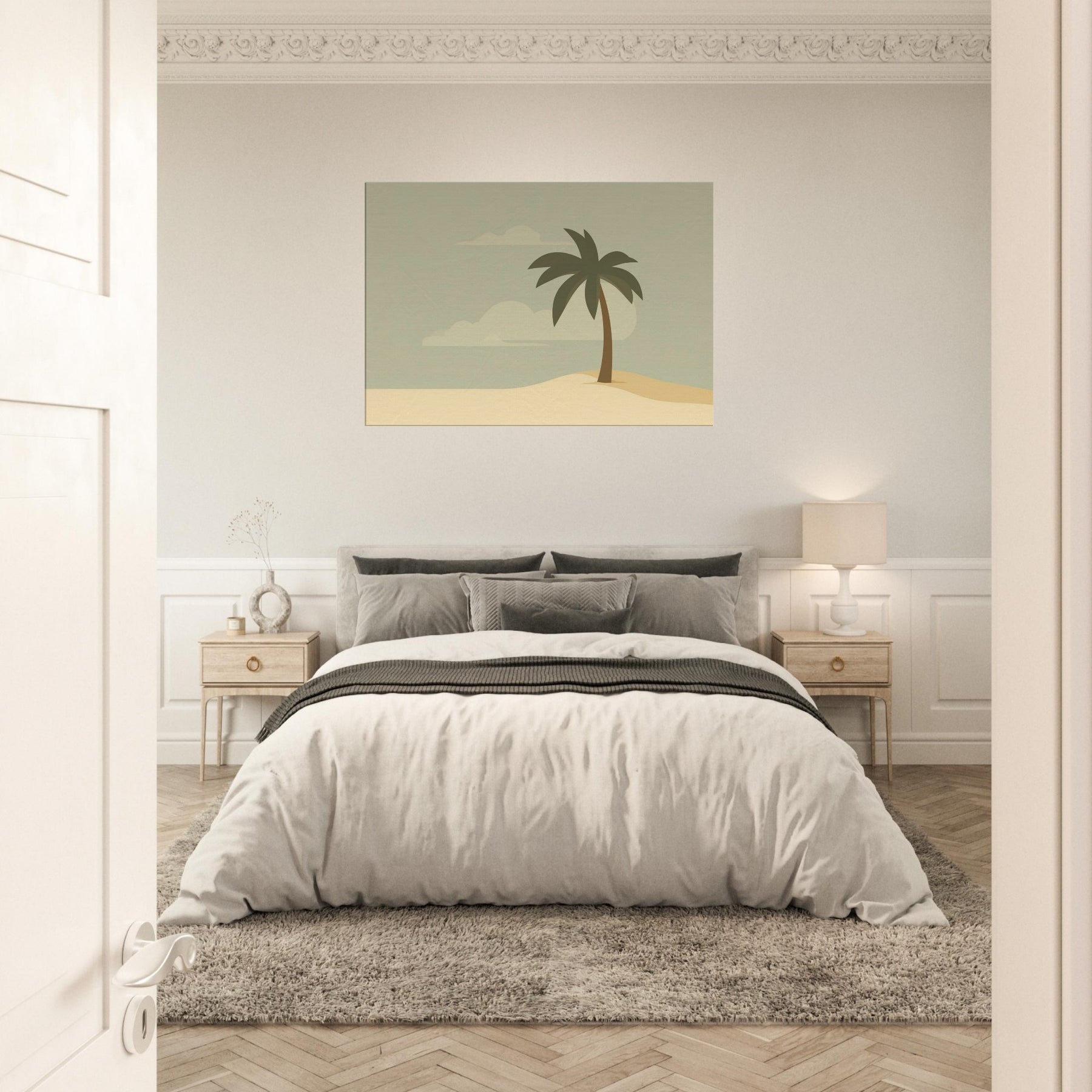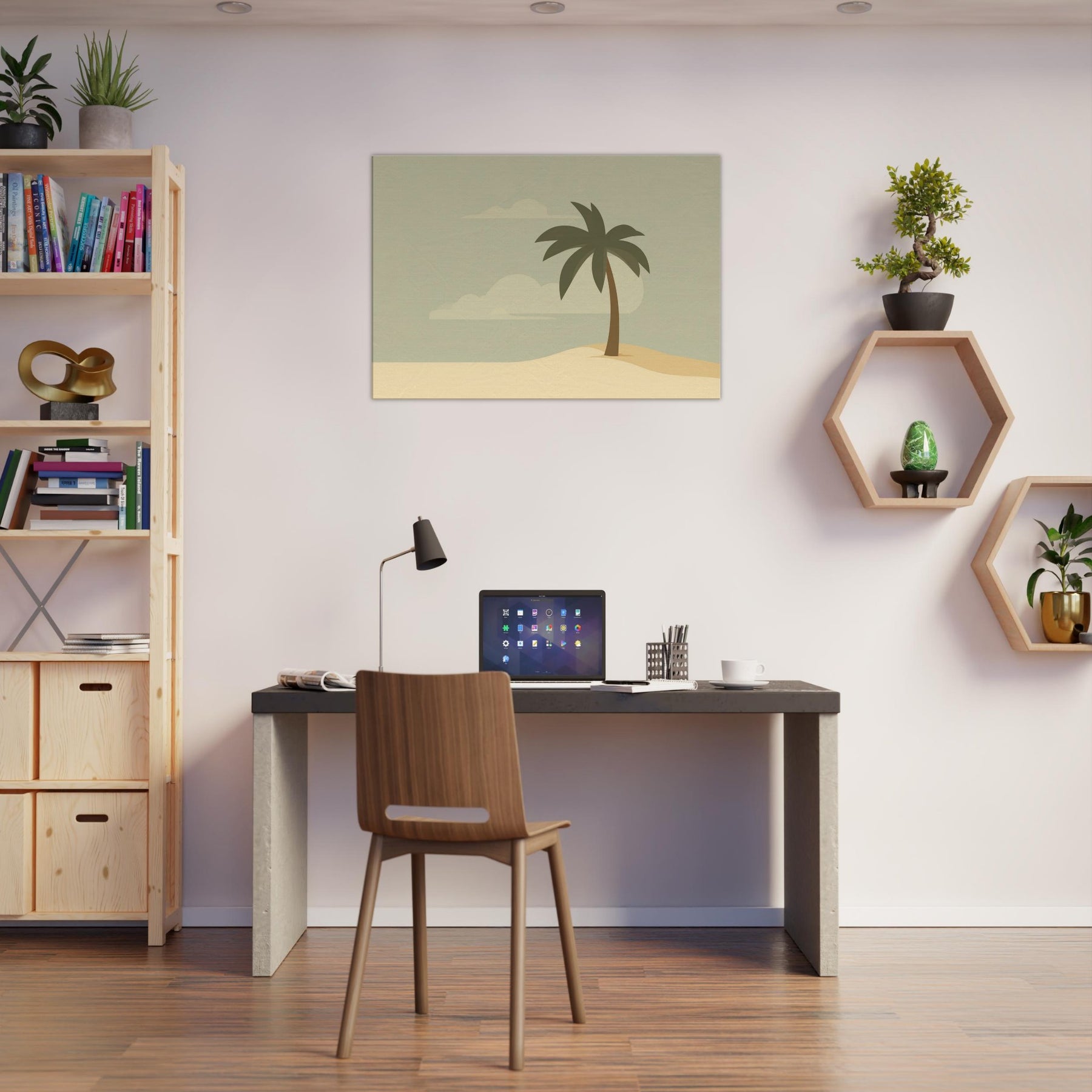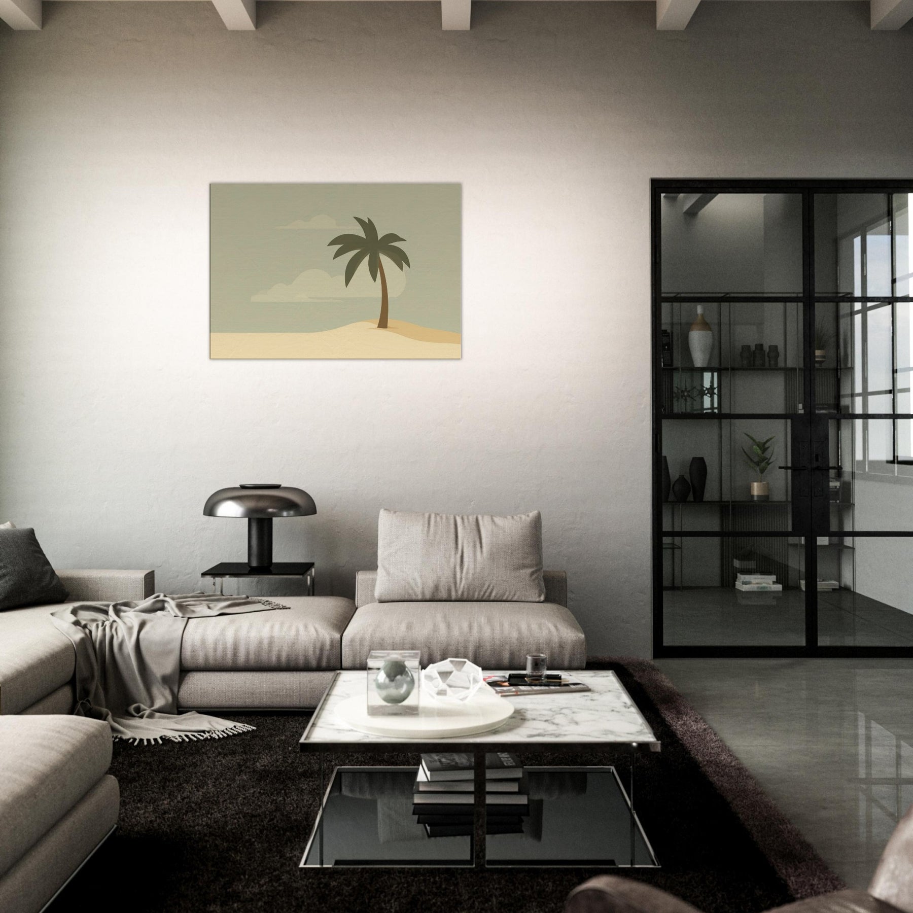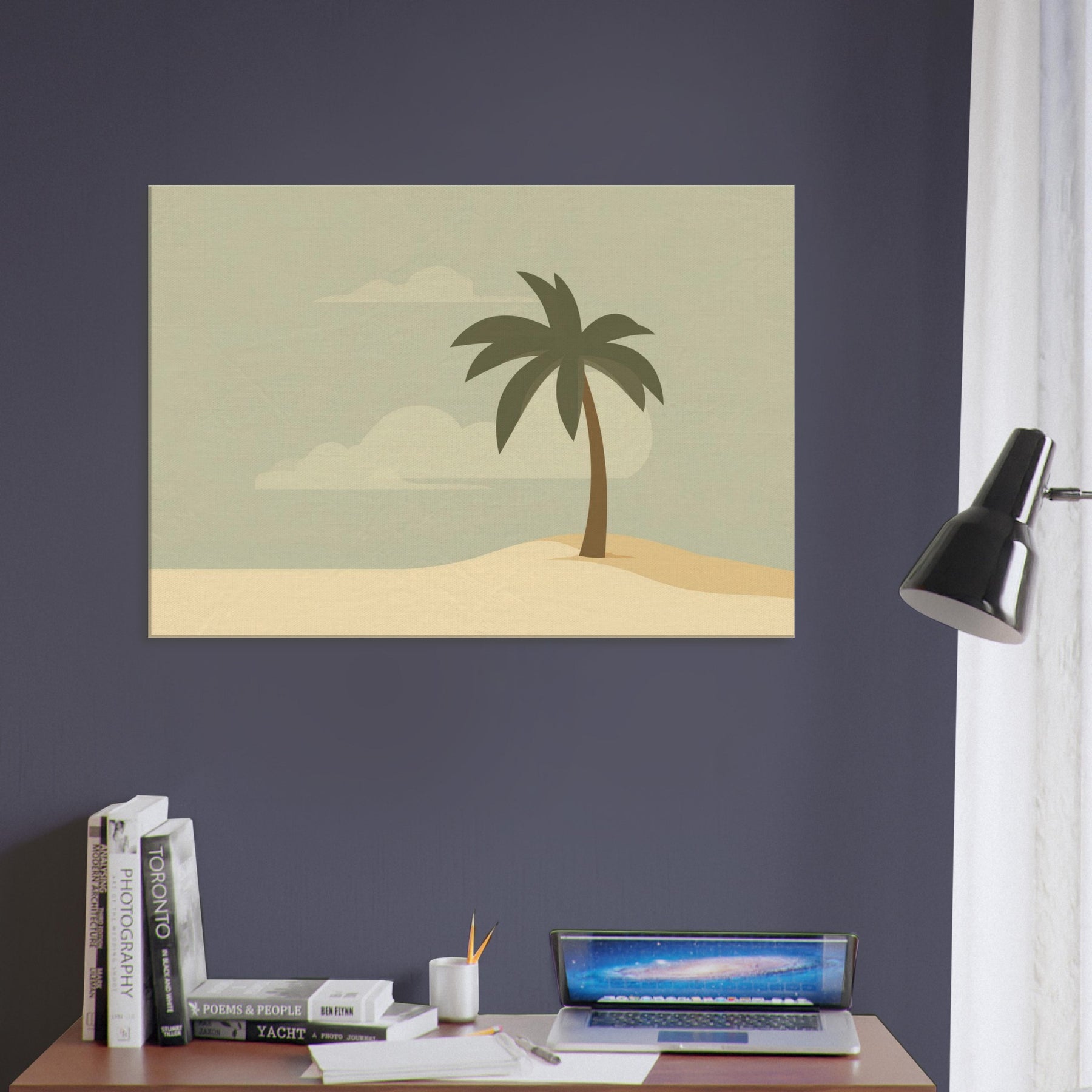 Immerse your space in a breath of sea breeze and sunlight. This minimalist interpretation of a Tropical Island invites calm into any room, where a solitary palm leans toward a soft horizon and quiet clouds drift by. The pale palette sand, sage, and muted blues creates an unhurried mood that complements modern furnishings. Hang it in a living room or bedroom to conjure resort like stillness, encouraging mindful pauses, easy conversations, and a sense of spacious, sunlit calm.