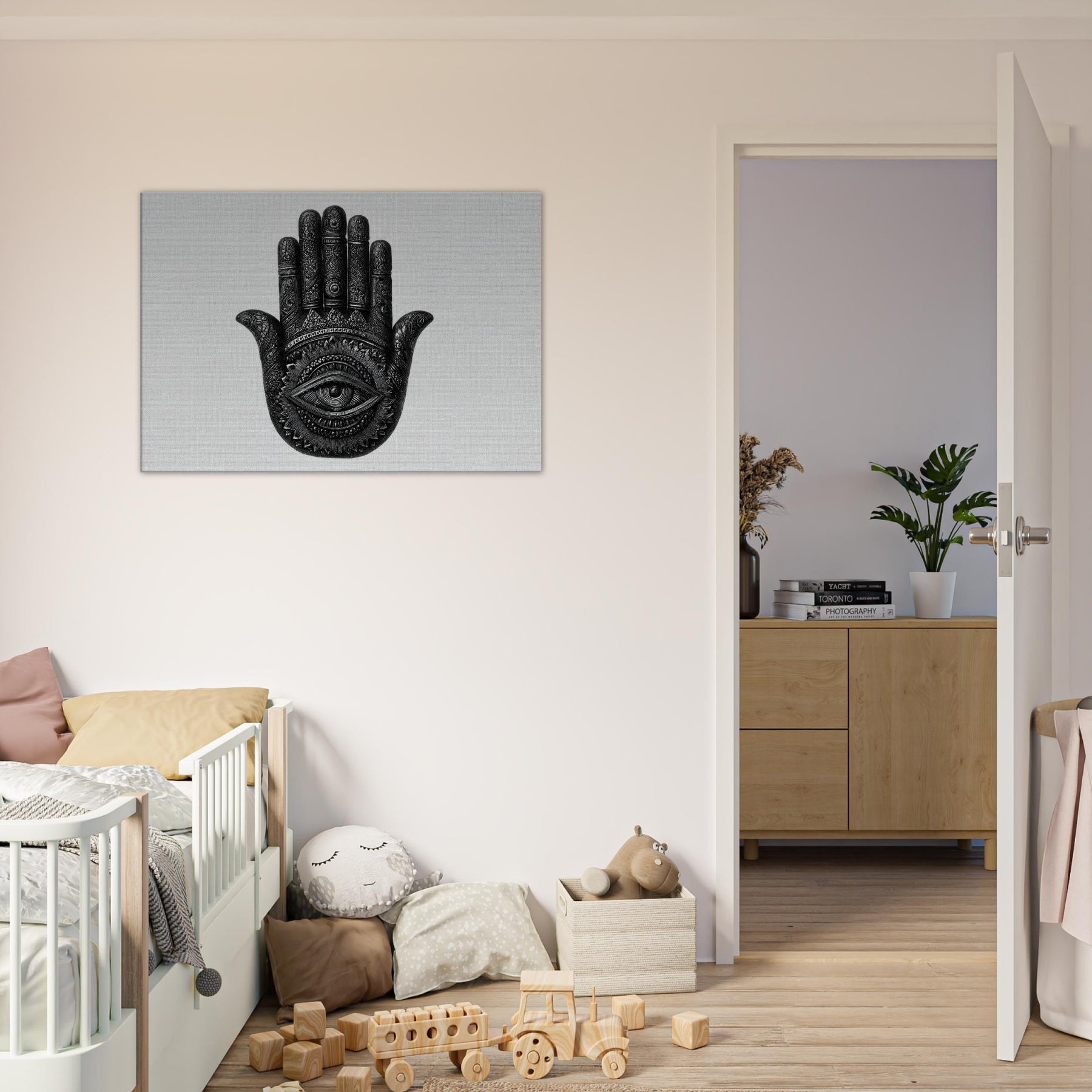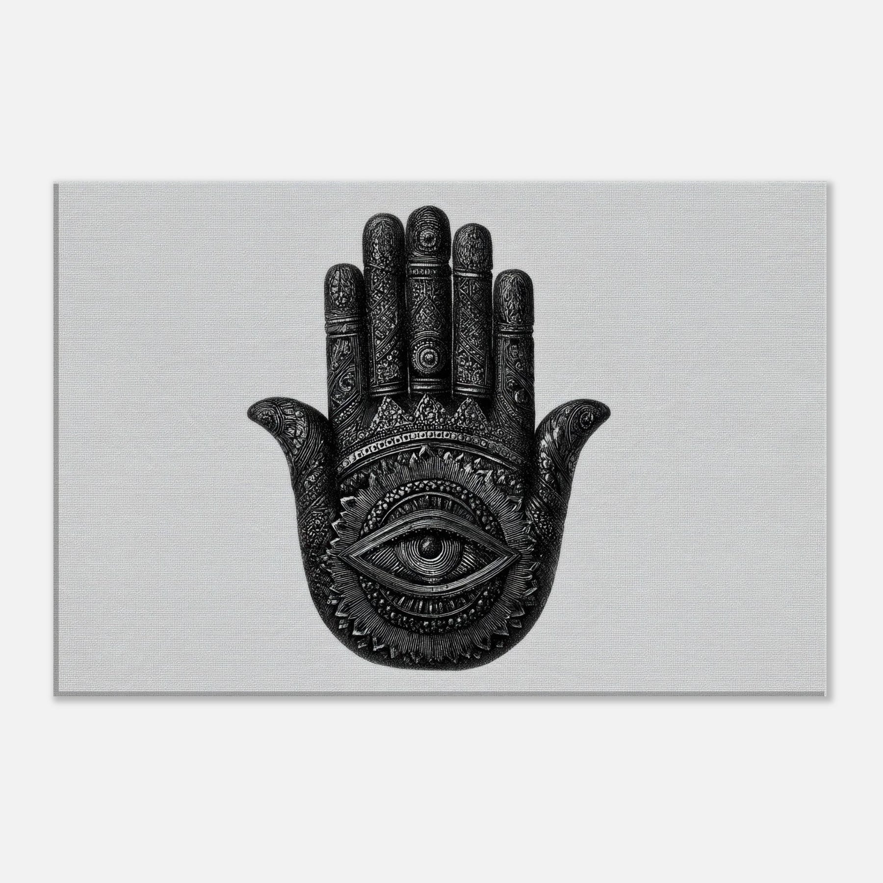 In stark black and white, the palm is etched with ceremonial patterns and a single, watchful eye at its center, inviting reflection and curiosity.