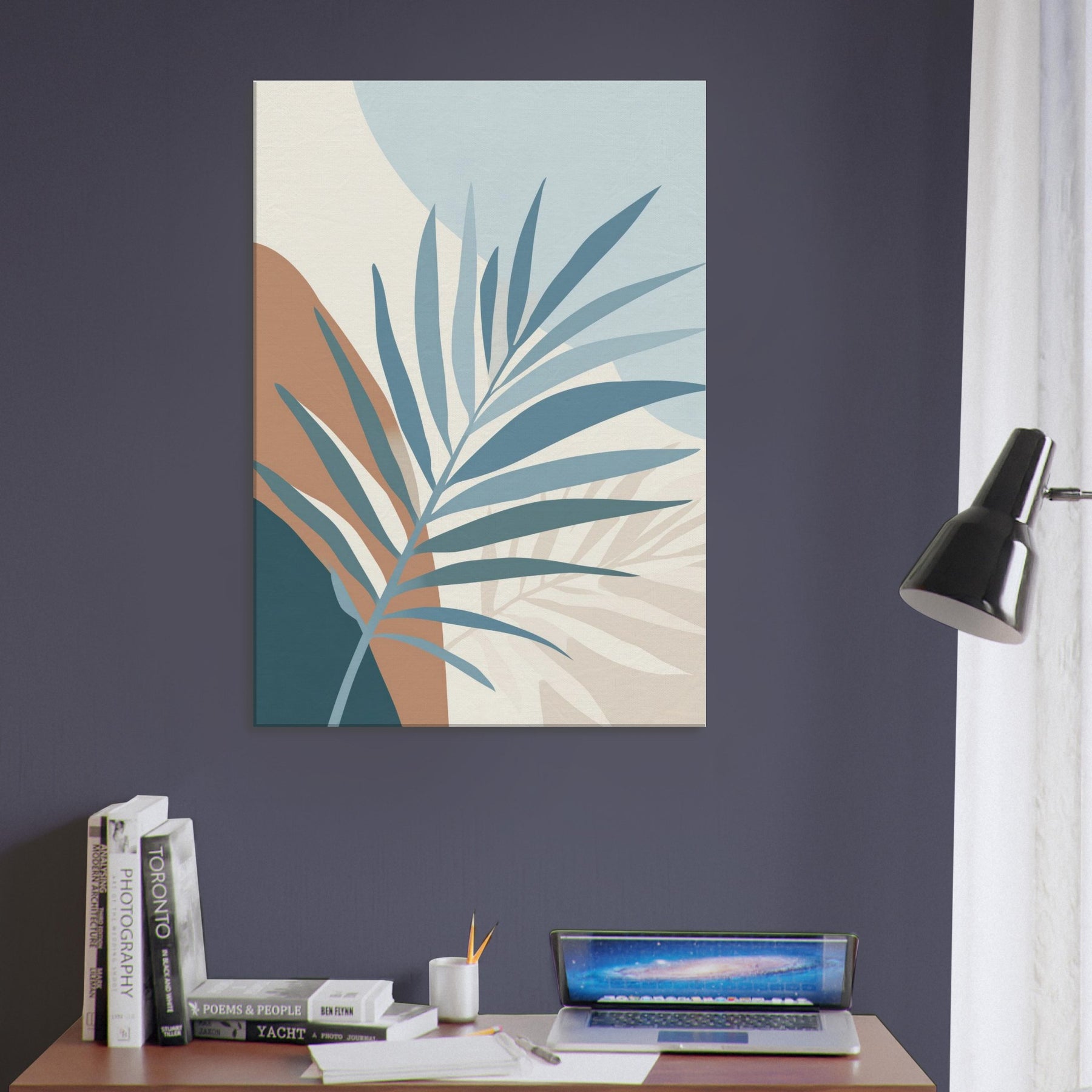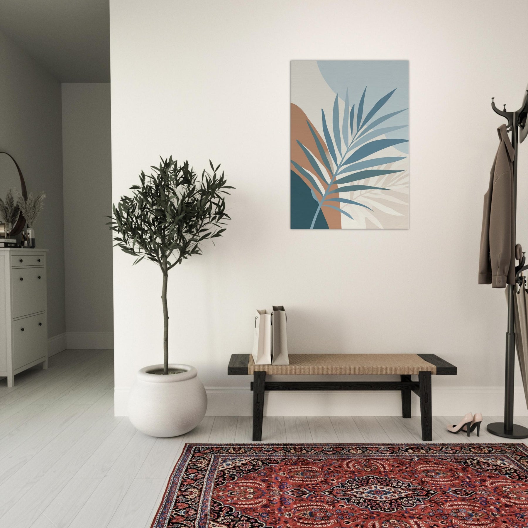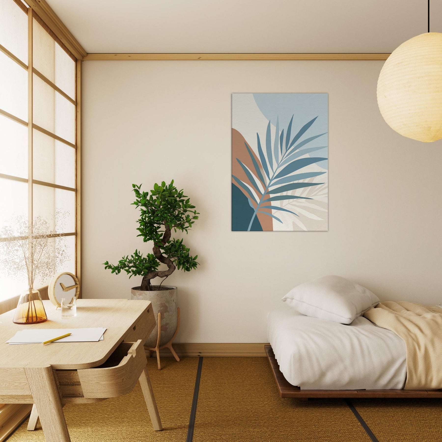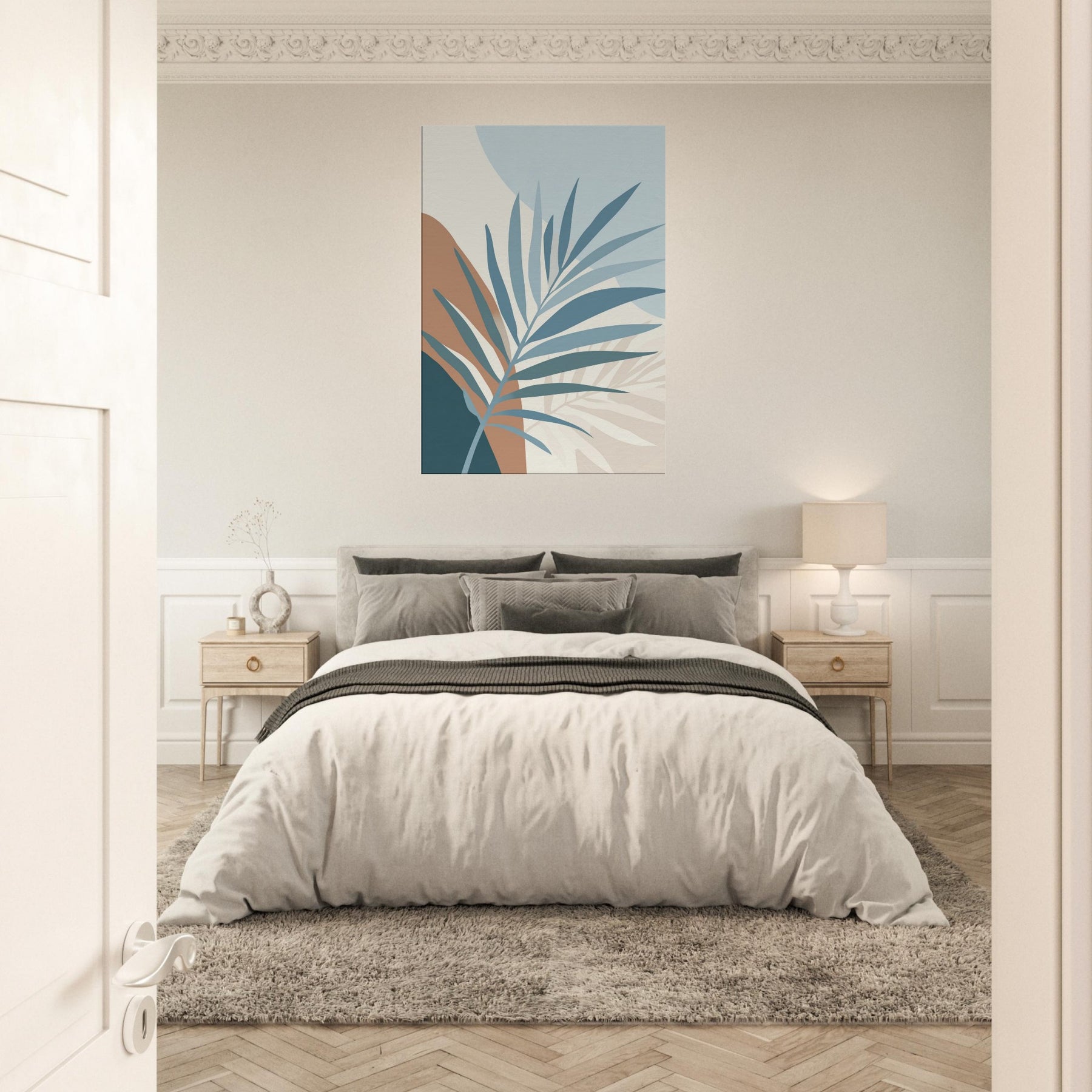 Whisper of Palm Leaves drifts across a quiet field of soft taupe and sea blue. This minimalist composition invites the eye to linger, letting light pool in and around the room. The palm leaves unfurl with gentle rhythm, creating space and calm, as if a tropical breeze brushed your walls. Perfect for a living room or bedside nook, it adds warmth without overwhelm, elevating textures and natural tones. A serene focal point that harmonizes modern furnishings with organic grace.