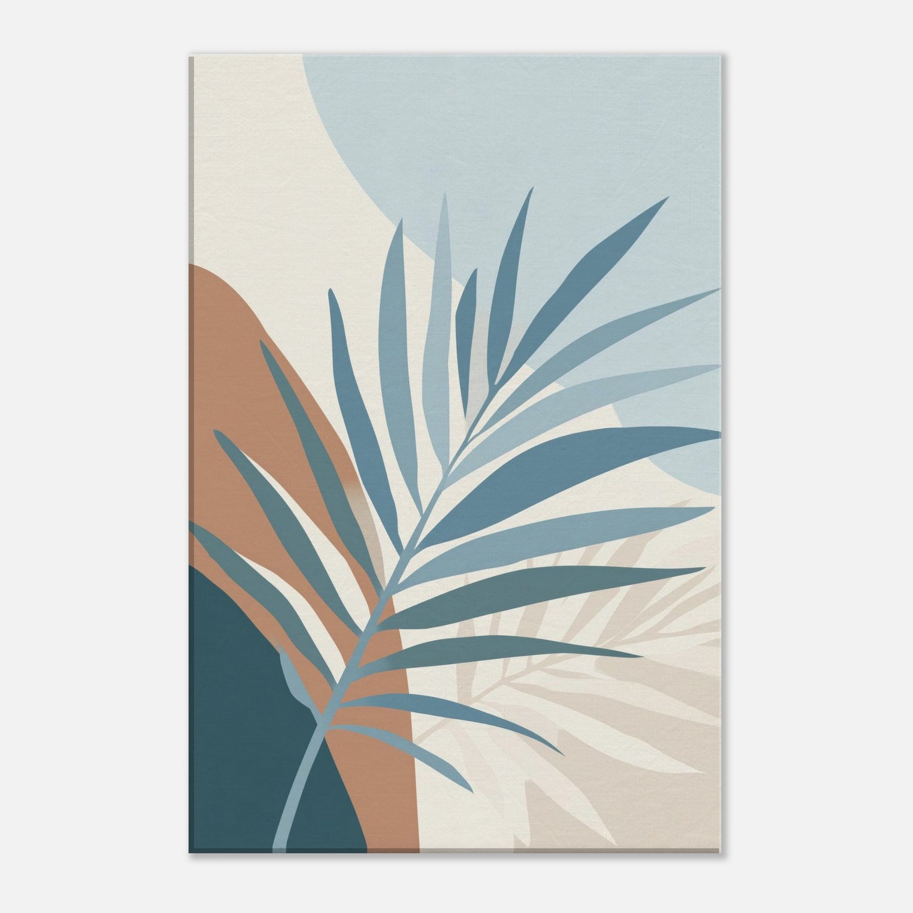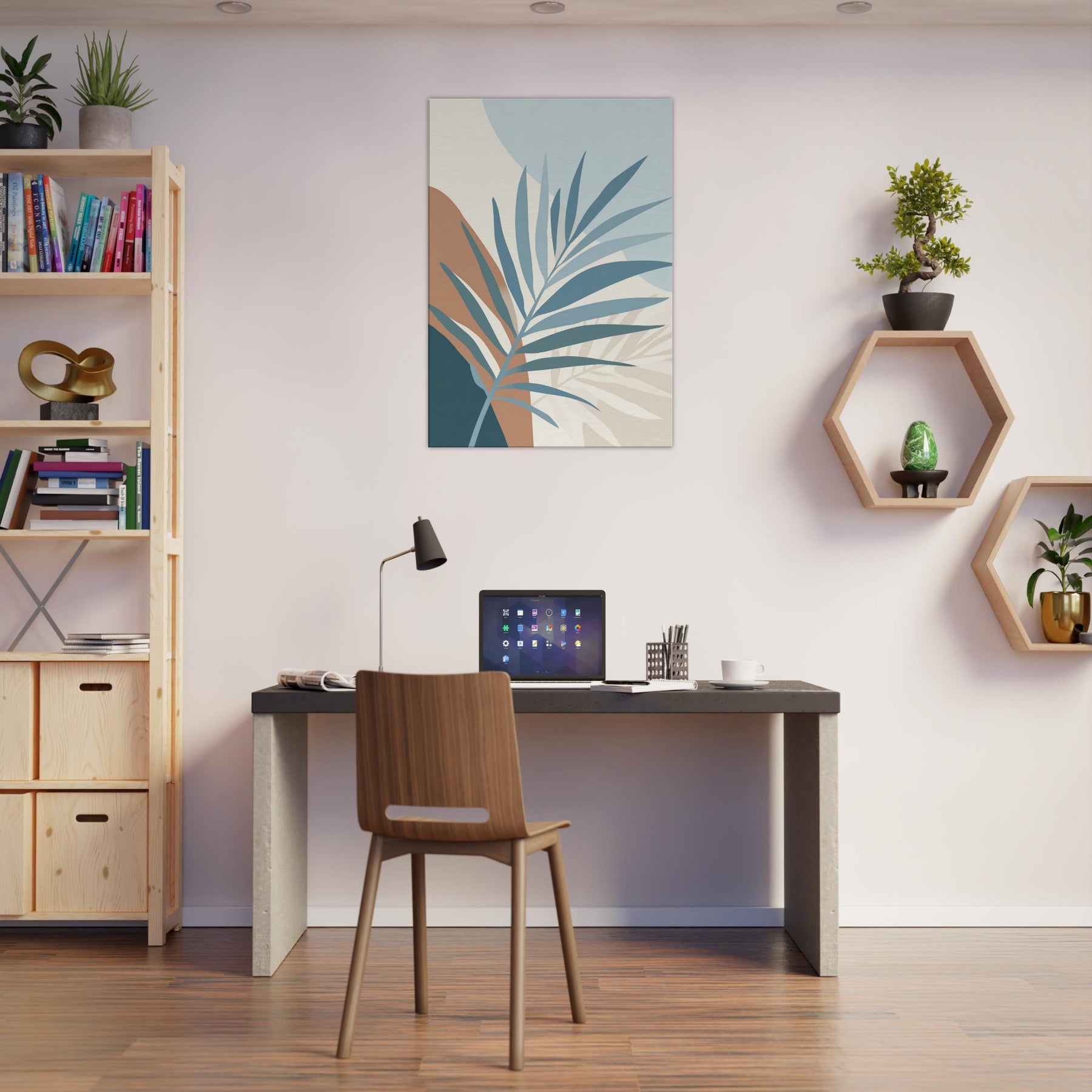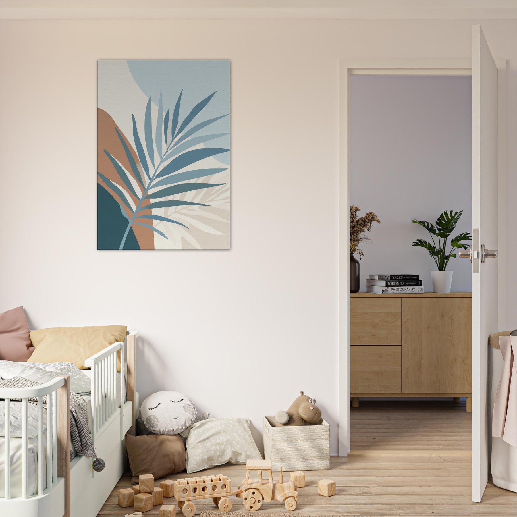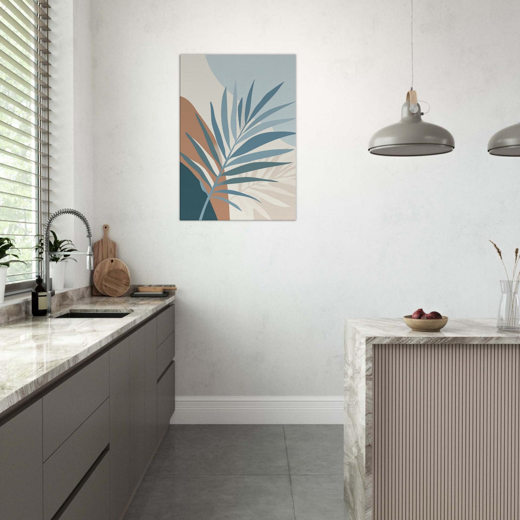 Whisper of Palm Leaves drifts across a quiet field of soft taupe and sea blue. This minimalist composition invites the eye to linger, letting light pool in and around the room. The palm leaves unfurl with gentle rhythm, creating space and calm, as if a tropical breeze brushed your walls. Perfect for a living room or bedside nook, it adds warmth without overwhelm, elevating textures and natural tones. A serene focal point that harmonizes modern furnishings with organic grace.