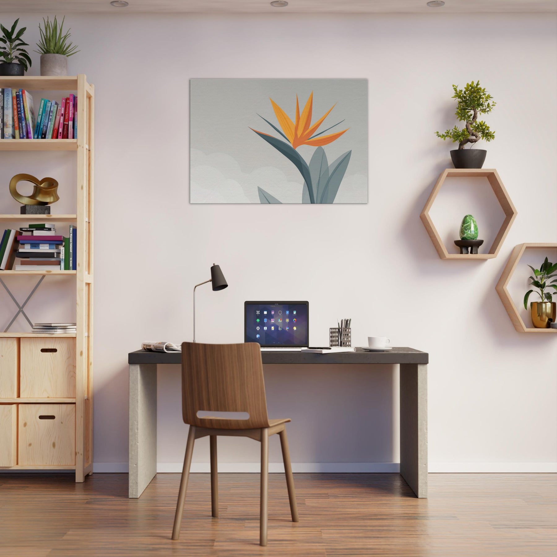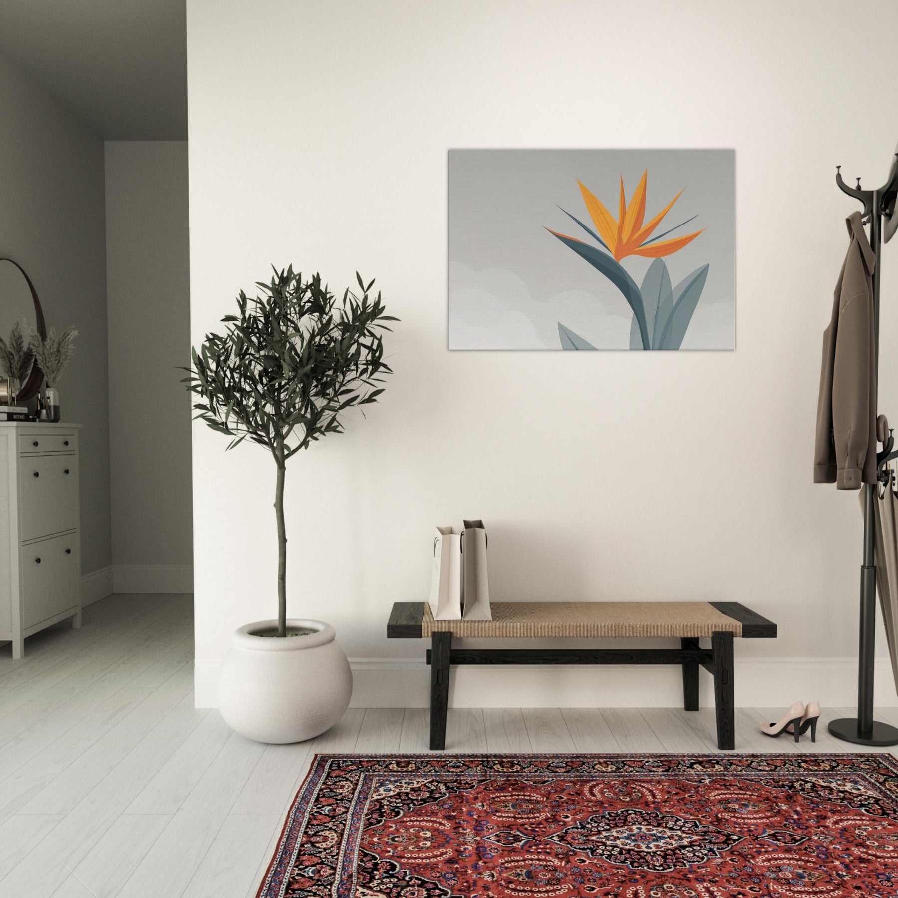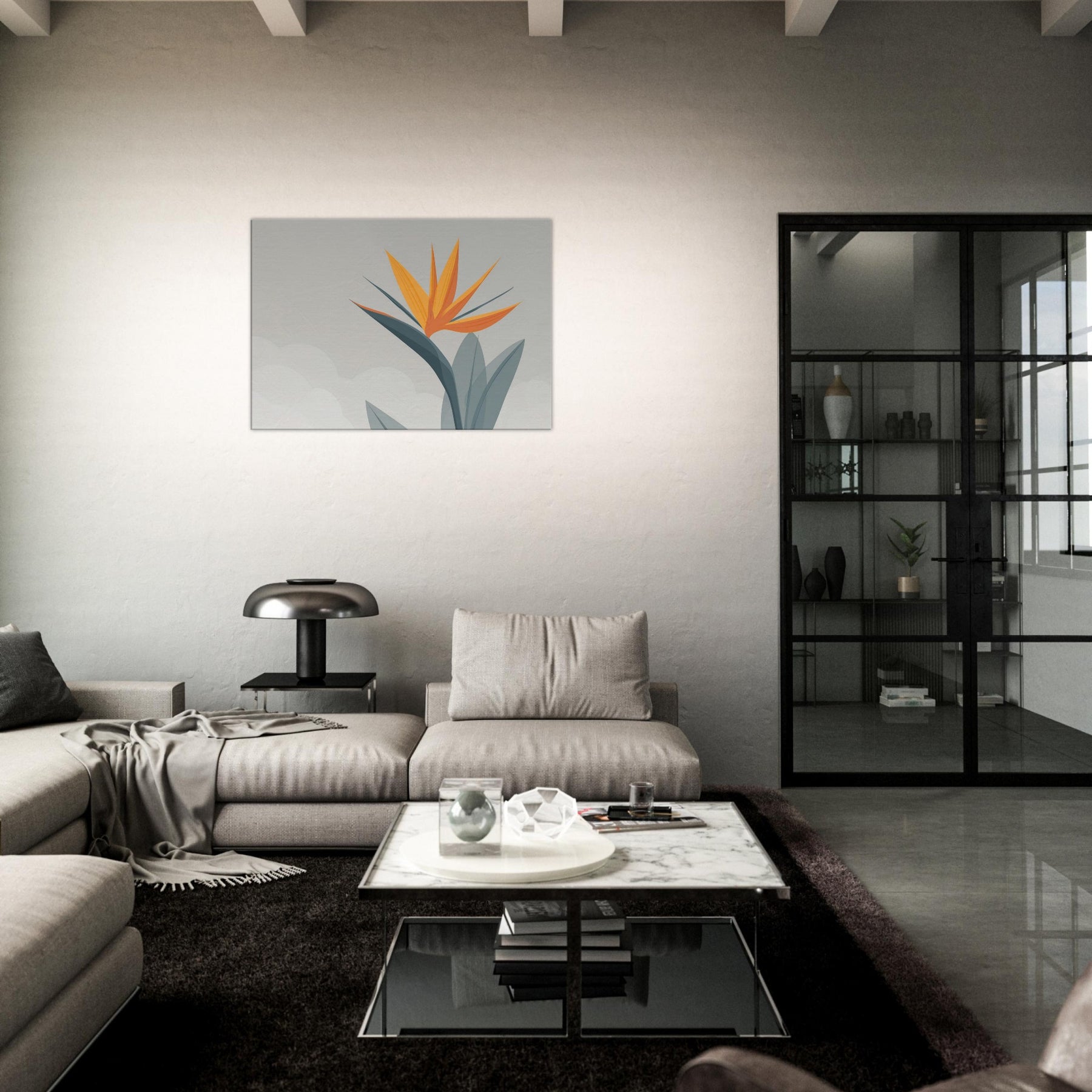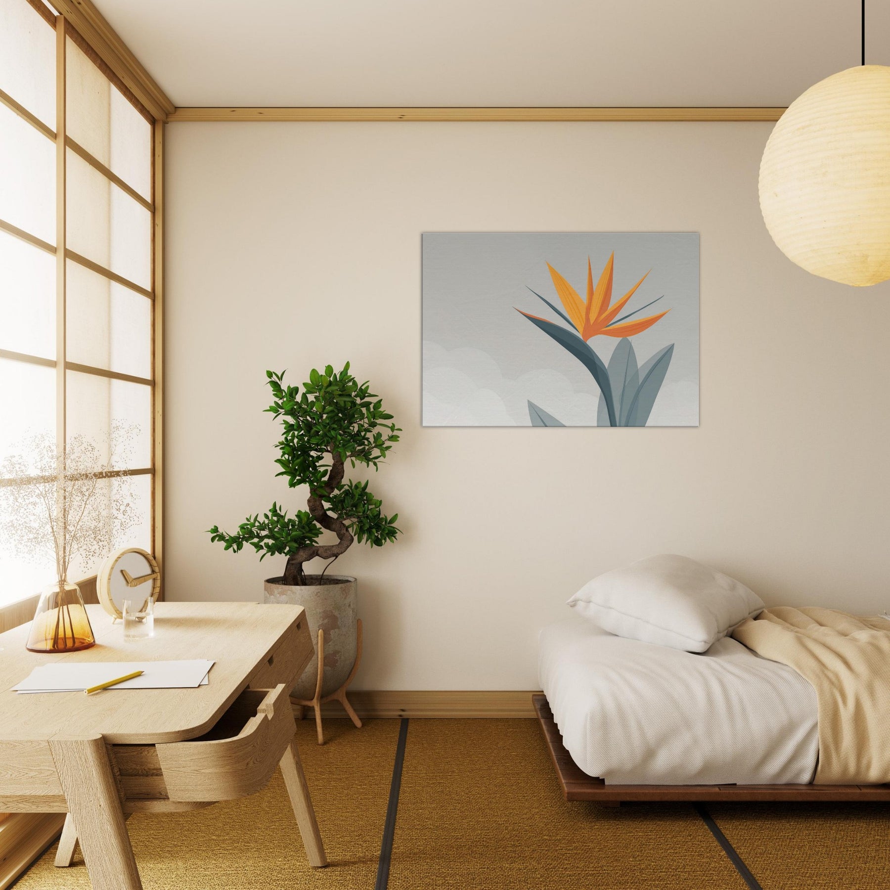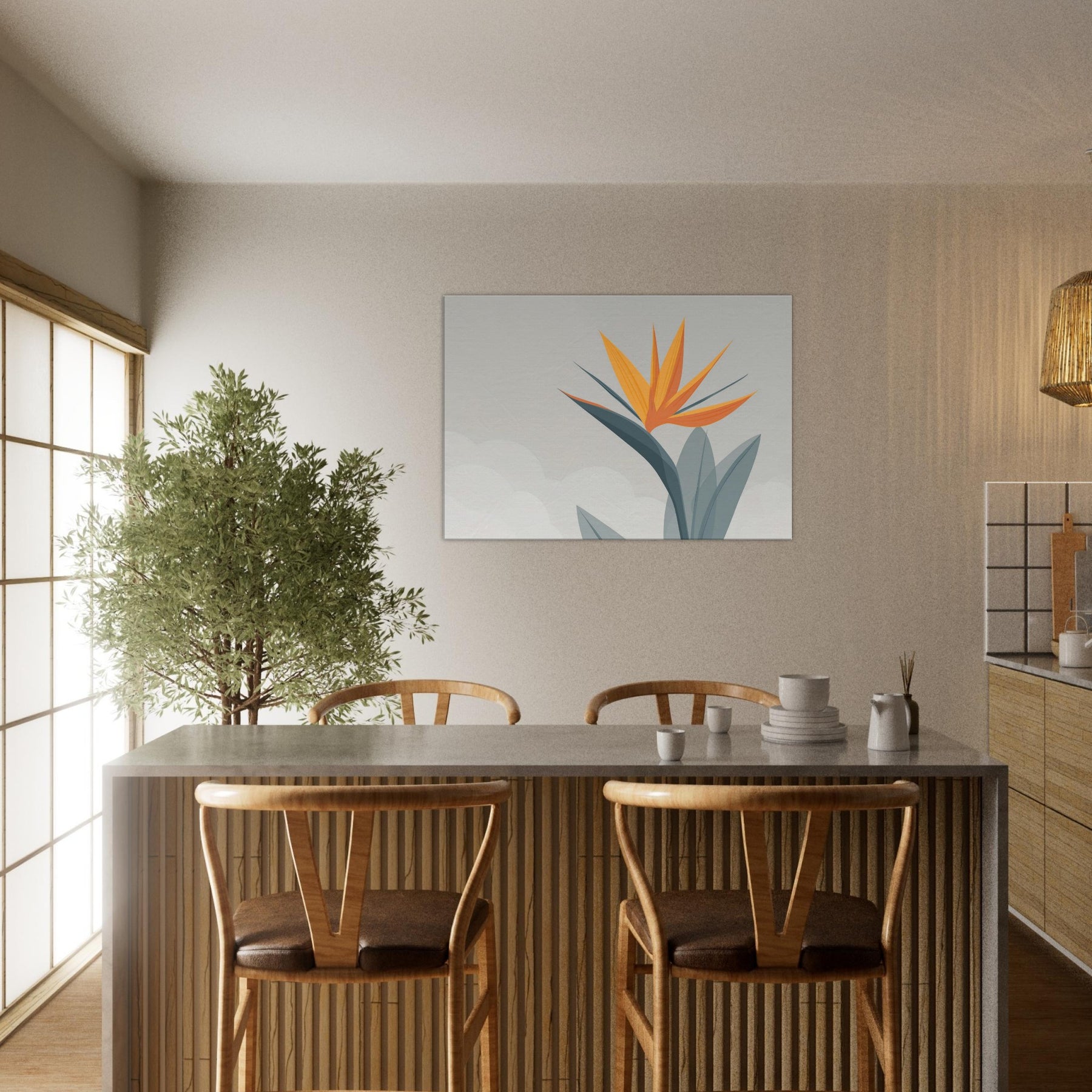Bird of Paradise graces the room with a clean, lyrical presence. This minimalist composition invites quiet energy into soft neutrals and a splash of bright citrus, mixing tropical glow with everyday calm. The restrained silhouette long stem, vibrant orange petals, cool slate leaves creates a poised rhythm that anchors seating groups or a reading nook. Perfect for a sunlit wall or a twilight alcove, it offers a serene focal point that heightens warmth, clarity, and the feeling of effortless, refined living.