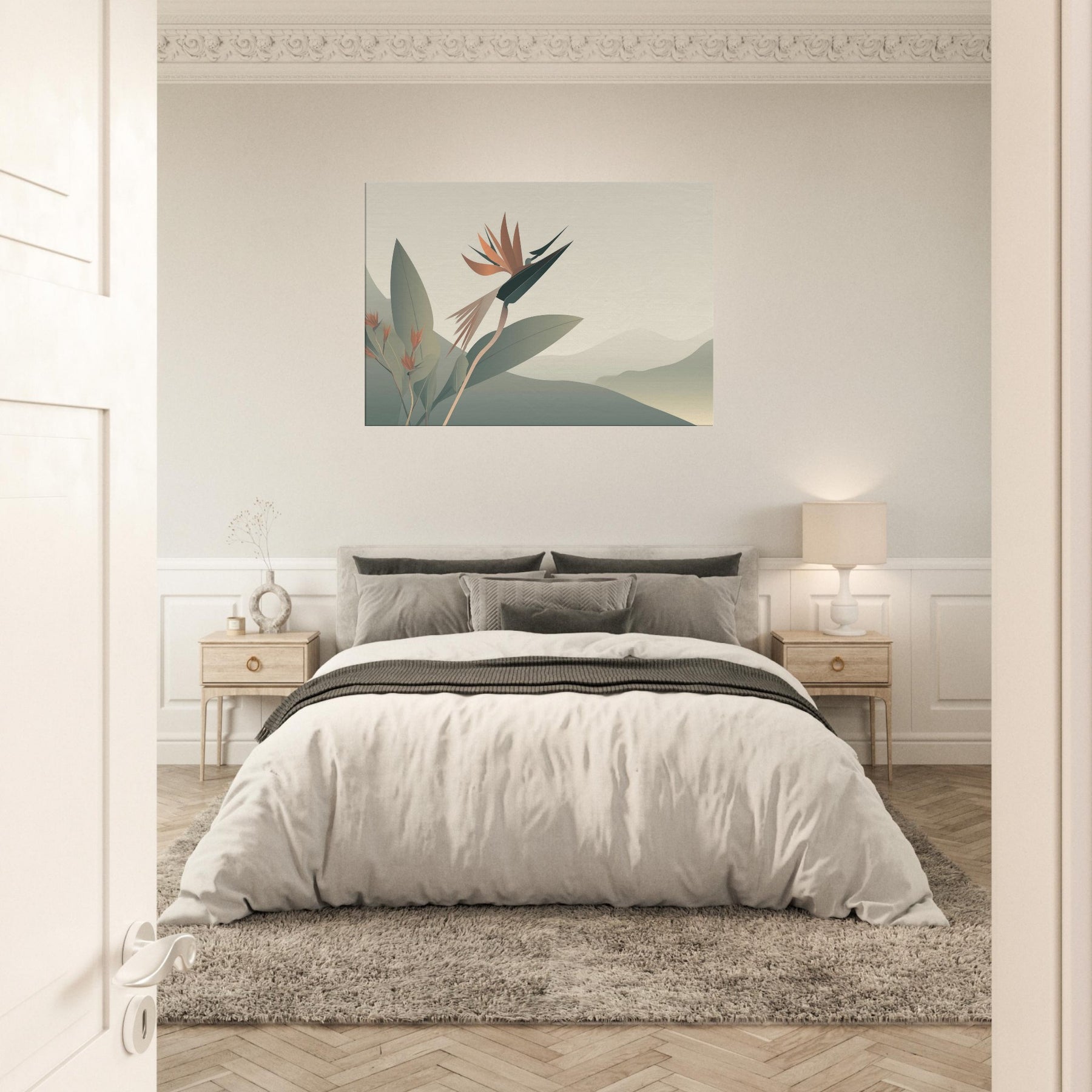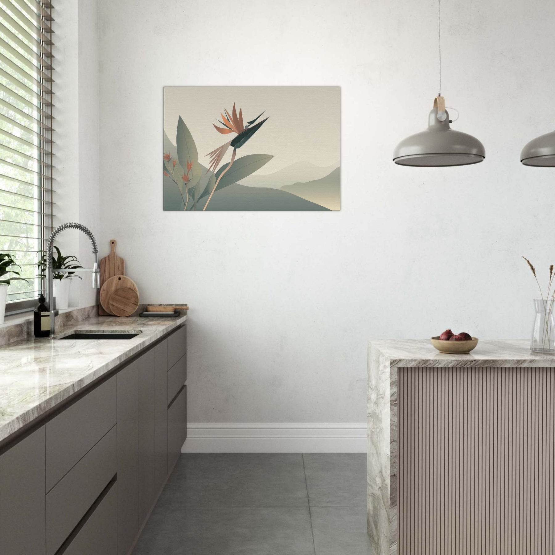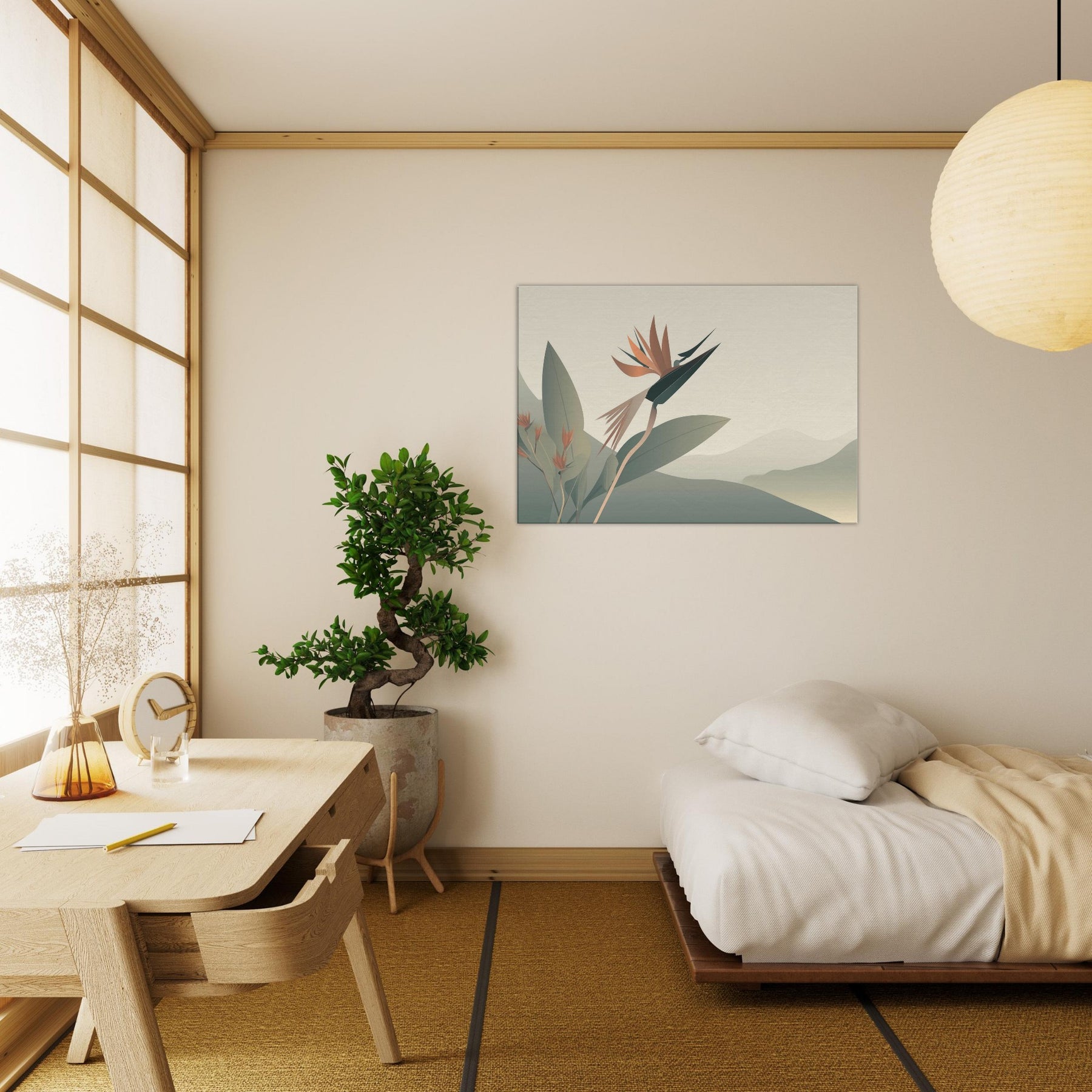 Let the Bird of Paradise drift into your living space as a moment of tranquil brightness. This minimalist composition reduces detail to clean, crisp shapes and a soft, sunlit palette, inviting breath and quiet reflection. The plant's sculptural form rises against a misty horizon, turning any room into a serene retreat where the mind can wander. Printed on high quality archival paper, it pairs with neutrals and greens alike, enhancing bedrooms and lounges with a sense of calm, balance, and subtle elegance.