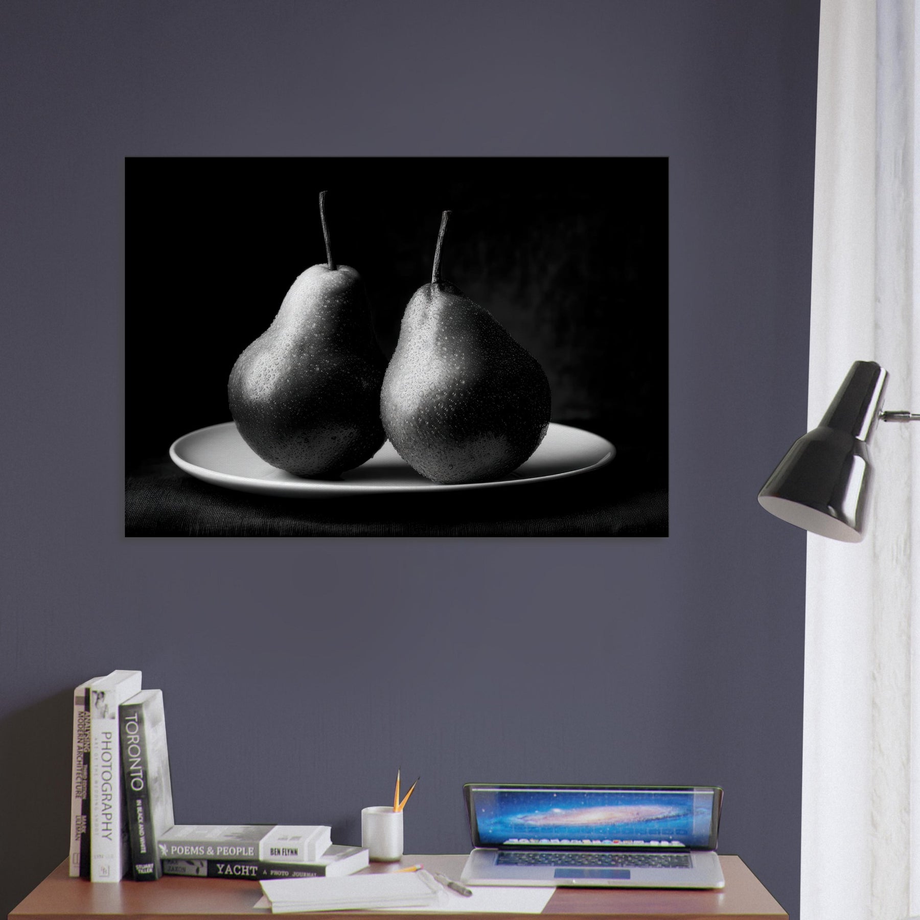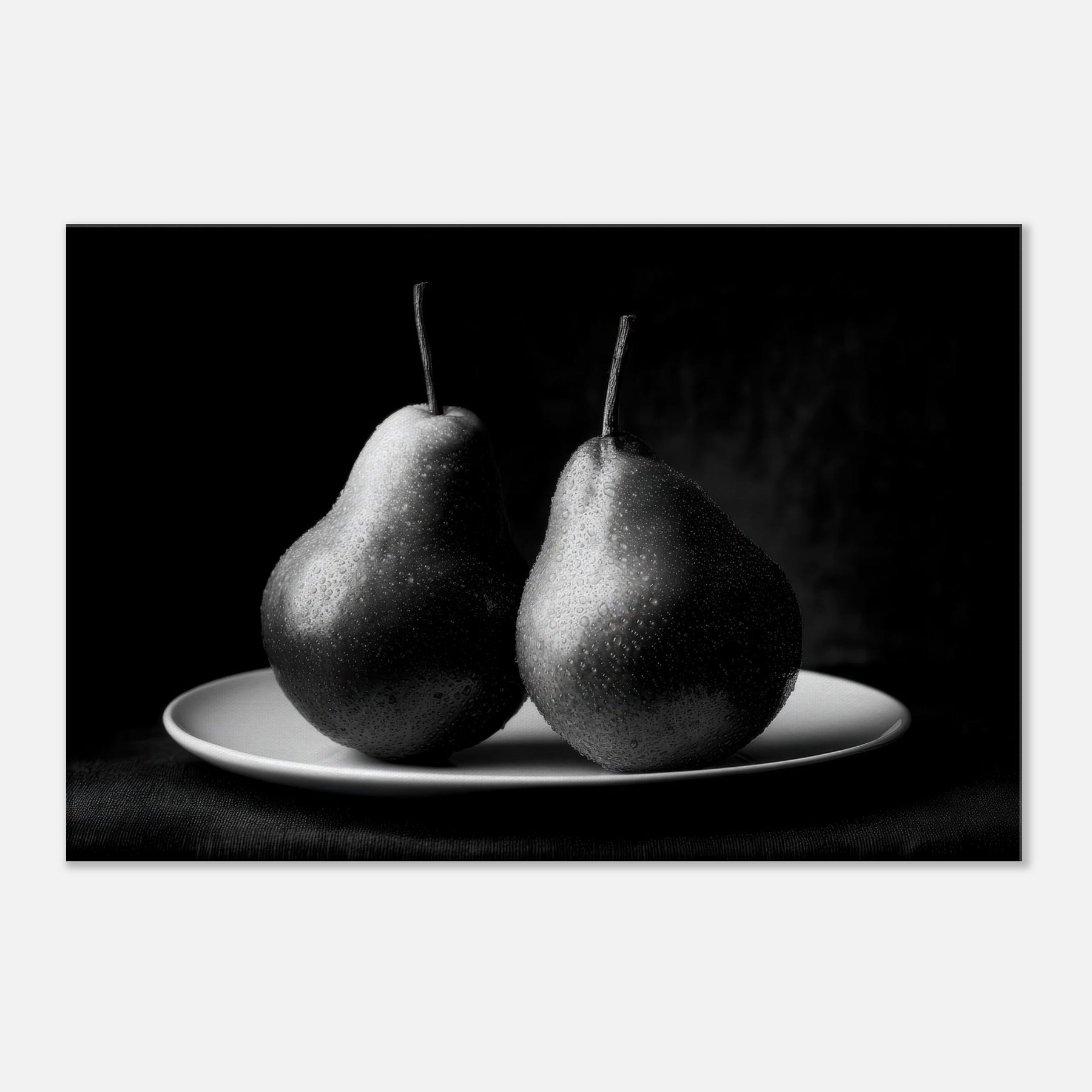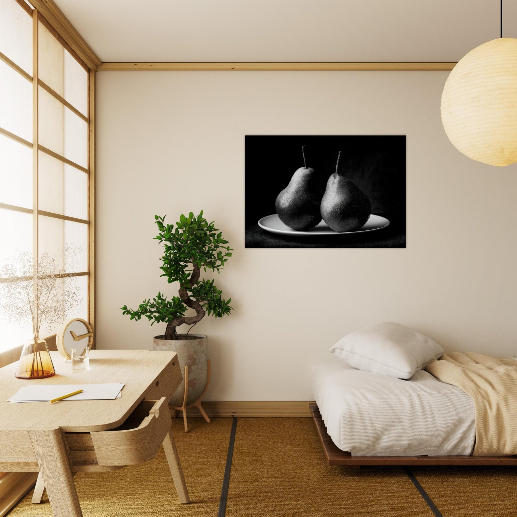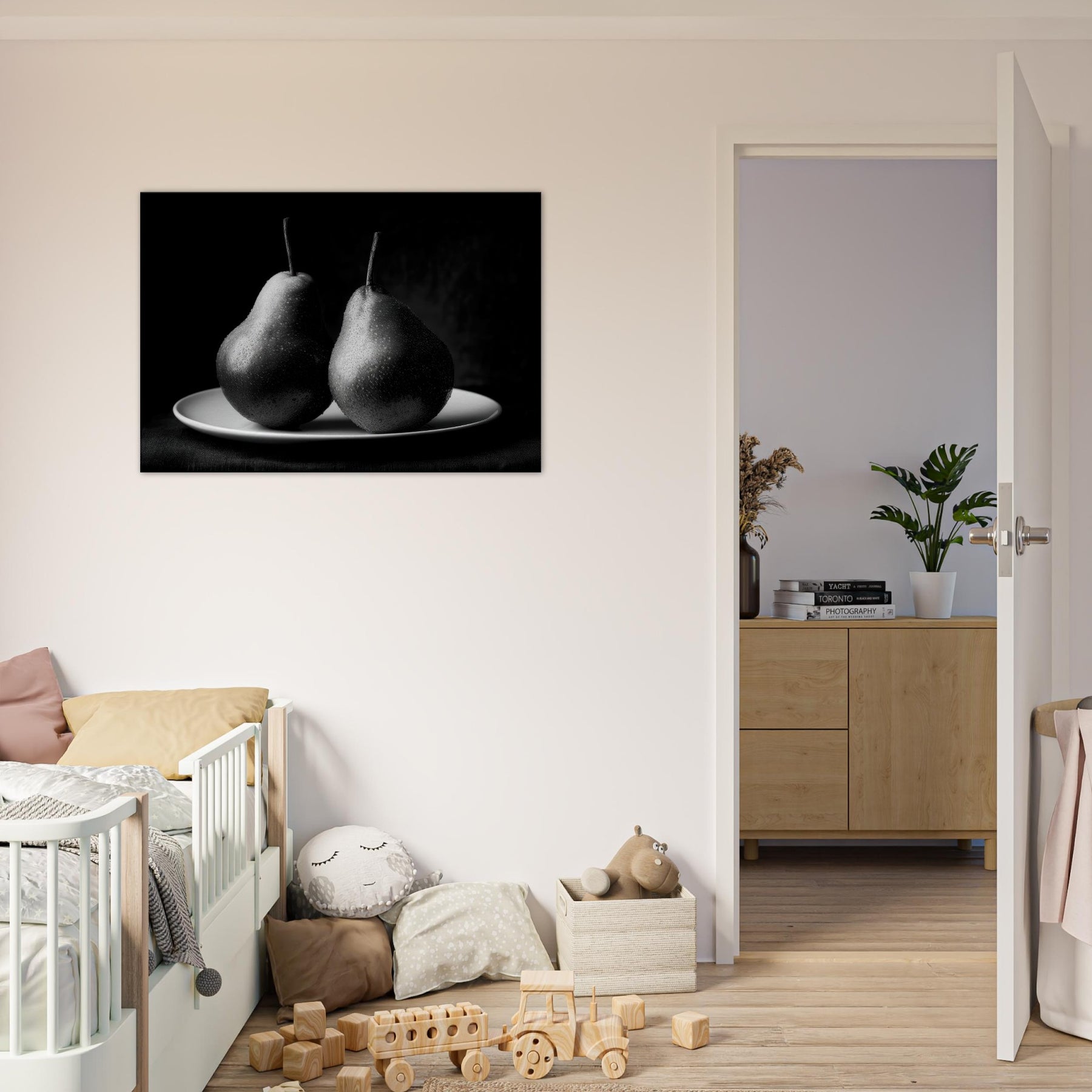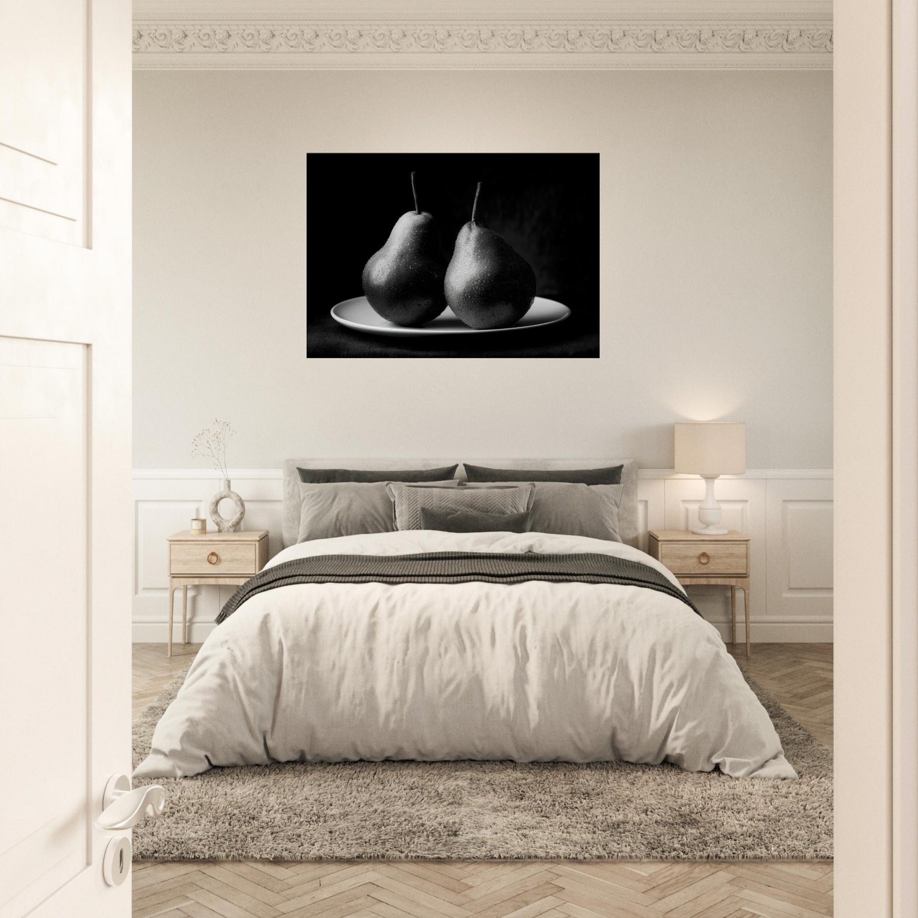 A study in quiet contrast, Pears On Plate rests on a simple white dish, captured in monochrome that breathes light and shadow. The dew like highlights render the pear skins tactile, as if you could feel their slick surfaces. This piece brings a poised, intimate stillness to a living room an invitation to slow down, to notice form, weight, and the elegant tension between flesh and shadow.