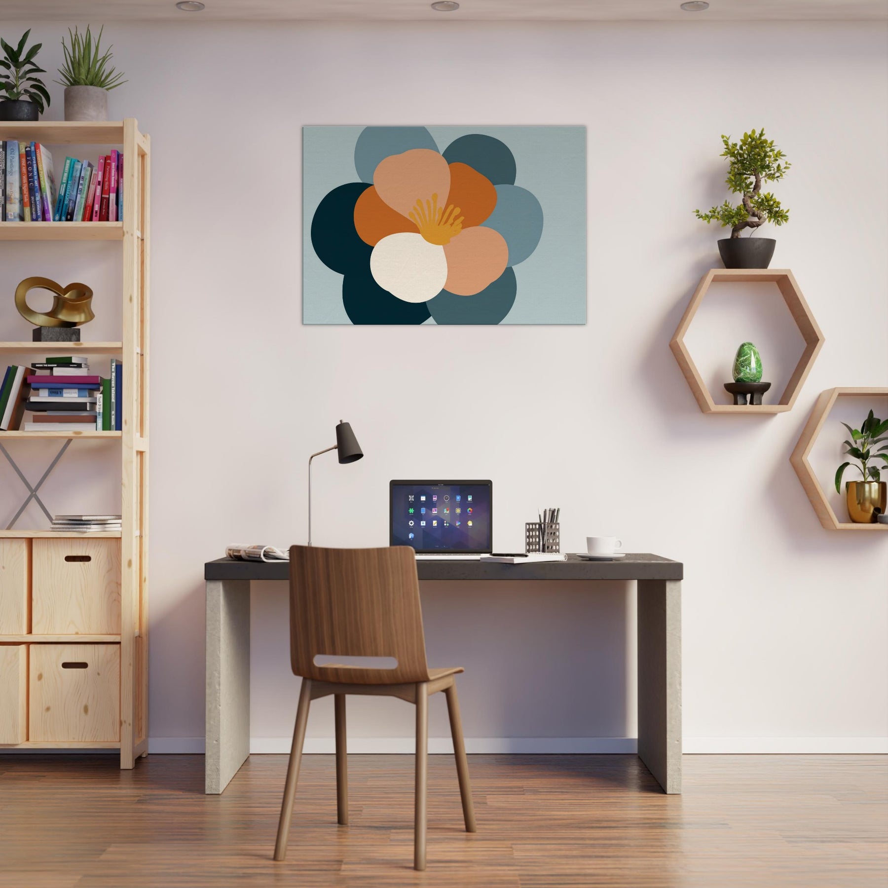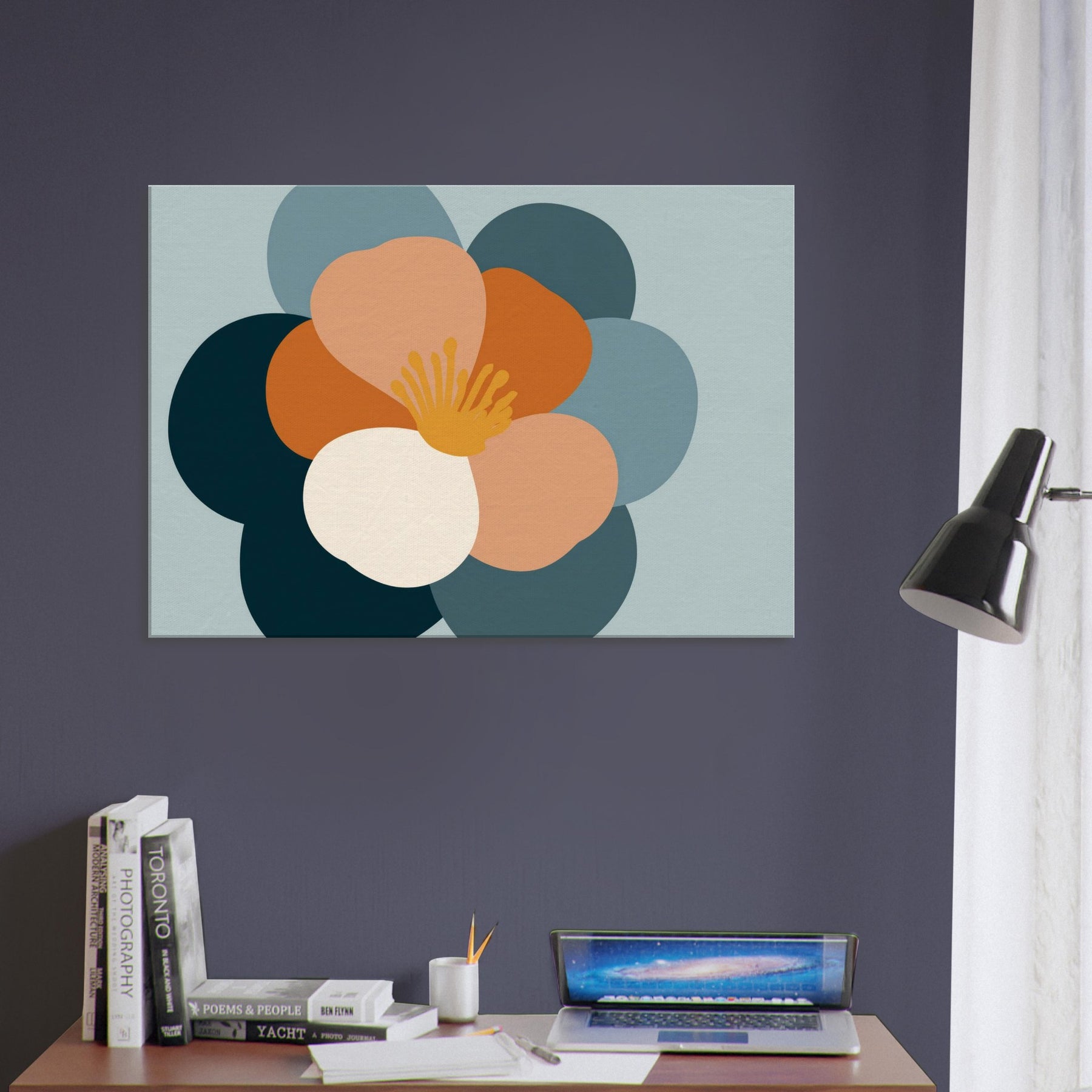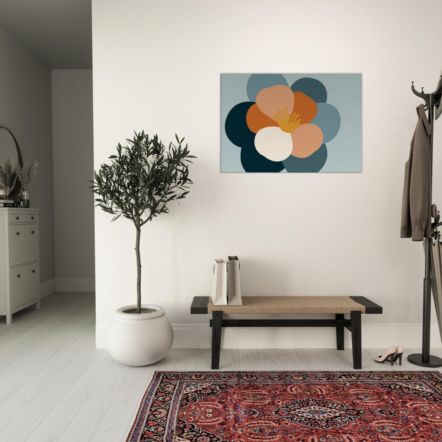 Soft, sculptural and serene, this minimalist rendering of a Camellia opens a quiet corner in any room. The layered petals drift like warm sunlight across cool neutral walls, while a gentle ochre center glows with understated energy. The palette sage blues, blush peach, creamy ivory evokes a tranquil garden at twilight, inviting calm, focus, and easy conversation. The piece would brighten a living room or hall, a quiet anchor for daily rituals, turning a blank wall into a breath of nature.