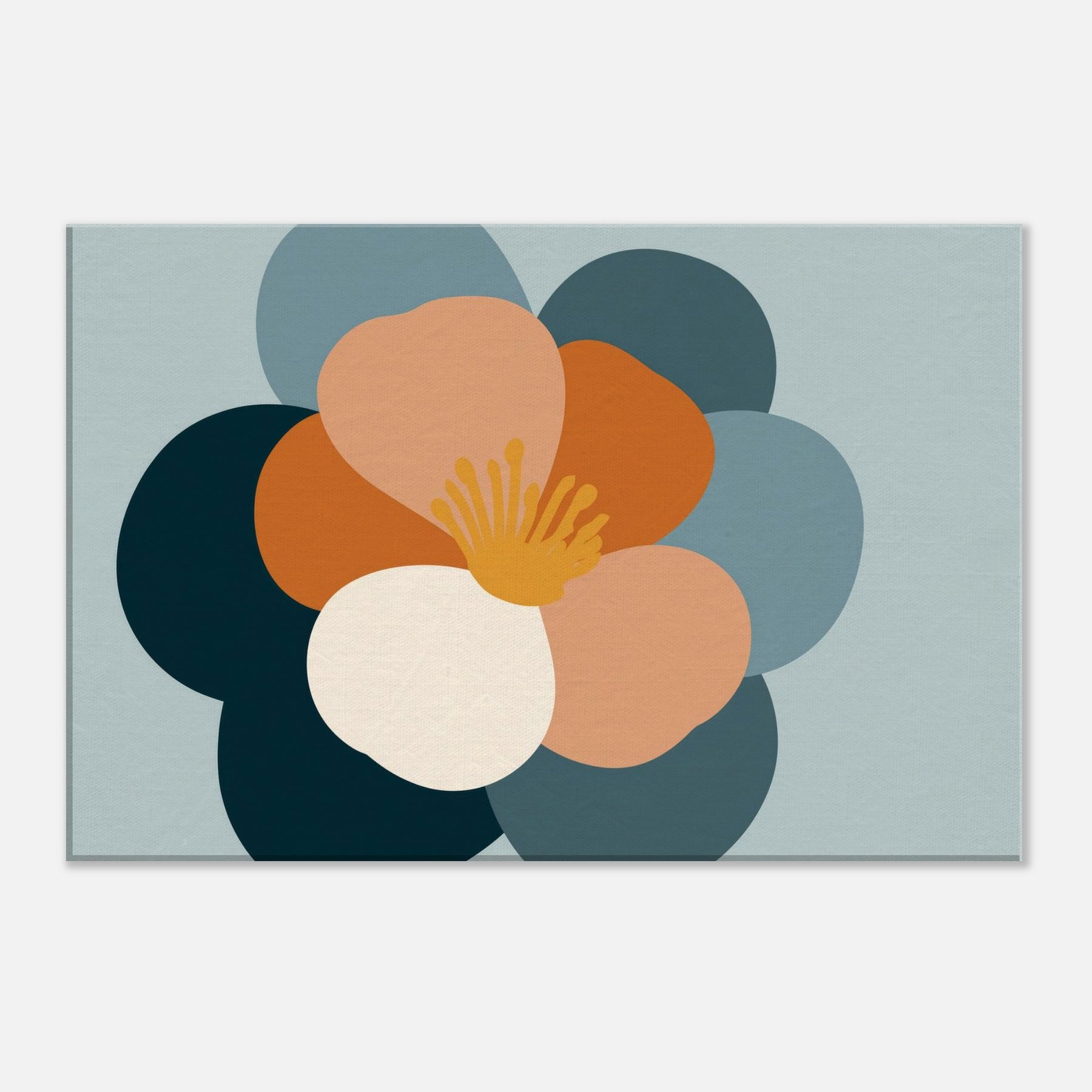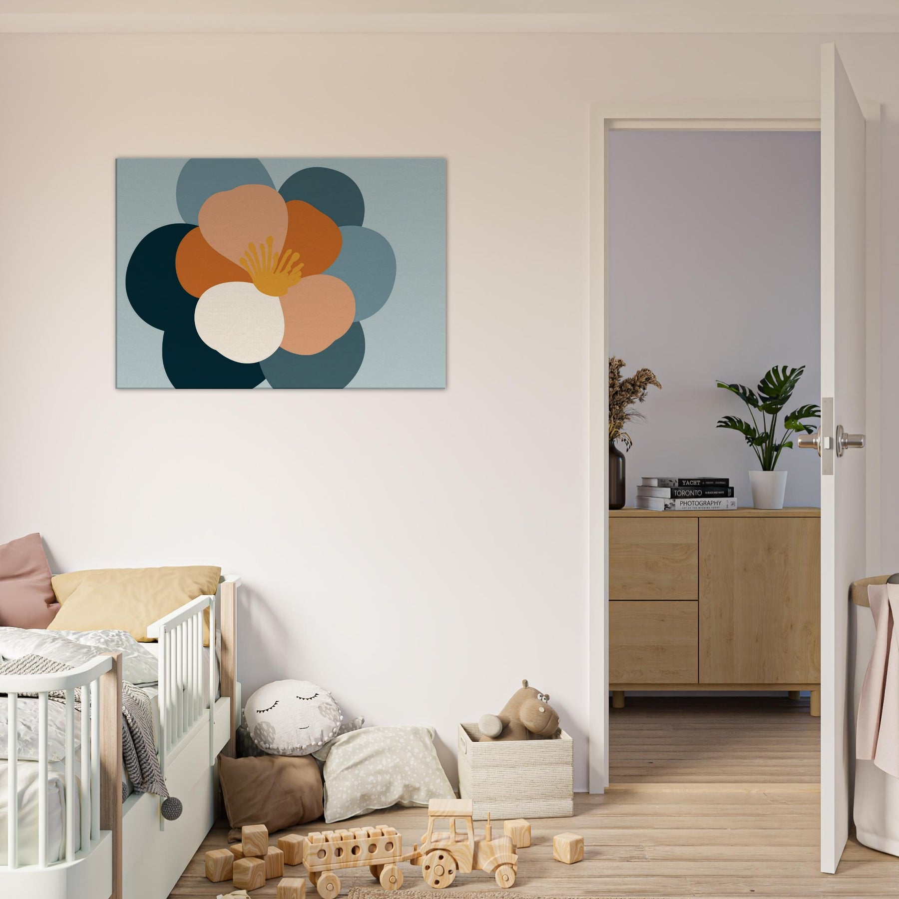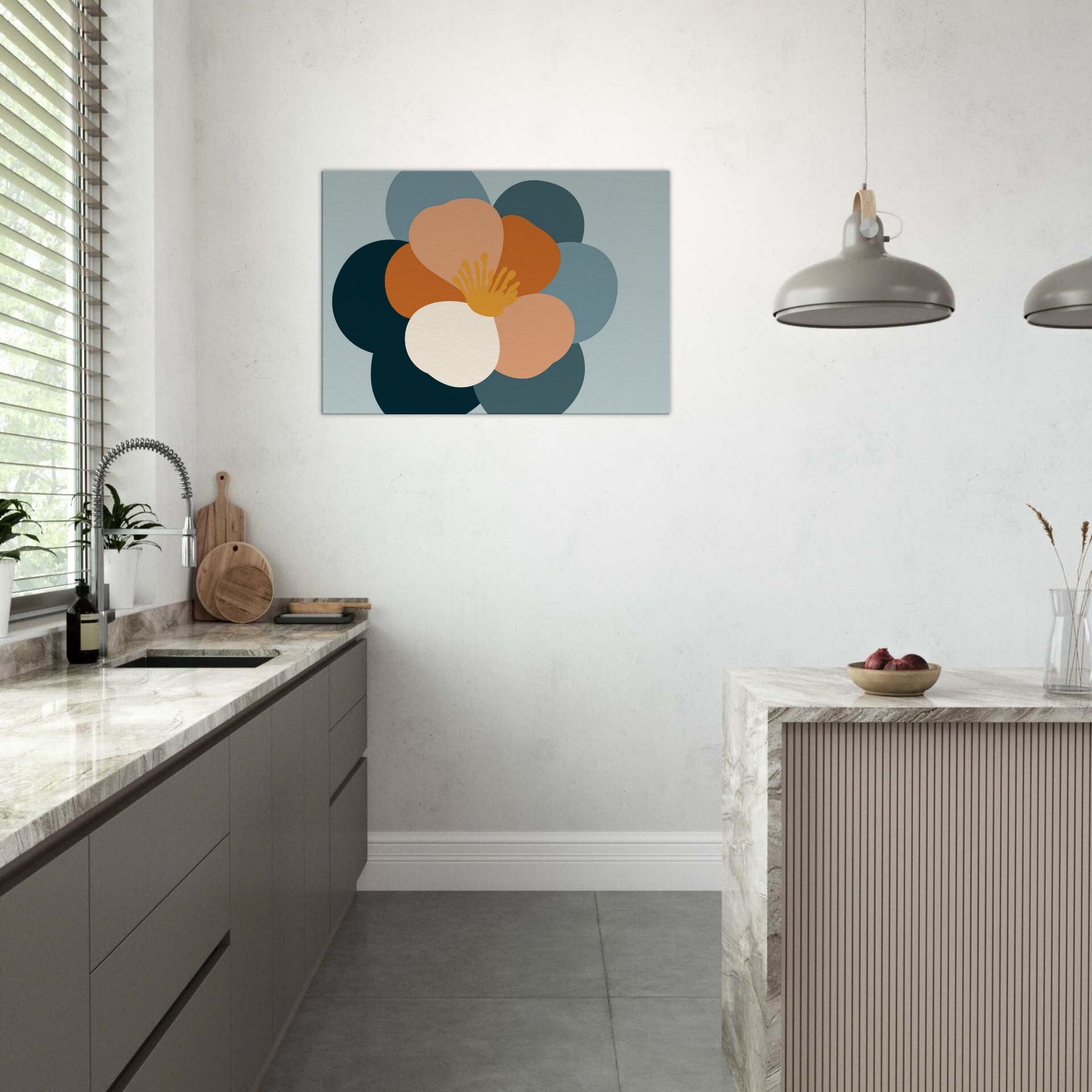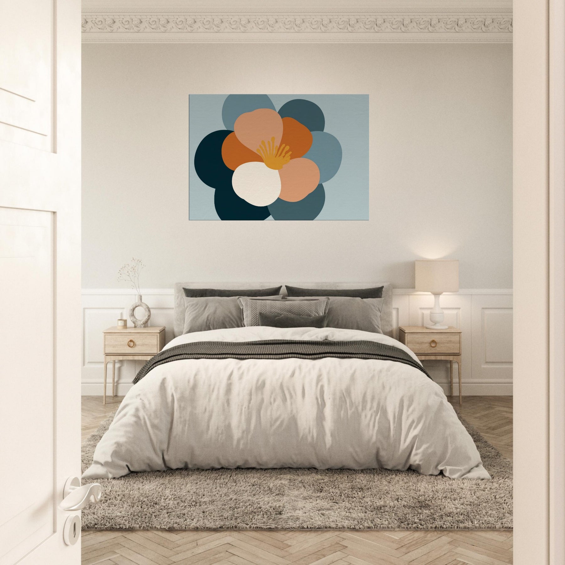 Soft, sculptural and serene, this minimalist rendering of a Camellia opens a quiet corner in any room. The layered petals drift like warm sunlight across cool neutral walls, while a gentle ochre center glows with understated energy. The palette sage blues, blush peach, creamy ivory evokes a tranquil garden at twilight, inviting calm, focus, and easy conversation. The piece would brighten a living room or hall, a quiet anchor for daily rituals, turning a blank wall into a breath of nature.