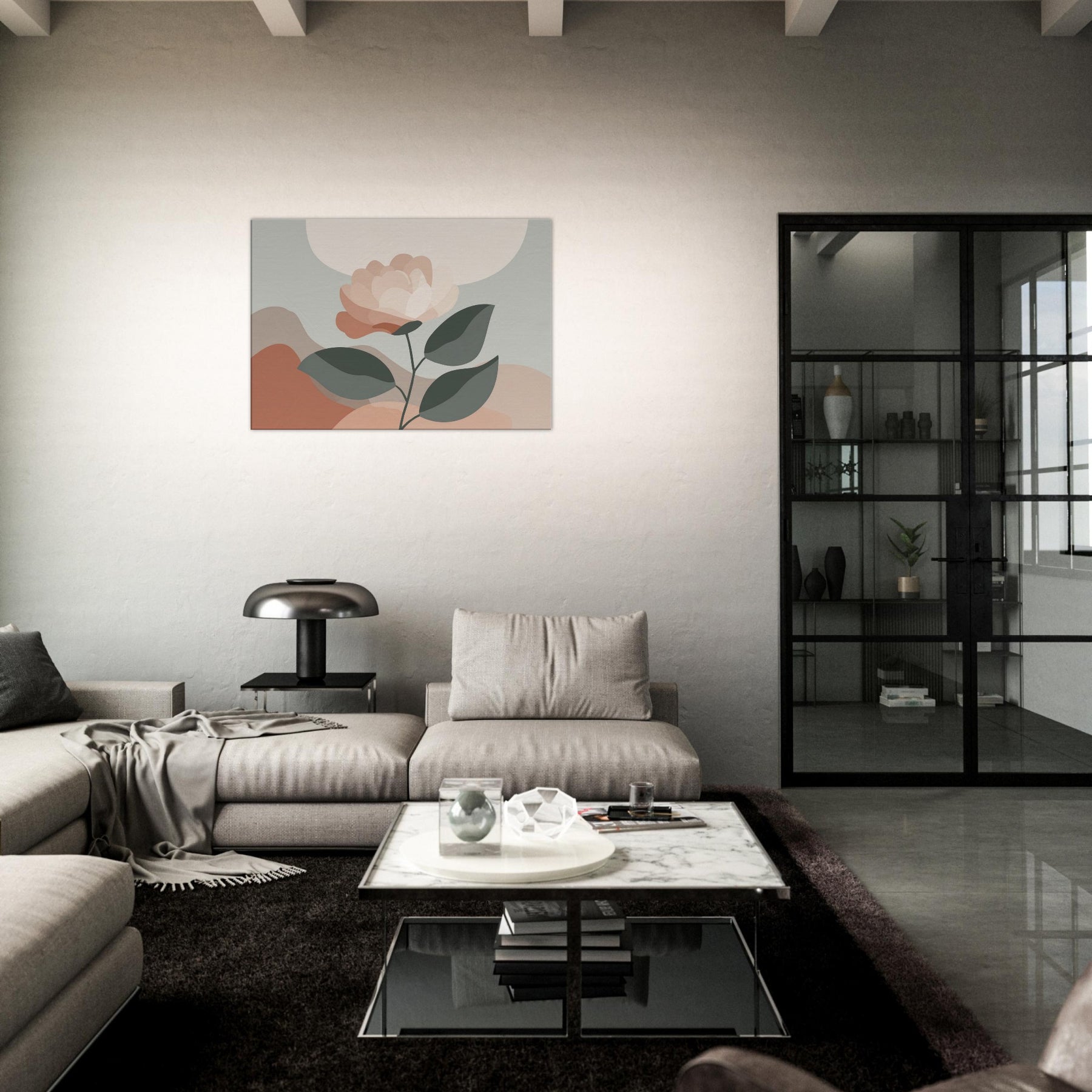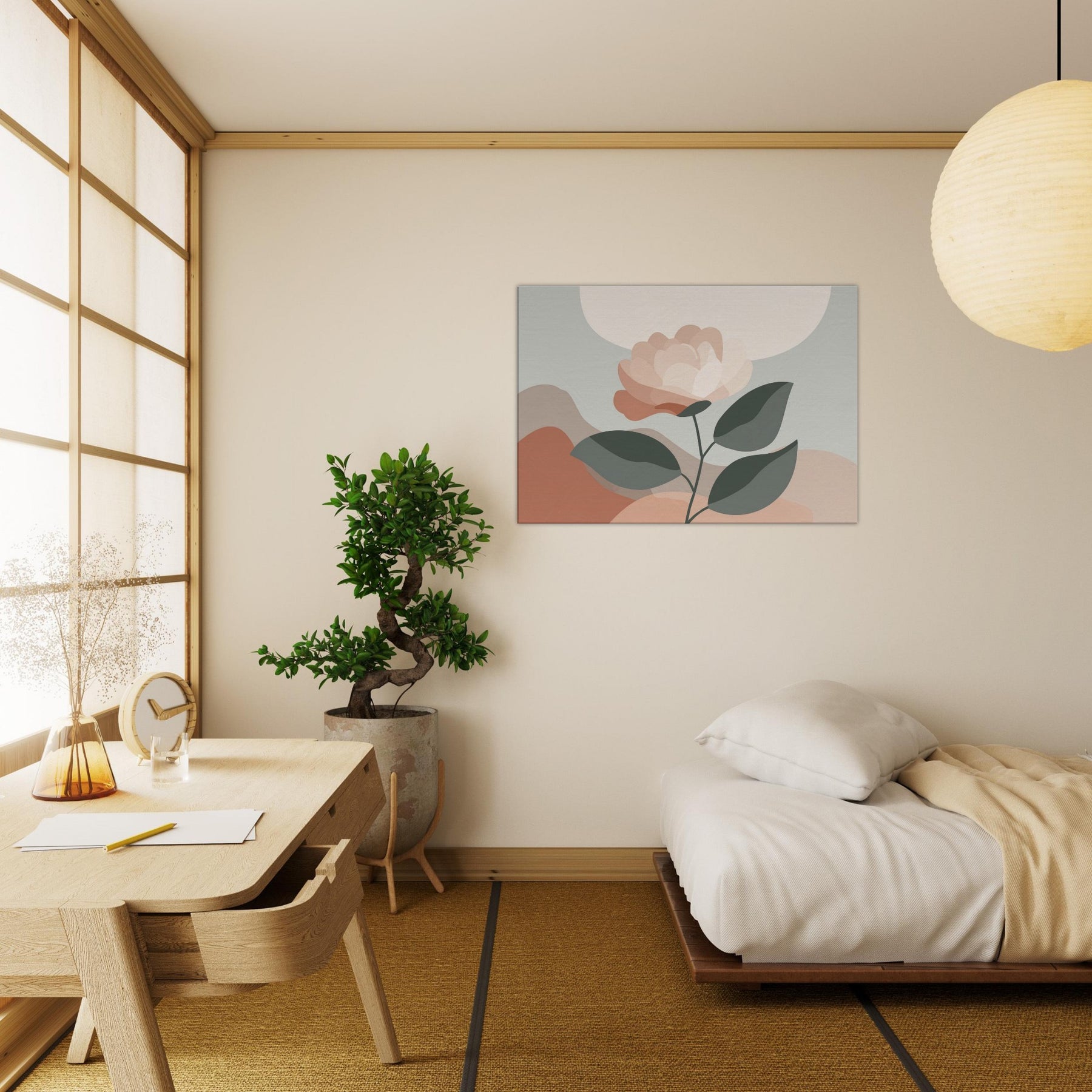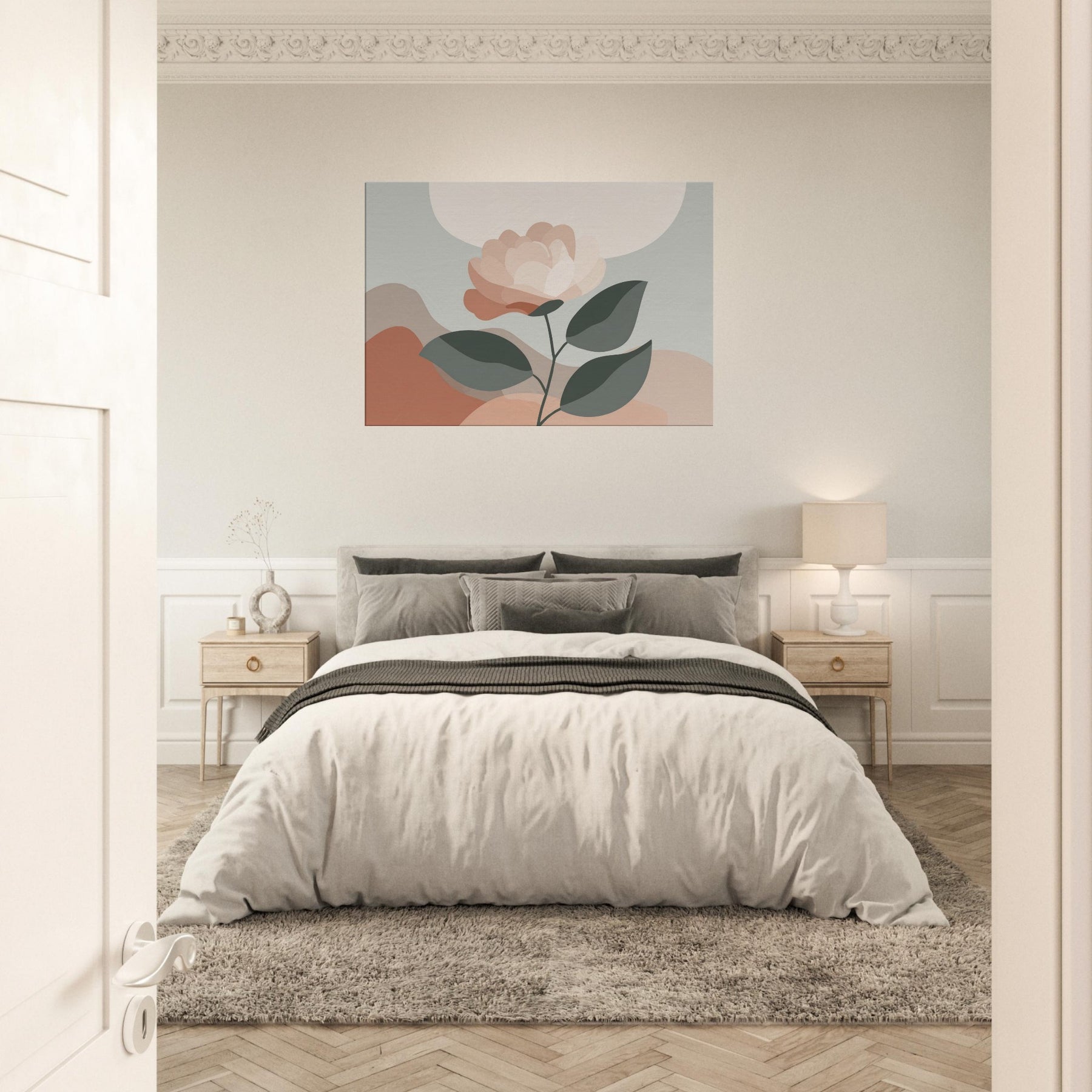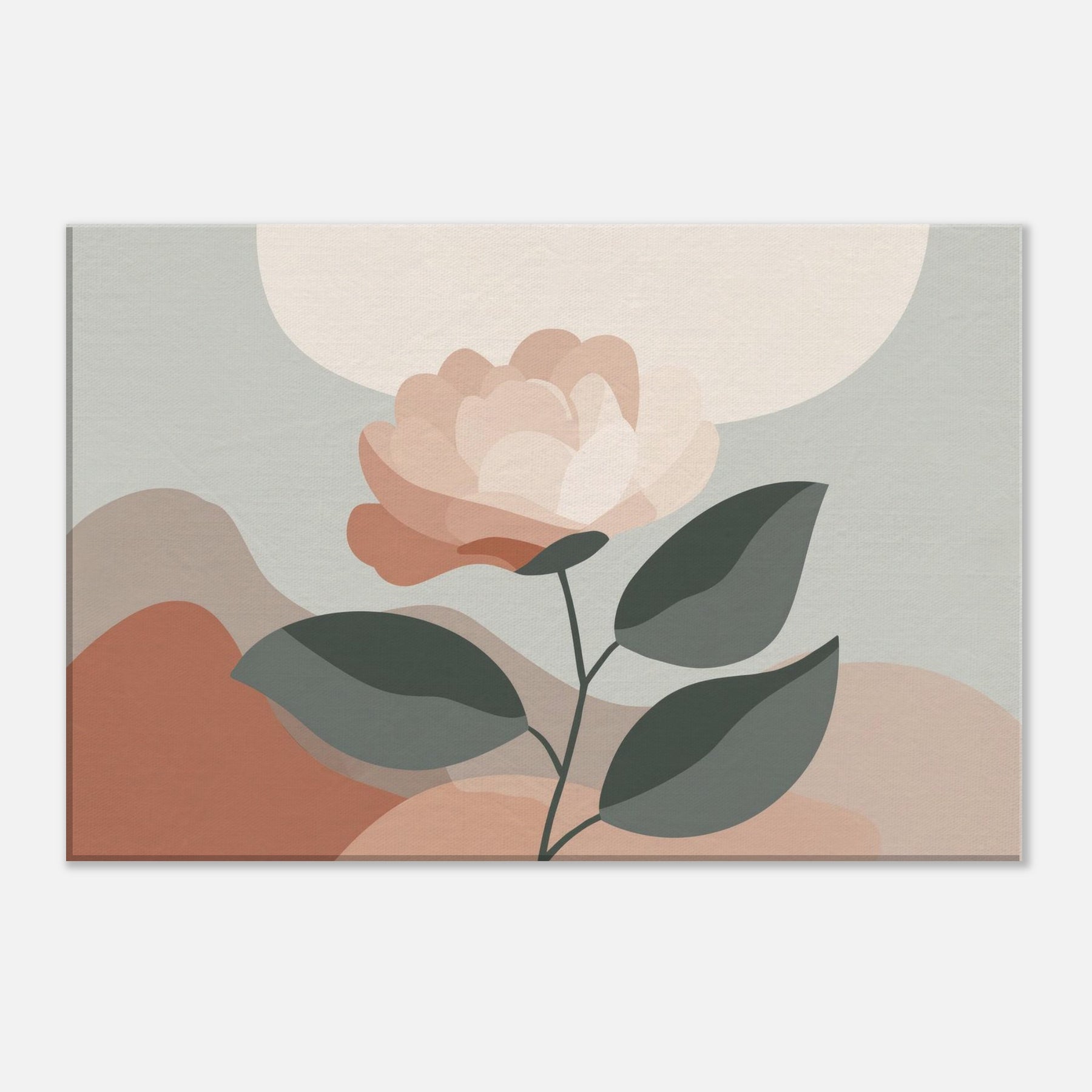 Camellia unfurls with quiet grace in a restrained, modern composition. This minimalist study uses soft, layered petals and muted greens to invite calm and contemplation. The delicate balance between light and shadow creates a subtle depth that breathes with the room, turning a wall into a serene focal point. Mixed textures are suggested through color, while negative space allows the gaze to rest. Ideal for living rooms or bedrooms, it offers warmth, balance, and a daily pause amid busy moments.