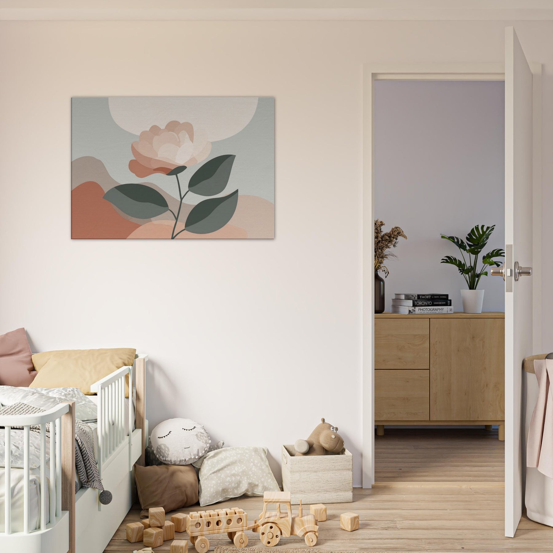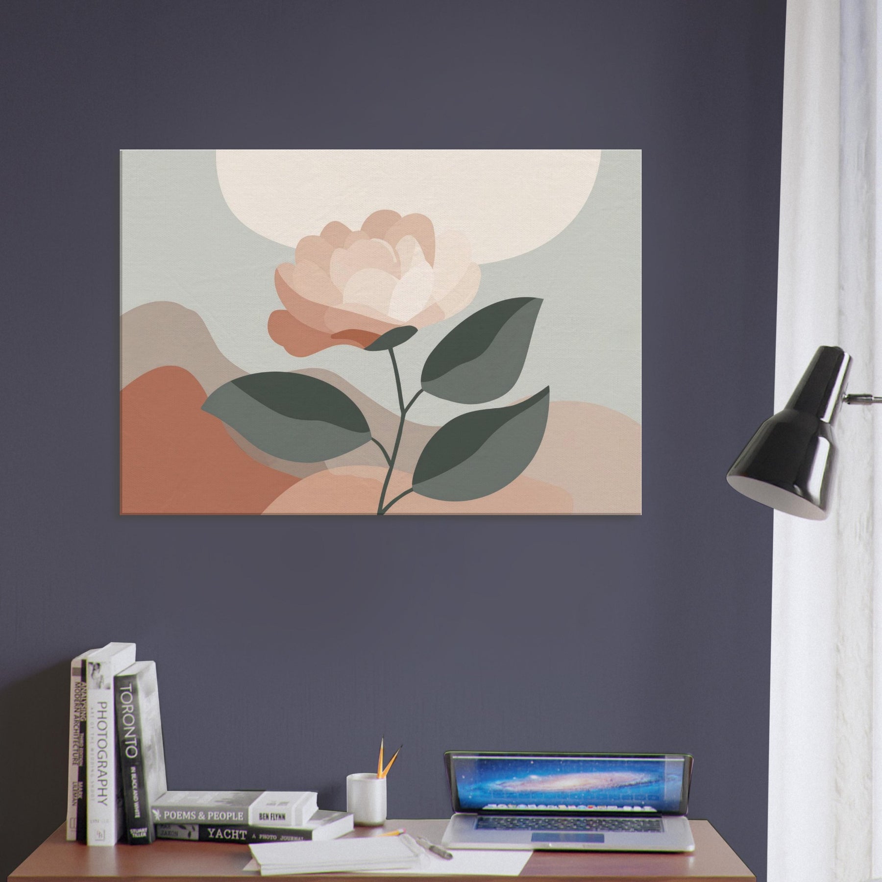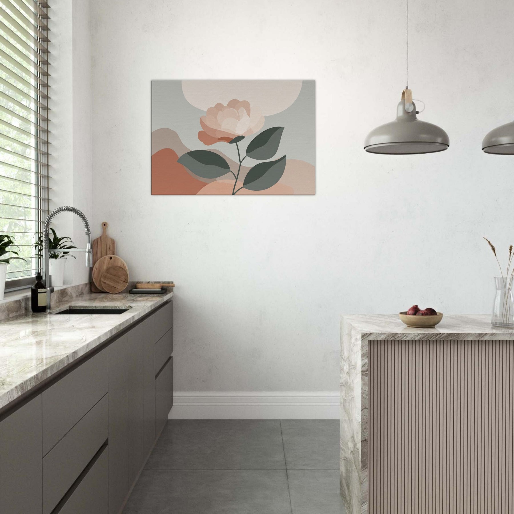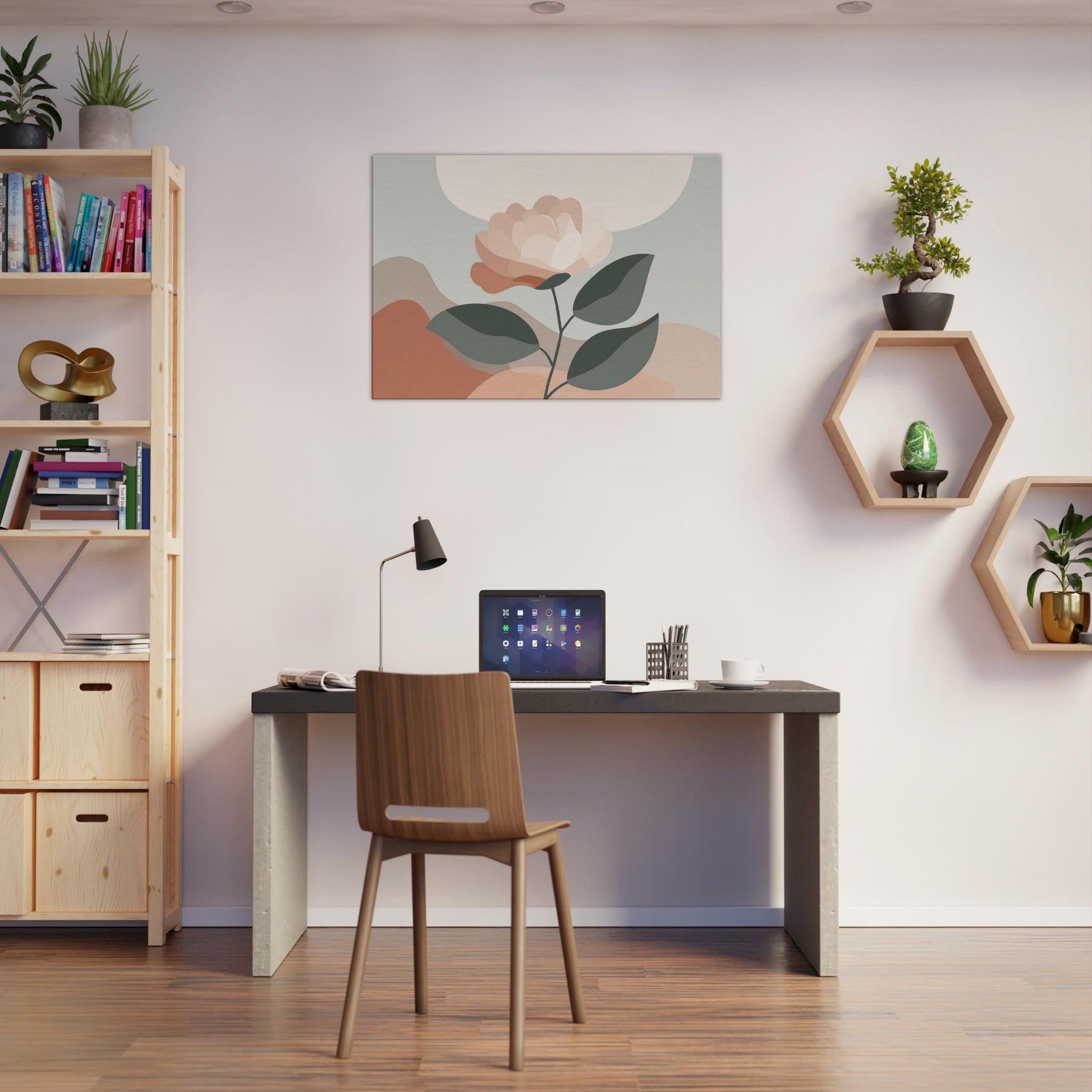 Camellia unfurls with quiet grace in a restrained, modern composition. This minimalist study uses soft, layered petals and muted greens to invite calm and contemplation. The delicate balance between light and shadow creates a subtle depth that breathes with the room, turning a wall into a serene focal point. Mixed textures are suggested through color, while negative space allows the gaze to rest. Ideal for living rooms or bedrooms, it offers warmth, balance, and a daily pause amid busy moments.