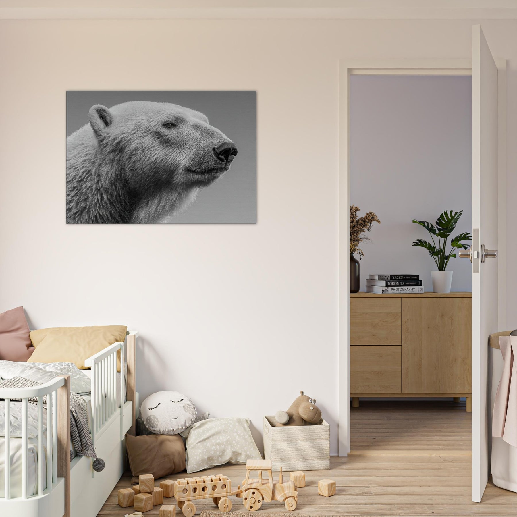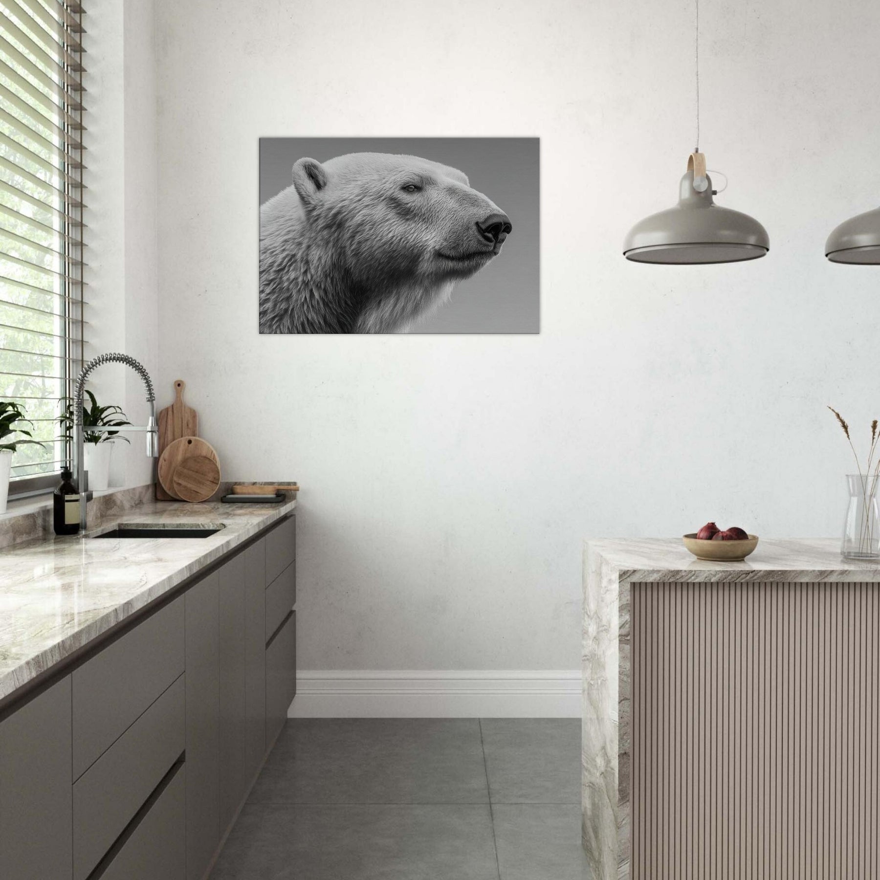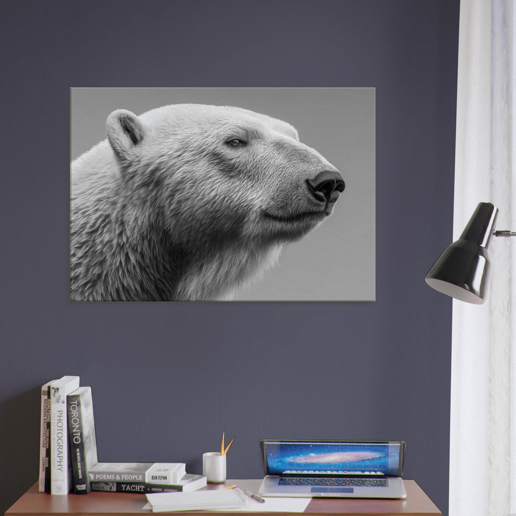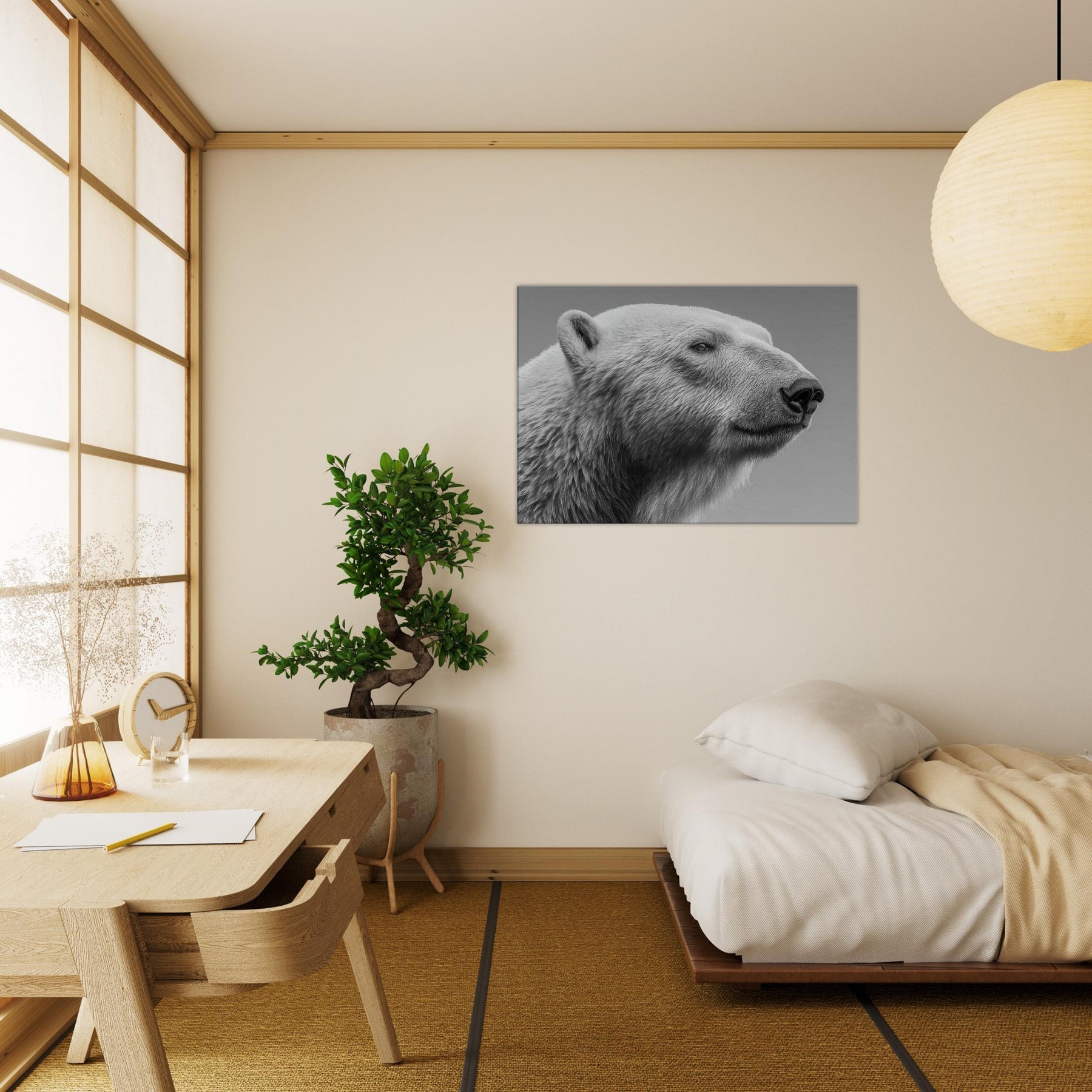 Step closer to the quiet majesty of a Polar Bear rendered in stark black and white. This intimate captures a watchful, serene gaze and the tactile frost of fur, inviting a room to breathe in calm, clarity, and subtle drama. Ideal for a minimalist living space, it pairs with neutrals and metallics, lending sculptural presence and a cool, northern glow that amplifies texture, light, and conversation without shouting.