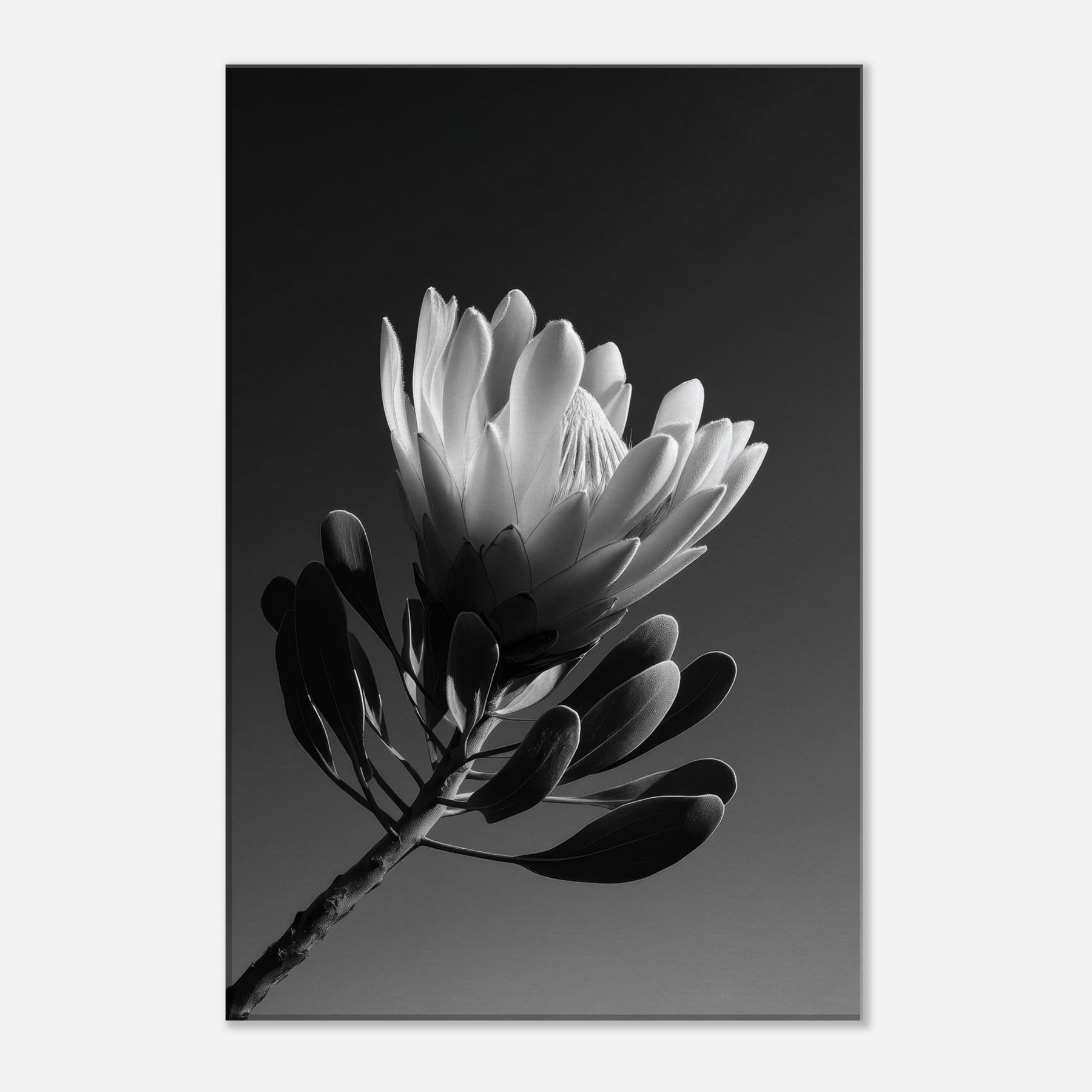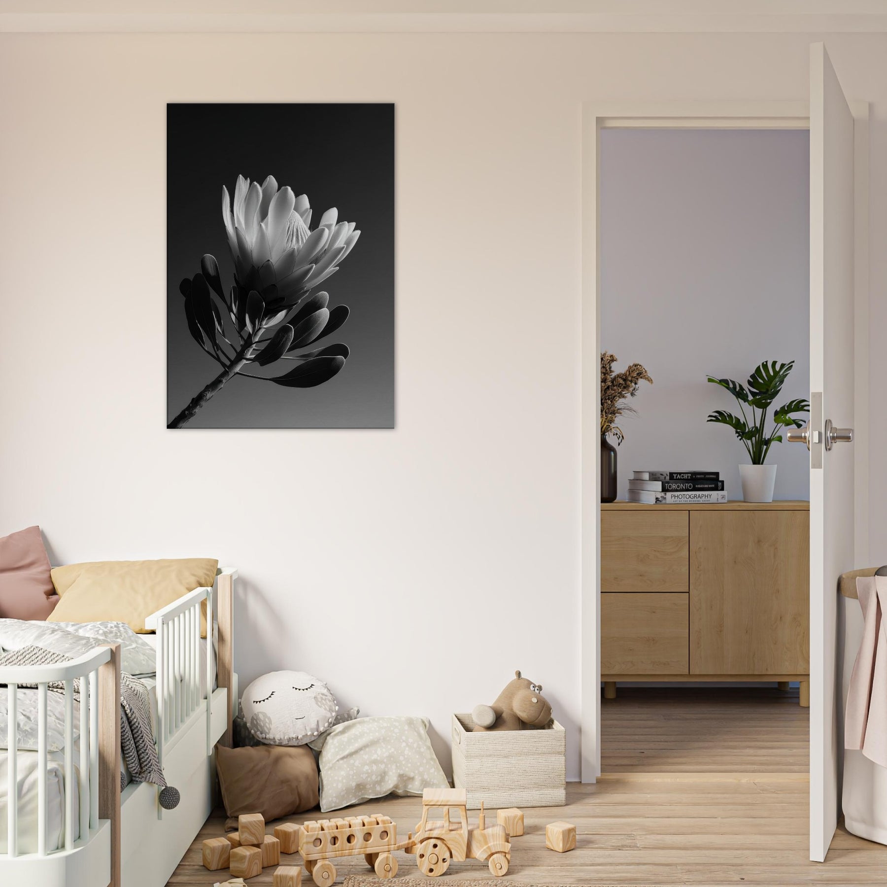 Let this Protea blossom anchor your space with quiet drama. In stark monochrome, the petals glow like porcelain against velvet shadows, every contour captured with a tactile tenderness. The protea's sculptural form invites slow glance and lingering breath, turning a wall into a living scene of nature's resilience. Its rarefied beauty pairs effortlessly with modern furnishings, adding a hint of wild grace to a living room or bedroom calm, sophisticated, and endlessly evocative.