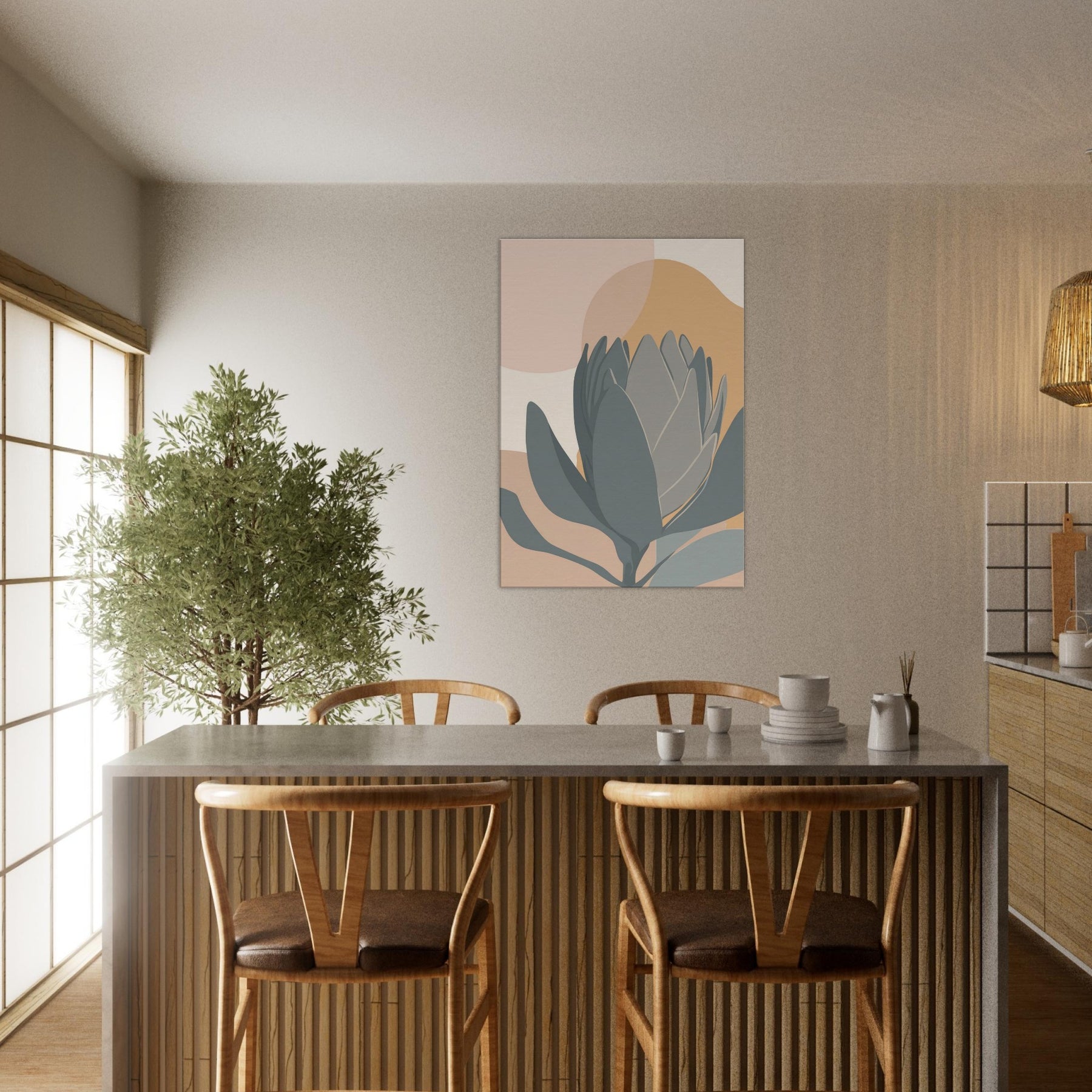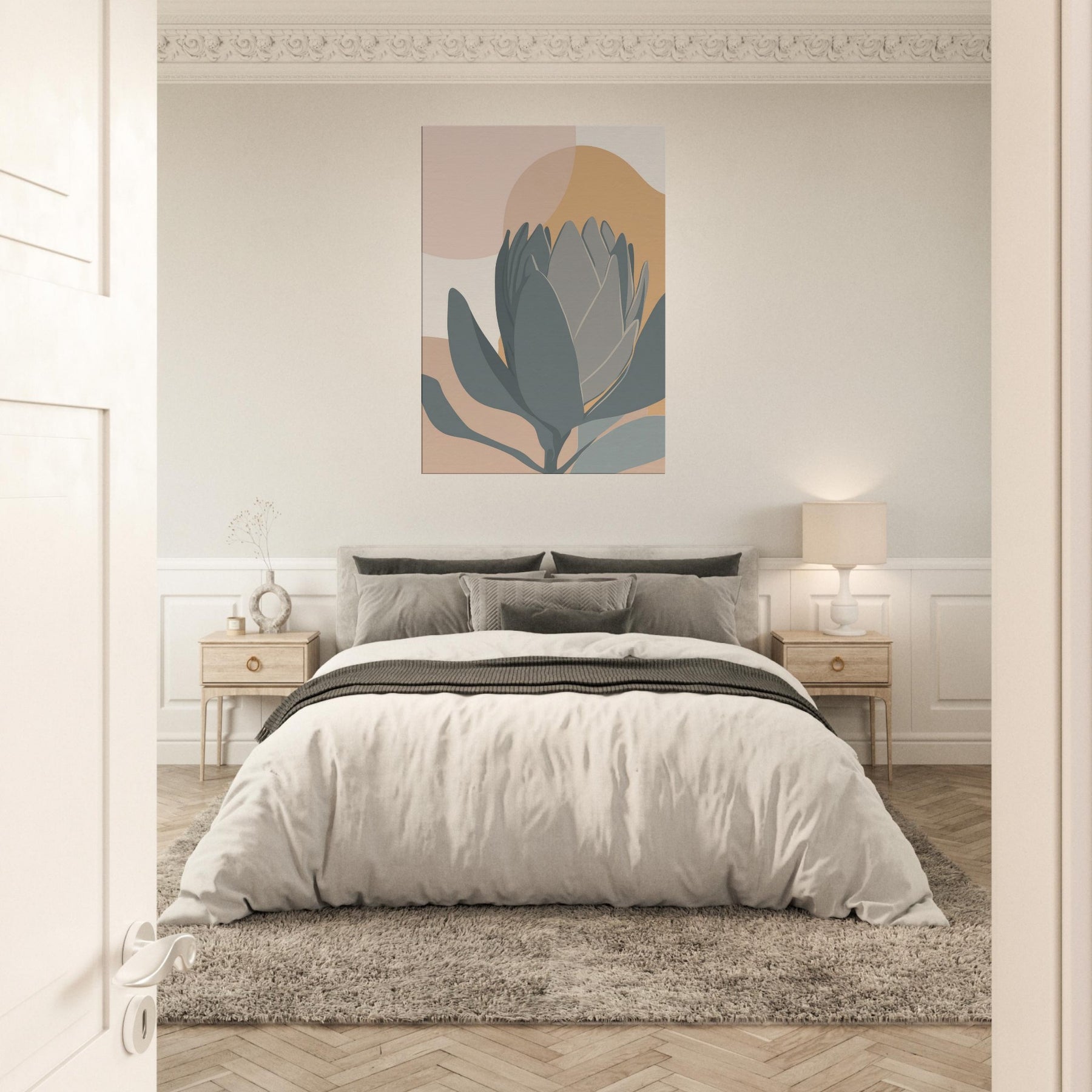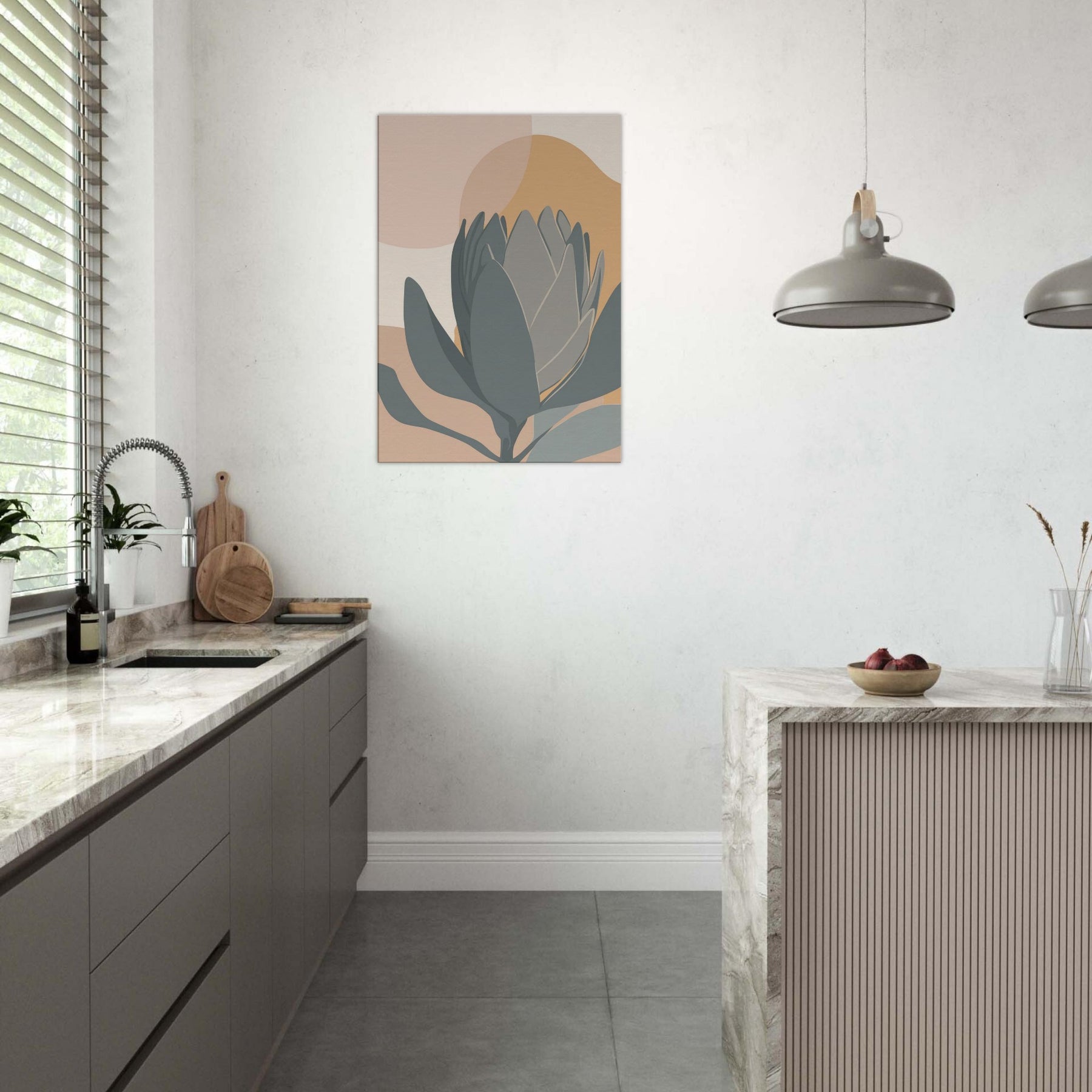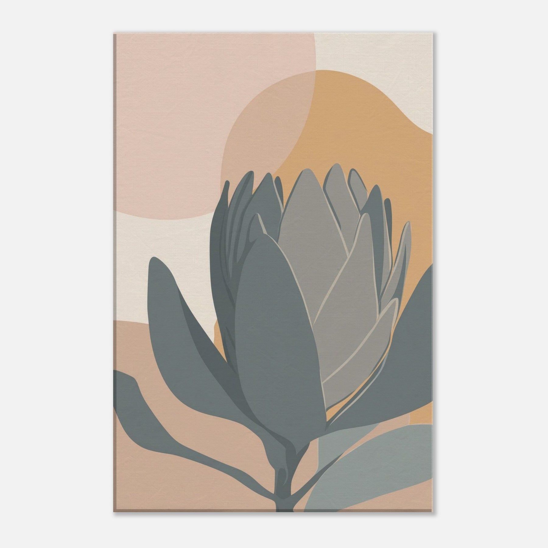 A quiet encounter with a Protea rendered in restrained tones of sage, slate, and sandy peach. The composition folds soft ovals and curved petals into a serene horizon, inviting calm and contemplation. This minimalist study breathes warmth into a living room, pairing earthy hues with clean lines to soften walls, carpets, and light. It holds a moment of stillness, a botanical whisper, perfect for spaces seeking subtle elegance.