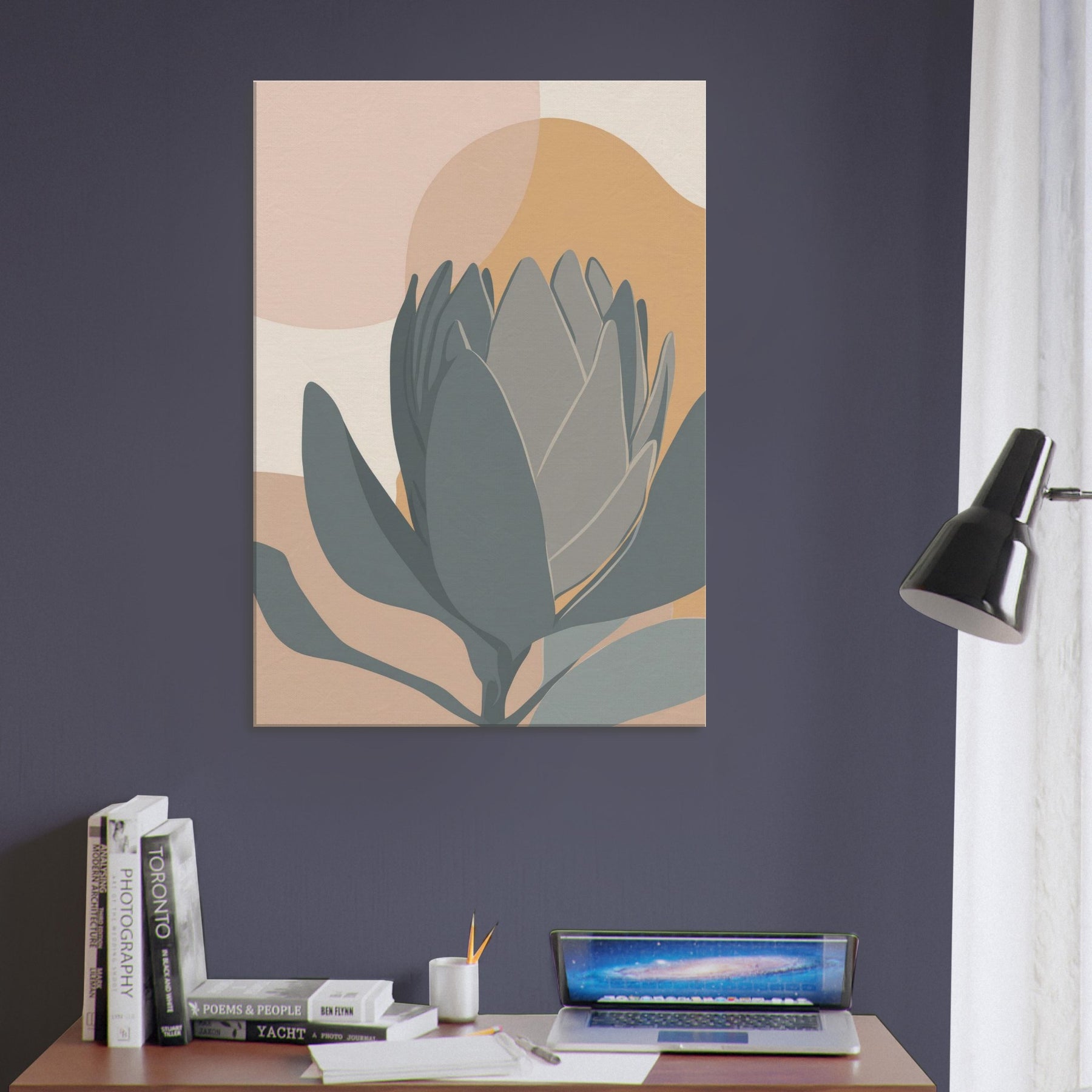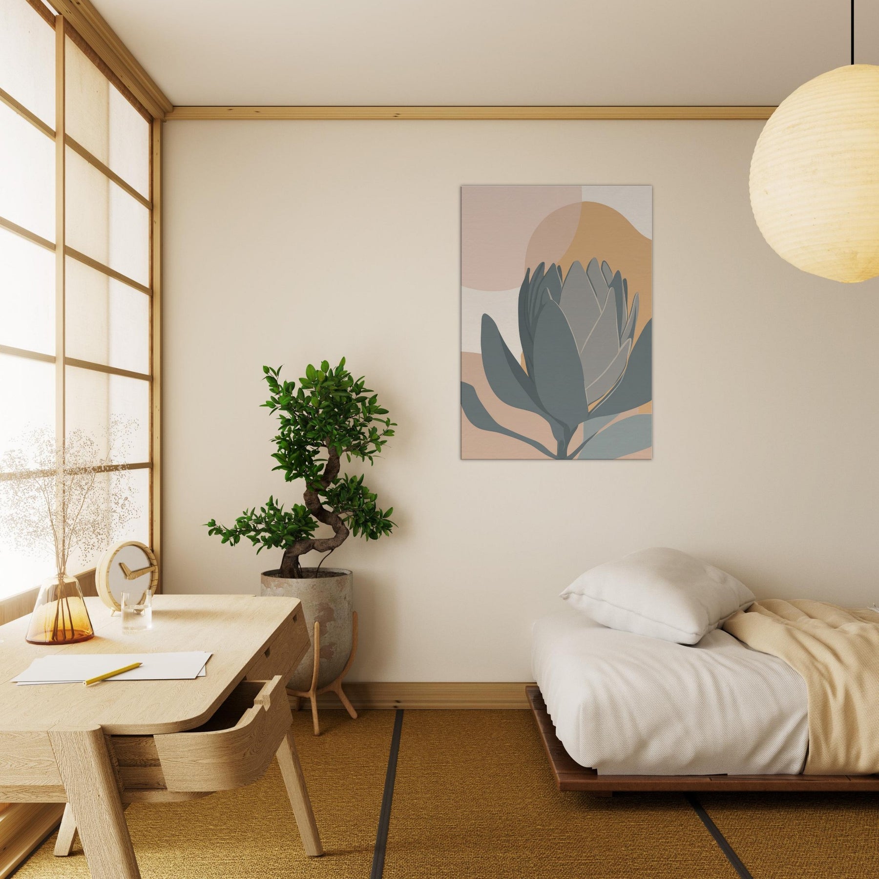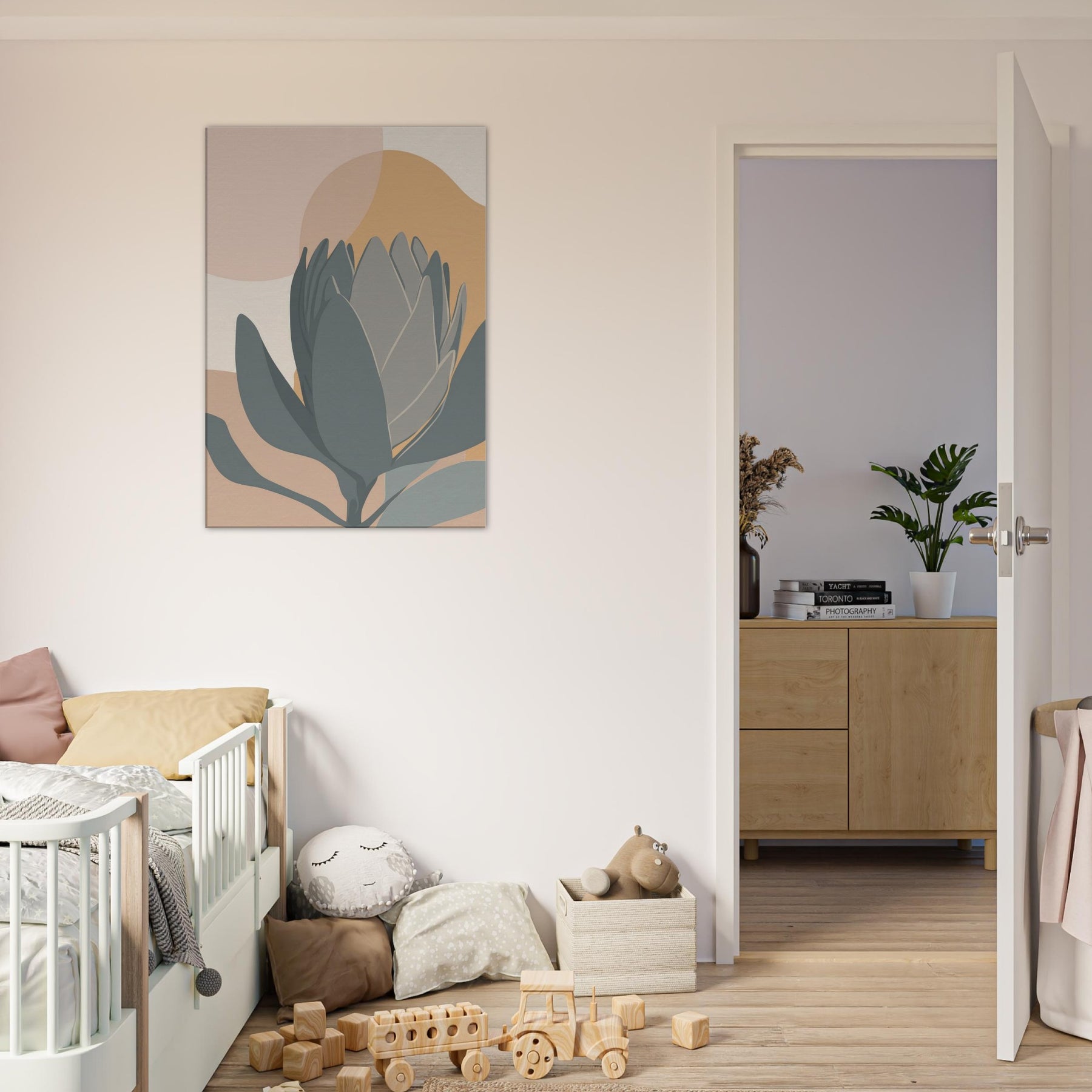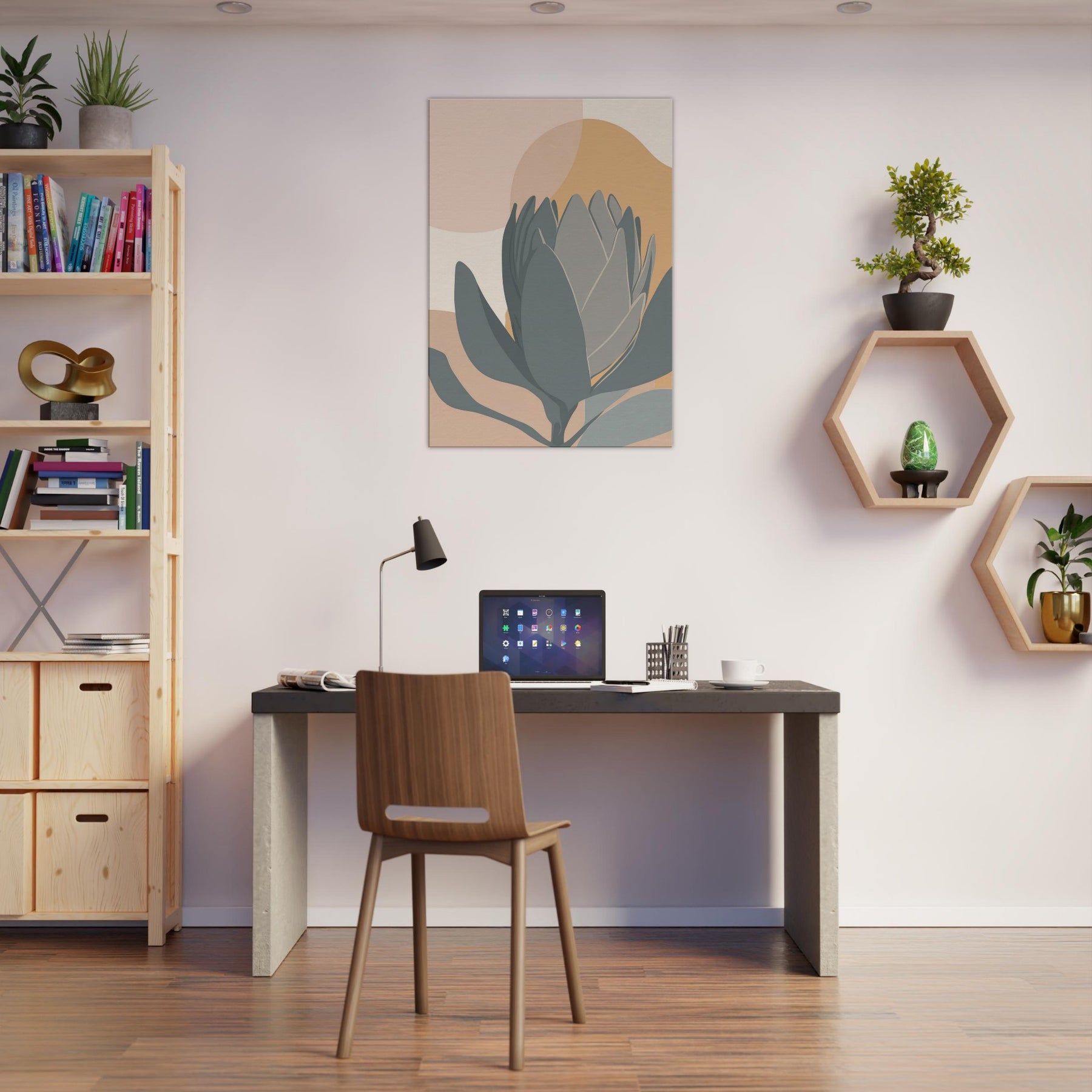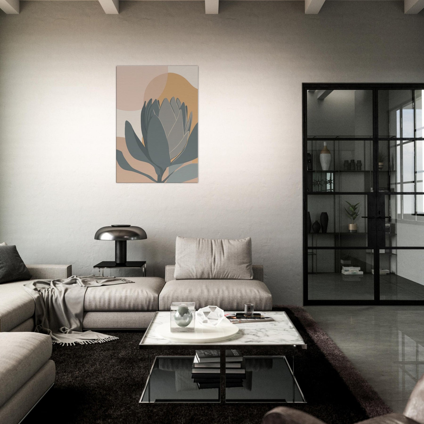 A quiet encounter with a Protea rendered in restrained tones of sage, slate, and sandy peach. The composition folds soft ovals and curved petals into a serene horizon, inviting calm and contemplation. This minimalist study breathes warmth into a living room, pairing earthy hues with clean lines to soften walls, carpets, and light. It holds a moment of stillness, a botanical whisper, perfect for spaces seeking subtle elegance.