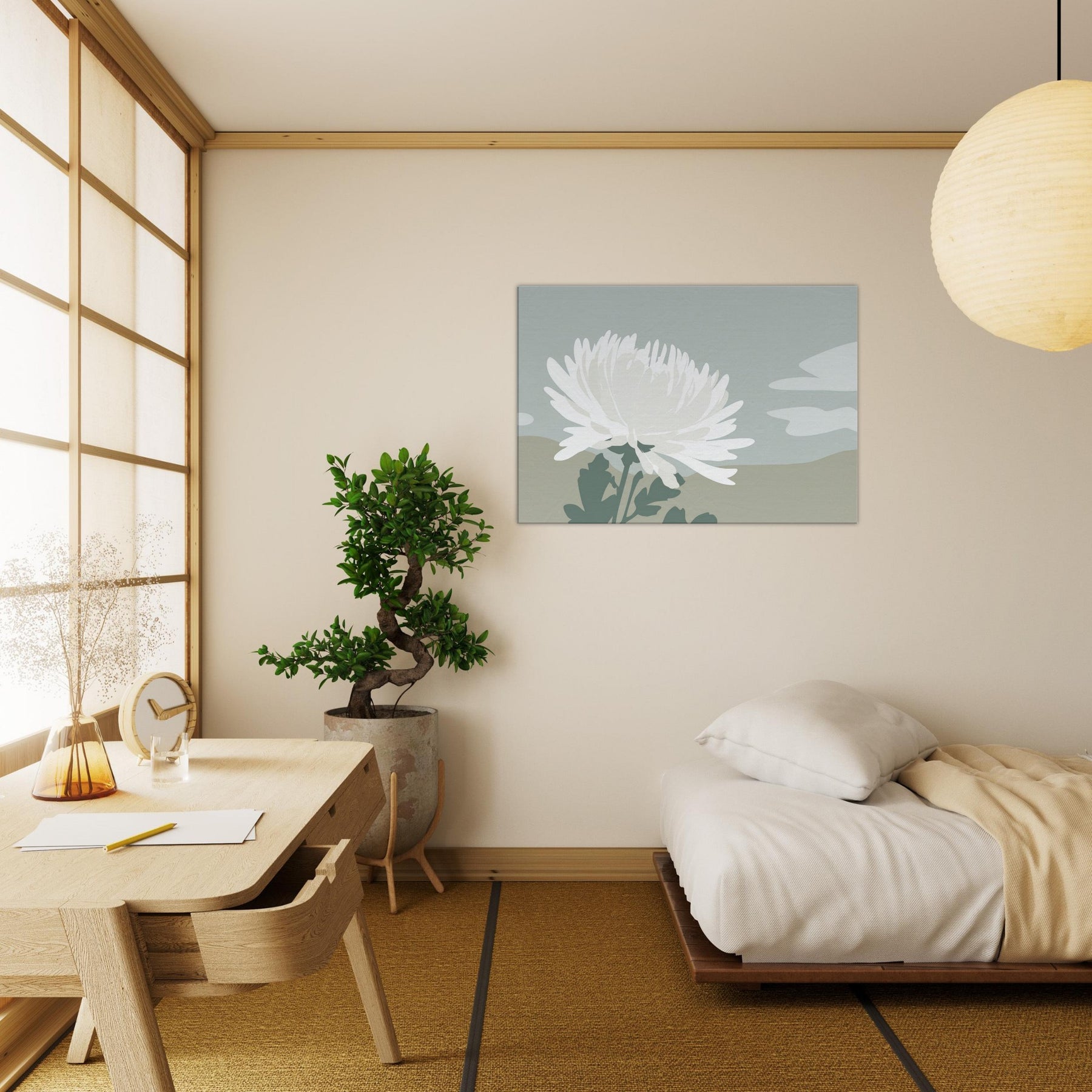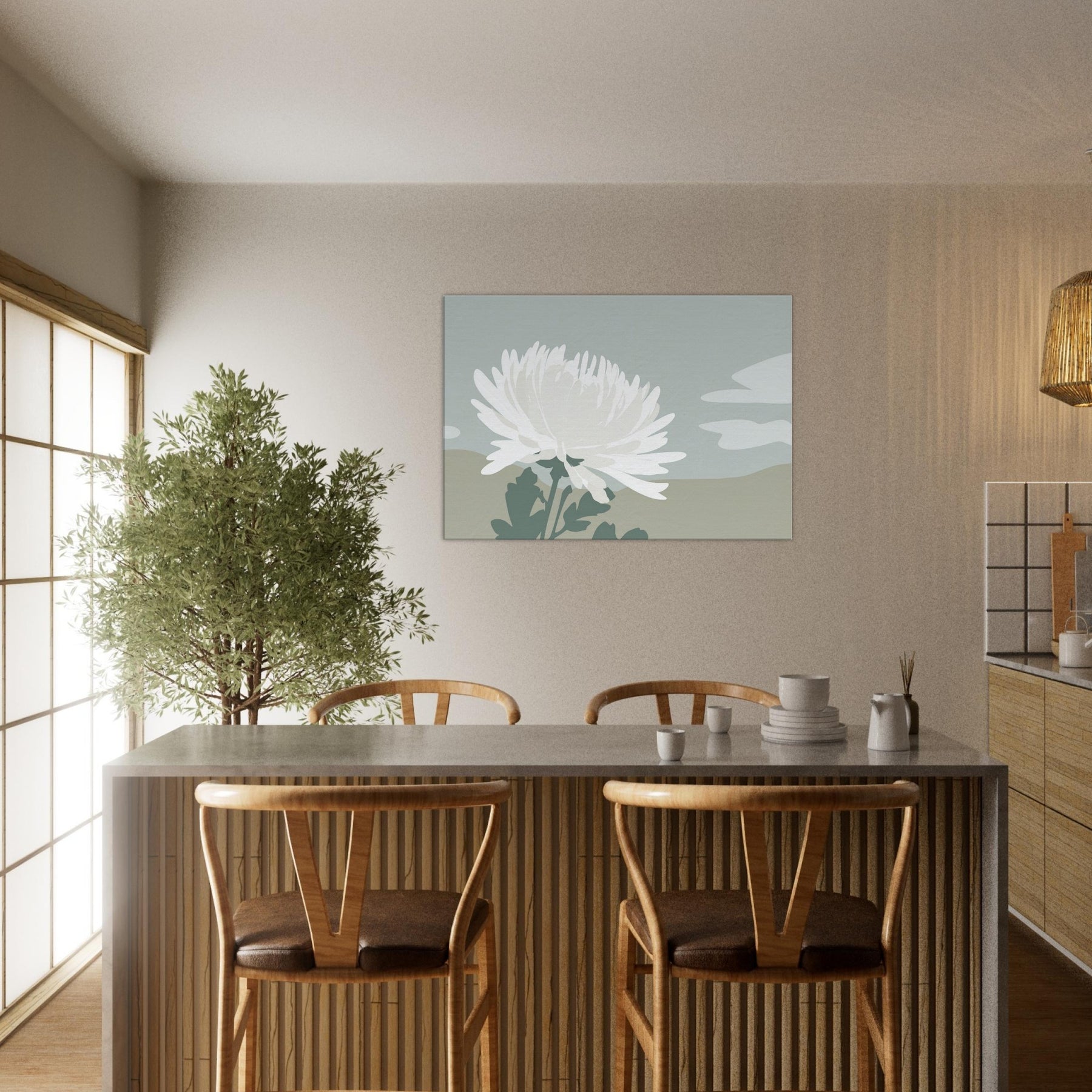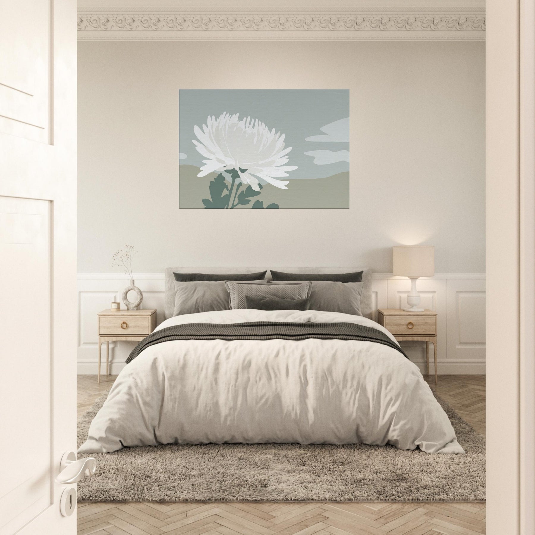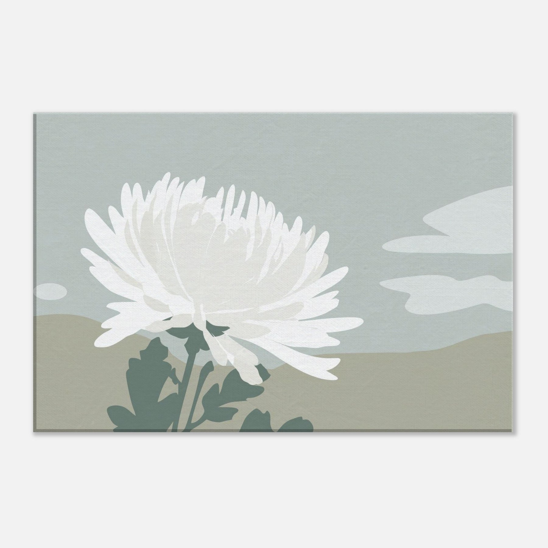 In this pared down Chrysanthemum, a single white blossom rises against tranquil dunes of muted sage and sand. The composition breathes with quiet space, inviting calm and contemplation as light shifts along the petals. Its minimalist language translates a moment of garden stillness into a wall moment, turning everyday walls into a sanctuary. Let the soft, tactile tones and airy silhouette mood you into mindful living a graceful accent that complements neutral furnishings and creates space to breathe.