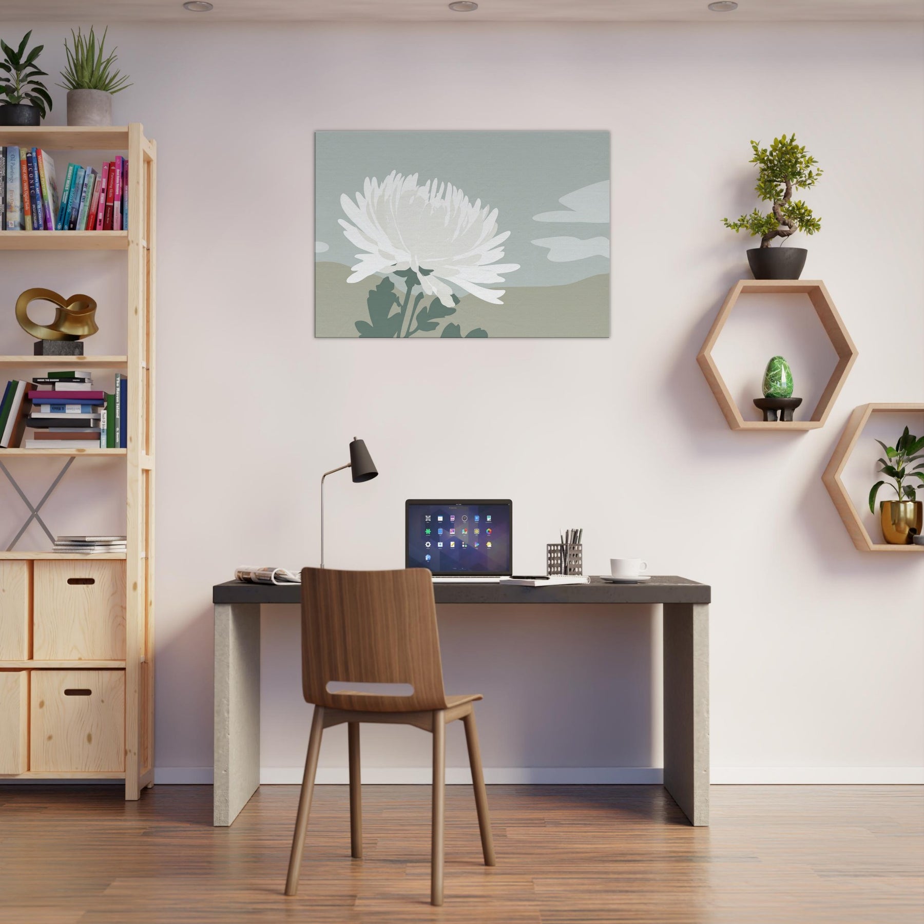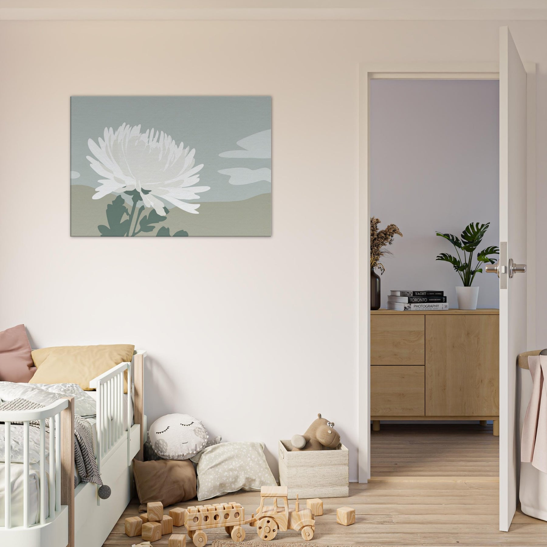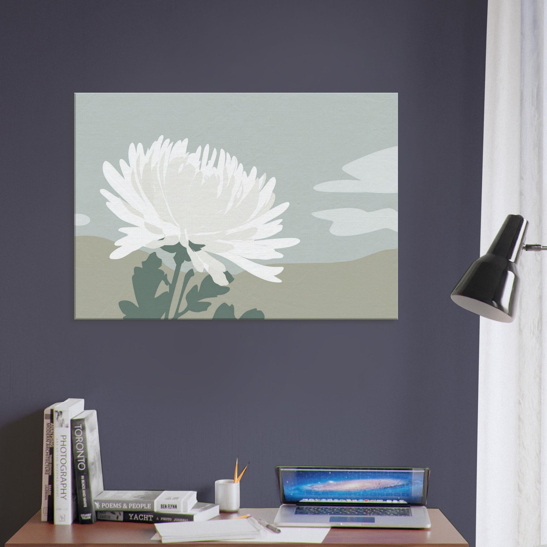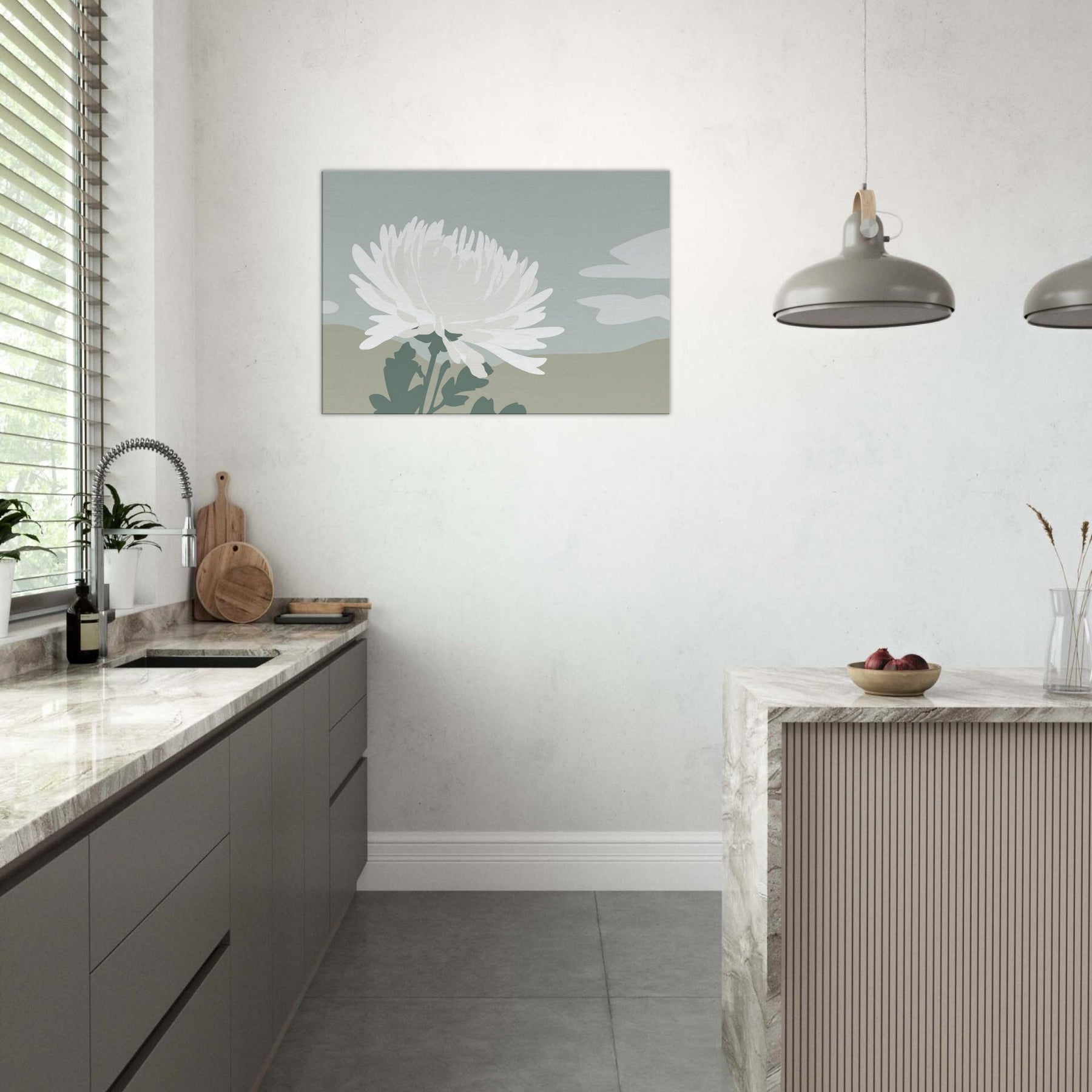 In this pared down Chrysanthemum, a single white blossom rises against tranquil dunes of muted sage and sand. The composition breathes with quiet space, inviting calm and contemplation as light shifts along the petals. Its minimalist language translates a moment of garden stillness into a wall moment, turning everyday walls into a sanctuary. Let the soft, tactile tones and airy silhouette mood you into mindful living a graceful accent that complements neutral furnishings and creates space to breathe.