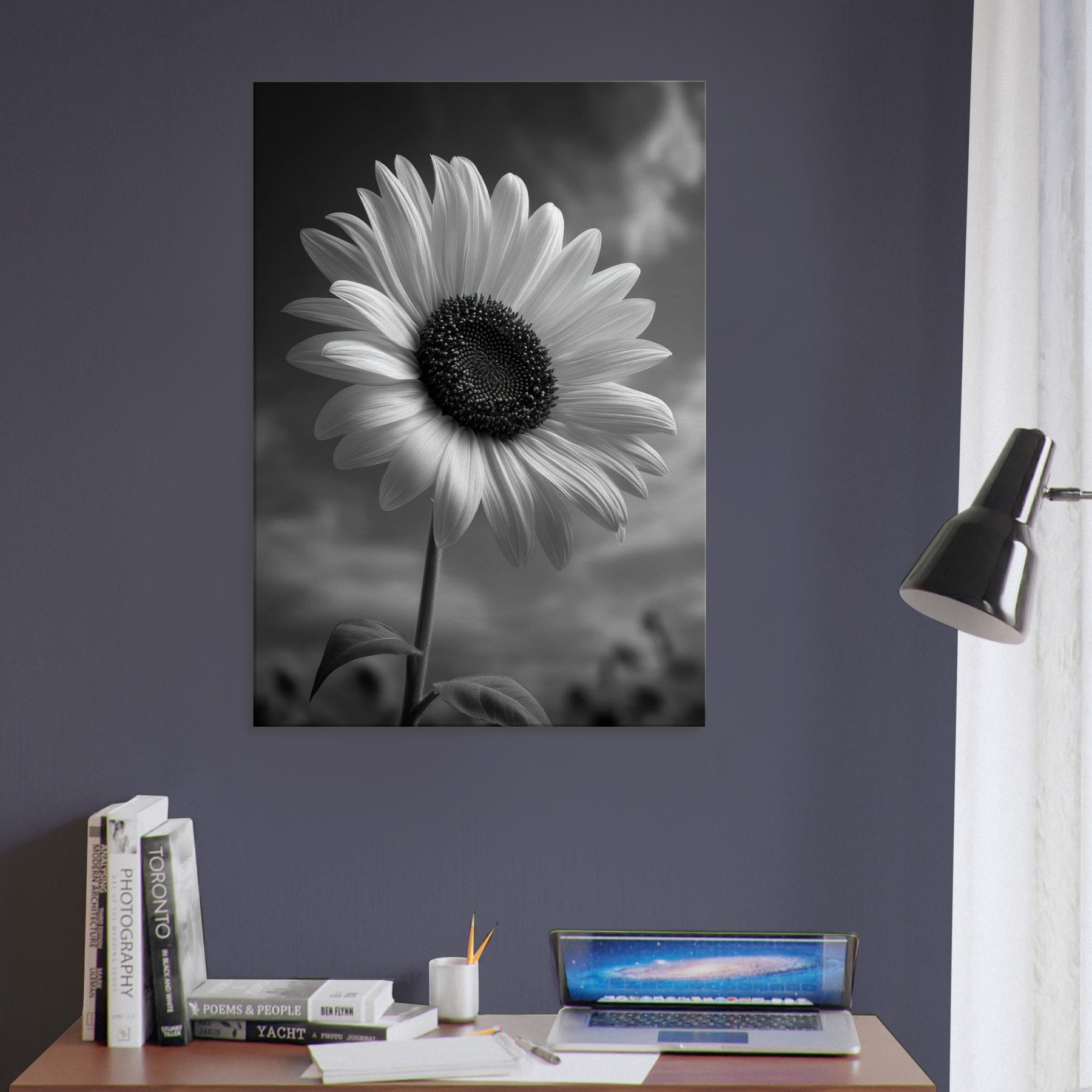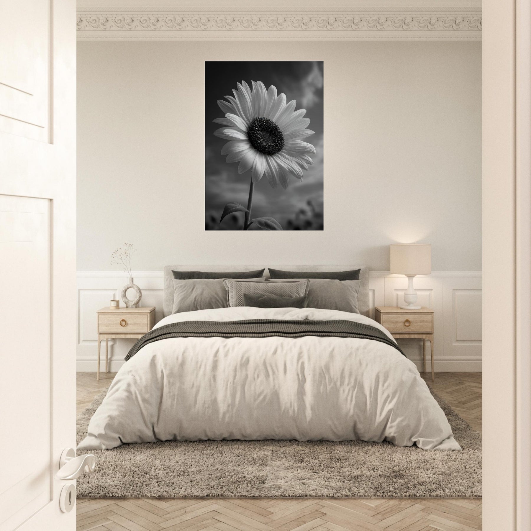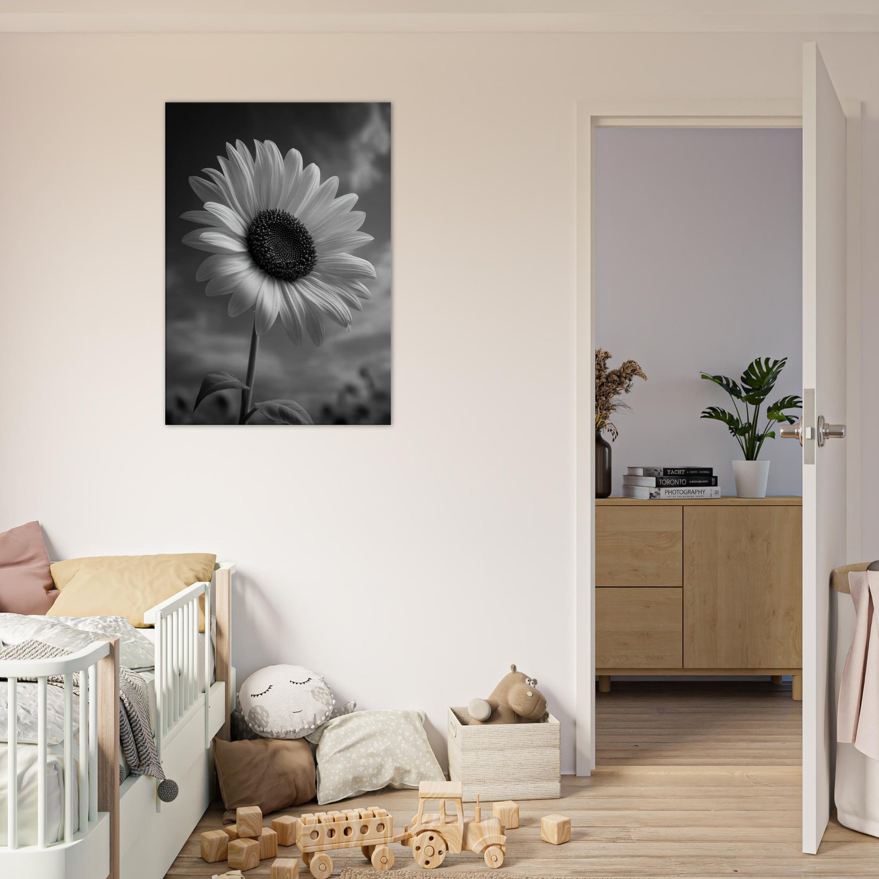 Sunflower, captured in grayscale, slows the room’s tempo to a whisper. The sunflower’s bold center anchors the composition, while the pale petals radiate a quiet light that never fades. Rendered in black and white, the image reveals texture and depth, inviting touch and contemplation.
