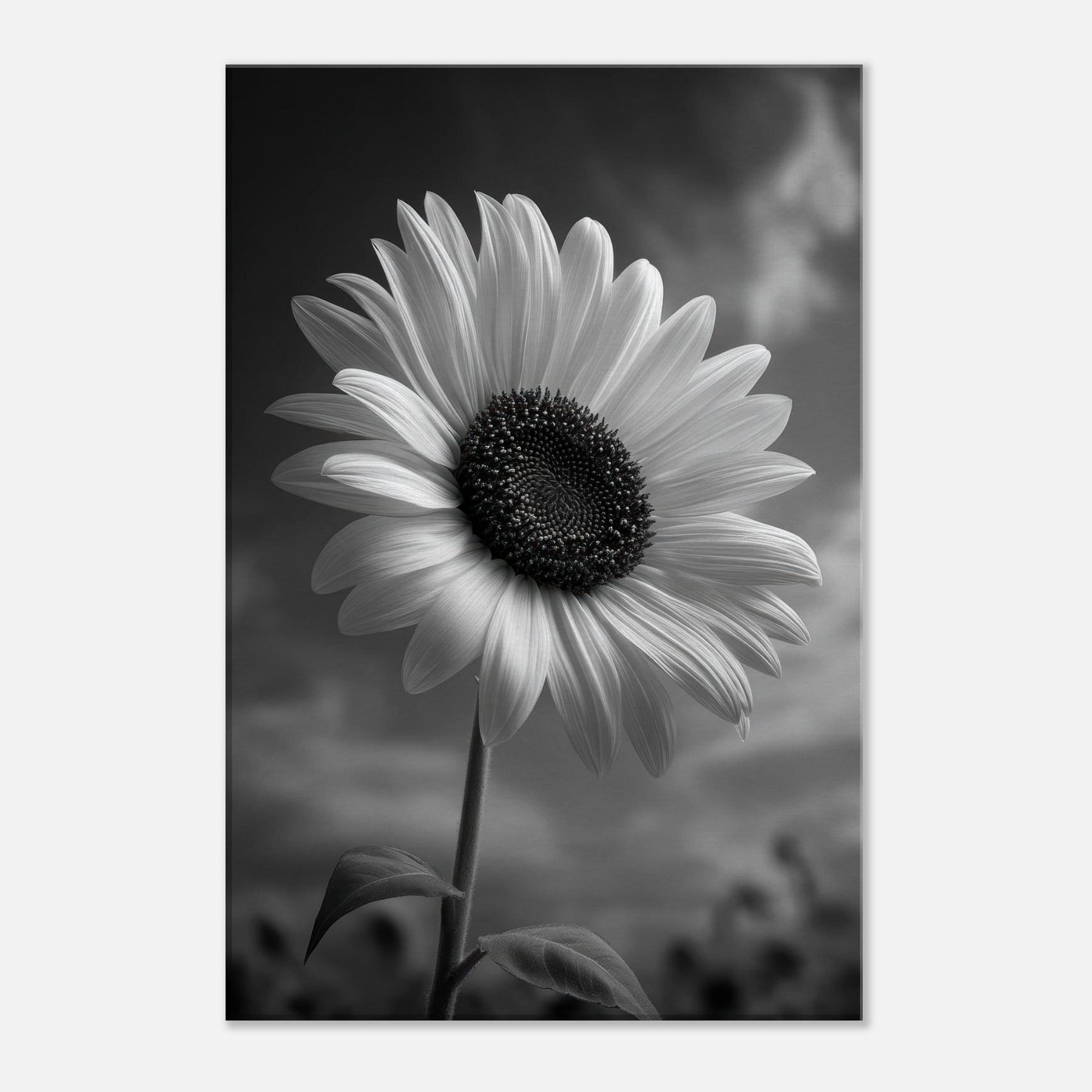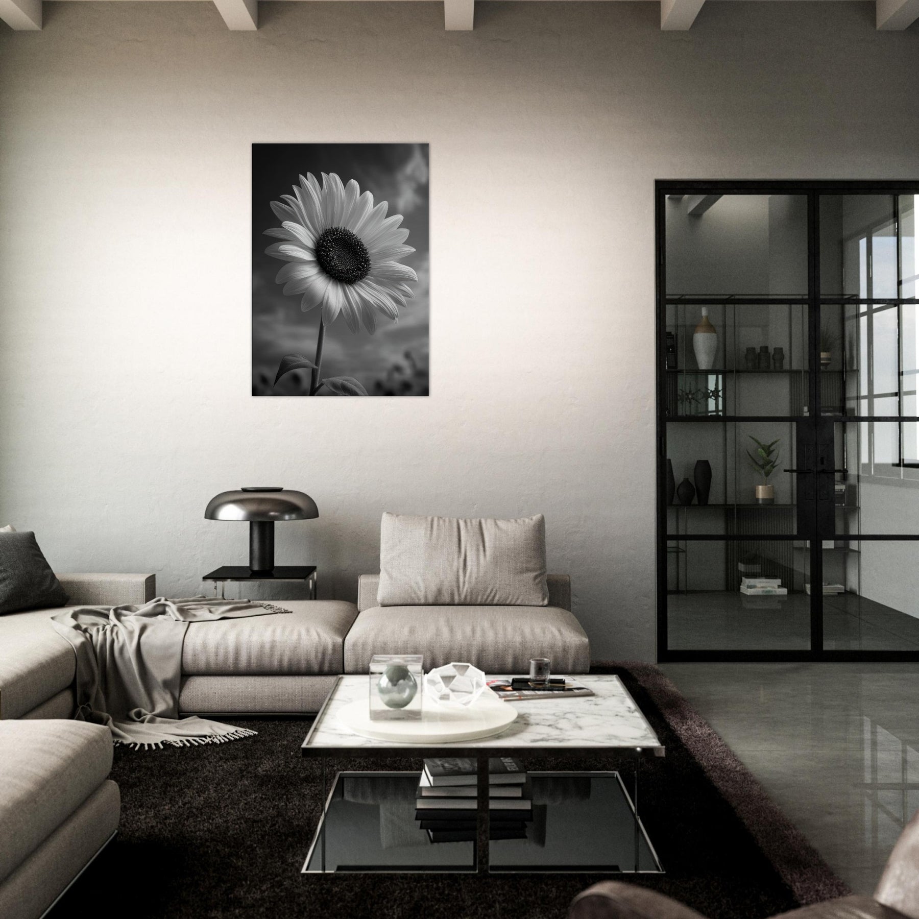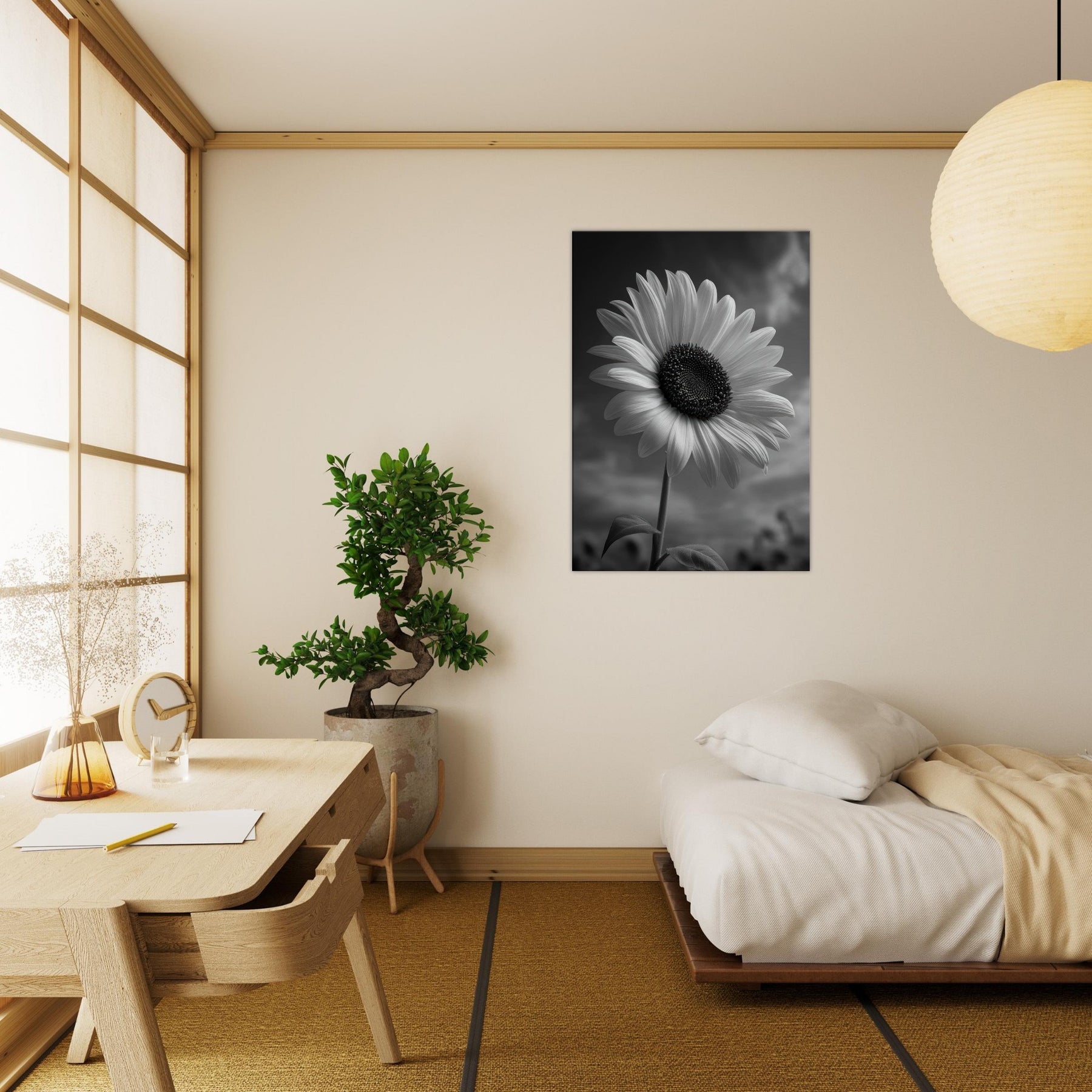 Sunflower, captured in grayscale, slows the room’s tempo to a whisper. The sunflower’s bold center anchors the composition, while the pale petals radiate a quiet light that never fades. Rendered in black and white, the image reveals texture and depth, inviting touch and contemplation.