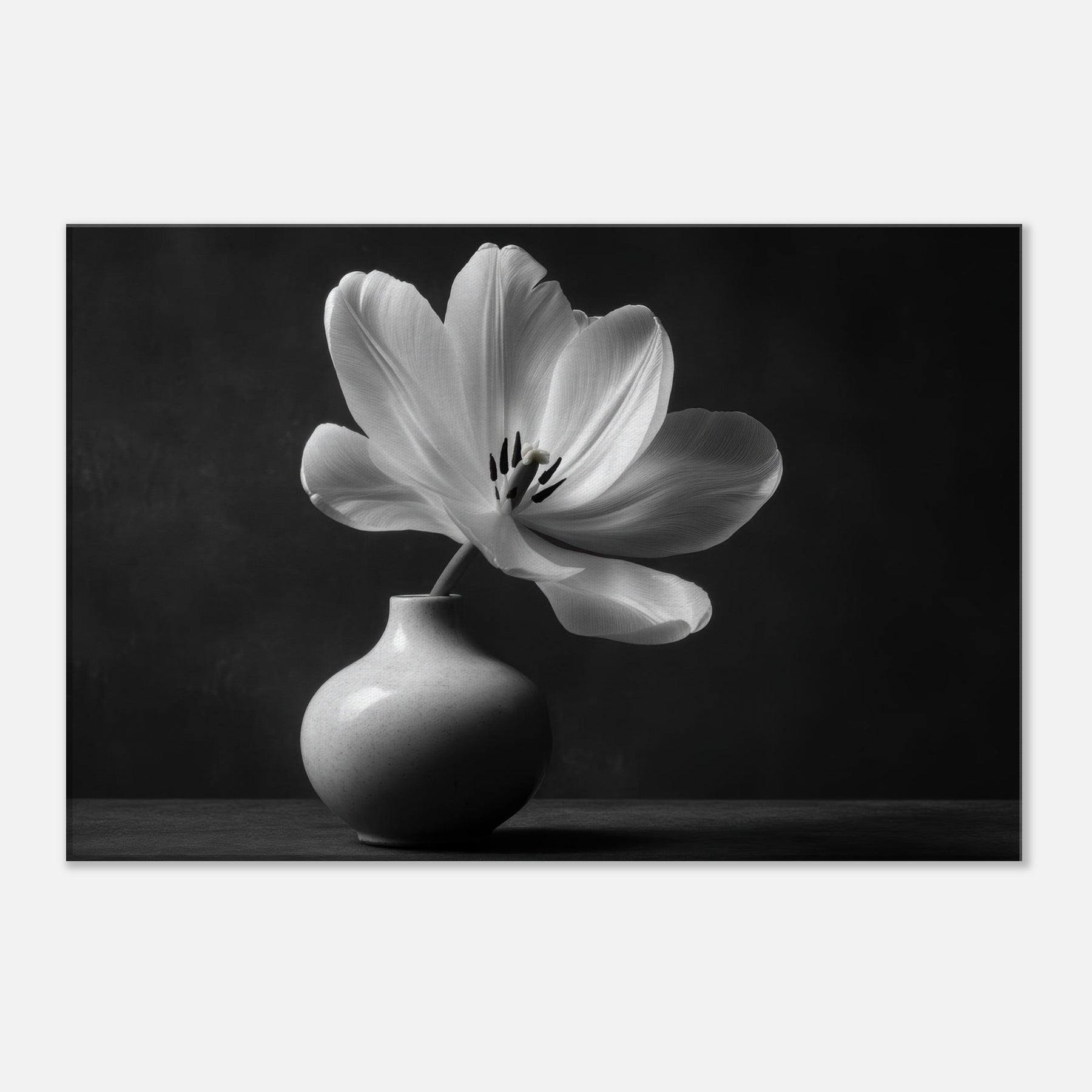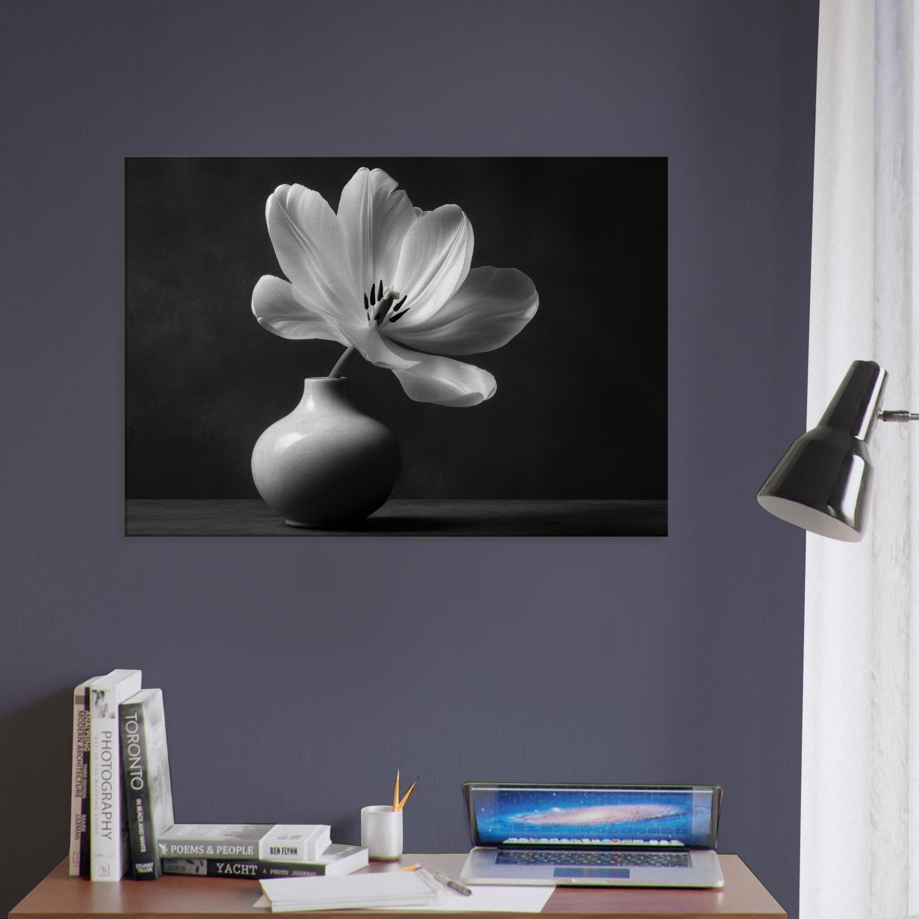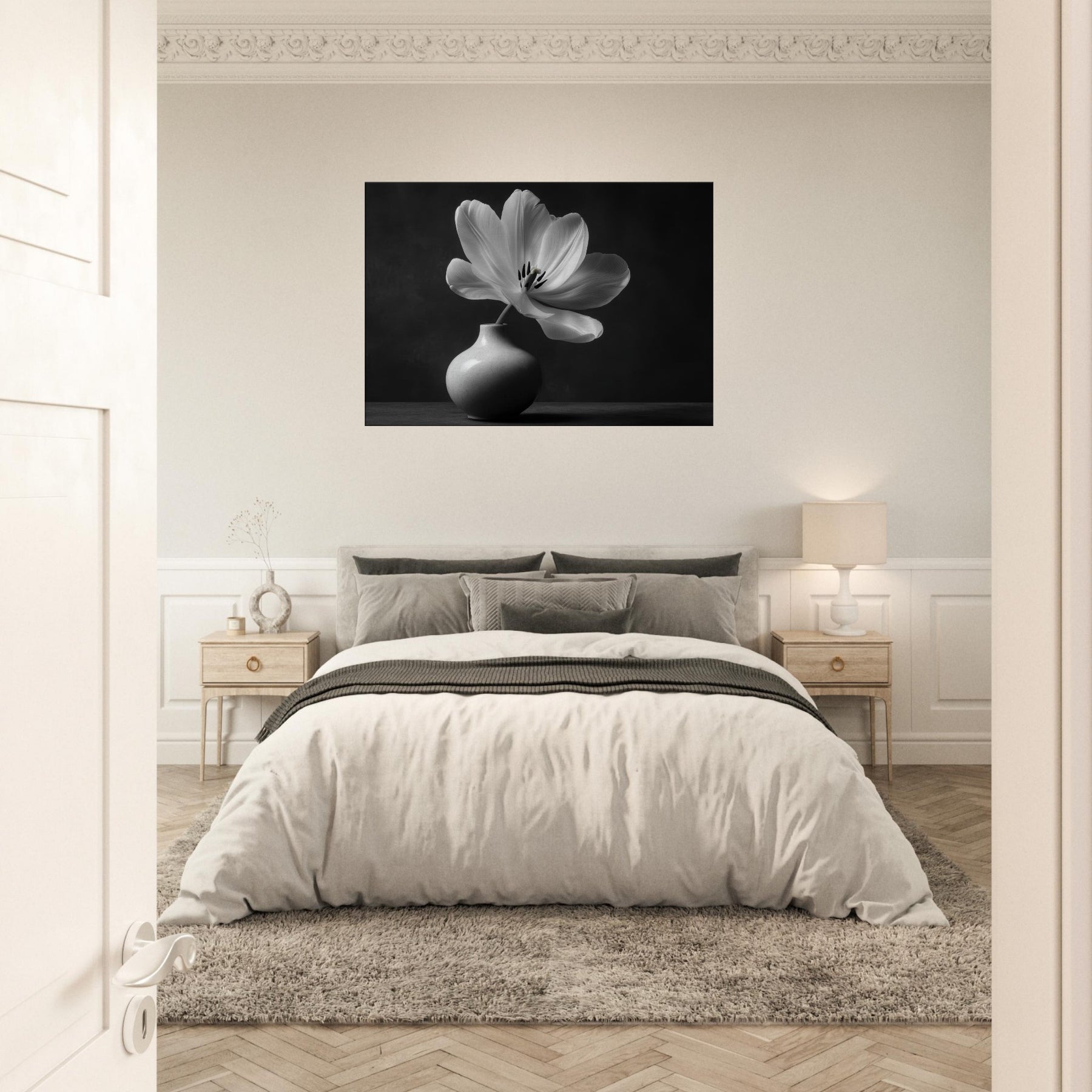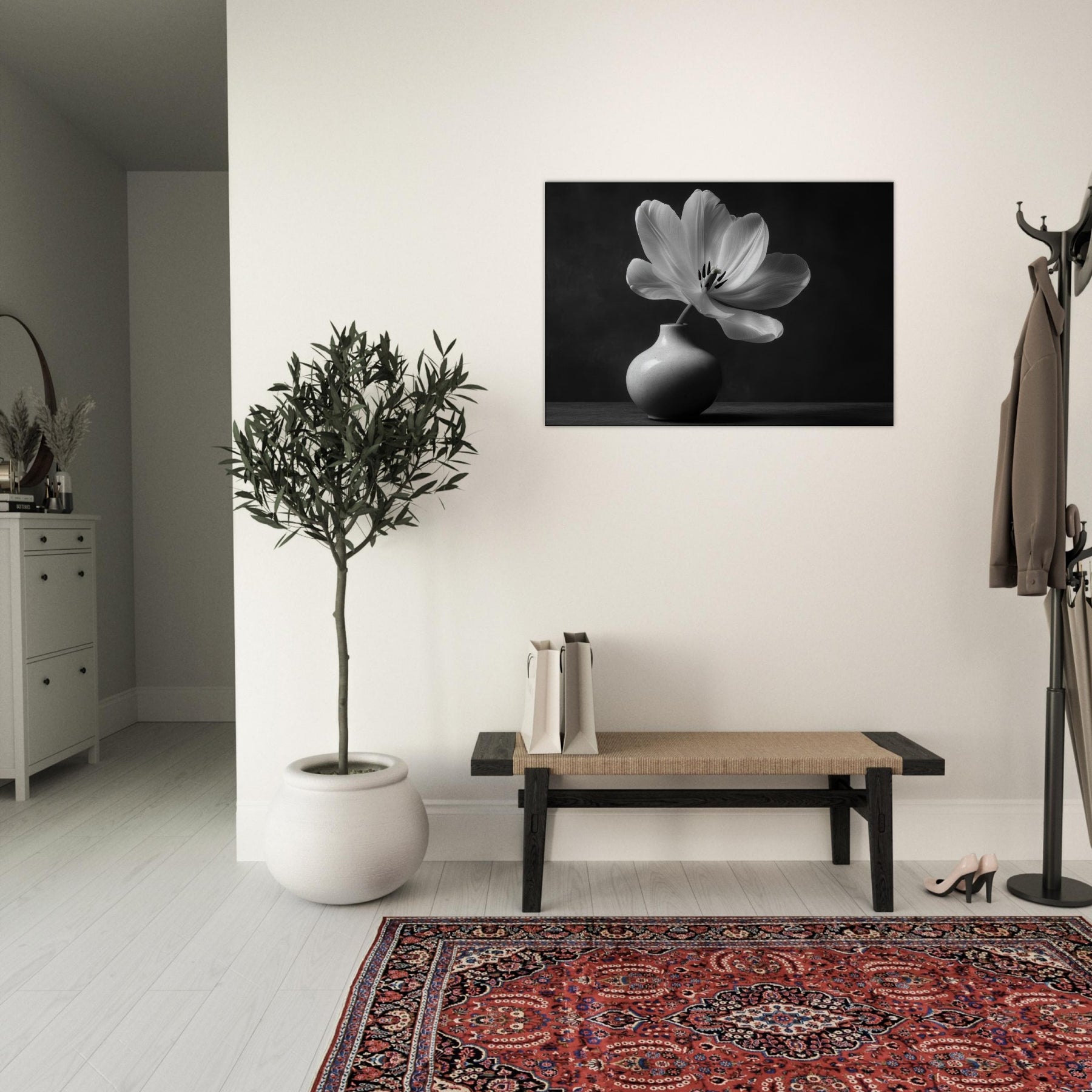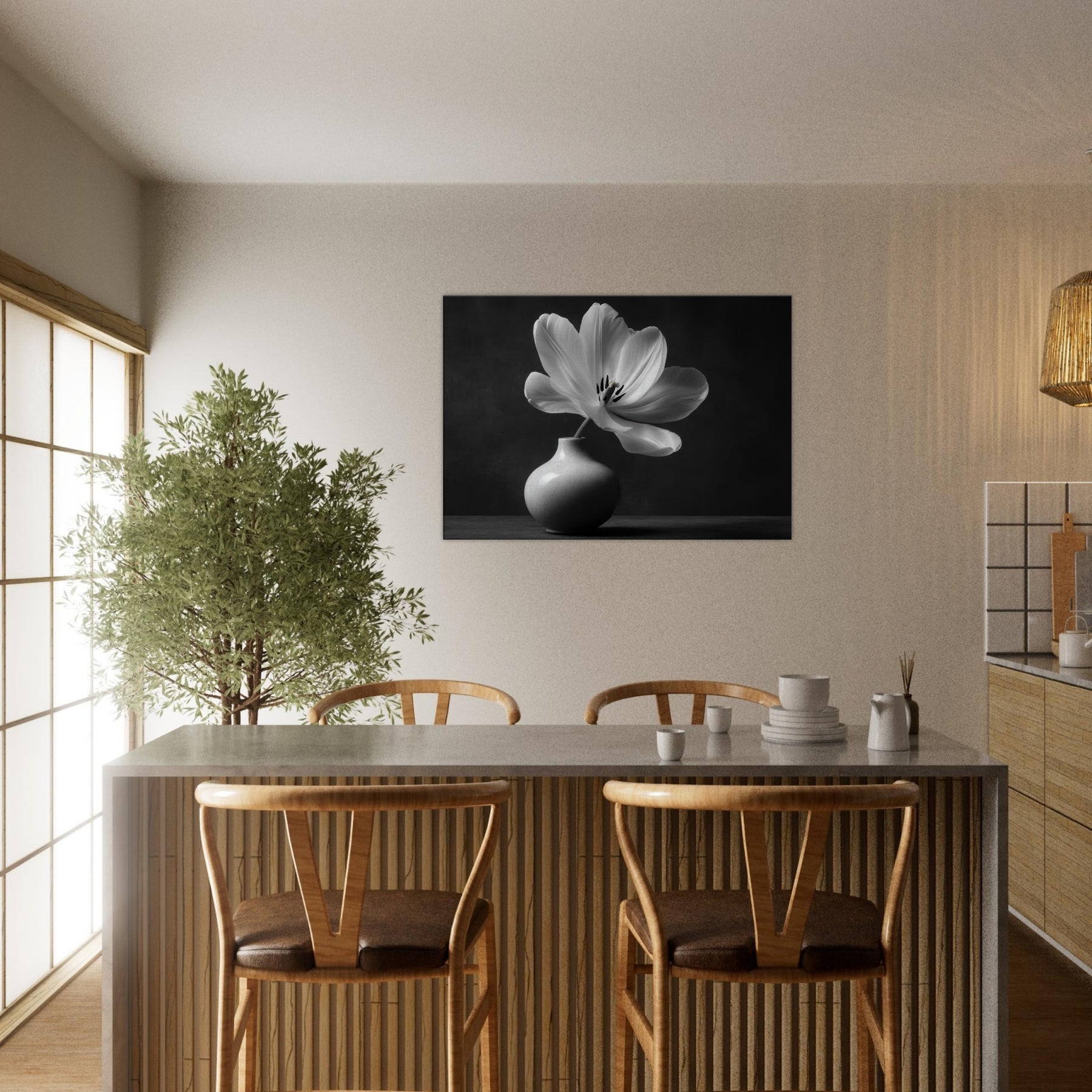 An arresting study in form and restraint, this black and white photograph radiates quiet grace. The Single Flower In Vase hovers against deep shadow, its petals rendered with tactile precision and a pale glow along the edges. The composition invites a slow, contemplative gaze, transforming a simple still life into a meditation on balance, memory, and presence. Perfect for a serene living room or office, it brings a sculptural calm and luminous contrast to the space.
