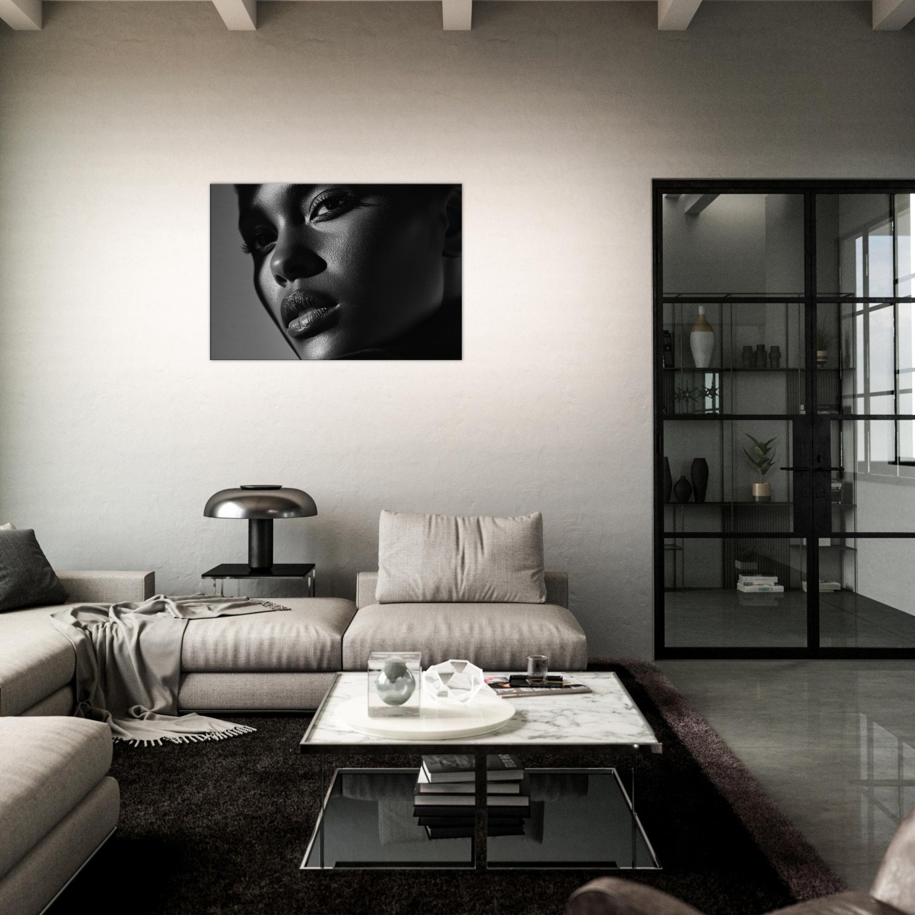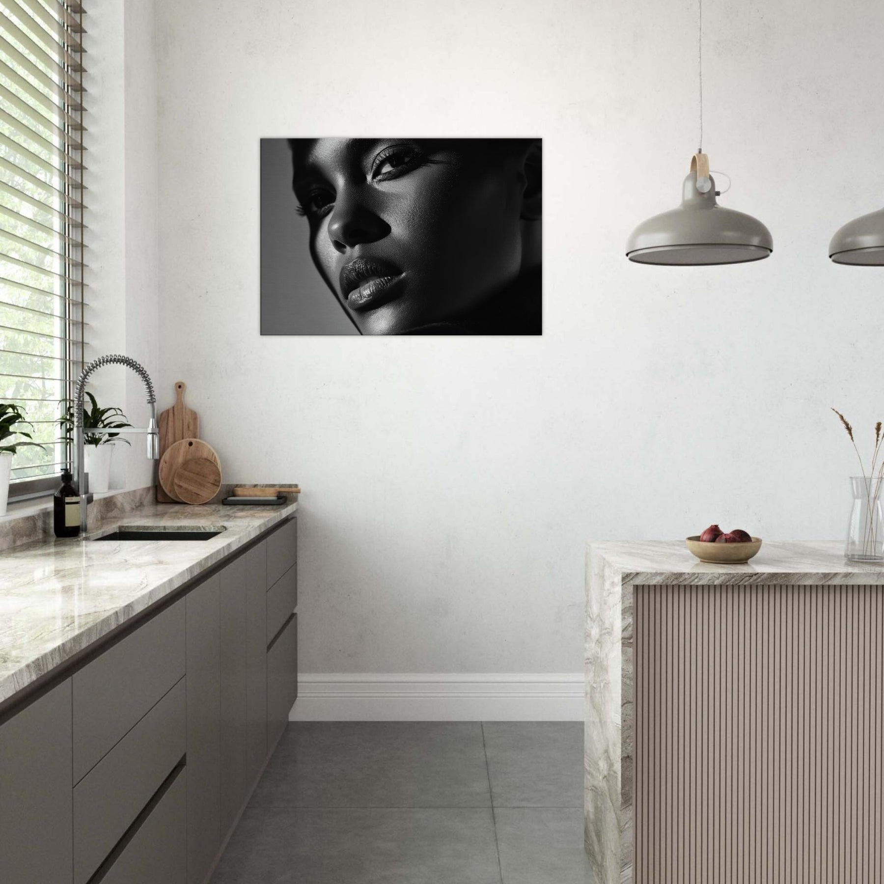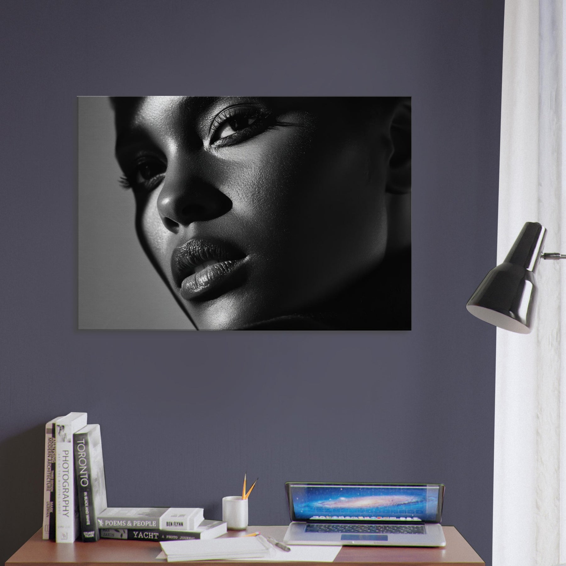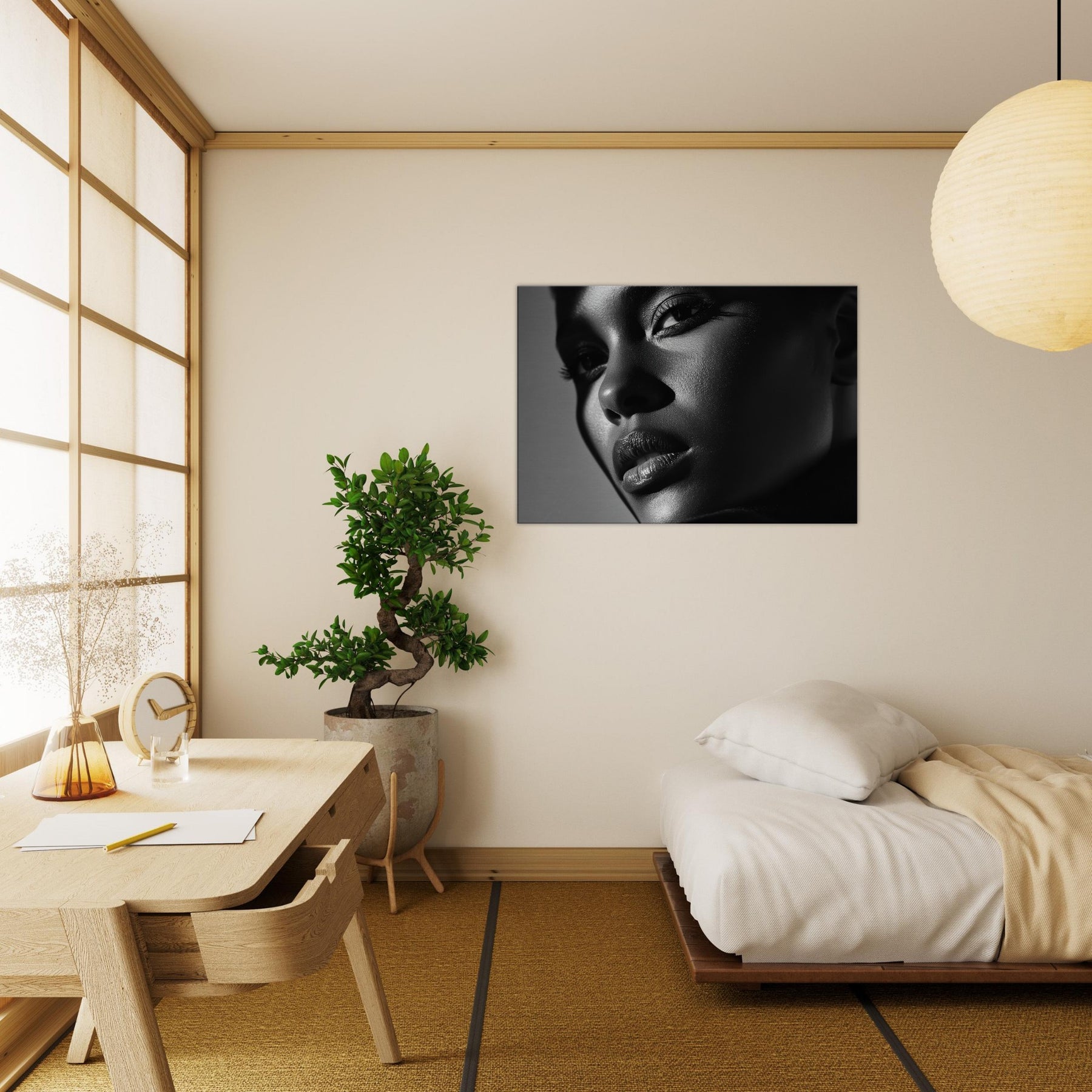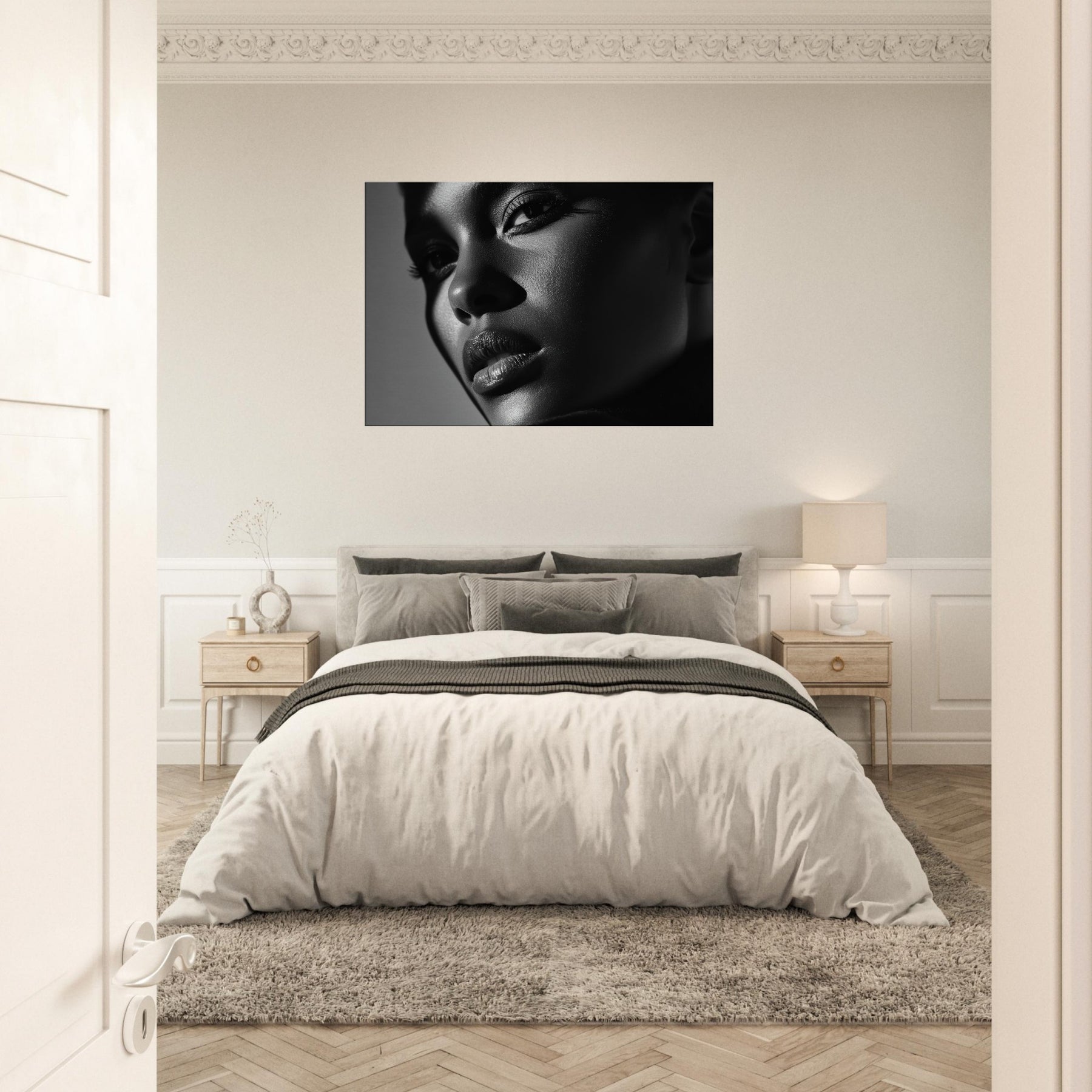 Color Field unfolds in grayscale, a quiet dialogue between light and shadow. This Black And White study of faces and bodies gathers mood and texture into a singular, contemplative presence, turning a wall into a living moment.