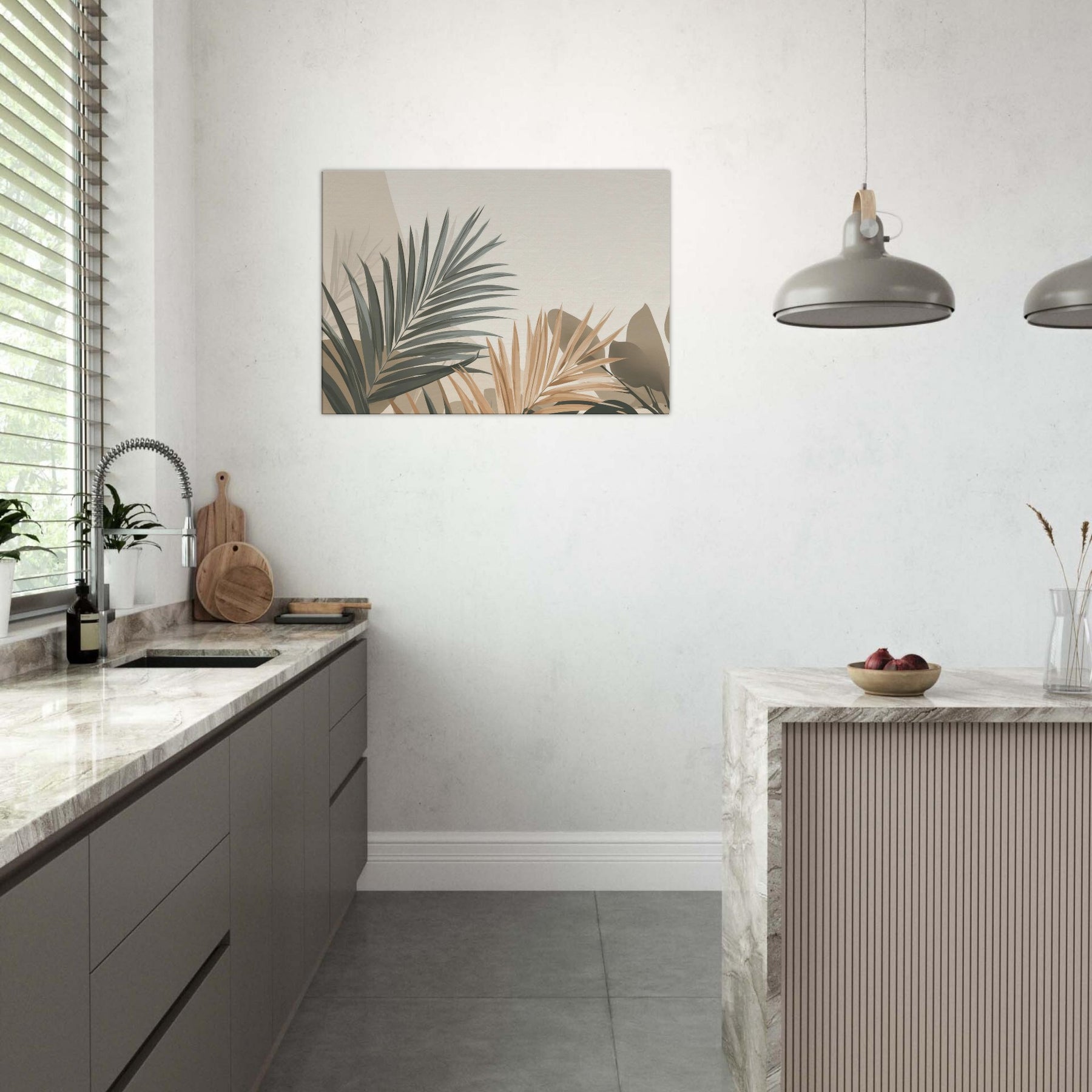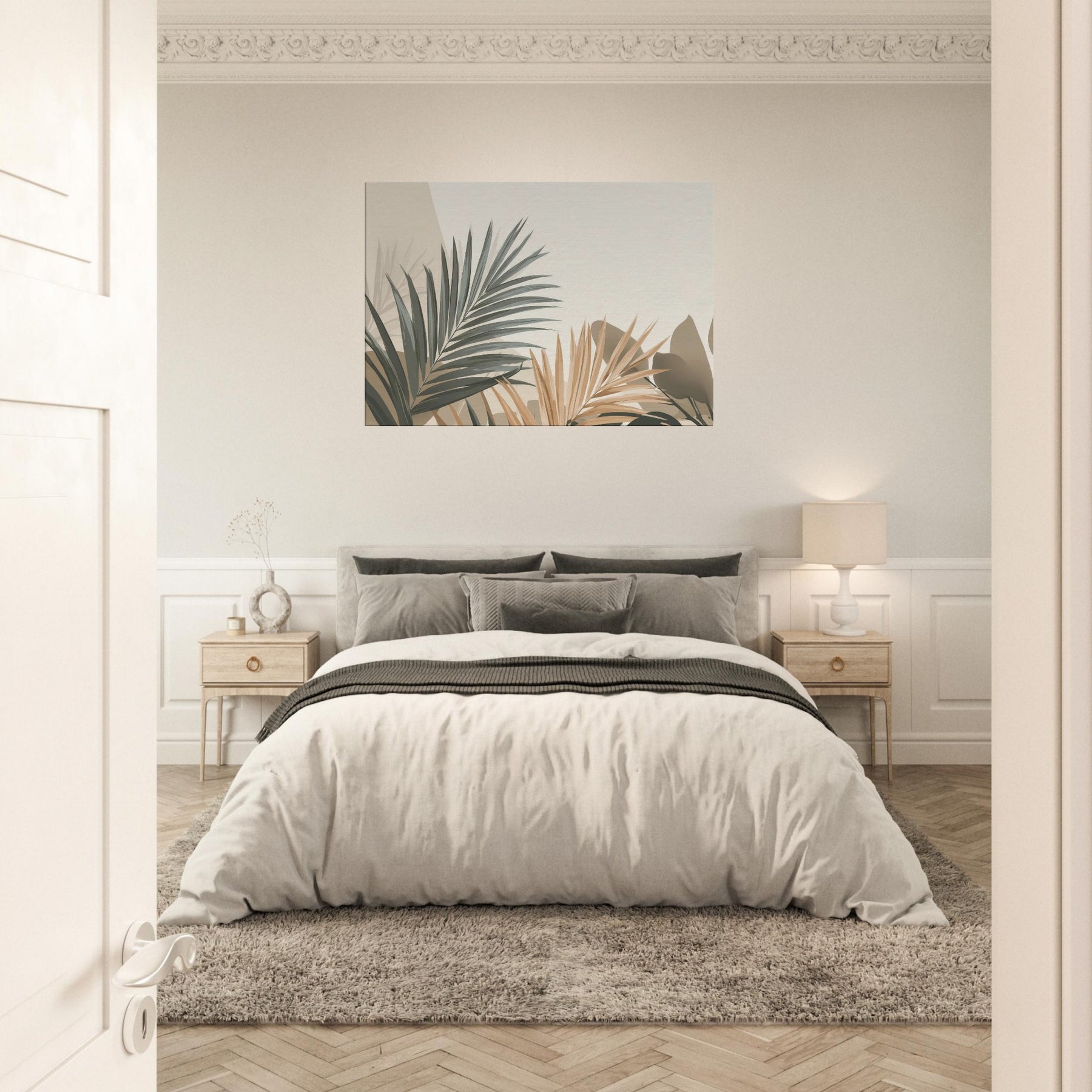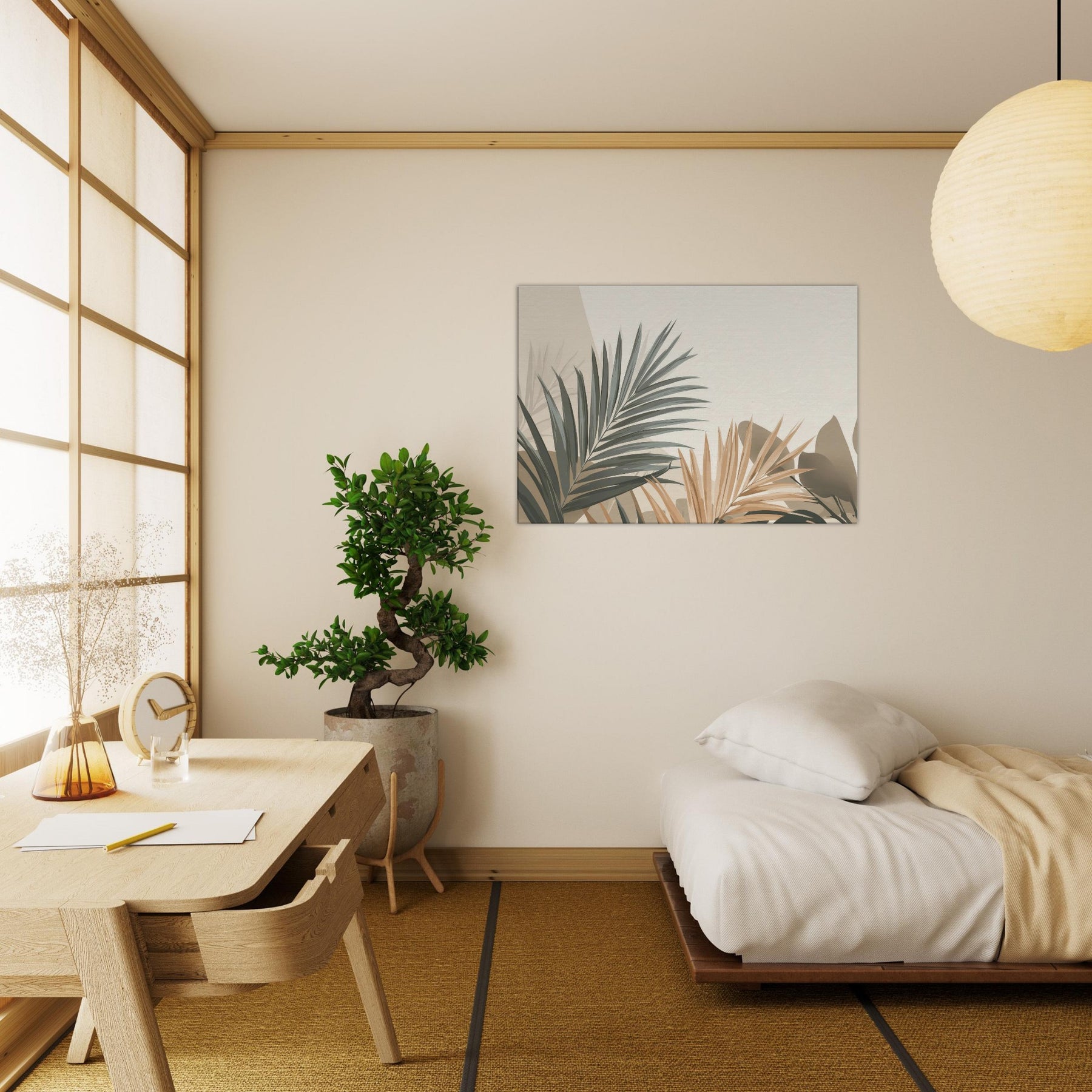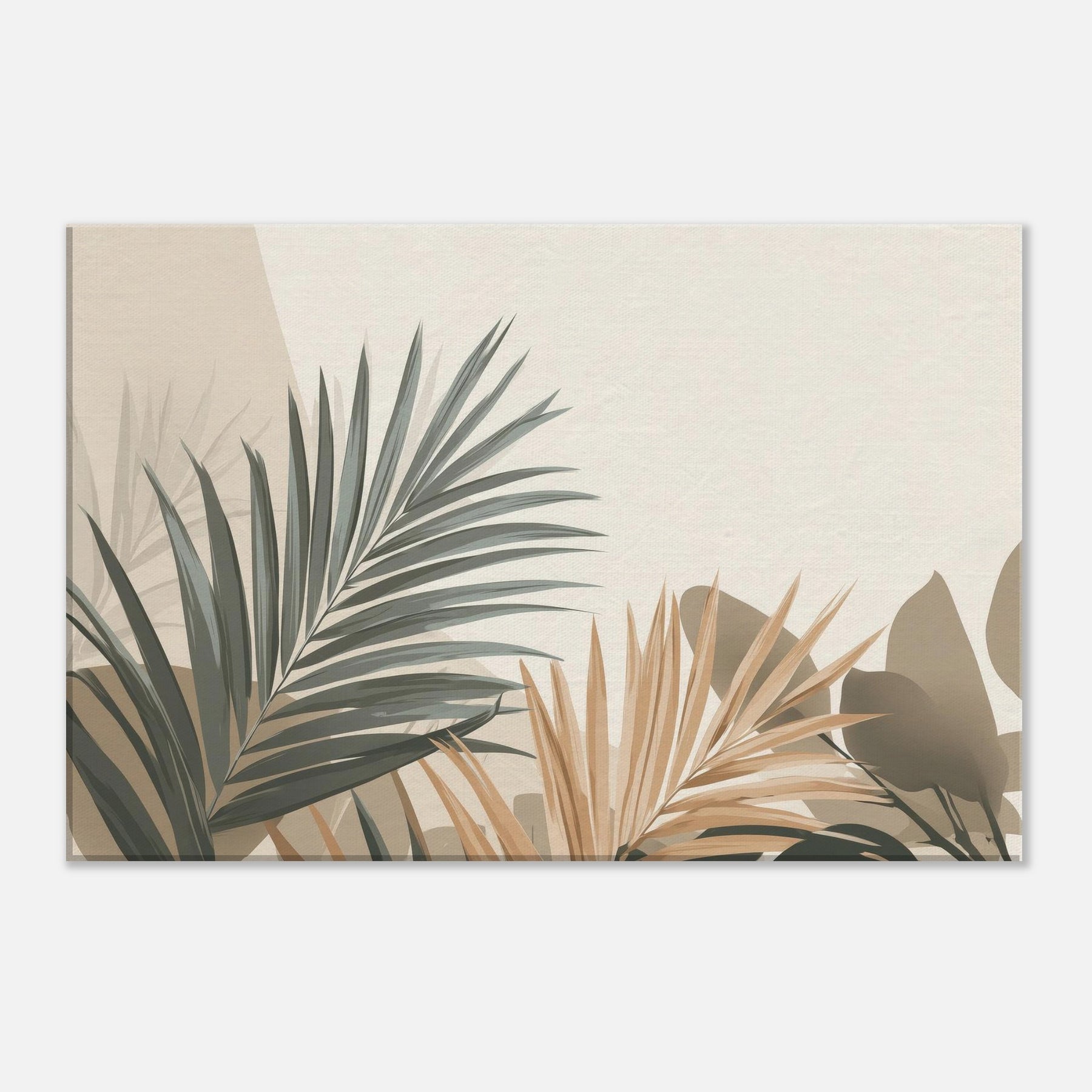 Subtle, sculptural Palm Leaves unfurl across a softly lit field of beige and sage, inviting calm into any room. This minimalist composition captures the breath of nature in restrained tones, where light and shadow carve quiet spaces for reflection. The Palm Leaves feel almost tactile, as if you could trace their edges and hear a morning breeze. Hang it where you want serenity to linger above a sofa, in a reading nook, or beside a bedroom window to soften the day and invite a tranquil, everyday ritual.