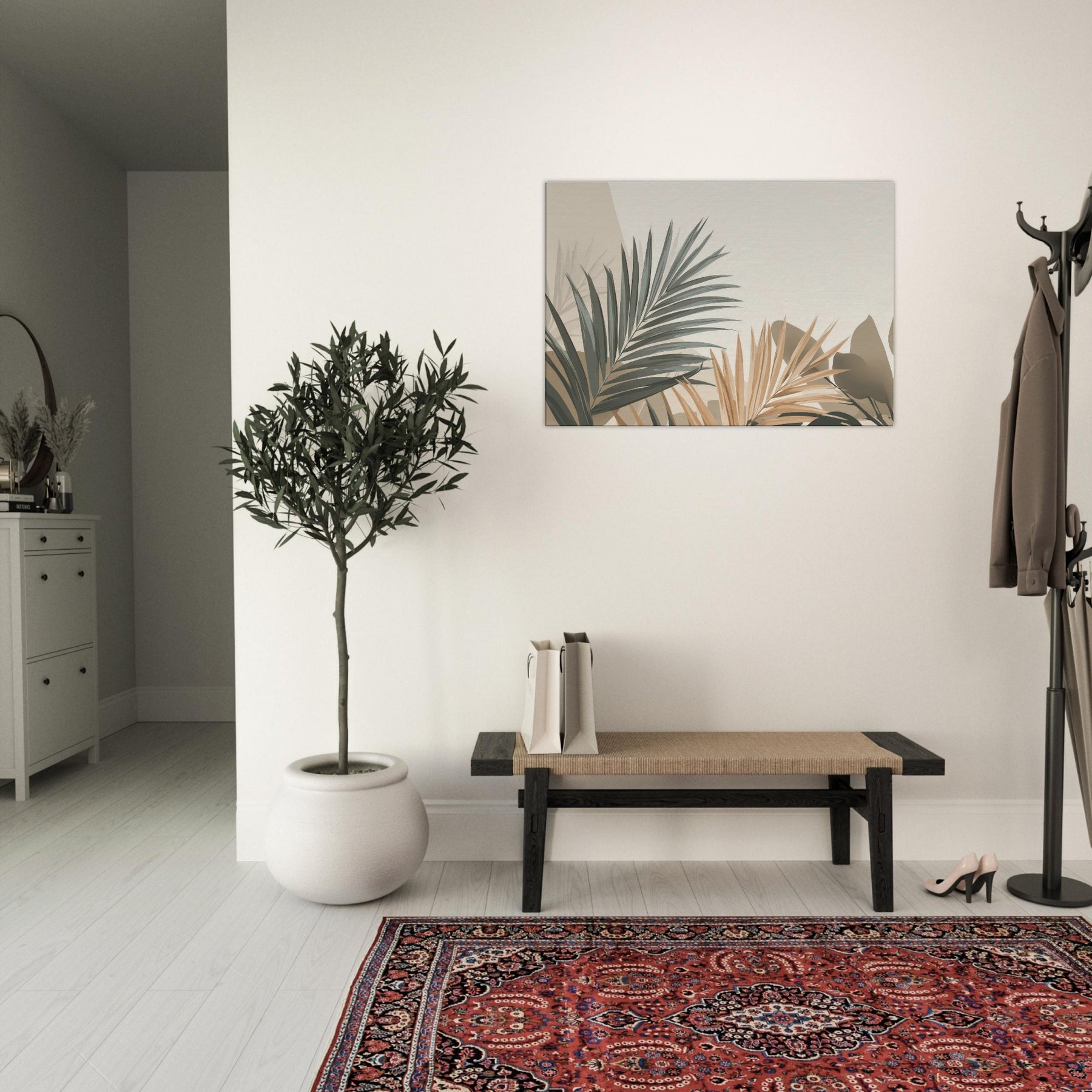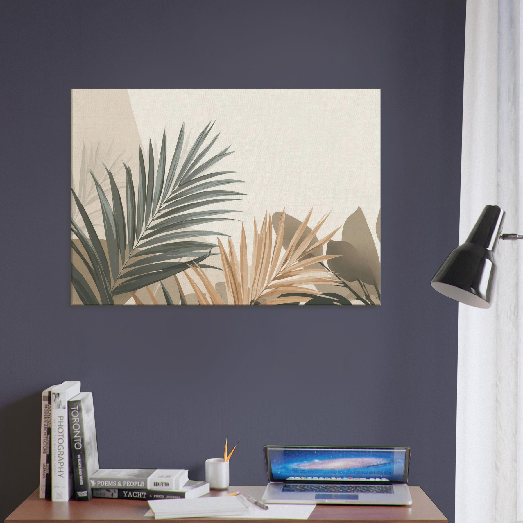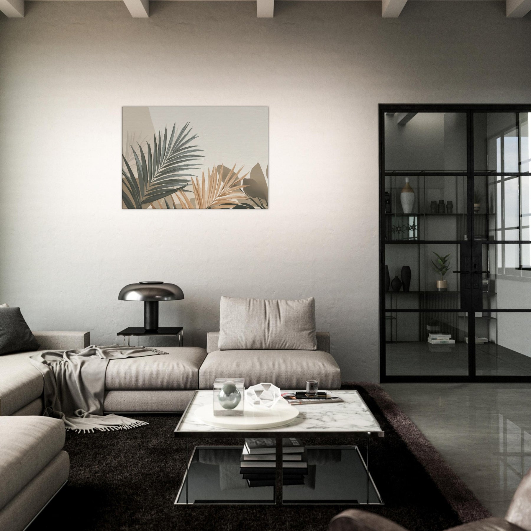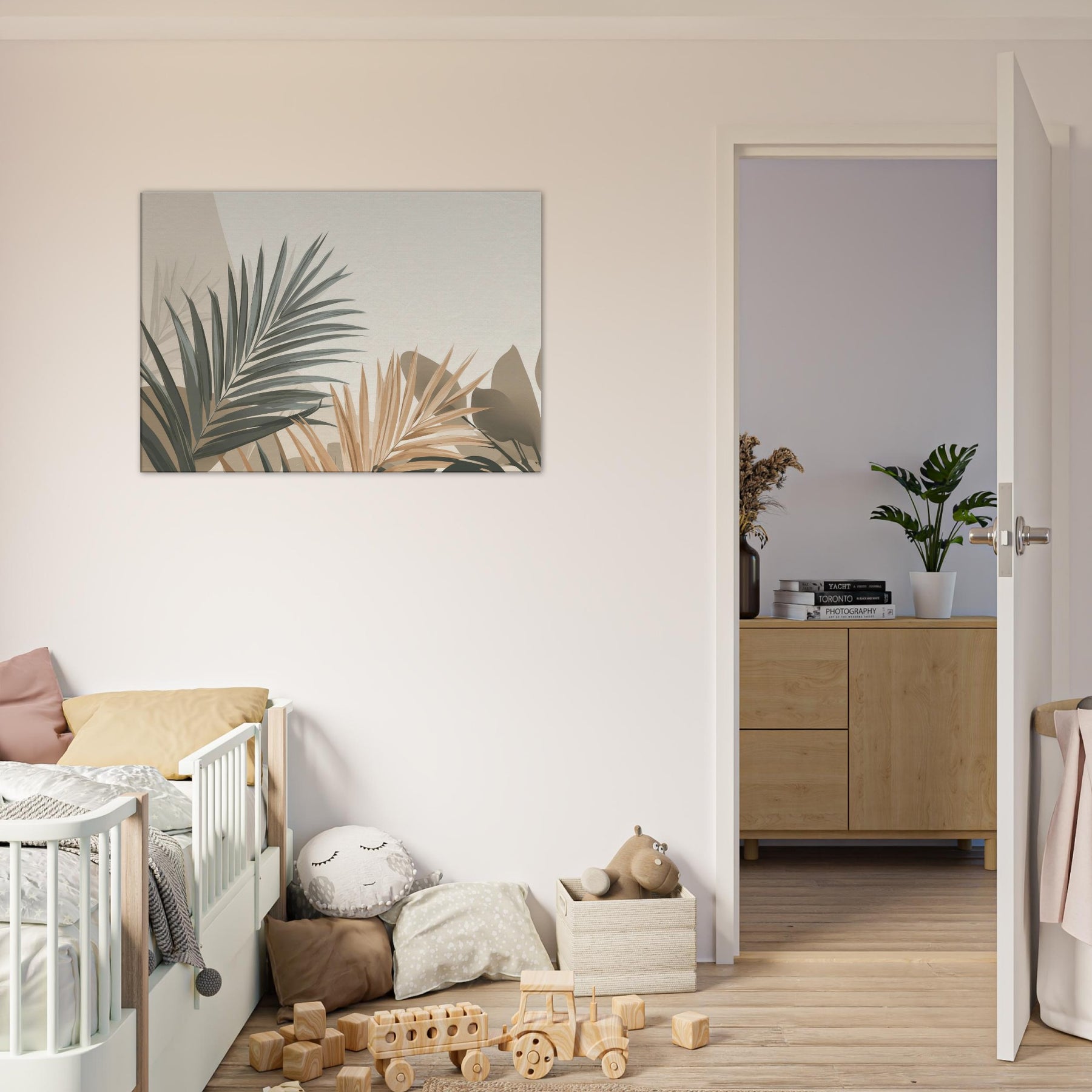Subtle, sculptural Palm Leaves unfurl across a softly lit field of beige and sage, inviting calm into any room. This minimalist composition captures the breath of nature in restrained tones, where light and shadow carve quiet spaces for reflection. The Palm Leaves feel almost tactile, as if you could trace their edges and hear a morning breeze. Hang it where you want serenity to linger above a sofa, in a reading nook, or beside a bedroom window to soften the day and invite a tranquil, everyday ritual.
