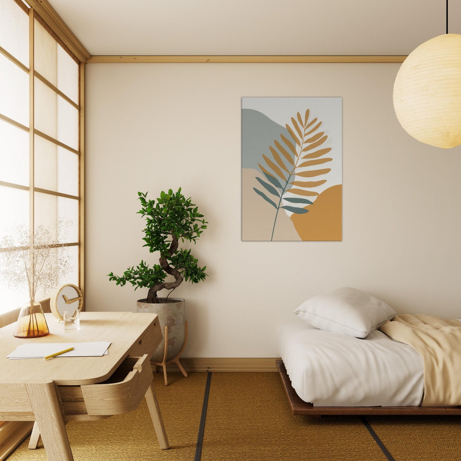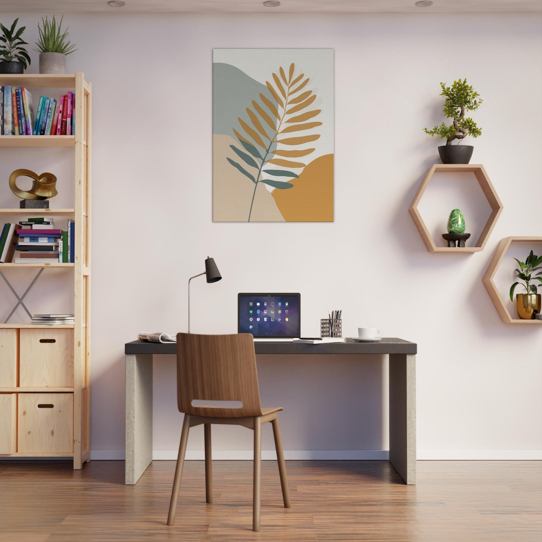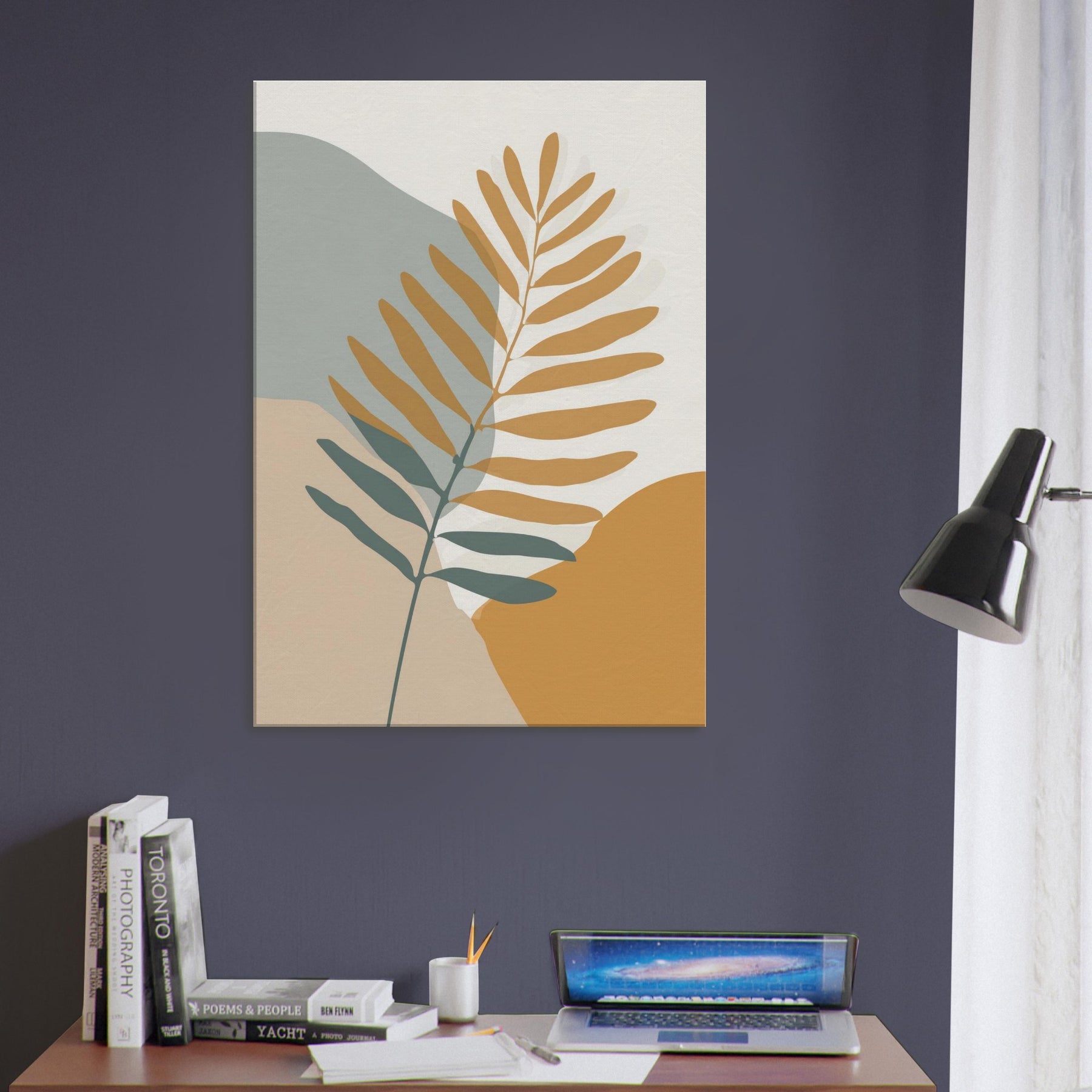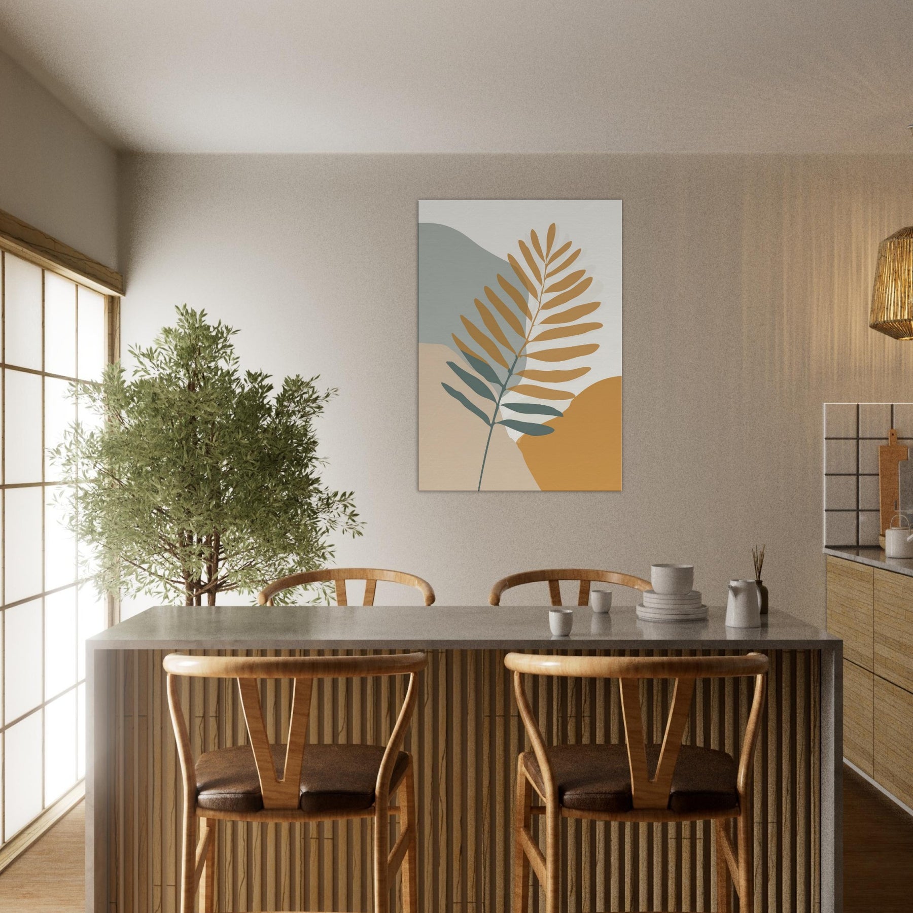 Quietly elegant and quietly evocative, this fern inspired piece invites calm breath and soft sunlight to your space. The slender branch unfolds across warm ochre and sage fields, its restrained lines catching the eye without shouting. Place it beside a neutral sofa or a sunlit nook to create a living, breathing moment of nature an everyday reminder of balance and simplicity. The fern becomes the room's gentle focal point, transforming walls into a quiet, contemplative atmosphere you can live with daily.