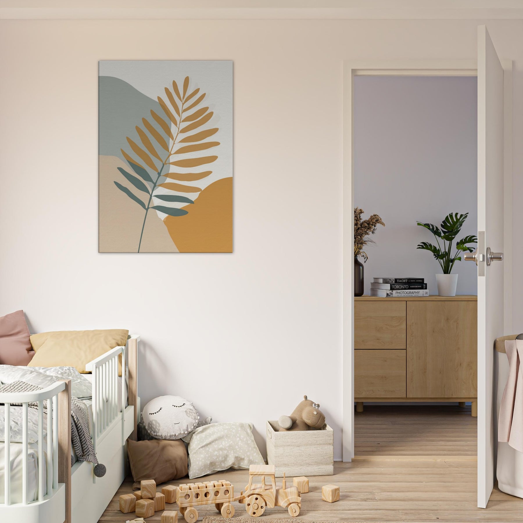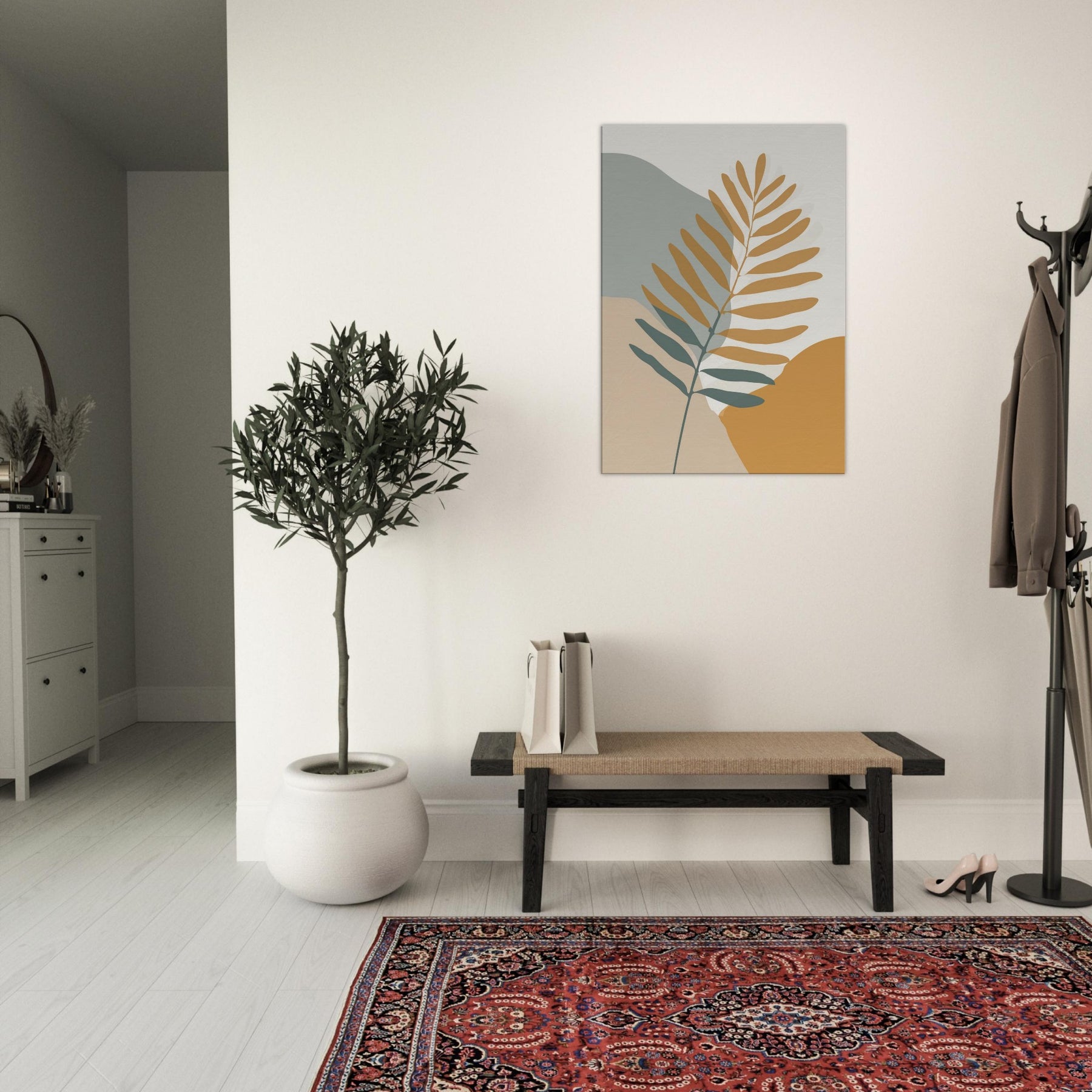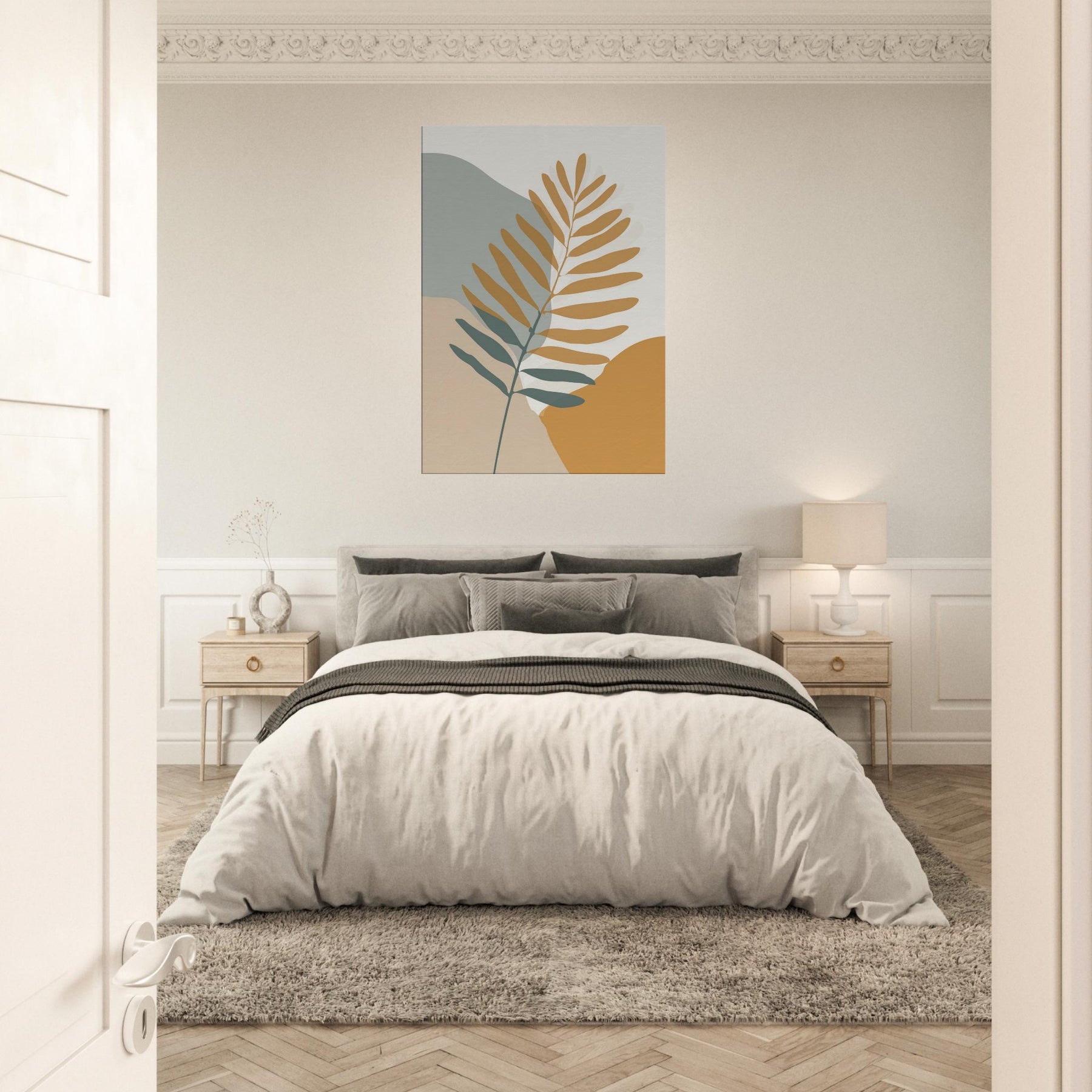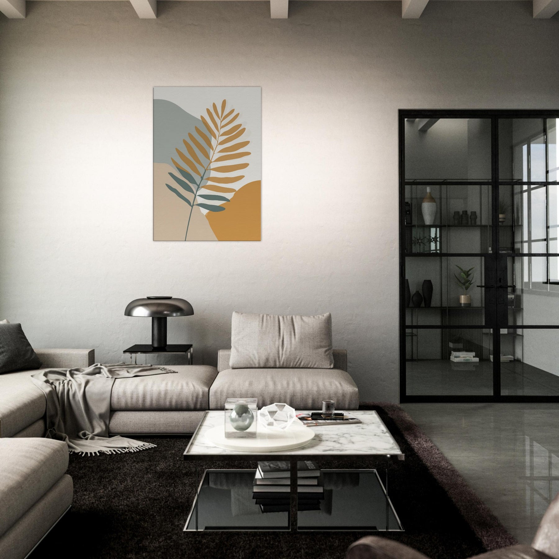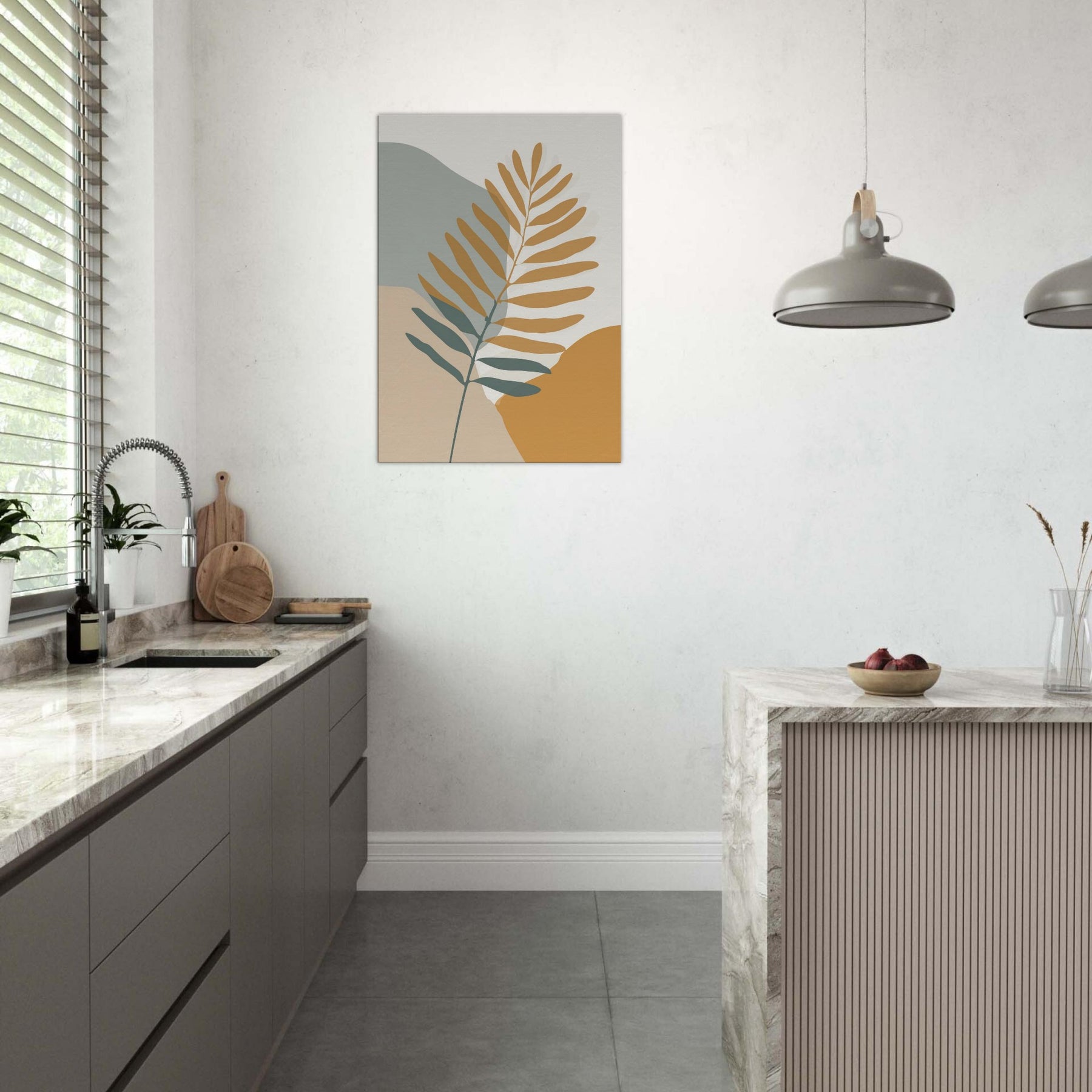 Quietly elegant and quietly evocative, this fern inspired piece invites calm breath and soft sunlight to your space. The slender branch unfolds across warm ochre and sage fields, its restrained lines catching the eye without shouting. Place it beside a neutral sofa or a sunlit nook to create a living, breathing moment of nature an everyday reminder of balance and simplicity. The fern becomes the room's gentle focal point, transforming walls into a quiet, contemplative atmosphere you can live with daily.